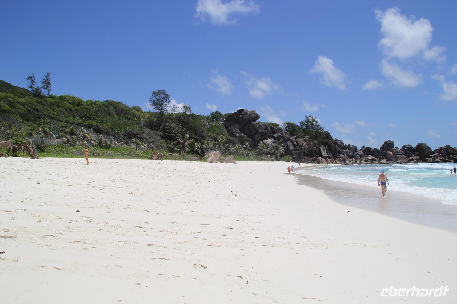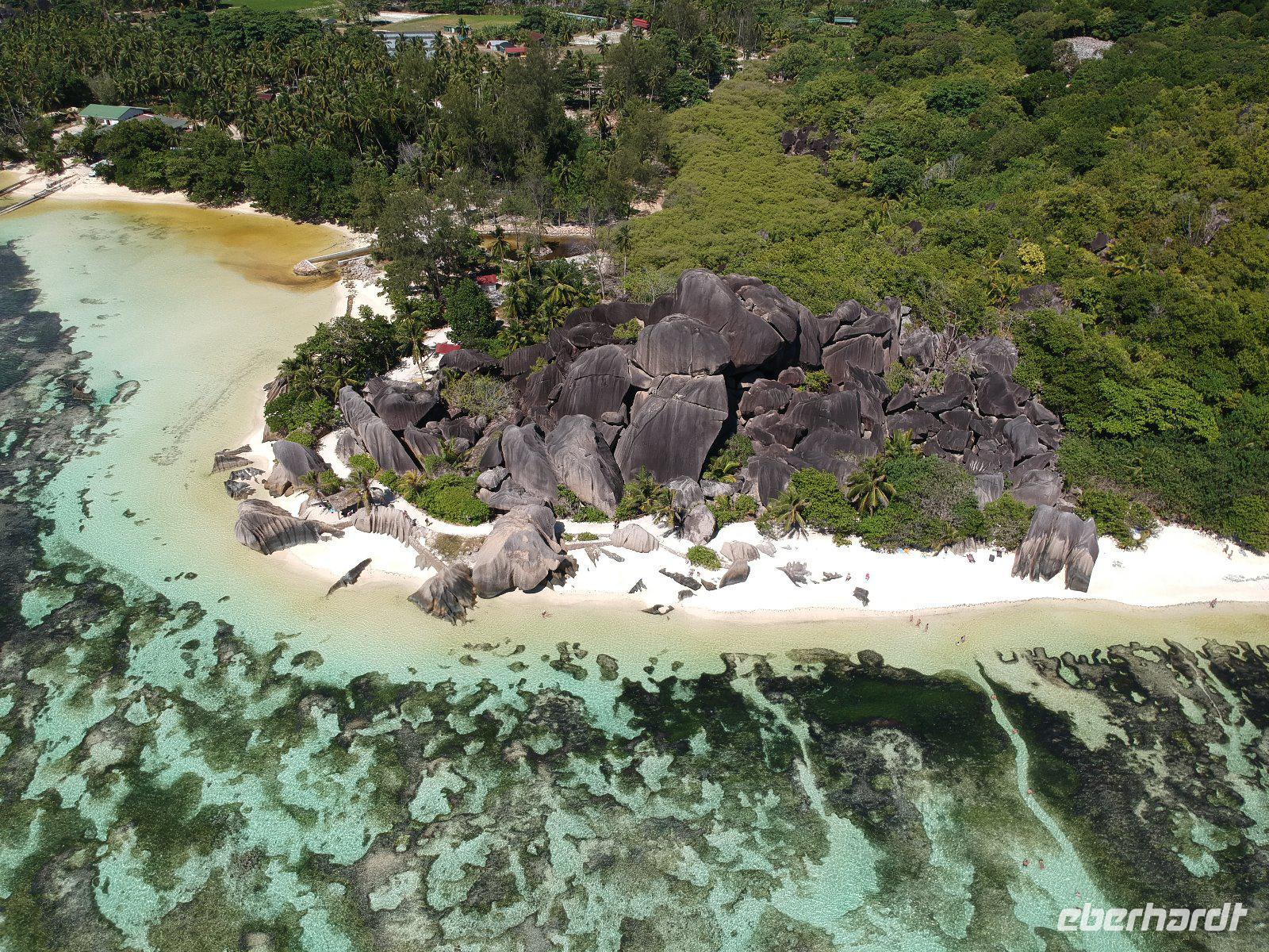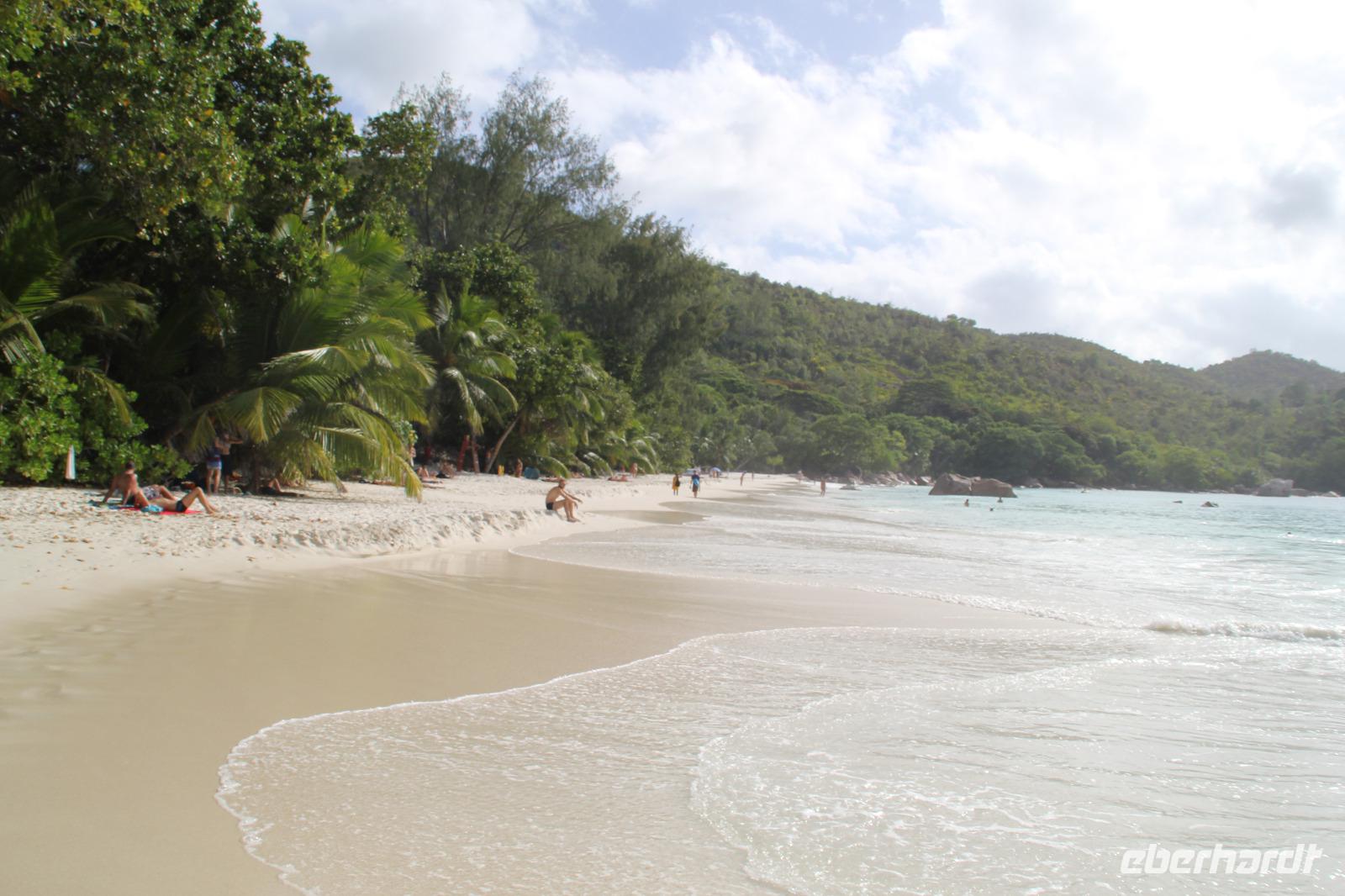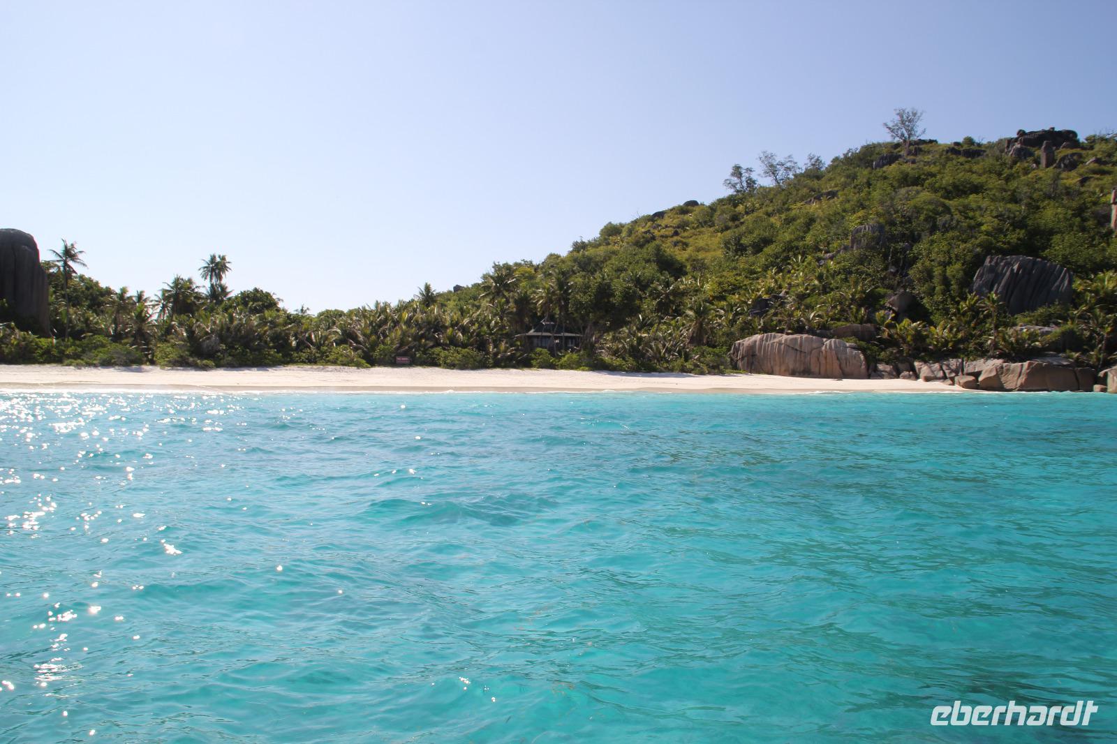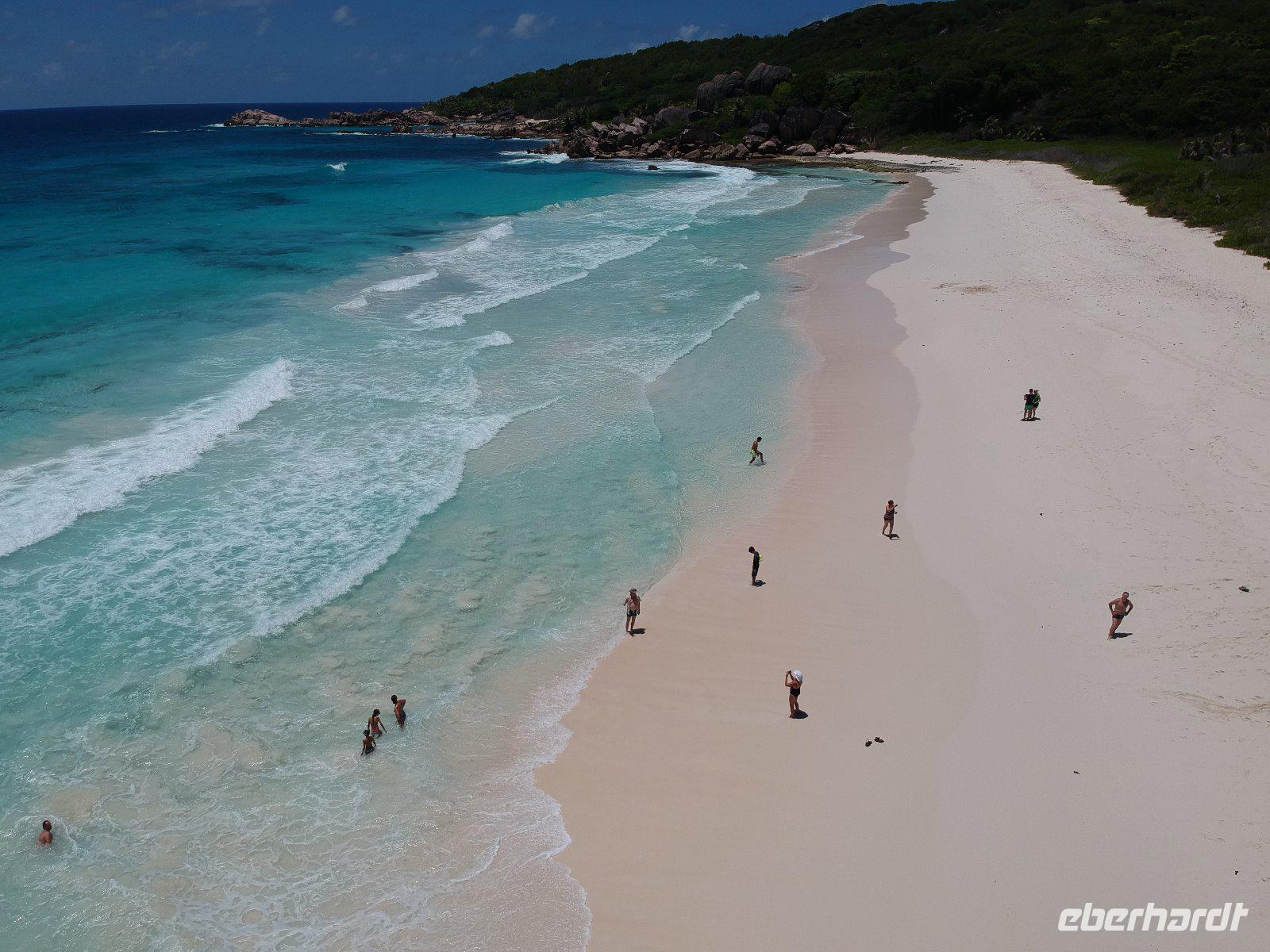 Laut National Geographic befinden sich auf der Insel allgemein mit die schönsten Strände der Welt. Die vom Wasser abgeschliffenen Granitfelsen am weißen Traumstrand vor türkisblauem Meer sprechen deutlich dafür. Hier hat man u.a. in den 90er Jahren eine Bacardi Werbung gedreht. Wir hatten ca. anderthalb Stunden Zeit zum Baden und relaxen, bevor wir am Nachmittag wieder unseren Katamaran bestiegen und noch einmal um die ganze Insel fuhren. Zuvor kauften wir noch ein paar Souvenirs im Zentrum der Insel, wo es auch Banken und eine Post gibt. Kurze Zeit später fuhren wir für ca. 45min. einmal um die ganze Insel herum. Zum Sonnenuntergang erreichten wir wieder die Insel Praslin und unser Hotel. Wieder einmal war es ein wunderschöner Tag im Paradies.