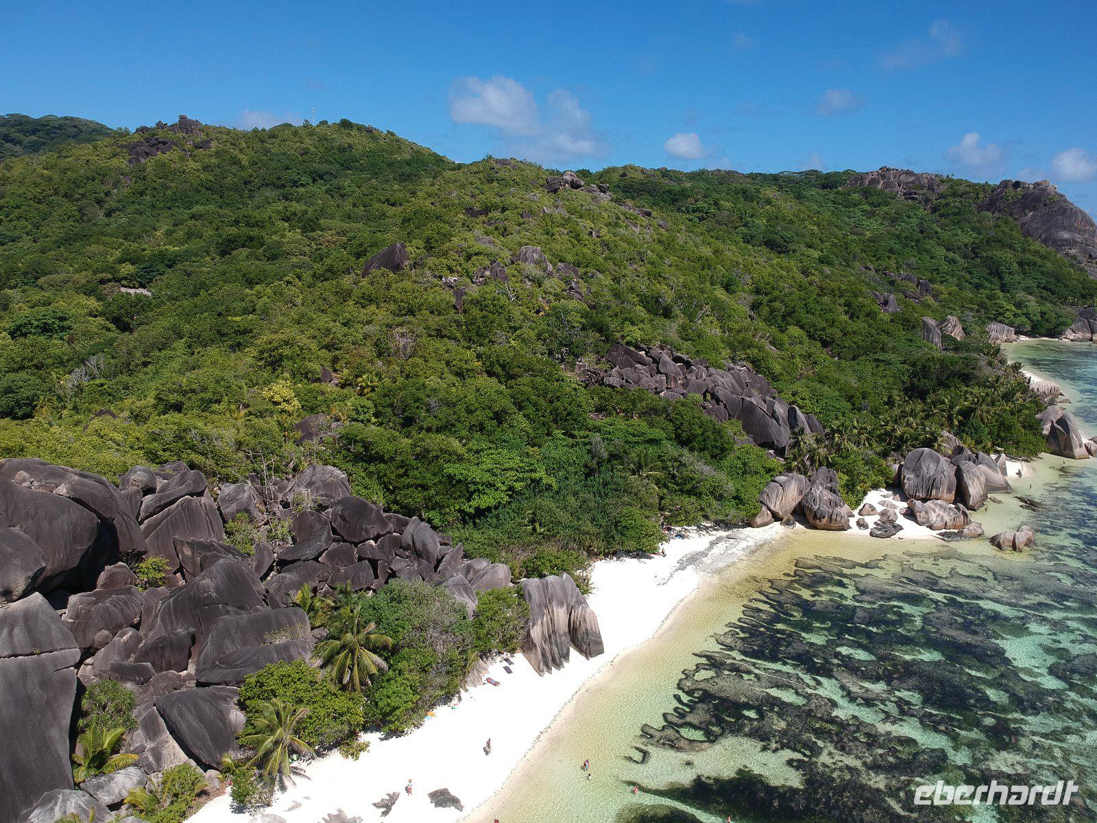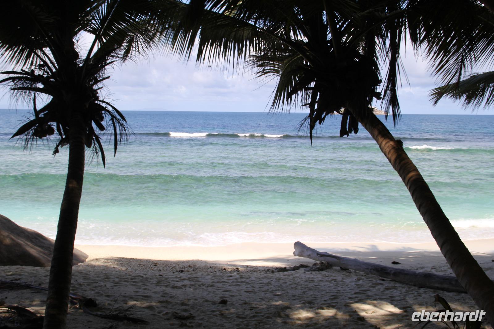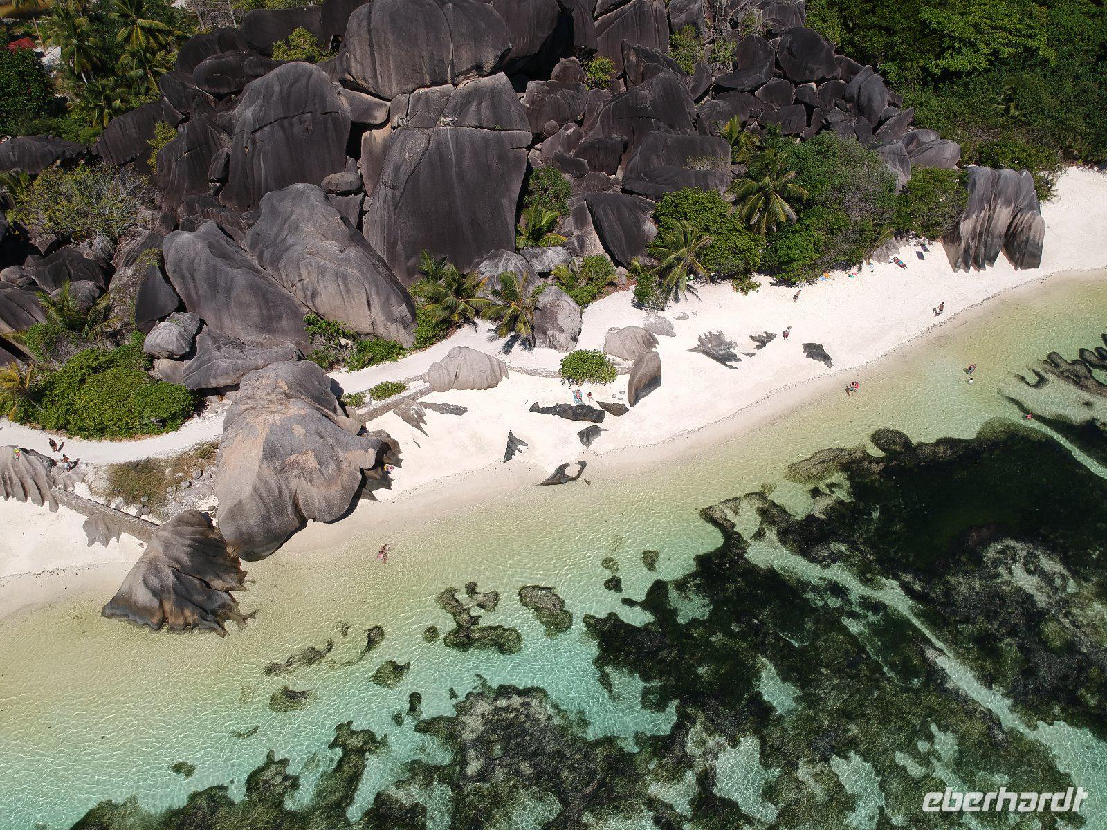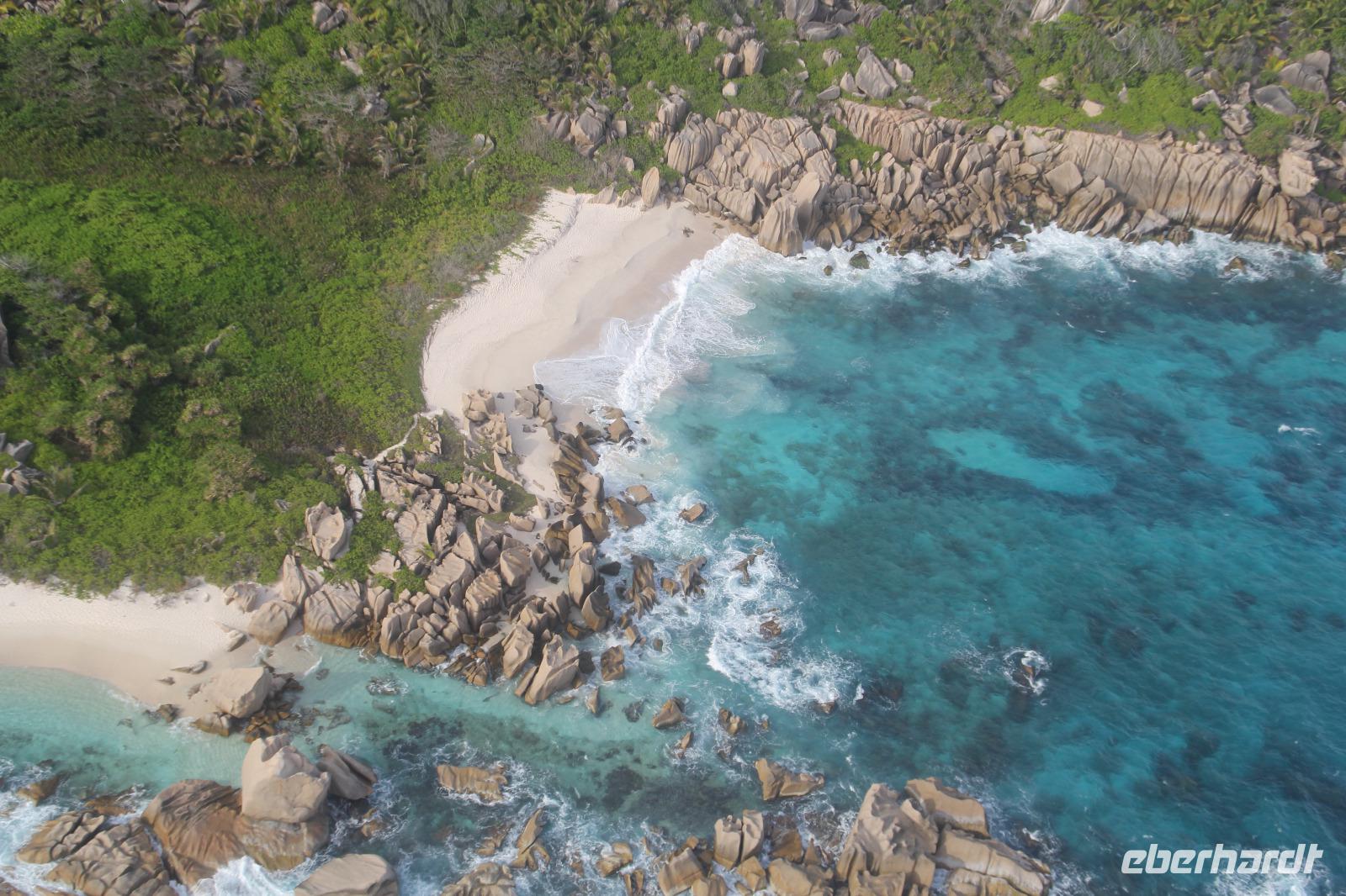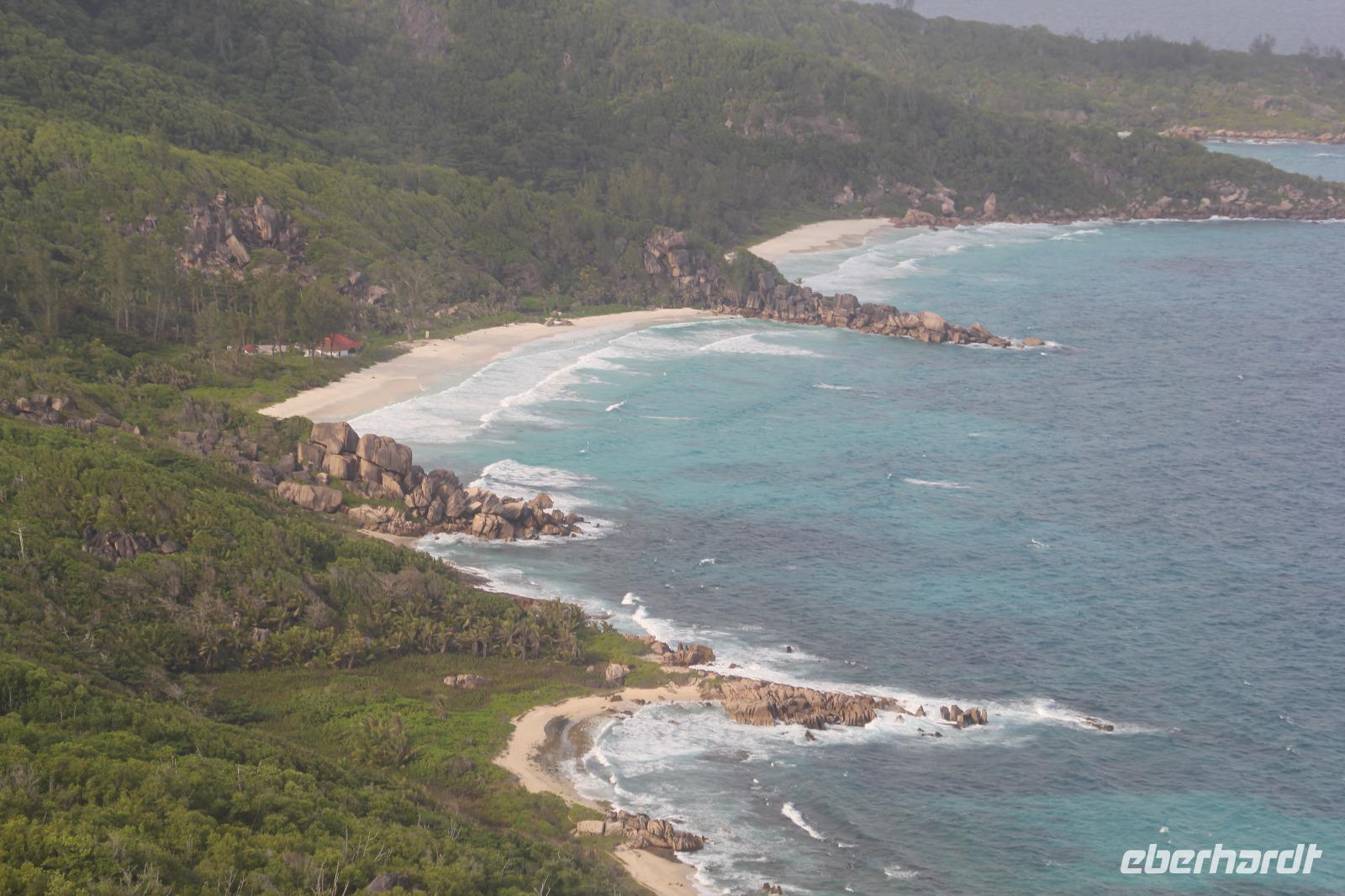 Laut National Geographic befinden sich auf der Insel allgemein mit die schönsten Strände der Welt. Die vom Wasser abgeschliffenen Granitfelsen am weißen Traumstrand vor türkisblauem Meer sprechen deutlich dafür. Hier hat man u.a. in den 90er Jahren eine Bacardi Werbung gedreht. Wir hatten ca. anderthalb Stunden Zeit zum Baden und relaxen, bevor wir am Nachmittag wieder unseren Katamaran bestiegen und noch einmal um die ganze Insel fuhren. Zuvor kauften wir noch ein paar Souvenirs im Zentrum der Insel, wo es auch Banken und eine Post gibt. Kurze Zeit später fuhren wir für ca. 45min. einmal um die ganze Insel herum. Zum Sonnenuntergang erreichten wir wieder die Insel Praslin und unser Hotel. Wieder einmal war es ein wunderschöner Tag im Paradies.