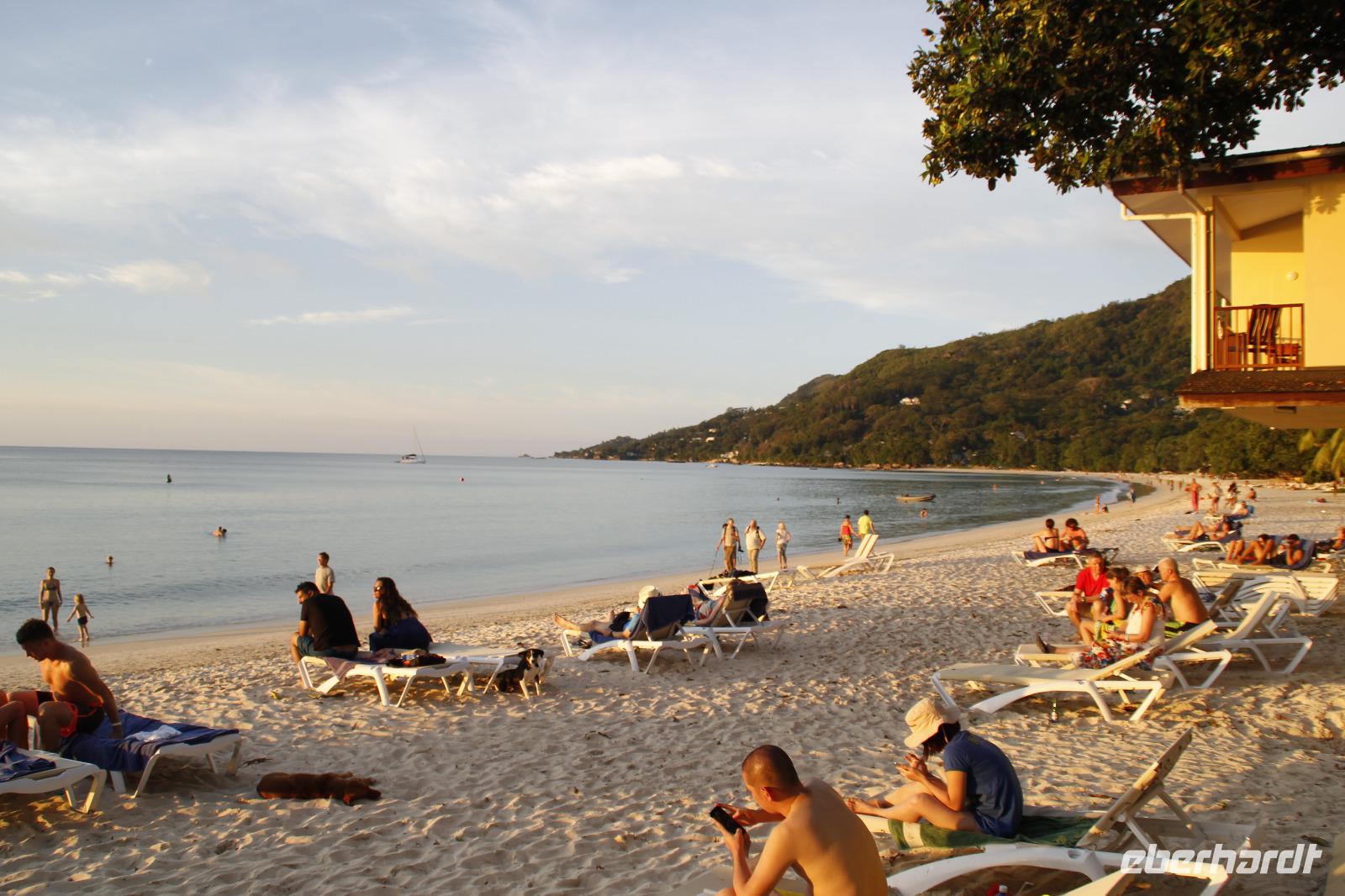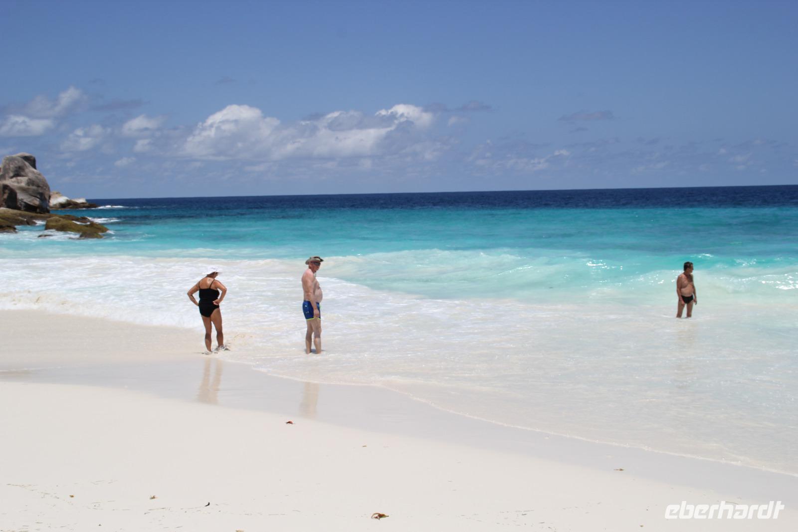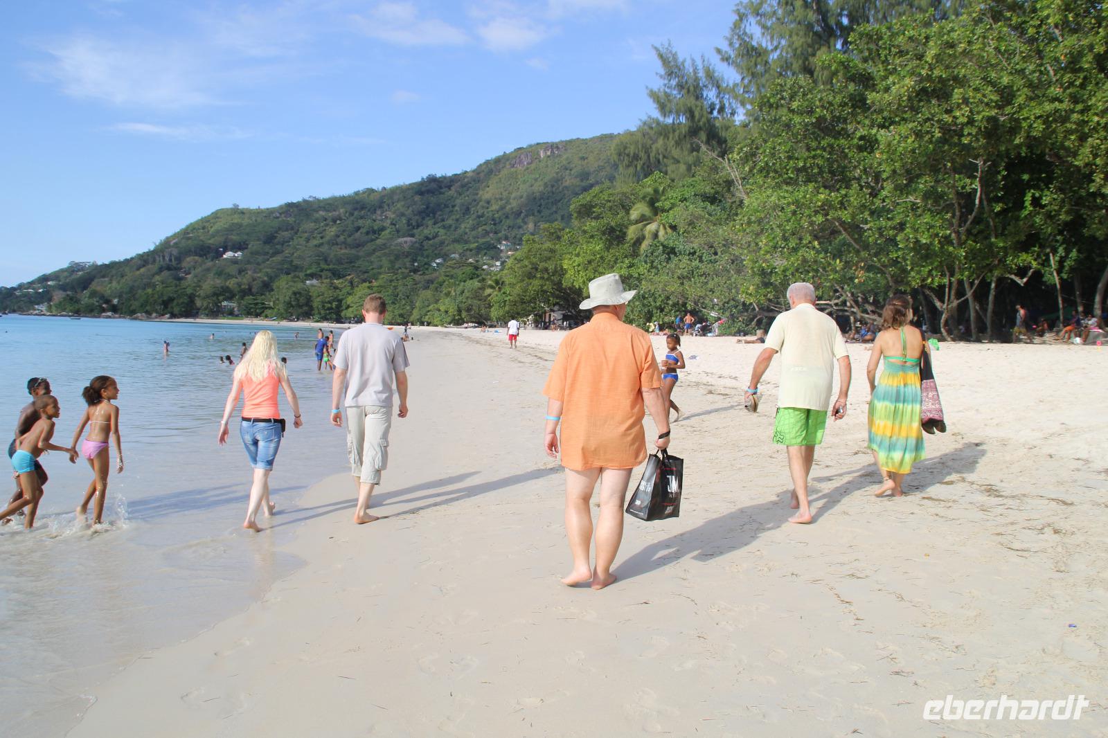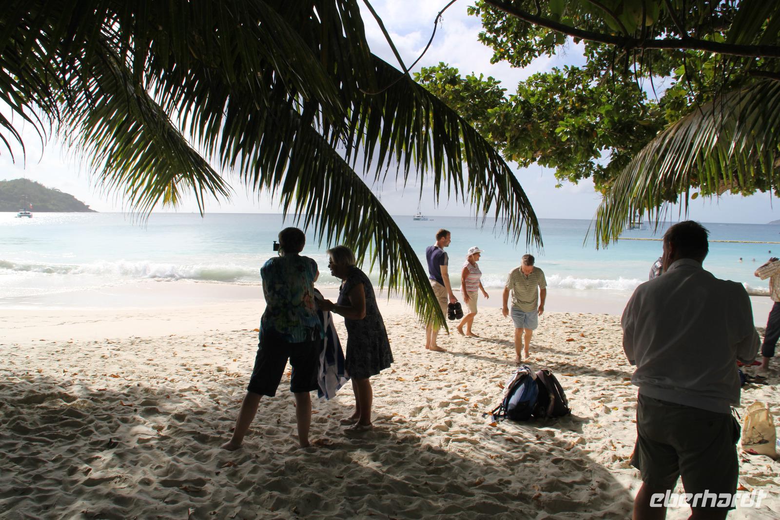Im Souvenirshop des Hotels wurden wieder Andenken und luftige Kleidung gekauft. Den Nachmittag verbrachten wir am berühmtesten Strand auf Praslin: dem Anse Lazio. Dieser wird in allen Reiseführern und Prospekten als der schönste der Insel angepriesen. Auch wir waren deswegen dort. Demzufolge sind wir natürlich nicht die einzigen gewesen. Da wir inzwischen unseren Privatstrand des Hotels gewohnt waren, fanden wir den Strand zwar schön, aber unseren am New Emerald Cove Hotel noch viel schöner. Am späten Nachmittag verabschiedeten wir wieder unseren Reiseleiter Cyril und erreichten unser Hotel, pünktlich zur Teestunde, die wir natürlich auch genossen. Beim gemeinsamen Abendessen werteten wir die Erlebnisse des Tages aus.