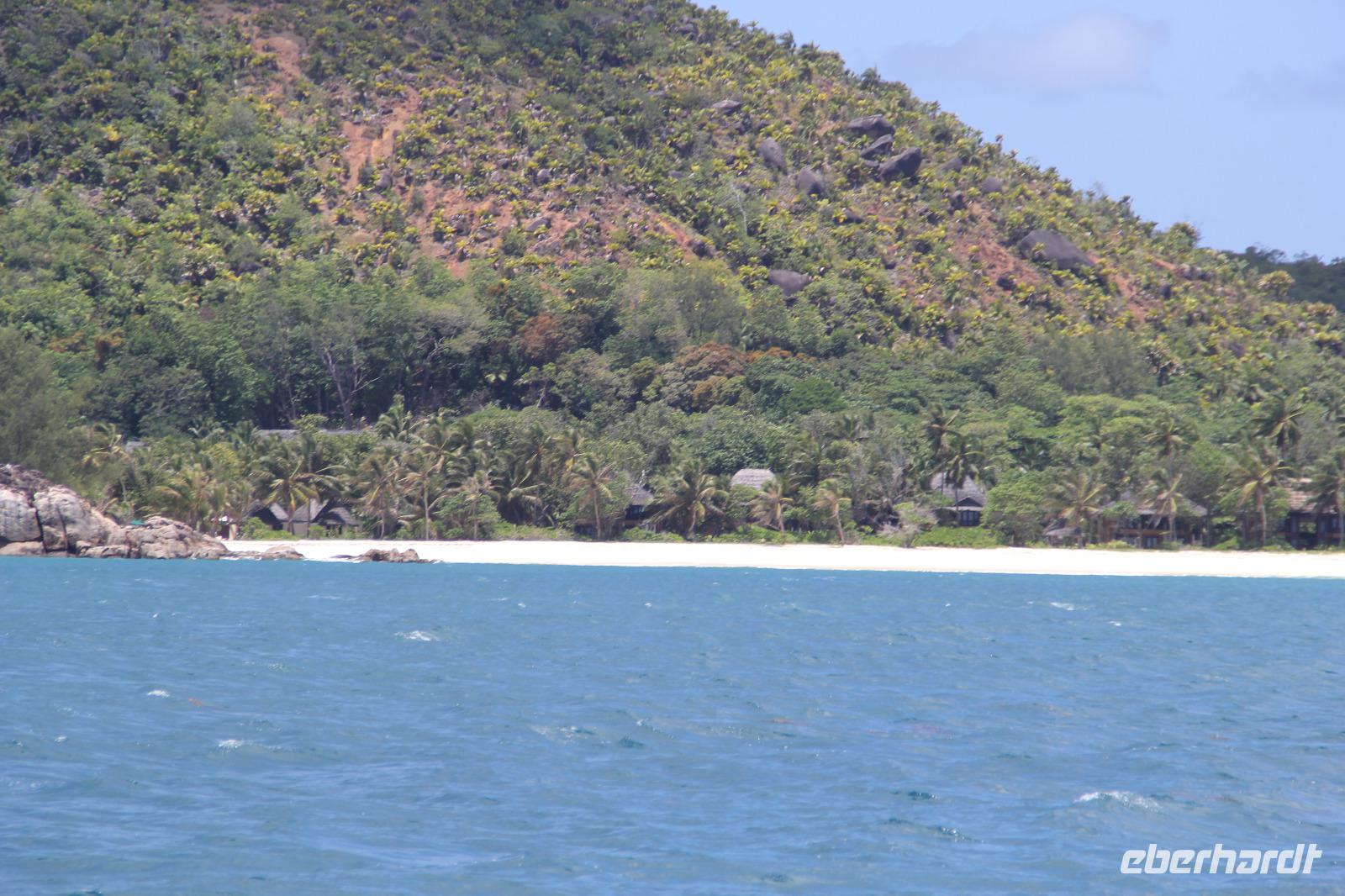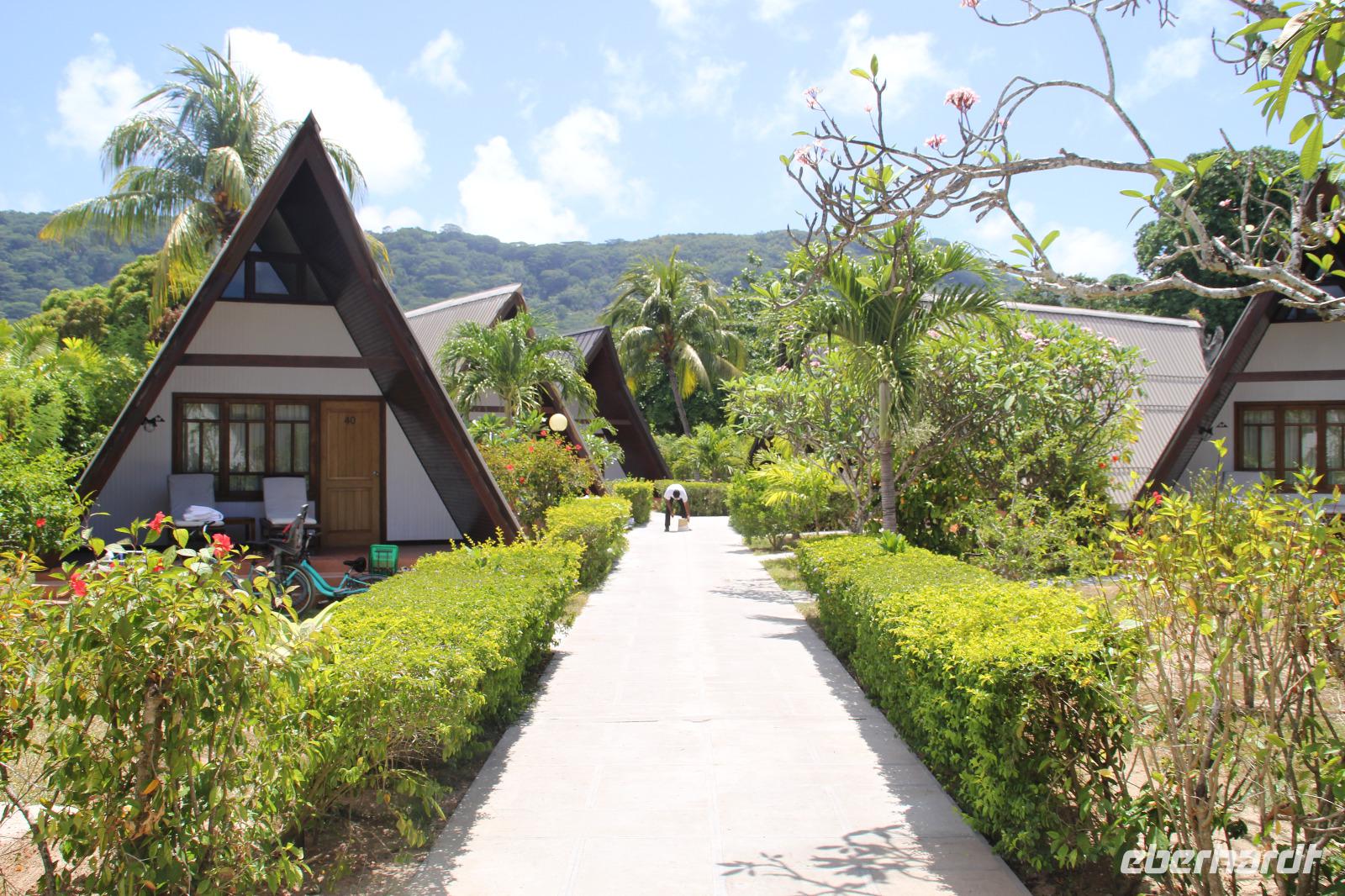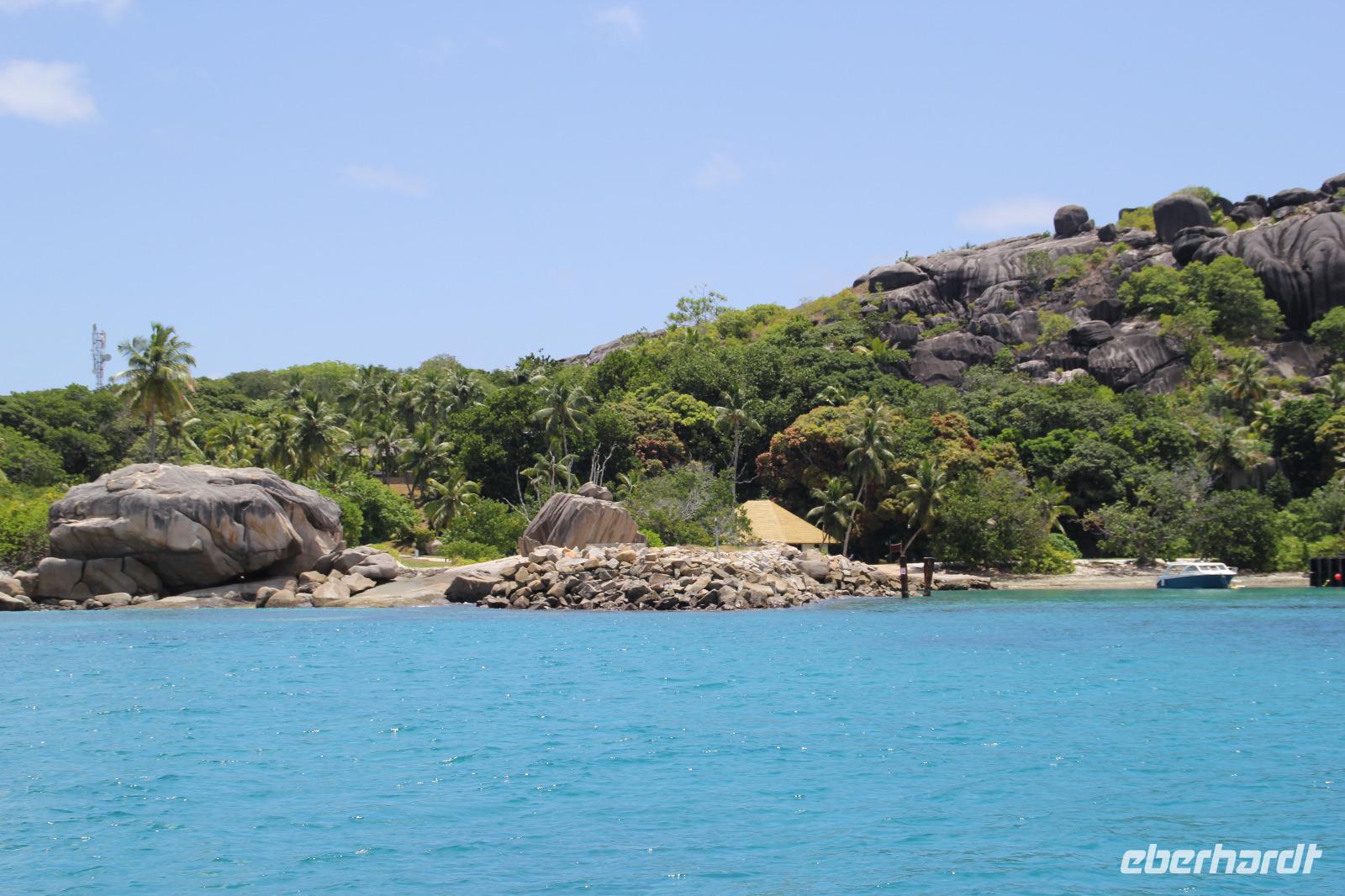 Nun hieß es erst einmal wieder Abschied nehmen von Cyril und der Hauptinsel. Denn am Nachmittag fuhren wir mit der Fähre nach Praslin und schließlich zu unserem neuen Hotel. Am Fähranleger, die hier immer Jetty heißen, verabschiedeten wir uns von Cyril und unser Gepäck wurde verladen. Nach einstündiger Überfahrt erreichten wir alle wohlbehalten den Anleger auf Praslin. Dort angekommen nahmen wir unser Gepäck und stiegen ein paar Meter weiter ins Hotelboot um. Weil dieses Hotel nur auf dem Wasserweg zu erreichen ist, fuhren wir per Motorboot etwa 10min. über die Bucht zum Hotel New Emerald Cove. Am anderen Ende legten wir an und betraten unser zu Hause für die nächsten zwei Wochen. Wir waren zwar erschöpft vom Tag und der Anreise, aber die Aussicht auf unsere Zeit hier zwischen Palmen, Strand und gemütlichen Bungalows gefiel uns gewaltig.
