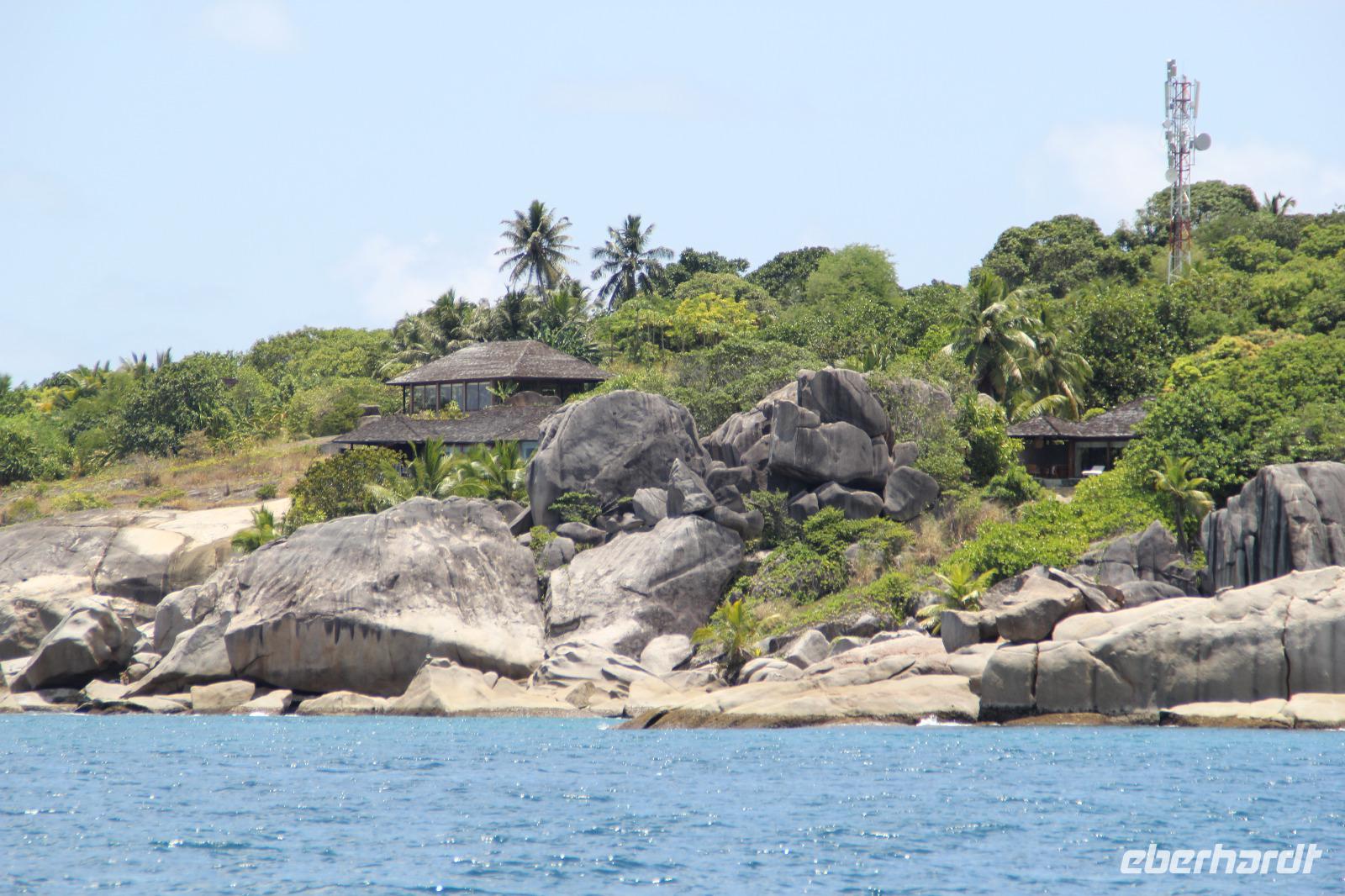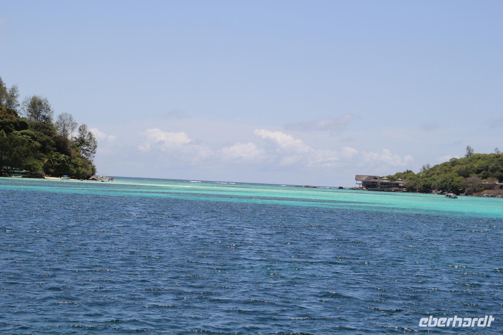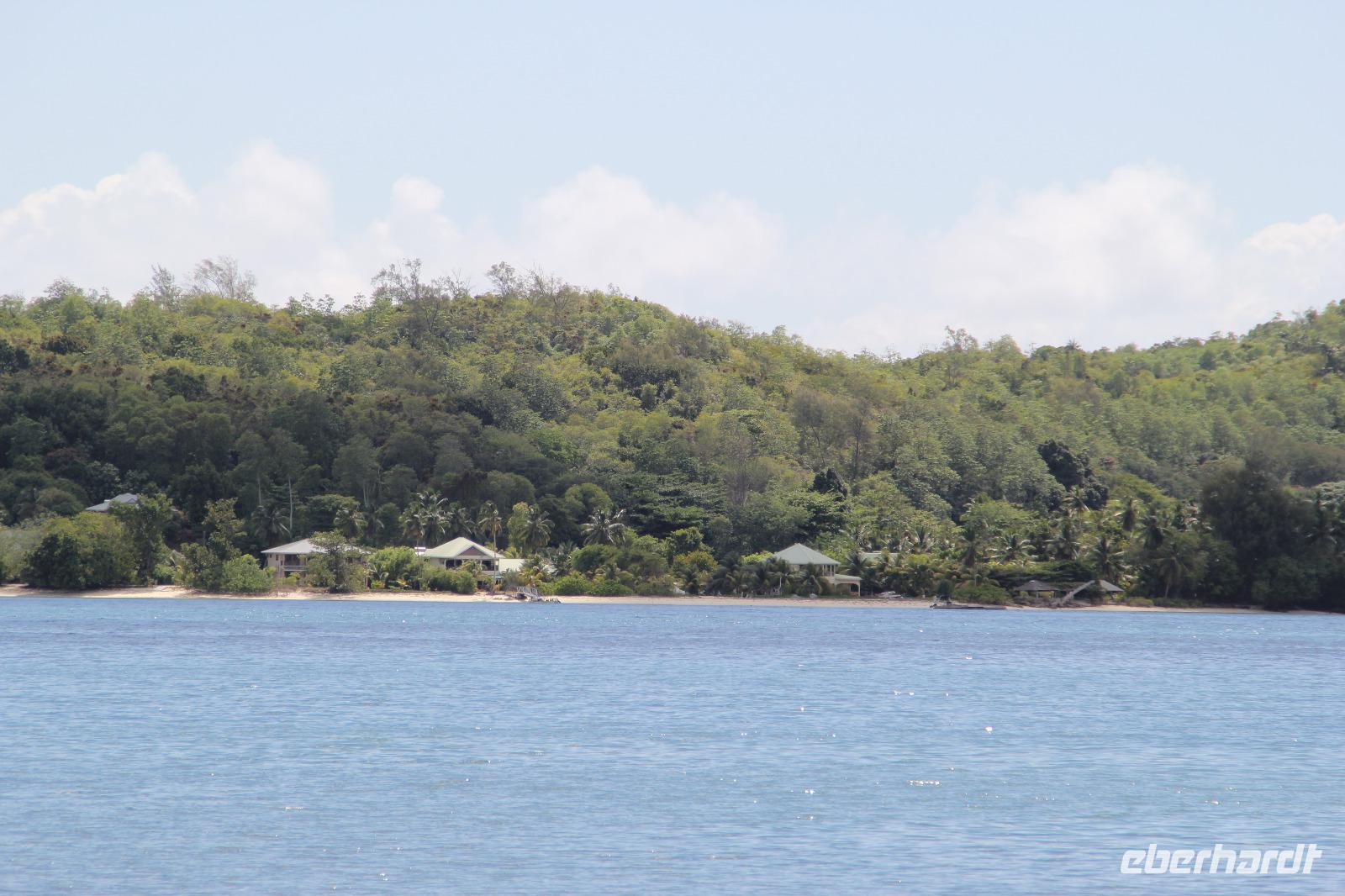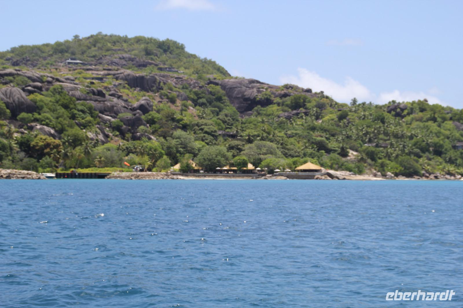 Nun hieß es erst einmal wieder Abschied nehmen von Cyril und der Hauptinsel. Denn am Nachmittag fuhren wir mit der Fähre nach Praslin und schließlich zu unserem neuen Hotel. Am Fähranleger, die hier immer Jetty heißen, verabschiedeten wir uns von Cyril und unser Gepäck wurde verladen. Nach einstündiger Überfahrt erreichten wir alle wohlbehalten den Anleger auf Praslin. Dort angekommen nahmen wir unser Gepäck und stiegen ein paar Meter weiter ins Hotelboot um. Weil dieses Hotel nur auf dem Wasserweg zu erreichen ist, fuhren wir per Motorboot etwa 10min. über die Bucht zum Hotel New Emerald Cove. Am anderen Ende legten wir an und betraten unser zu Hause für die nächsten zwei Wochen. Wir waren zwar erschöpft vom Tag und der Anreise, aber die Aussicht auf unsere Zeit hier zwischen Palmen, Strand und gemütlichen Bungalows gefiel uns gewaltig.