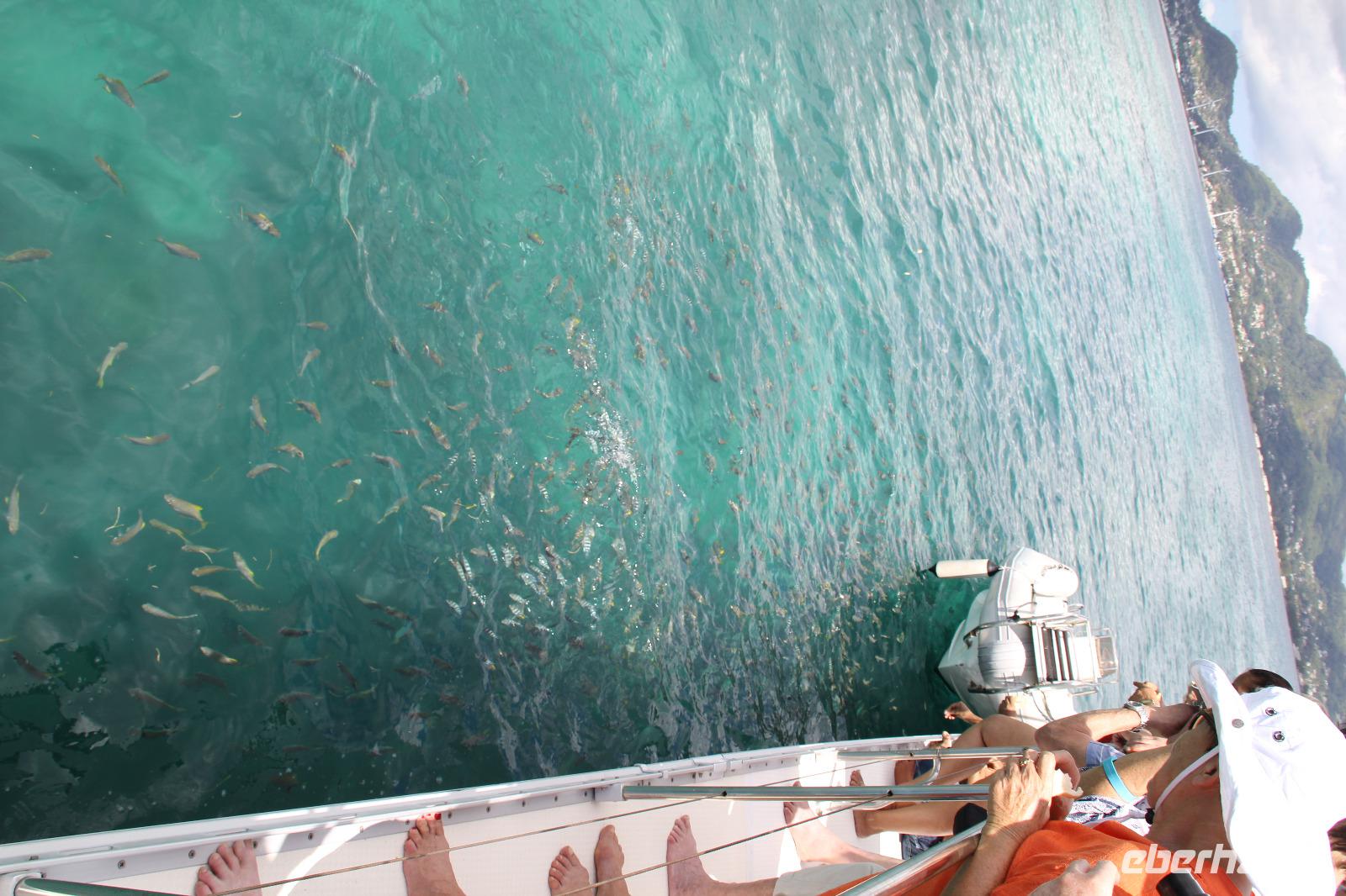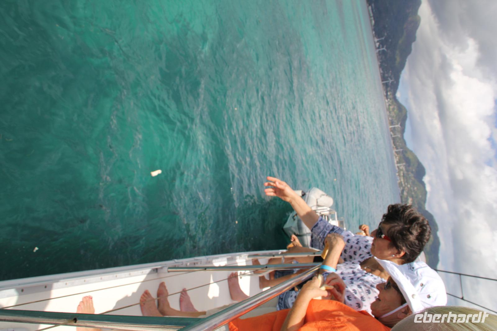 Heute stand eine Katamaran-Tour zum St. Anne Marine Nationalpark auf dem Programm. Dort angekommen stiegen wir in ein Glasbodenboot ein, um die traumhaft schöne Unterwasserwelt von unten zu sehen. Durch den Glasboden konnten wir verschiedenste Korallenarten und auch einige Fische sehen. Die Namen der Korallen kommen von deren Aussehen, wie uns Cyril erklärte. So sahen wir zum Beispiel Salat- und Fingerkorallen.