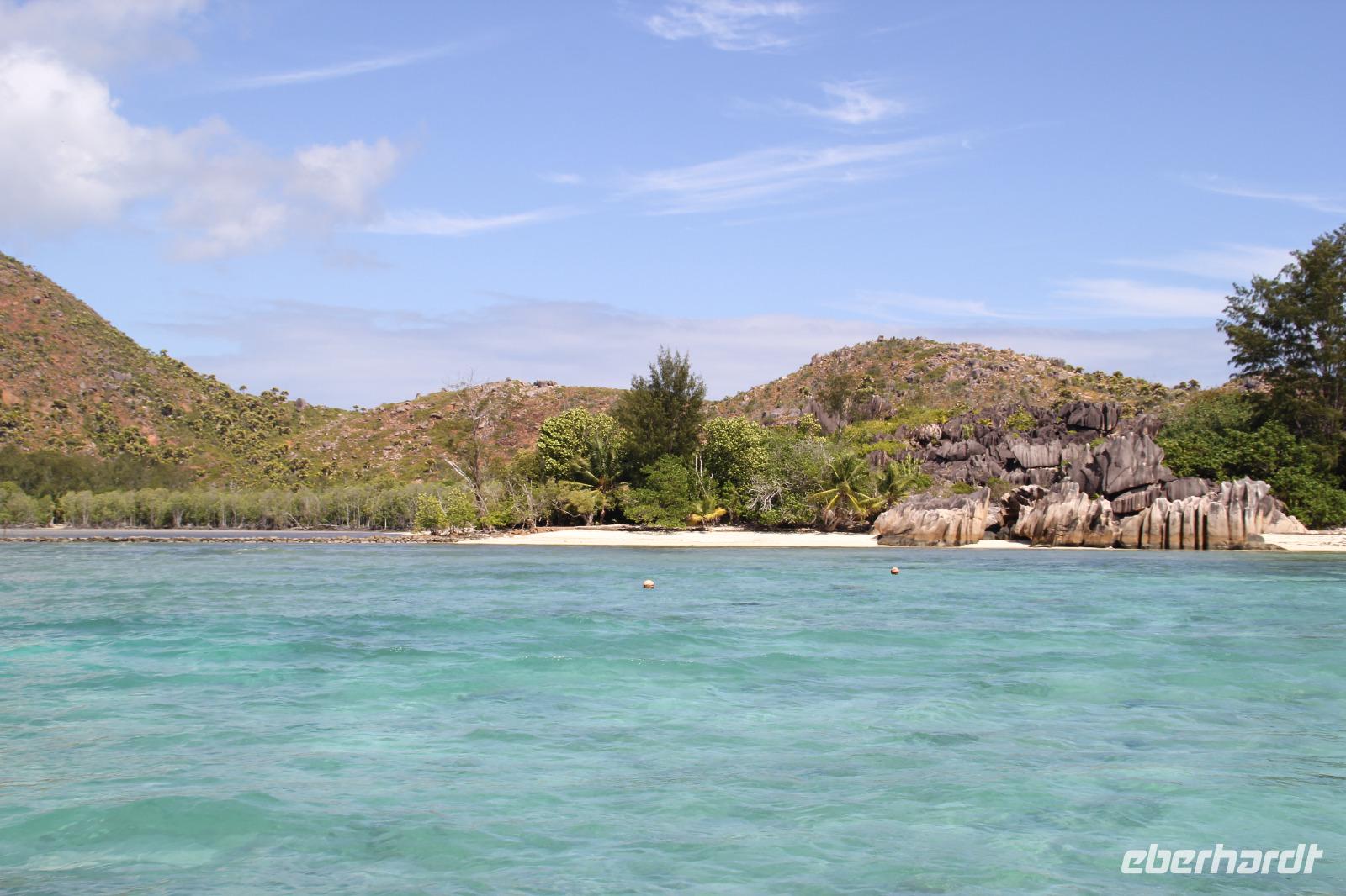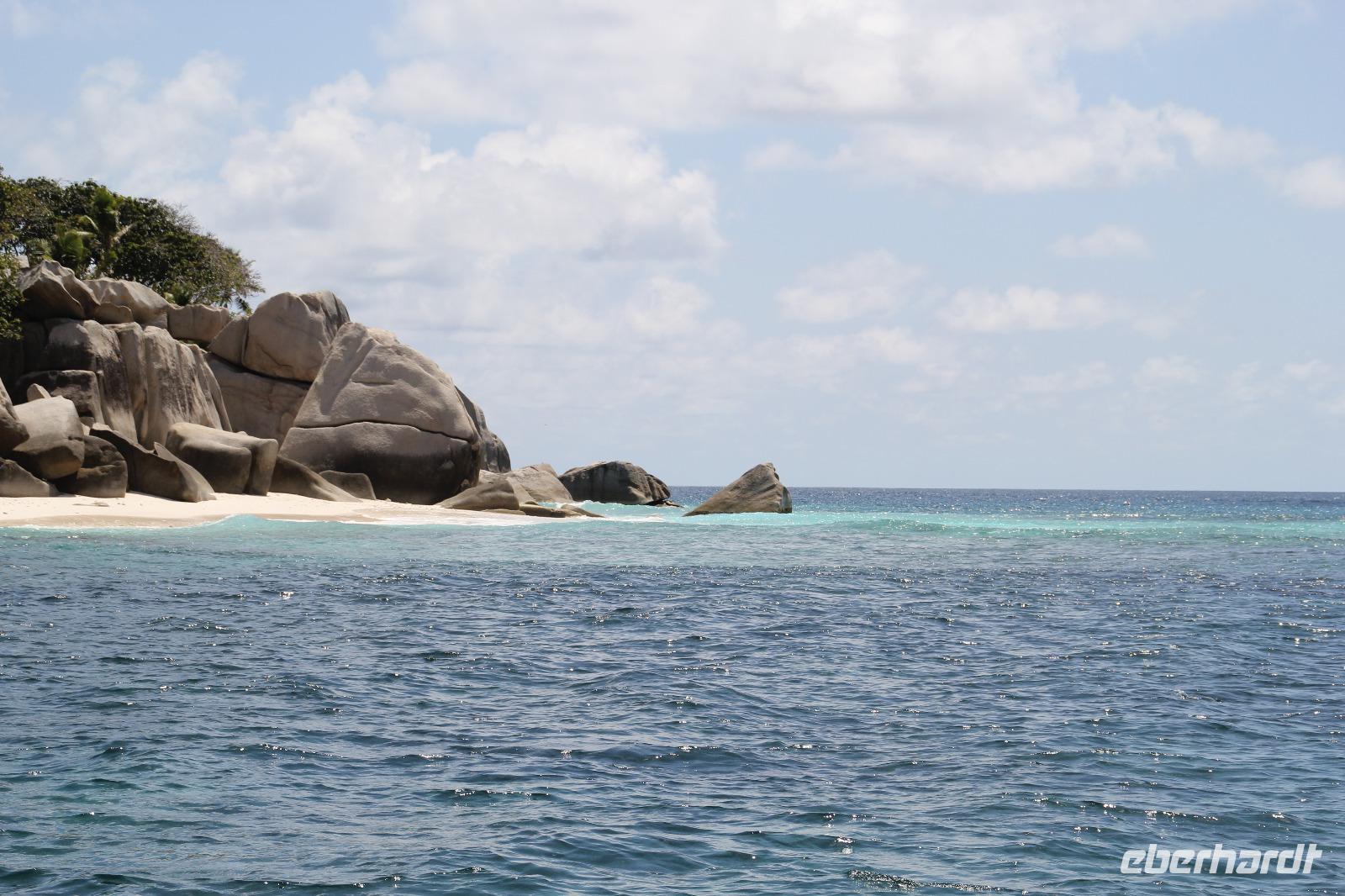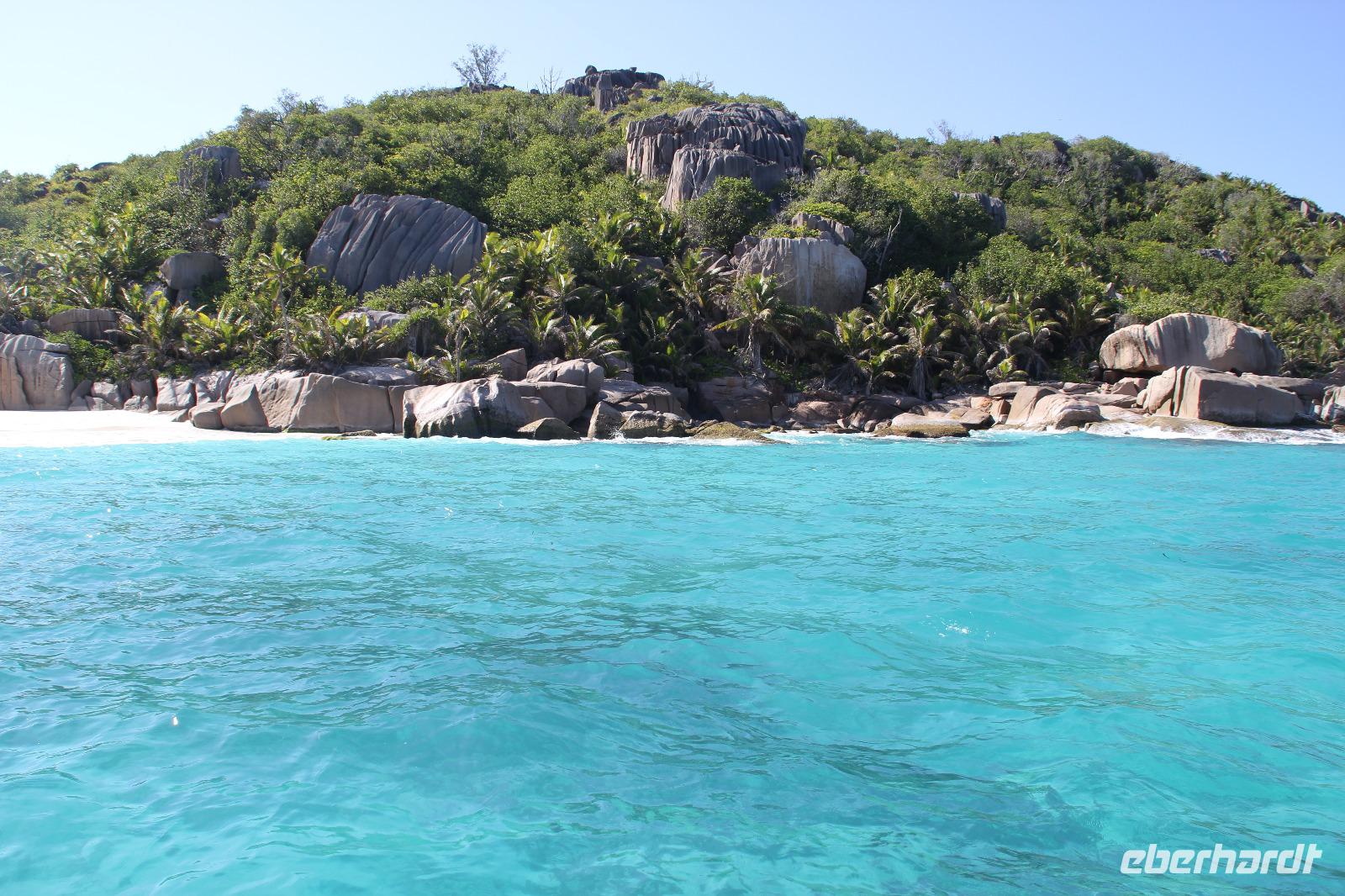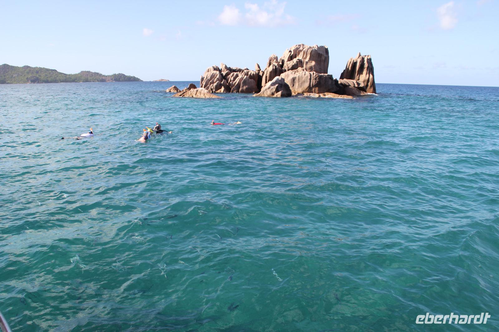 Wieder sehen wir viele bunte Fische in jeder Größe und Form Wer wollte, der konnte mit mir auch bis zur kleinen Felseninsel schwimmen und die sich die wunderschönen Granitfelsen aus nächster Nähe anschauen. Danach fuhr unser Skipper noch zur Nachbarinsel Felicite, für einen weiteren Schnorchel-Hotspot und damit wir Fotos von den herrlichen Stränden und Felsen machen konnten, die von der Brandung umspült wurden.