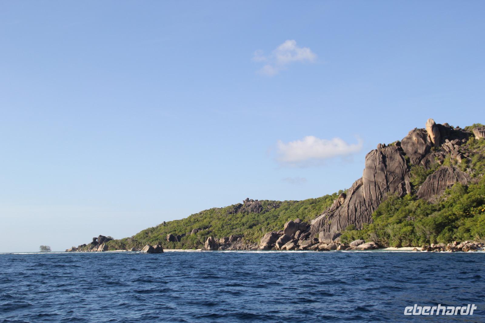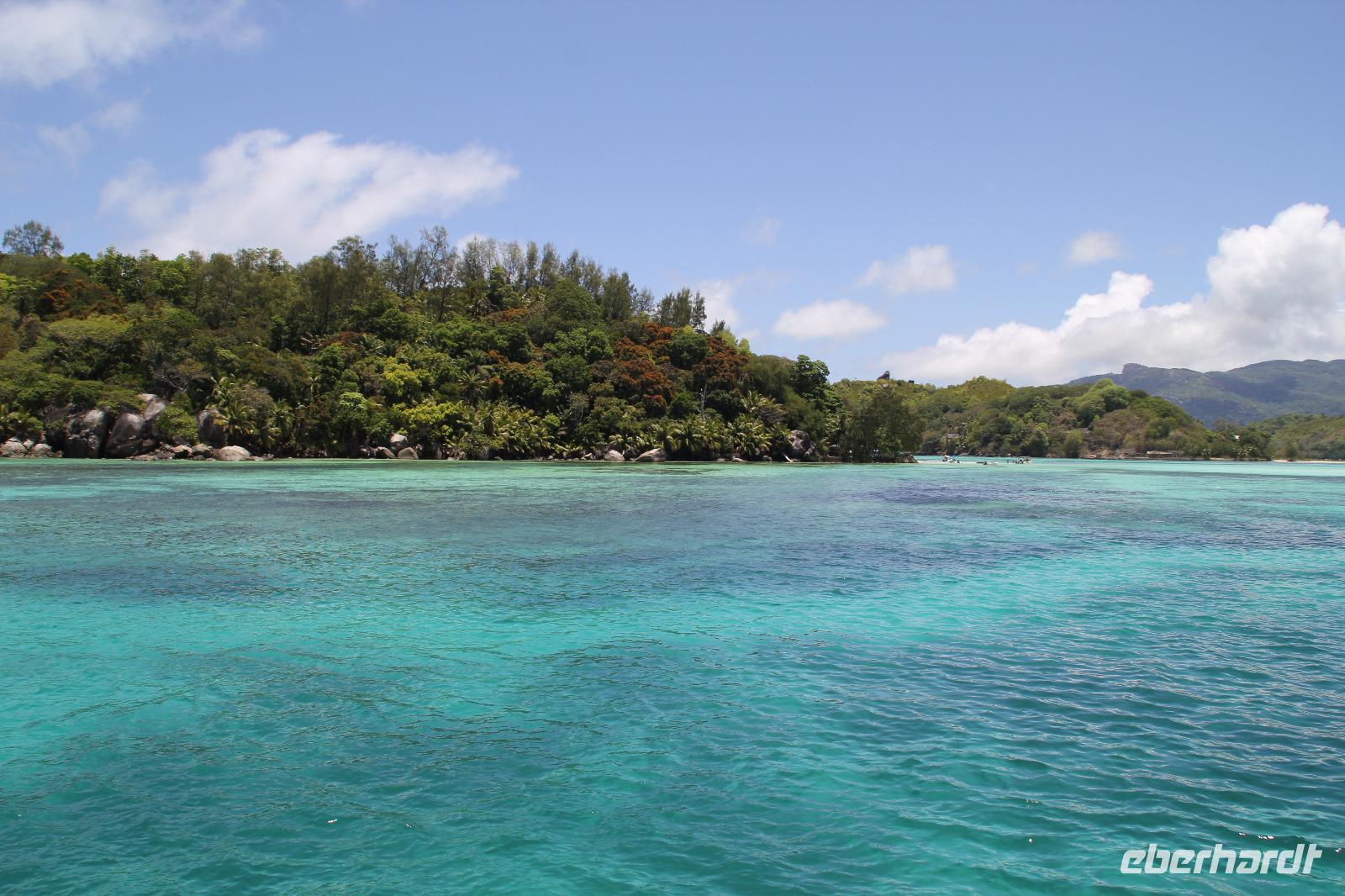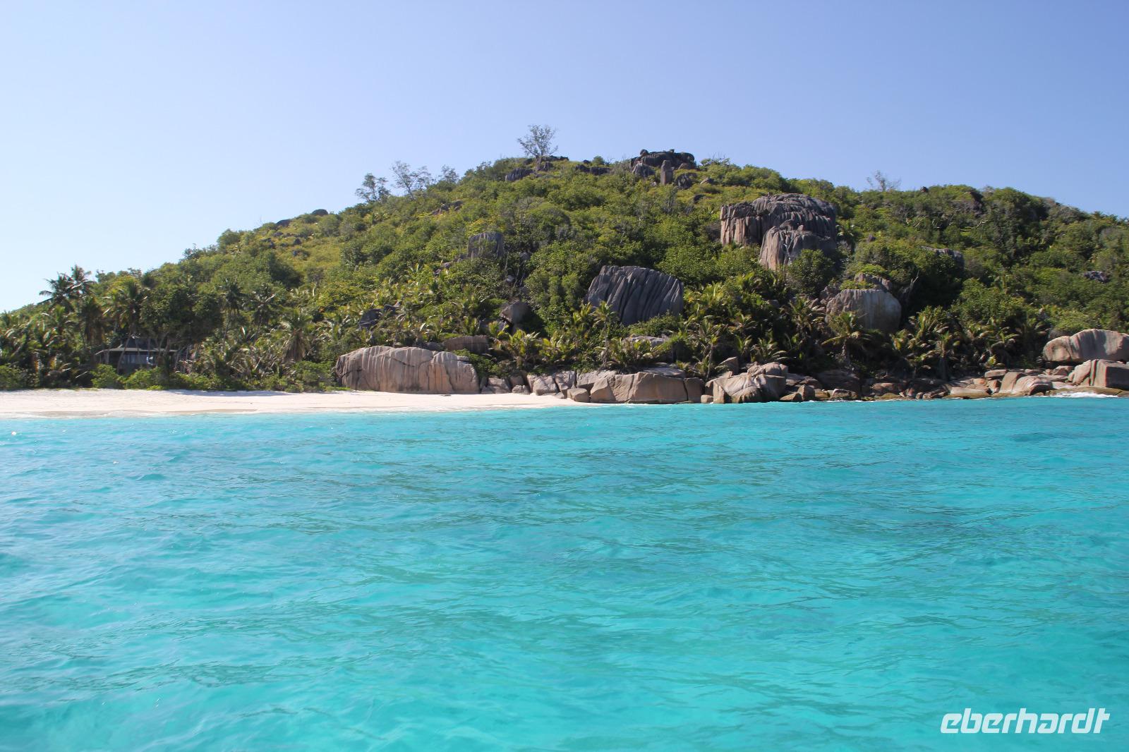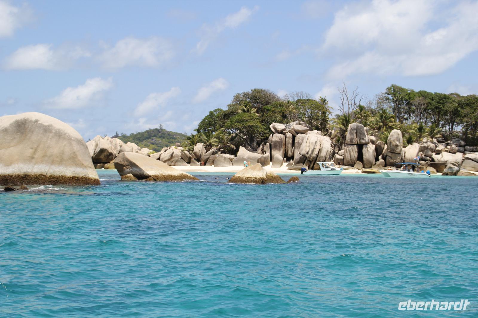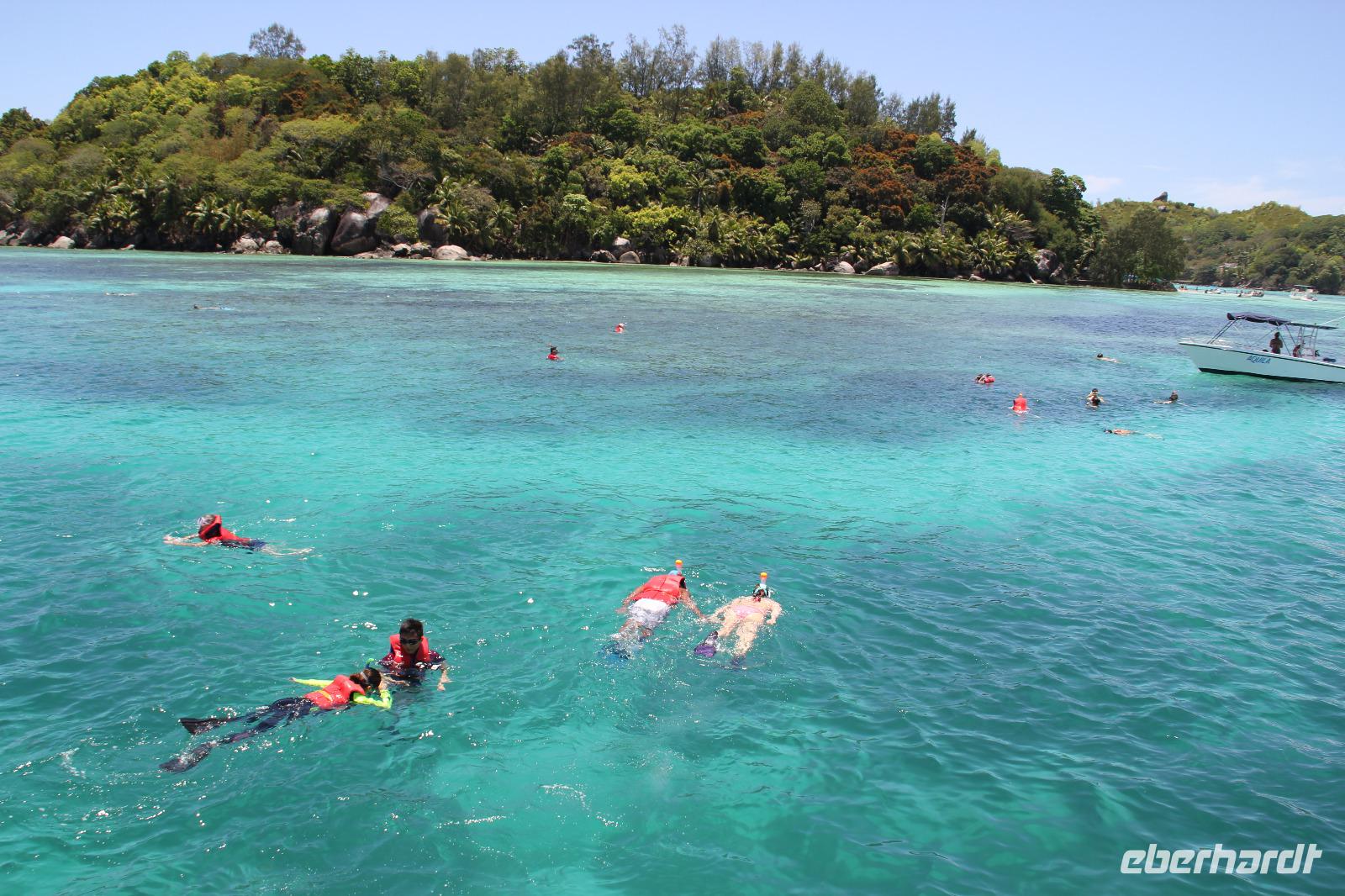 Wieder sehen wir viele bunte Fische in jeder Größe und Form Wer wollte, der konnte mit mir auch bis zur kleinen Felseninsel schwimmen und die sich die wunderschönen Granitfelsen aus nächster Nähe anschauen. Danach fuhr unser Skipper noch zur Nachbarinsel Felicite, für einen weiteren Schnorchel-Hotspot und damit wir Fotos von den herrlichen Stränden und Felsen machen konnten, die von der Brandung umspült wurden.