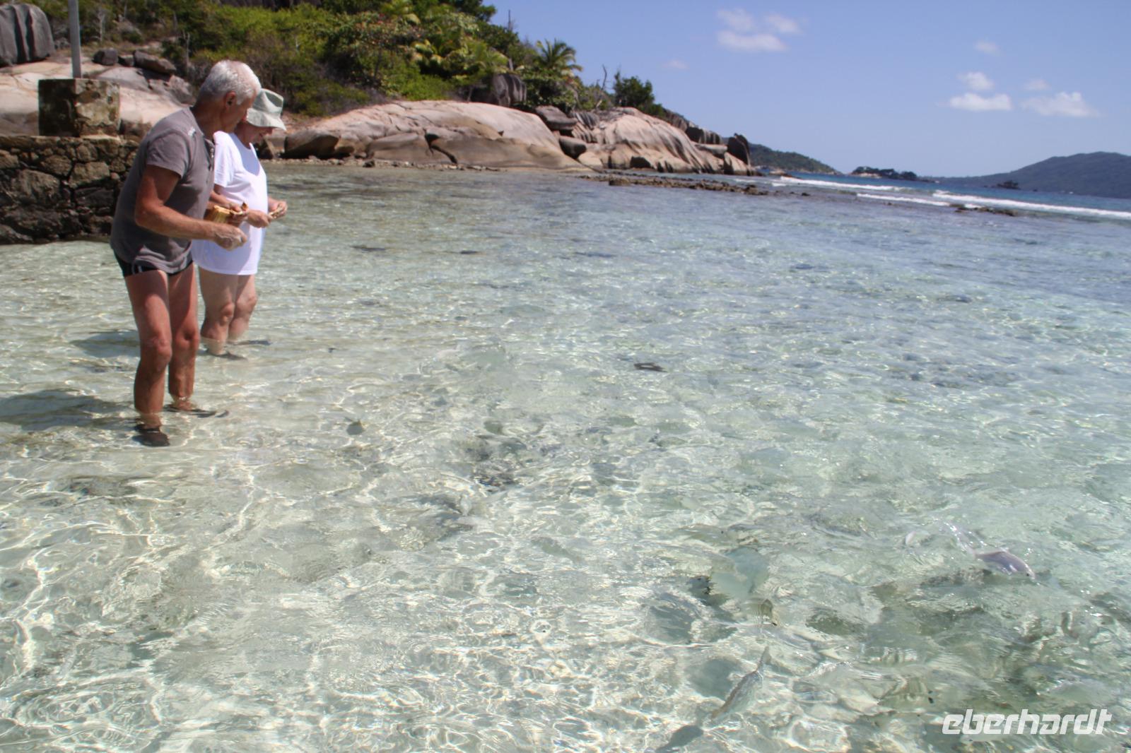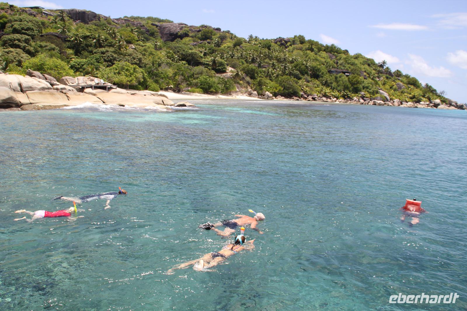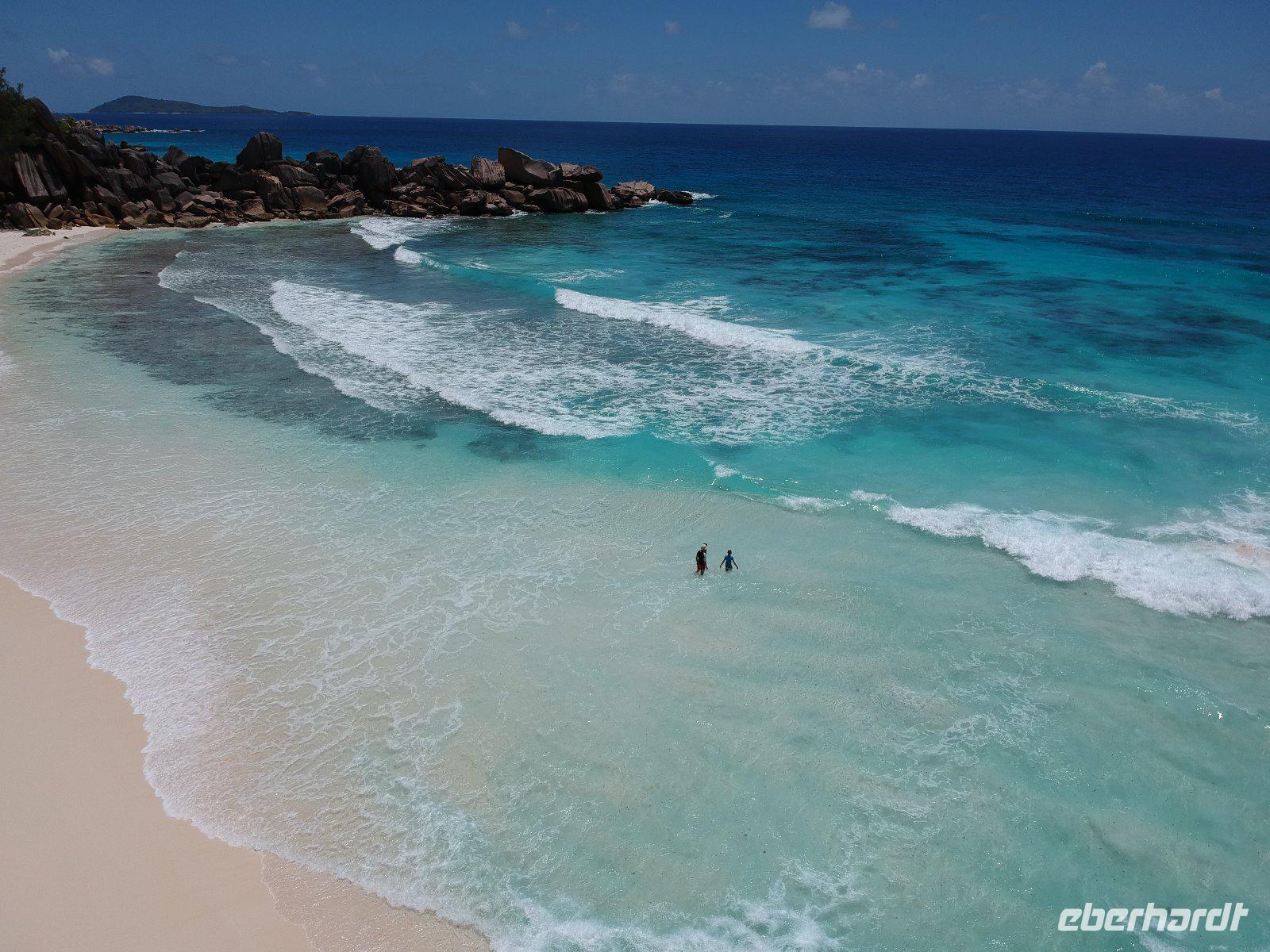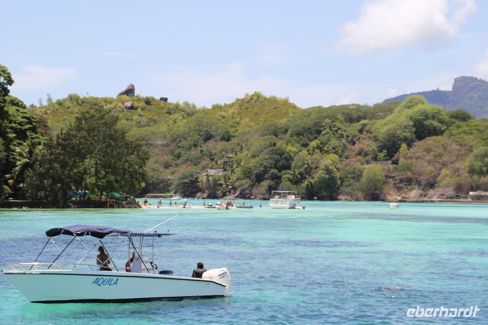 Wieder sehen wir viele bunte Fische in jeder Größe und Form Wer wollte, der konnte mit mir auch bis zur kleinen Felseninsel schwimmen und die sich die wunderschönen Granitfelsen aus nächster Nähe anschauen. Danach fuhr unser Skipper noch zur Nachbarinsel Felicite, für einen weiteren Schnorchel-Hotspot und damit wir Fotos von den herrlichen Stränden und Felsen machen konnten, die von der Brandung umspült wurden.