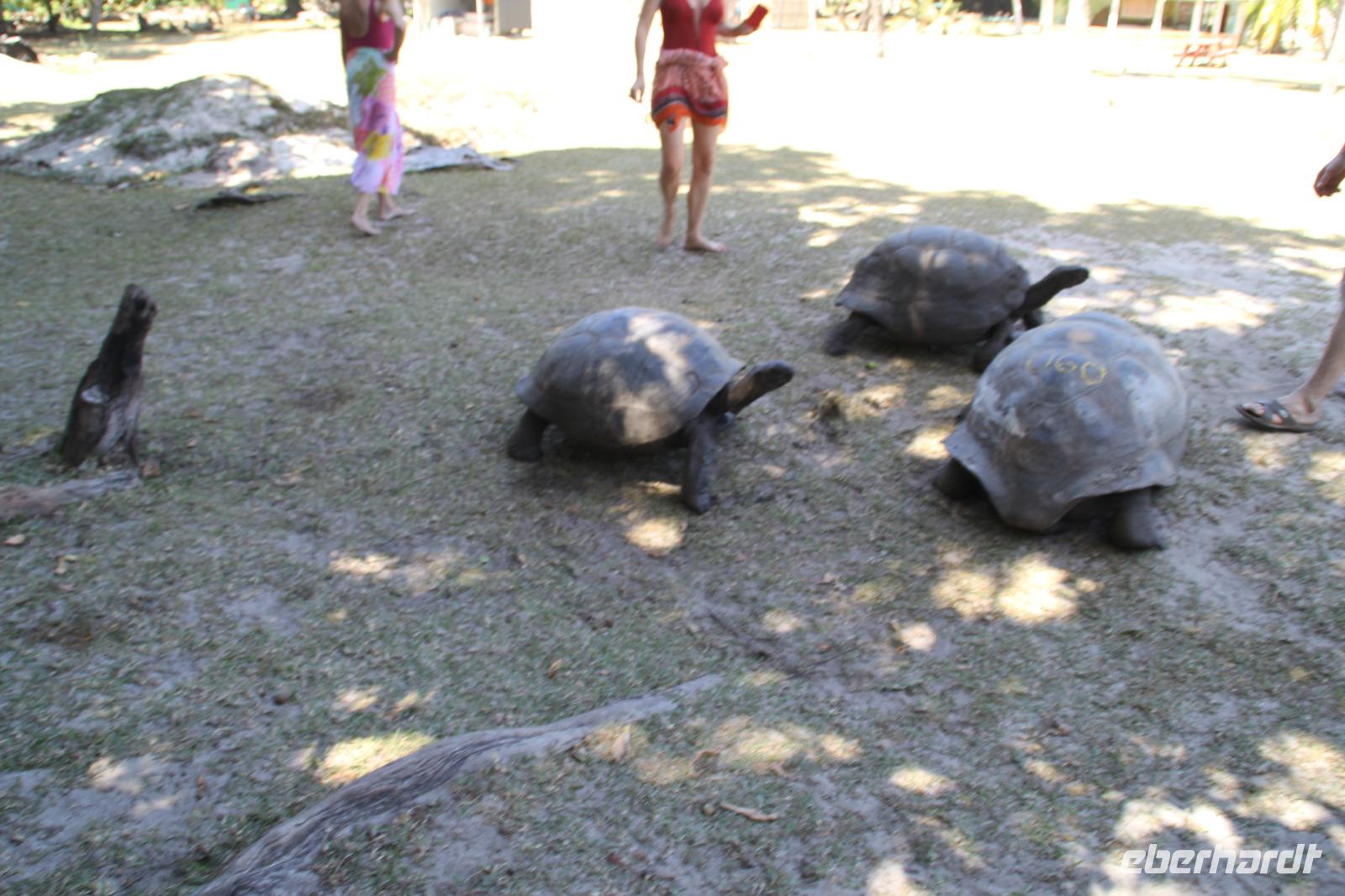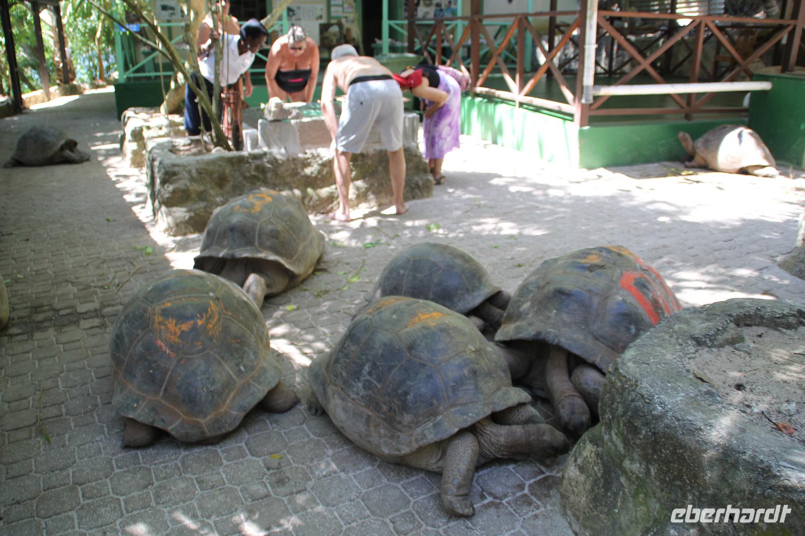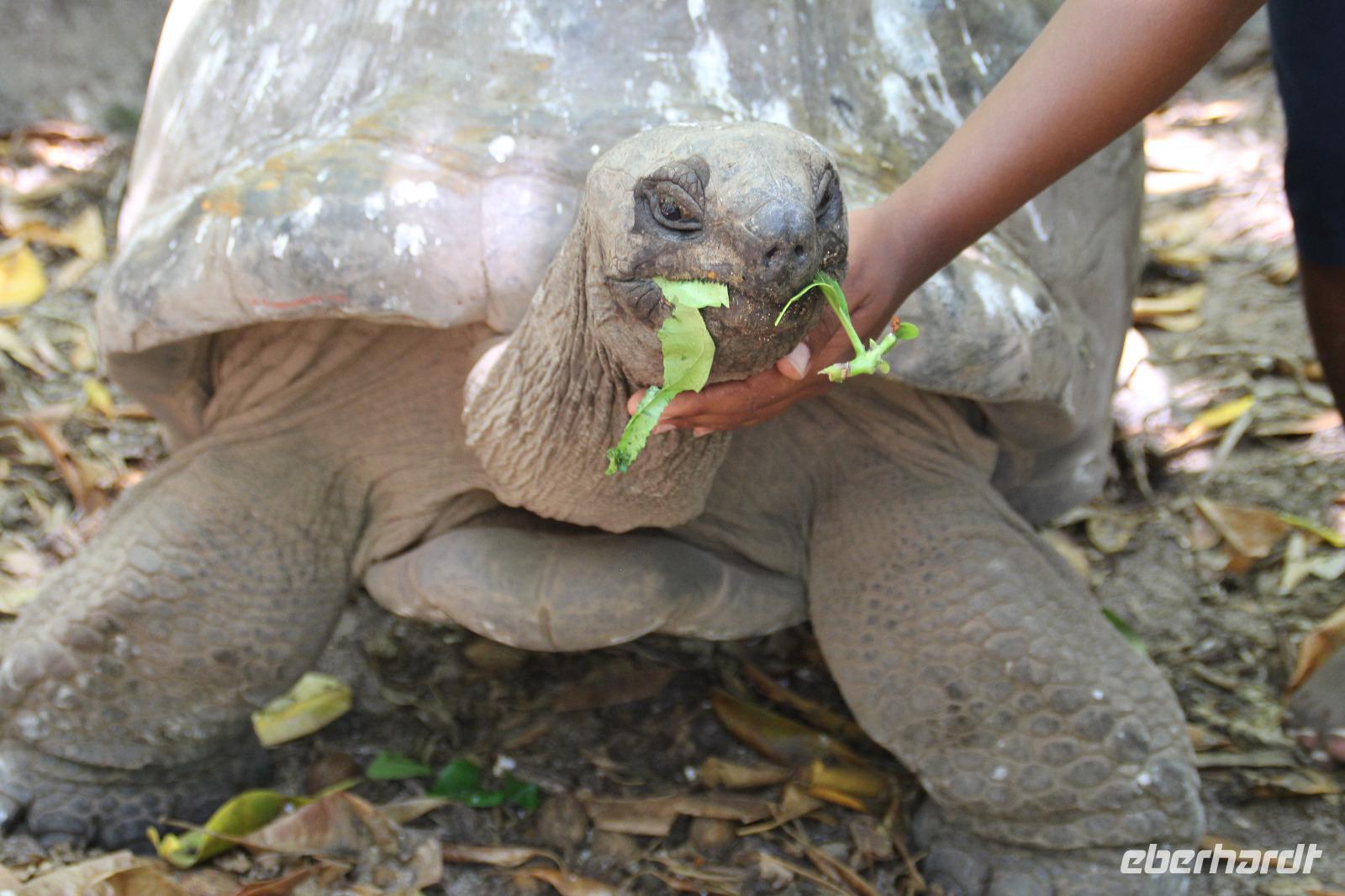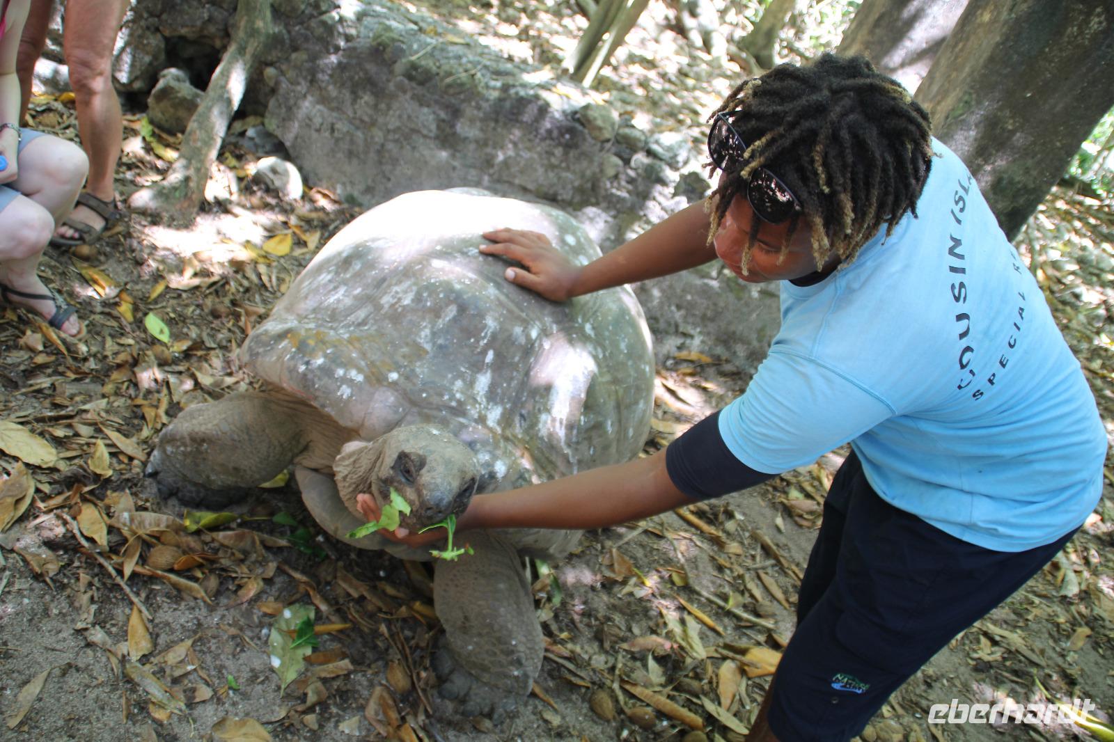 Von einem eigenen Ranger für unsere Gruppe wurden wir mit über die Insel geführt. Da die nistenden Vögel hier keine Feinde wie Katzen, Hunde oder Ratten zu befürchten haben, legen sie ihre Eier irgendwo ab: in hohlen Baumresten von Palmen, in Mulden zu ebener Erde oder auf bequem zu erreichenden Astvertiefungen. Dort werden die einzelnen Eier ausgebrütet und die putzigen kleinen Jungvögel sitzen dann dort, bewegen sich kein Stück, und werden gefüttert von den Eltern, bis sie schließlich flügge sind. In der Hauptsaison, leben mehrere zehntausend Vögel auf der Insel und sorgen so für eine ganze Menge tierischen Dünger, den Guano. Ganze Mauern sind hier aus hart gewordenen Guano-Brocken gebaut. Wir bestaunten nicht nur Vögel wie die Feenseeschwalbe, den Lesser Noddy oder den Weißschwanz-Tropikvogel, auch behäbigen Landschildkröten begegneten wir auf unserem einstündigen Spaziergang, die sich gern von uns am Kopf streicheln ließen. Nach unserem Rundgang bestiegen wir wieder unser Boot und fuhren nun auf die Insel Curieuse, wo uns schon ein leckeres Grillmittagessen erwartete. Unser Koch vom Hotel hatte gute Arbeit geleistet und so genossen wir leckeren Fisch, Hähnchen und Gemüse unter Palmen. Als Nachtisch ließen wir uns reife Maracuja, Bananen und Orangen schmecken. Auch die mitgebrachten eisgekühlten Getränke waren eine Wohltat. Nach dem Essen hatten wir noch Zeit, die Landschildkröten zu besuchen, die hier frei auf dem Rasen umher spazieren können. Es gibt sogar eine Art Kinderstation, in der der kleine Nachwuchs geschützt heranwachsen kann. Bevor wie Curieuse ganz verließen, machte unser Boot noch einmal Halt an einem anderen Strand auf der anderen Seite der Insel. Dort ließ ich wieder einmal meine Videodrohne aufsteigen, doch diesmal blendete die Sonne so stark, dass sie kurz in einer Palme fest hing und in den Sand hinunter fiel. Zum Glück funktionierte sie danach noch einwandfrei. :)
