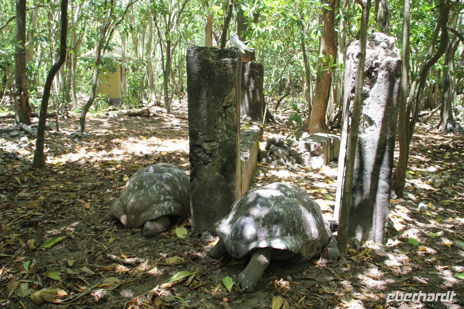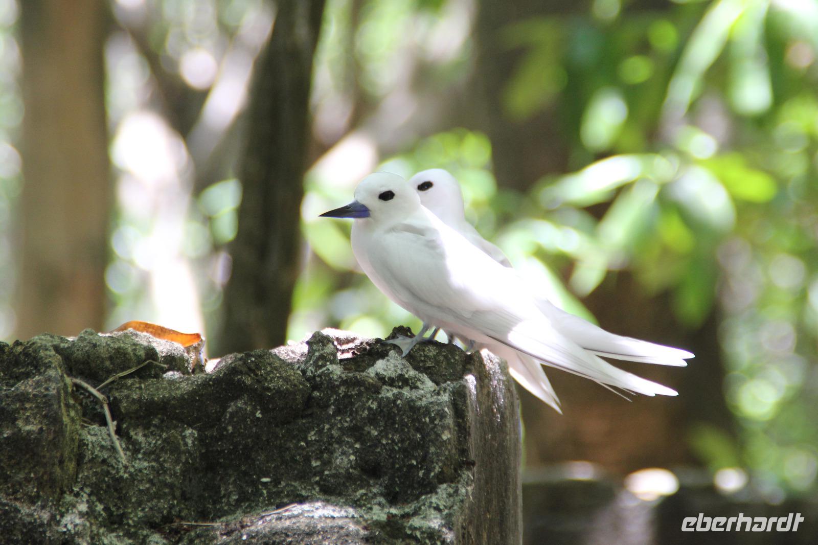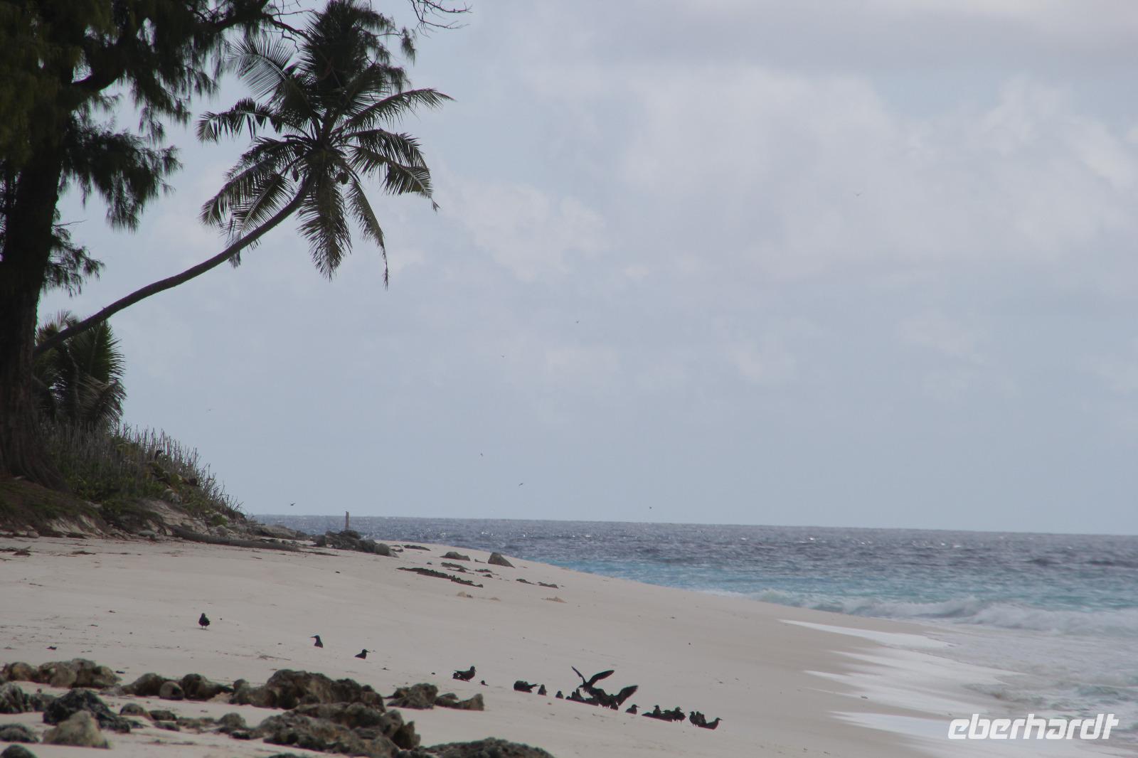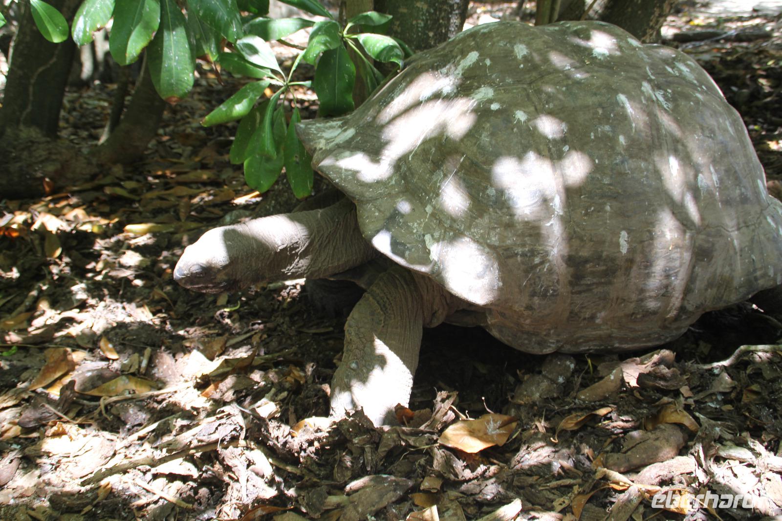 Von einem eigenen Ranger für unsere Gruppe wurden wir mit über die Insel geführt. Da die nistenden Vögel hier keine Feinde wie Katzen, Hunde oder Ratten zu befürchten haben, legen sie ihre Eier irgendwo ab: in hohlen Baumresten von Palmen, in Mulden zu ebener Erde oder auf bequem zu erreichenden Astvertiefungen. Dort werden die einzelnen Eier ausgebrütet und die putzigen kleinen Jungvögel sitzen dann dort, bewegen sich kein Stück, und werden gefüttert von den Eltern, bis sie schließlich flügge sind. In der Hauptsaison, leben mehrere zehntausend Vögel auf der Insel und sorgen so für eine ganze Menge tierischen Dünger, den Guano. Ganze Mauern sind hier aus hart gewordenen Guano-Brocken gebaut. Wir bestaunten nicht nur Vögel wie die Feenseeschwalbe, den Lesser Noddy oder den Weißschwanz-Tropikvogel, auch behäbigen Landschildkröten begegneten wir auf unserem einstündigen Spaziergang, die sich gern von uns am Kopf streicheln ließen. Nach unserem Rundgang bestiegen wir wieder unser Boot und fuhren nun auf die Insel Curieuse, wo uns schon ein leckeres Grillmittagessen erwartete. Unser Koch vom Hotel hatte gute Arbeit geleistet und so genossen wir leckeren Fisch, Hähnchen und Gemüse unter Palmen. Als Nachtisch ließen wir uns reife Maracuja, Bananen und Orangen schmecken. Auch die mitgebrachten eisgekühlten Getränke waren eine Wohltat. Nach dem Essen hatten wir noch Zeit, die Landschildkröten zu besuchen, die hier frei auf dem Rasen umher spazieren können. Es gibt sogar eine Art Kinderstation, in der der kleine Nachwuchs geschützt heranwachsen kann. Bevor wie Curieuse ganz verließen, machte unser Boot noch einmal Halt an einem anderen Strand auf der anderen Seite der Insel. Dort ließ ich wieder einmal meine Videodrohne aufsteigen, doch diesmal blendete die Sonne so stark, dass sie kurz in einer Palme fest hing und in den Sand hinunter fiel. Zum Glück funktionierte sie danach noch einwandfrei. :)