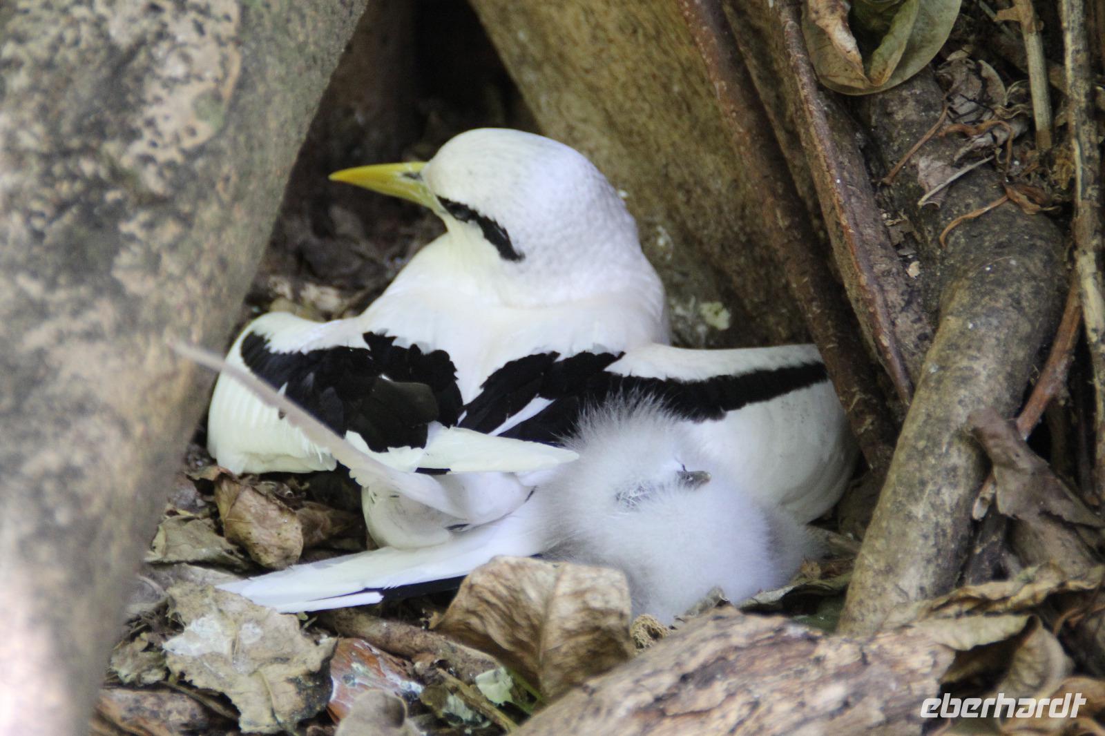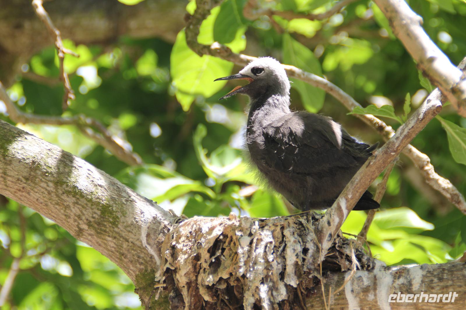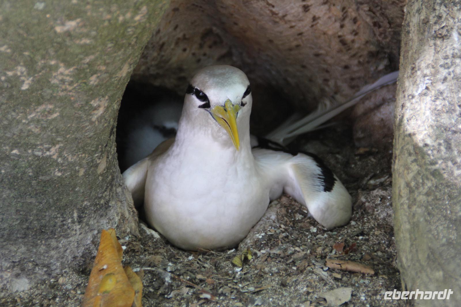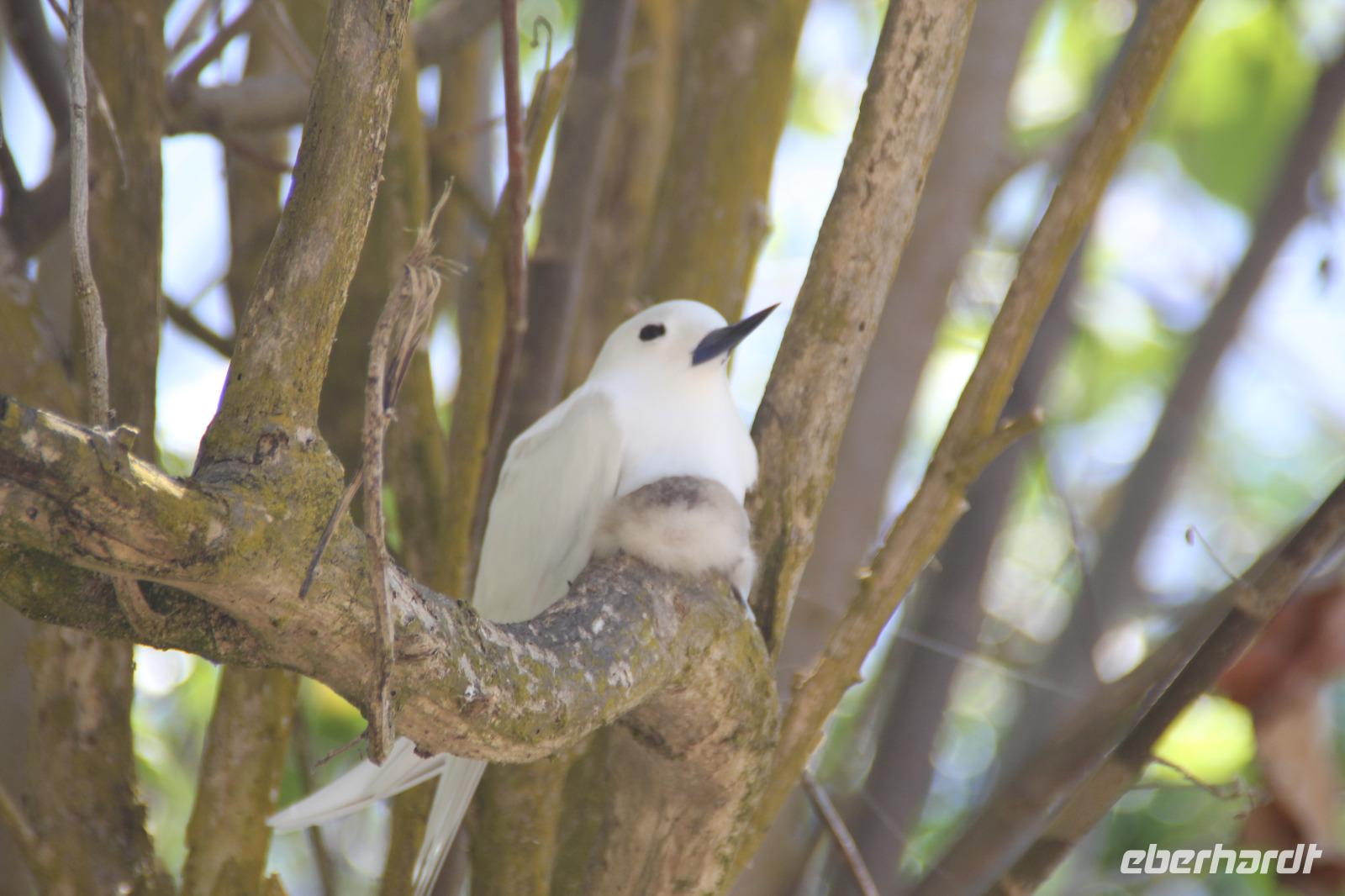 Von einem eigenen Ranger für unsere Gruppe wurden wir mit über die Insel geführt. Da die nistenden Vögel hier keine Feinde wie Katzen, Hunde oder Ratten zu befürchten haben, legen sie ihre Eier irgendwo ab: in hohlen Baumresten von Palmen, in Mulden zu ebener Erde oder auf bequem zu erreichenden Astvertiefungen. Dort werden die einzelnen Eier ausgebrütet und die putzigen kleinen Jungvögel sitzen dann dort, bewegen sich kein Stück, und werden gefüttert von den Eltern, bis sie schließlich flügge sind. In der Hauptsaison, leben mehrere zehntausend Vögel auf der Insel und sorgen so für eine ganze Menge tierischen Dünger, den Guano. Ganze Mauern sind hier aus hart gewordenen Guano-Brocken gebaut. Wir bestaunten nicht nur Vögel wie die Feenseeschwalbe, den Lesser Noddy oder den Weißschwanz-Tropikvogel, auch behäbigen Landschildkröten begegneten wir auf unserem einstündigen Spaziergang, die sich gern von uns am Kopf streicheln ließen. Nach unserem Rundgang bestiegen wir wieder unser Boot und fuhren nun auf die Insel Curieuse, wo uns schon ein leckeres Grillmittagessen erwartete. Unser Koch vom Hotel hatte gute Arbeit geleistet und so genossen wir leckeren Fisch, Hähnchen und Gemüse unter Palmen. Als Nachtisch ließen wir uns reife Maracuja, Bananen und Orangen schmecken. Auch die mitgebrachten eisgekühlten Getränke waren eine Wohltat. Nach dem Essen hatten wir noch Zeit, die Landschildkröten zu besuchen, die hier frei auf dem Rasen umher spazieren können. Es gibt sogar eine Art Kinderstation, in der der kleine Nachwuchs geschützt heranwachsen kann. Bevor wie Curieuse ganz verließen, machte unser Boot noch einmal Halt an einem anderen Strand auf der anderen Seite der Insel. Dort ließ ich wieder einmal meine Videodrohne aufsteigen, doch diesmal blendete die Sonne so stark, dass sie kurz in einer Palme fest hing und in den Sand hinunter fiel. Zum Glück funktionierte sie danach noch einwandfrei. :)