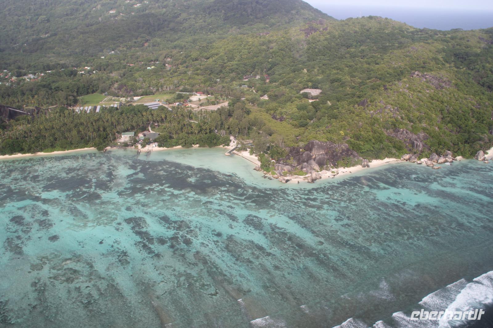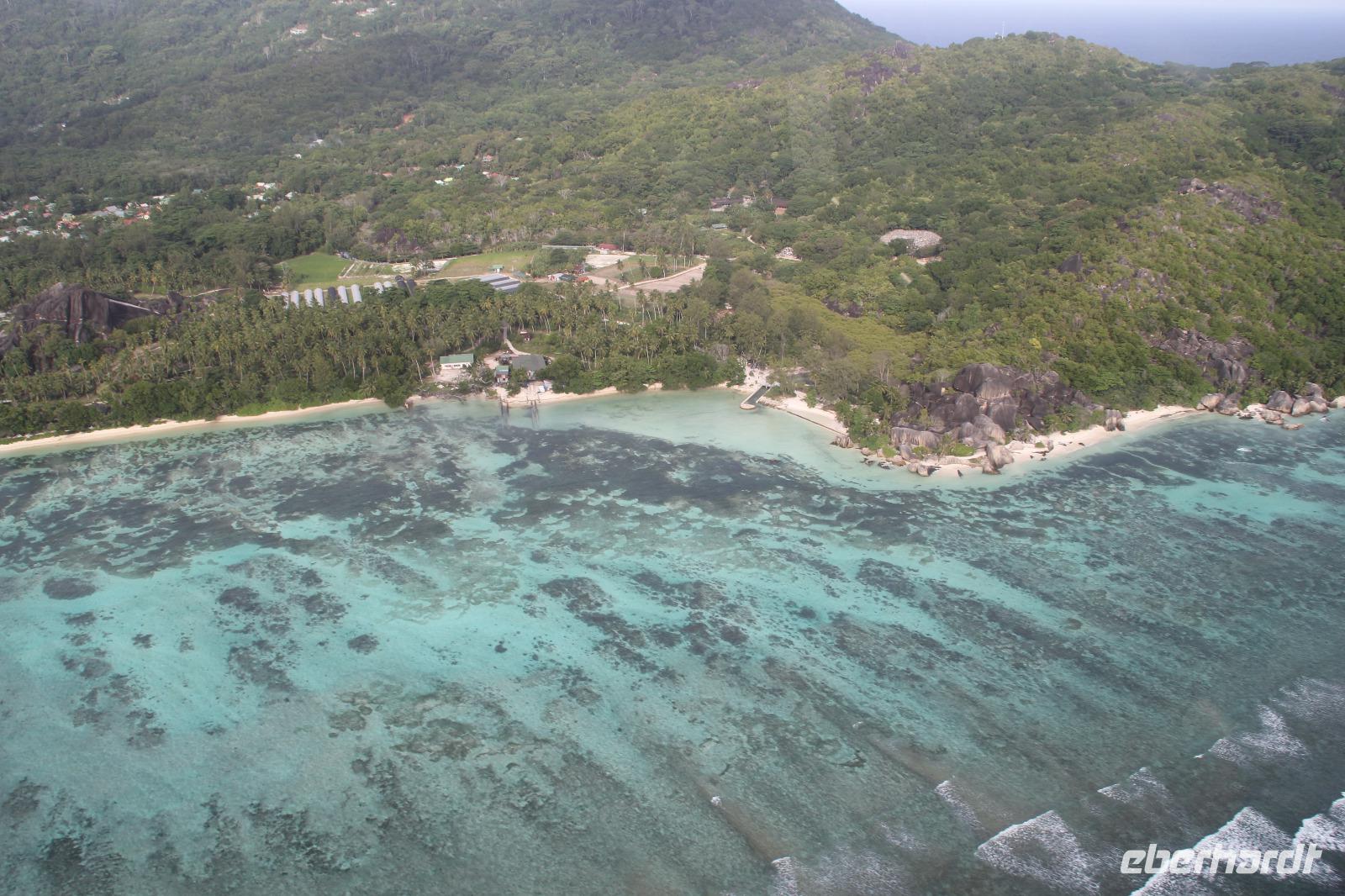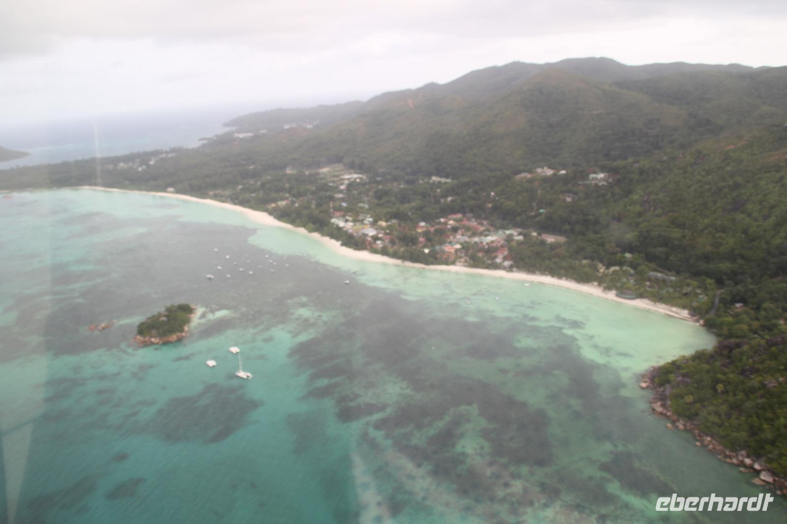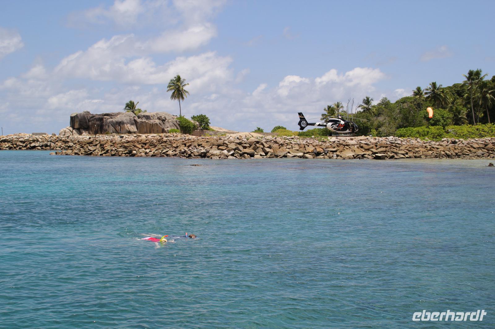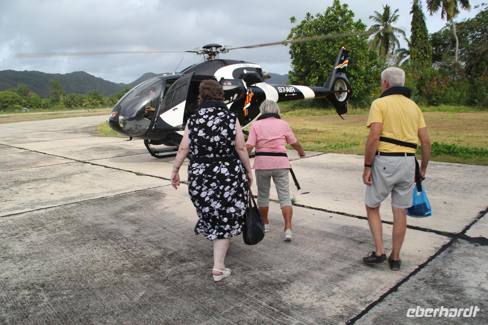 An unserem 5. Reisetag stand erst einmal Freizeit an. Alle Gäste ruhten sich aus und genossen Sonne, Strand und Meer. Am Nachmittag fuhr ich mit 3 Reisegästen zum Flughafen von Praslin, um mit einem Helikopter über die Inselwelt zu fliegen. Gemeinsam mit unserem örtlichen Reiseleiter Cyril konnten wir diesen Flug organisieren, weil an dem Tag glücklicher weiße der Hubschrauber Gäste von Mahé nach Praslin brachte.