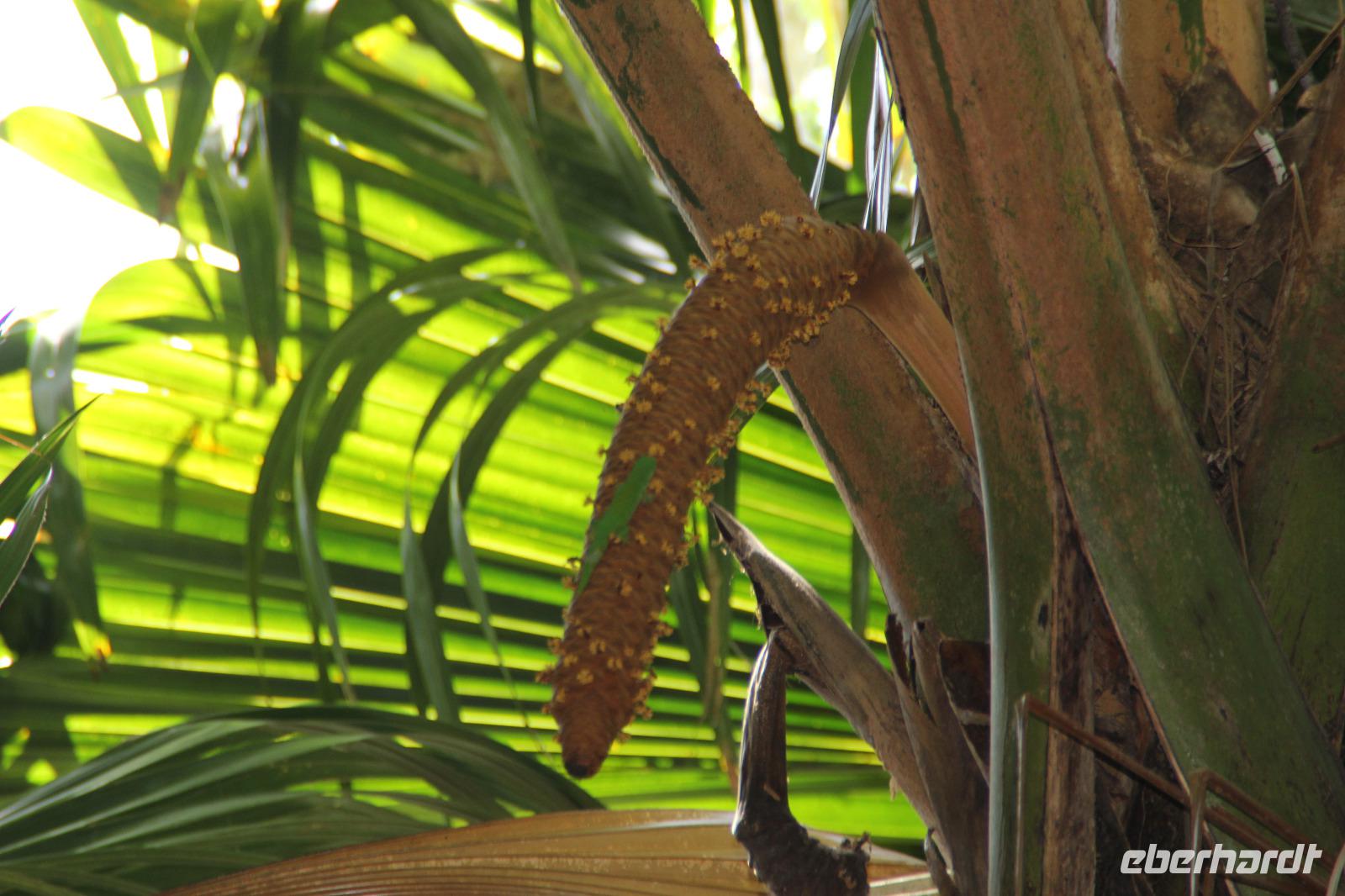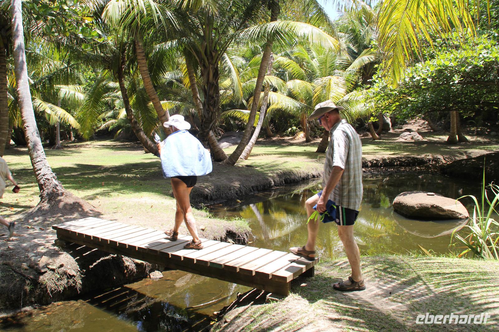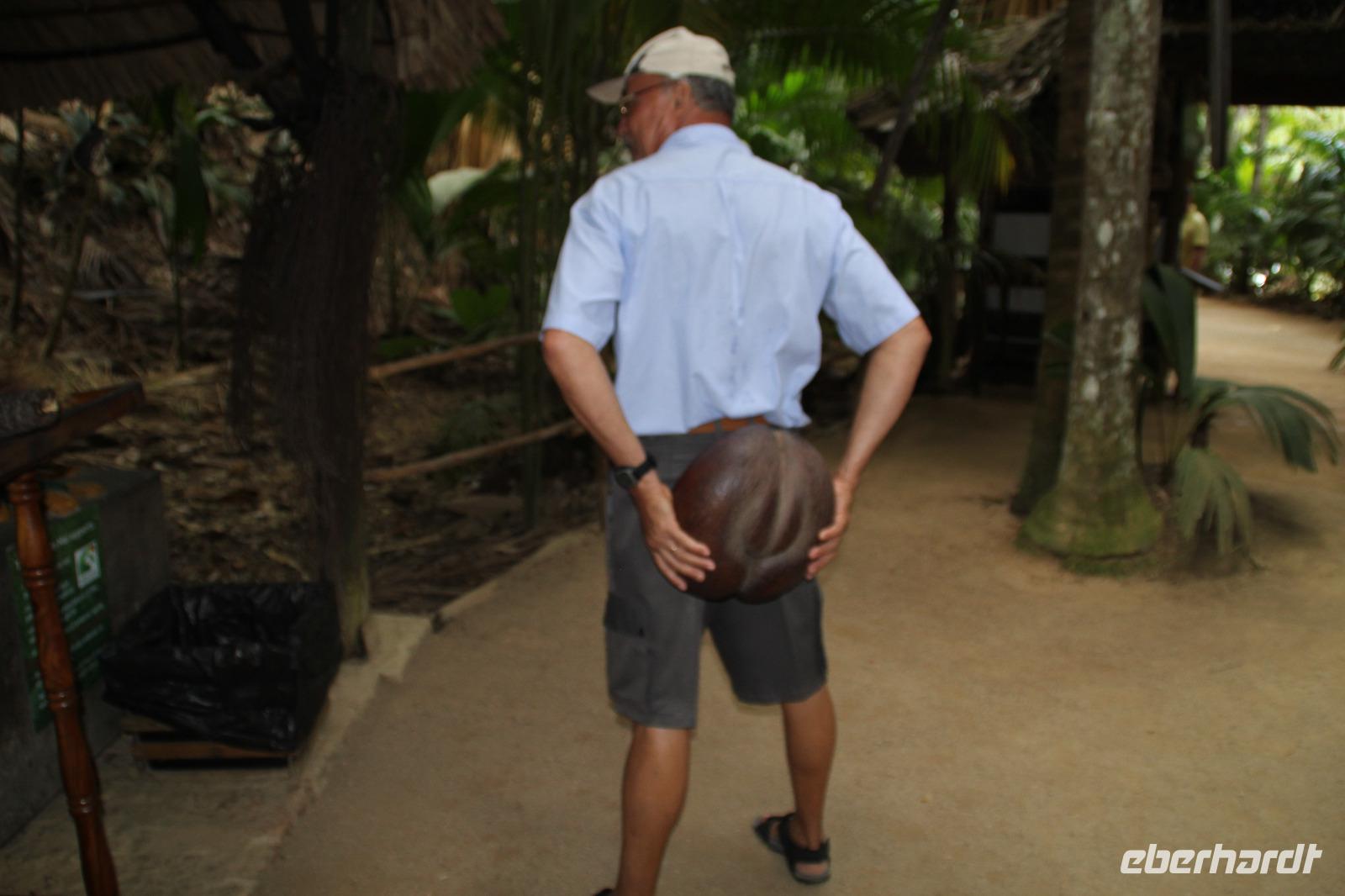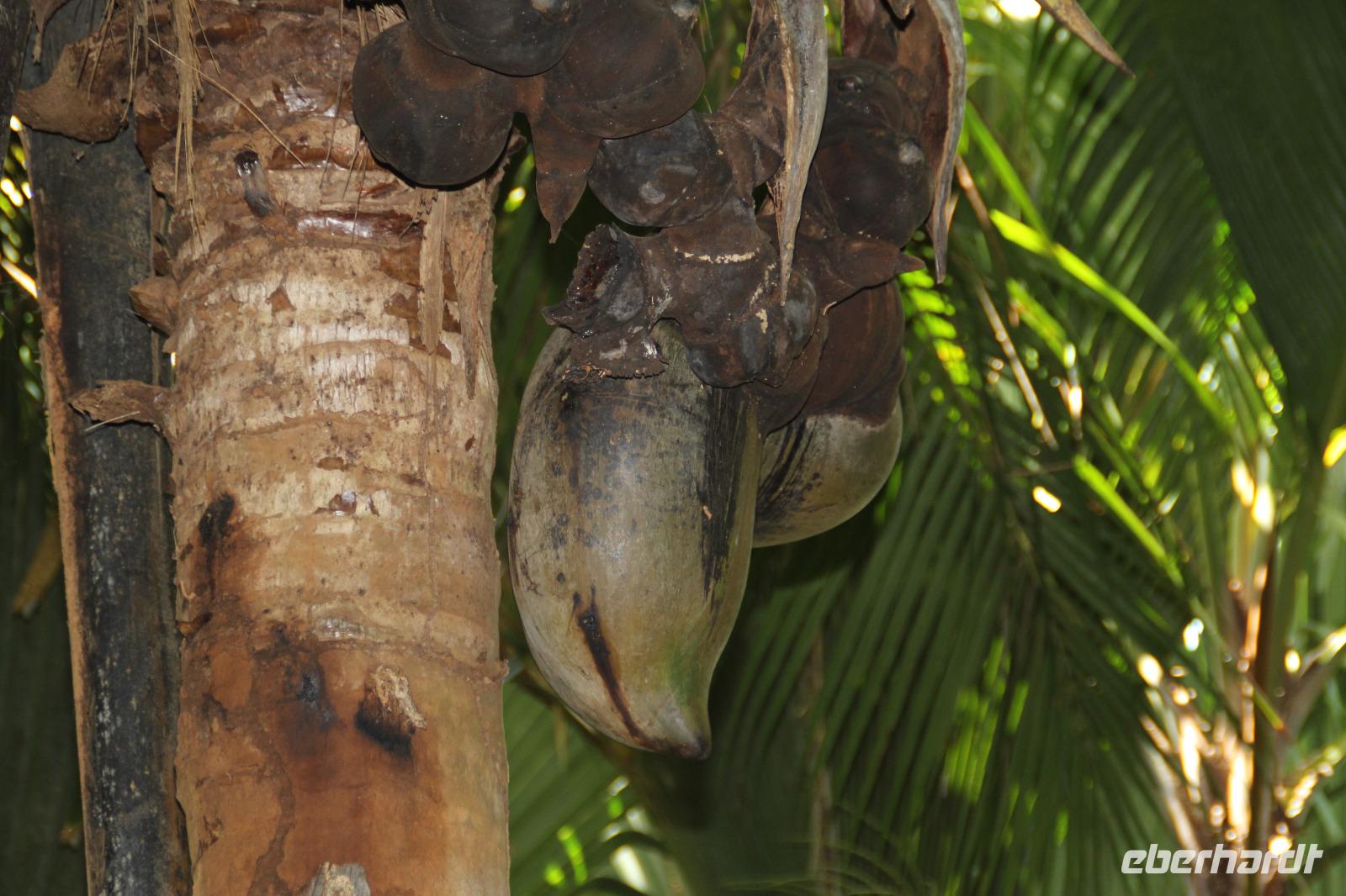 Nun war es Zeit auch die zweitgrößte Seychellen Insel zu entdecken. Somit fuhren wir nach dem Frühstück mit dem Hotelboot hinüber zum Praslin Jetty. Dort trafen wir unseren örtlichen Reiseleiter Cyril wieder. Wir stiegen in einen kleinen Bus und fuhren in Richtung Zentrum der Insel Praslin. Dort erwartete uns eine der größten Attraktionen hier: der Nationalpark „Vallée de Mai". Dabei handelt es sich um einen Urwald im Zentrum der Insel, der im Jahre 1983 auf die Weltkulturerbe-Liste der UNESCO gesetzt wurde. Das Besondere hier sind sechs endemische Palmenarten, die es eben nur hier gibt. Darunter die berühmteste der Seychellen: die Coco de Mer. Die weiblichen Palmen bilden die größte Nuss der Welt, ihr Aussehen gleicht dem wohlgeformten Po einer Frau, auch die Blütenstände der männlichen Coco de Mer erinnern an durchaus menschliche männliche Körperteile. Cyril führte uns durch den Park, der wie ein Urwald vieles zu entdecken hat. Wir fotografierten Geckos und verschiedene Vögel, er erklärte uns viel Neues über die Palmen und andere hier vorkommenden Pflanzen, wie Farne und Schraubenbäume. Nach einem interessanten Spaziergang durch den Wald stiegen wir wieder in unseren Bus und fuhren in Richtung Nordwesten der Insel. Weil noch Zeit bis zum Mittagessen blieb, hielten wir an einer Perlenfarm, wo wir die Muscheln und schwarzen Perlen begutachten konnten.