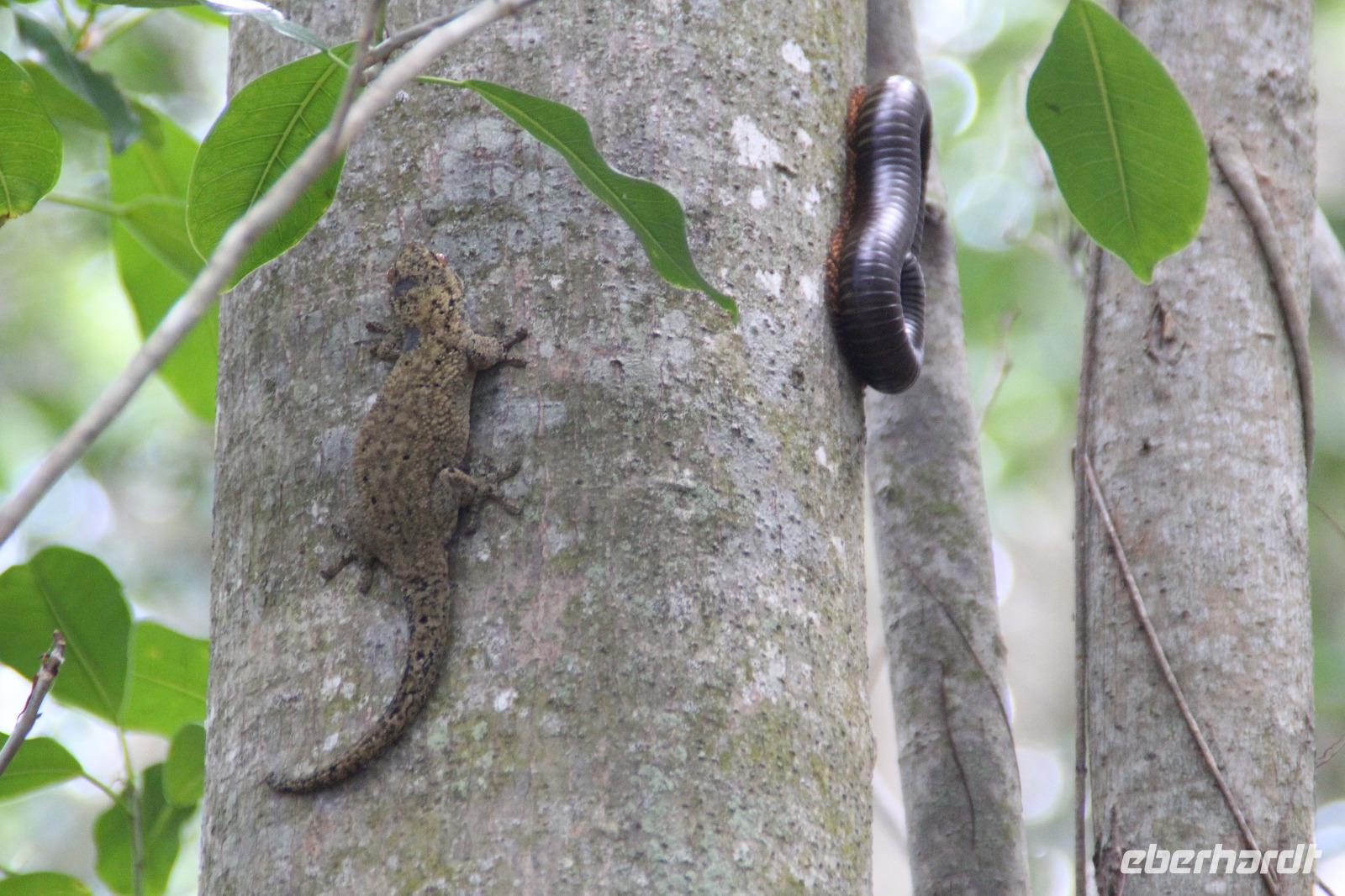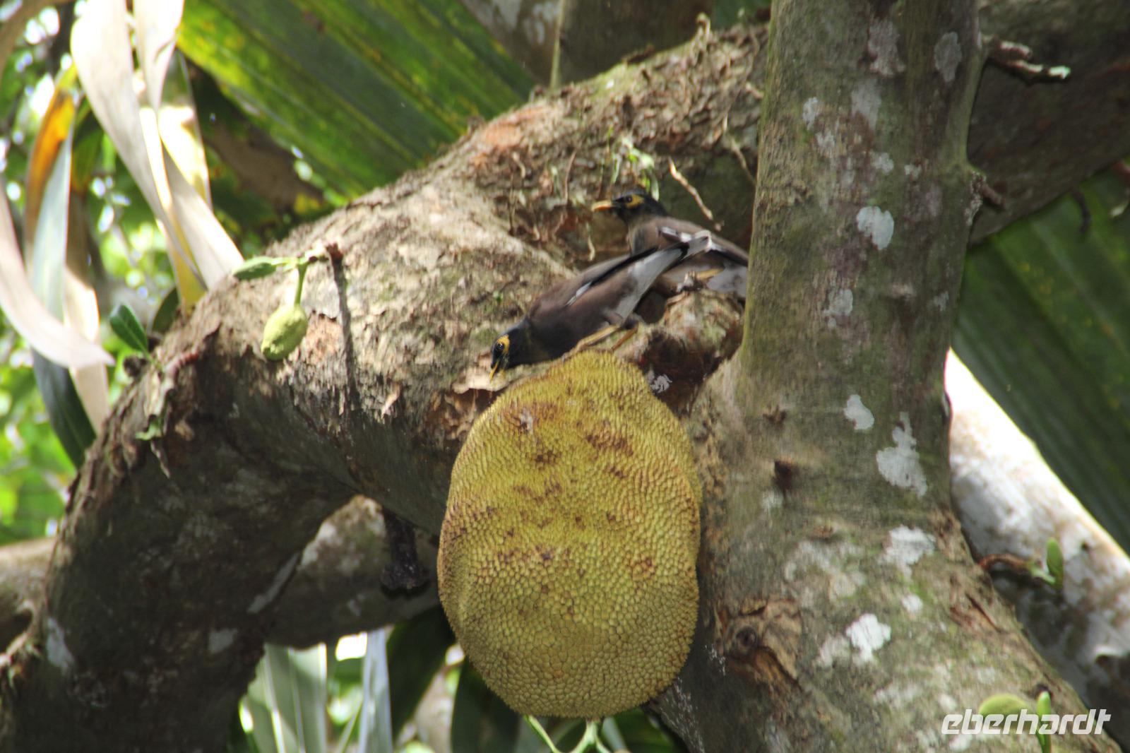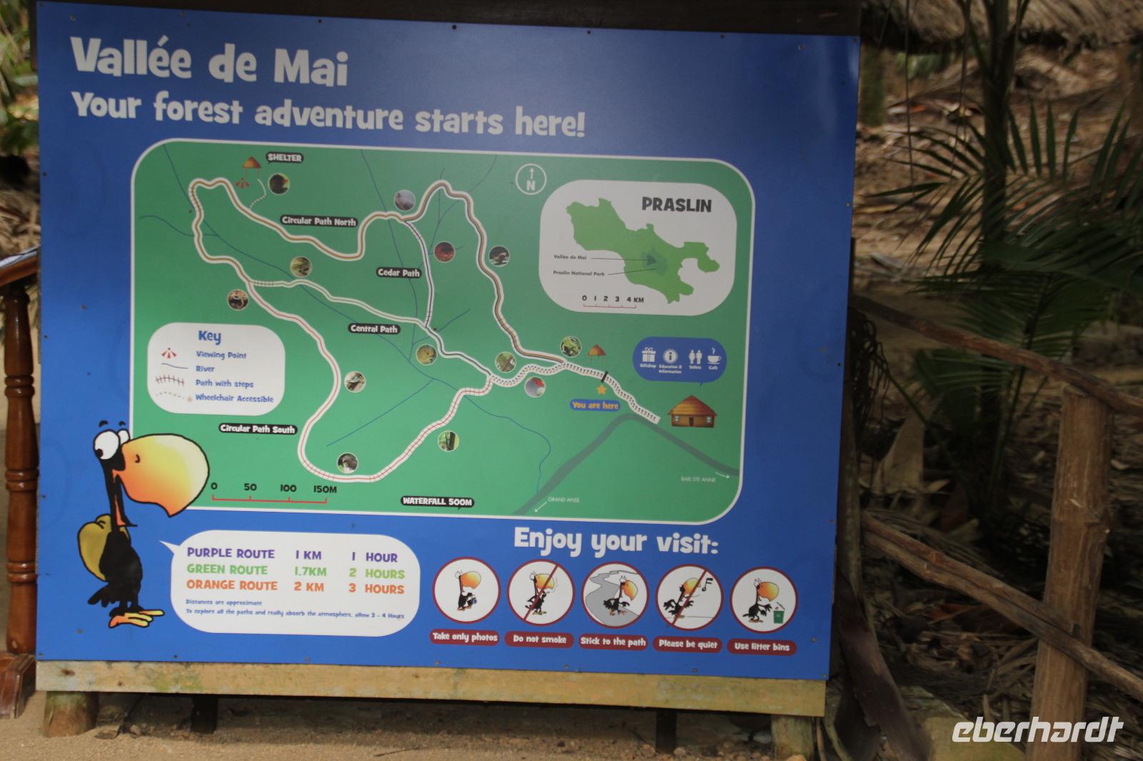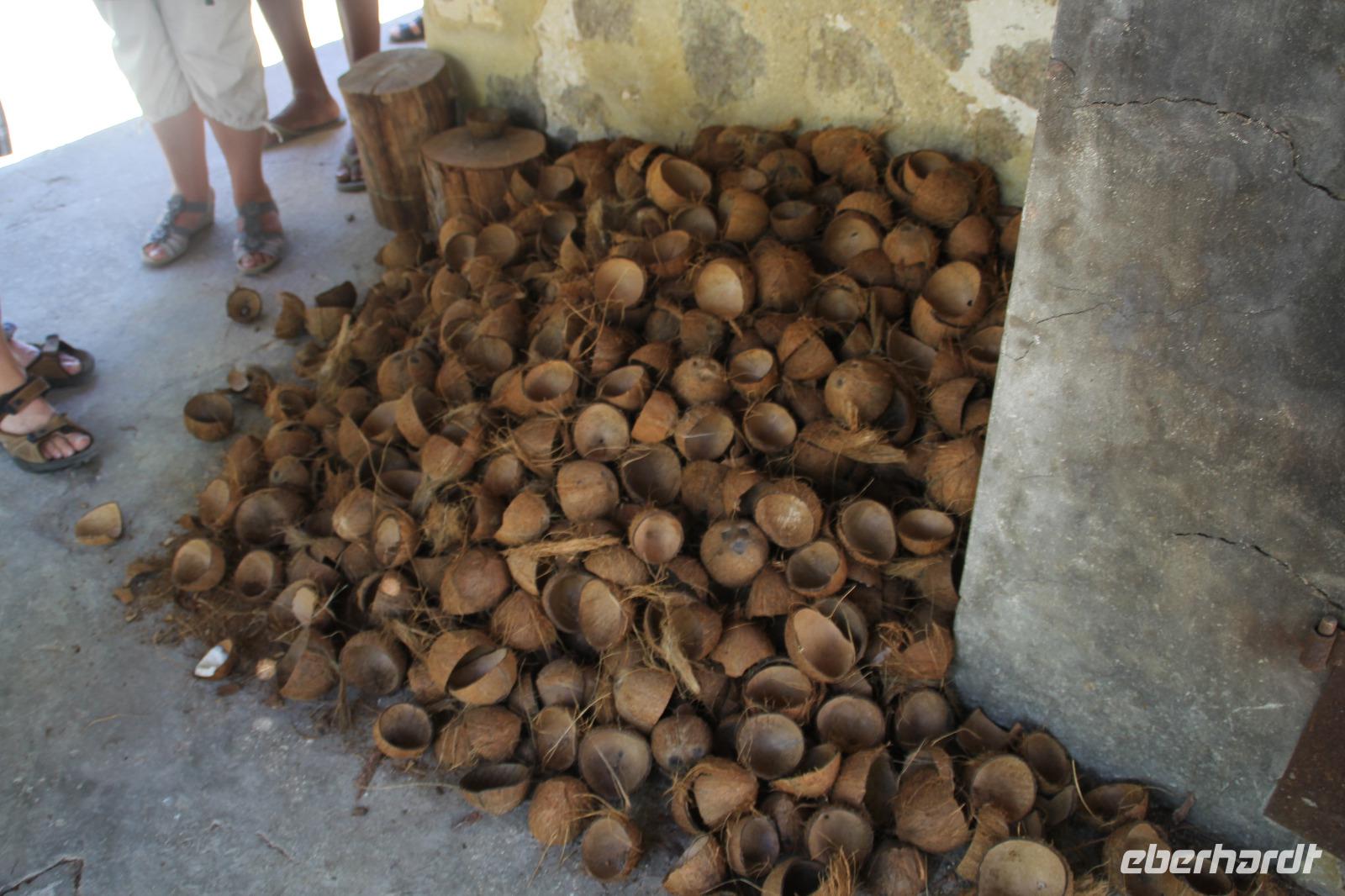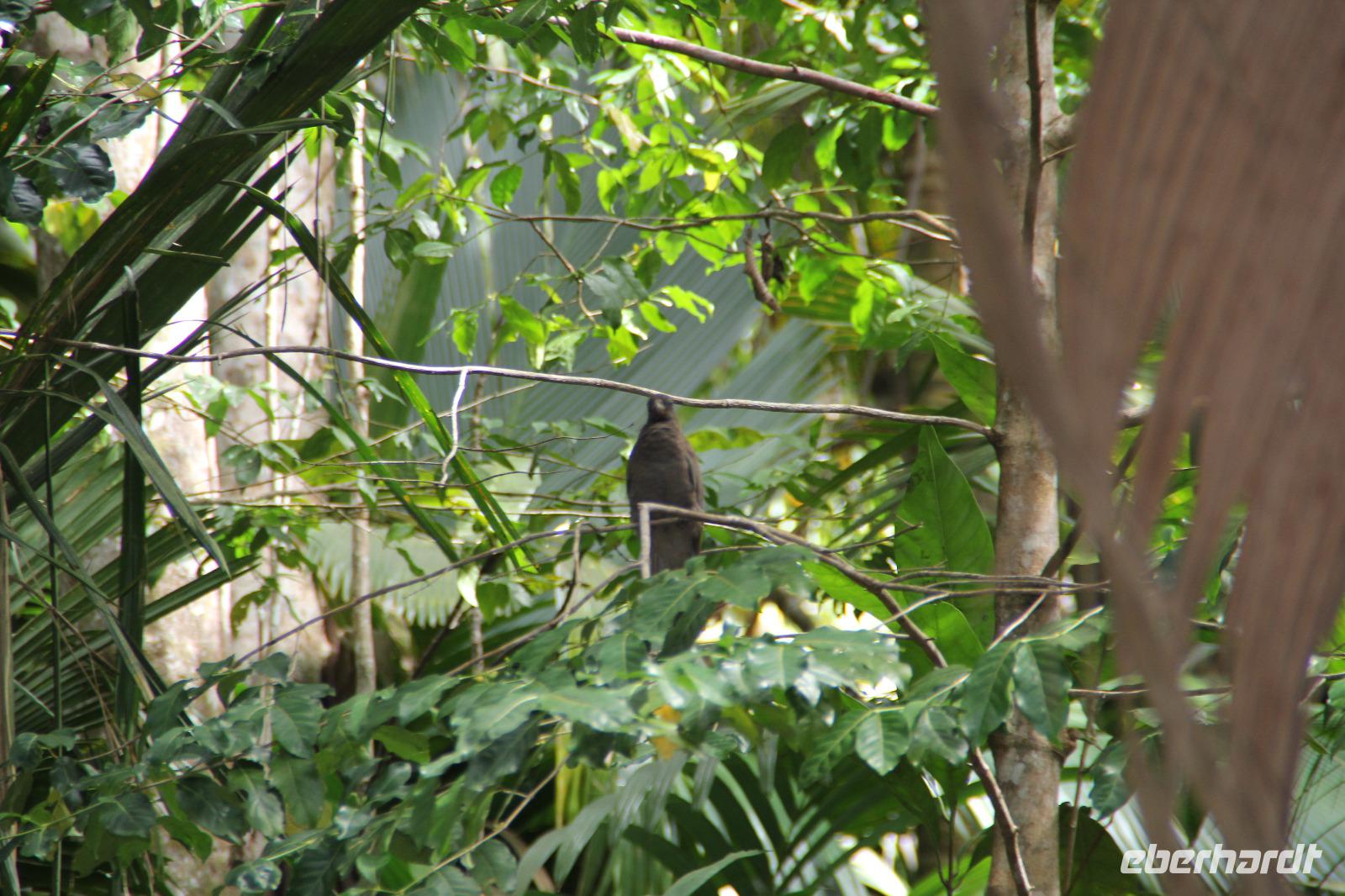 Nun war es Zeit auch die zweitgrößte Seychellen Insel zu entdecken. Somit fuhren wir nach dem Frühstück mit dem Hotelboot hinüber zum Praslin Jetty. Dort trafen wir unseren örtlichen Reiseleiter Cyril wieder. Wir stiegen in einen kleinen Bus und fuhren in Richtung Zentrum der Insel Praslin. Dort erwartete uns eine der größten Attraktionen hier: der Nationalpark „Vallée de Mai". Dabei handelt es sich um einen Urwald im Zentrum der Insel, der im Jahre 1983 auf die Weltkulturerbe-Liste der UNESCO gesetzt wurde. Das Besondere hier sind sechs endemische Palmenarten, die es eben nur hier gibt. Darunter die berühmteste der Seychellen: die Coco de Mer. Die weiblichen Palmen bilden die größte Nuss der Welt, ihr Aussehen gleicht dem wohlgeformten Po einer Frau, auch die Blütenstände der männlichen Coco de Mer erinnern an durchaus menschliche männliche Körperteile. Cyril führte uns durch den Park, der wie ein Urwald vieles zu entdecken hat. Wir fotografierten Geckos und verschiedene Vögel, er erklärte uns viel Neues über die Palmen und andere hier vorkommenden Pflanzen, wie Farne und Schraubenbäume. Nach einem interessanten Spaziergang durch den Wald stiegen wir wieder in unseren Bus und fuhren in Richtung Nordwesten der Insel. Weil noch Zeit bis zum Mittagessen blieb, hielten wir an einer Perlenfarm, wo wir die Muscheln und schwarzen Perlen begutachten konnten.