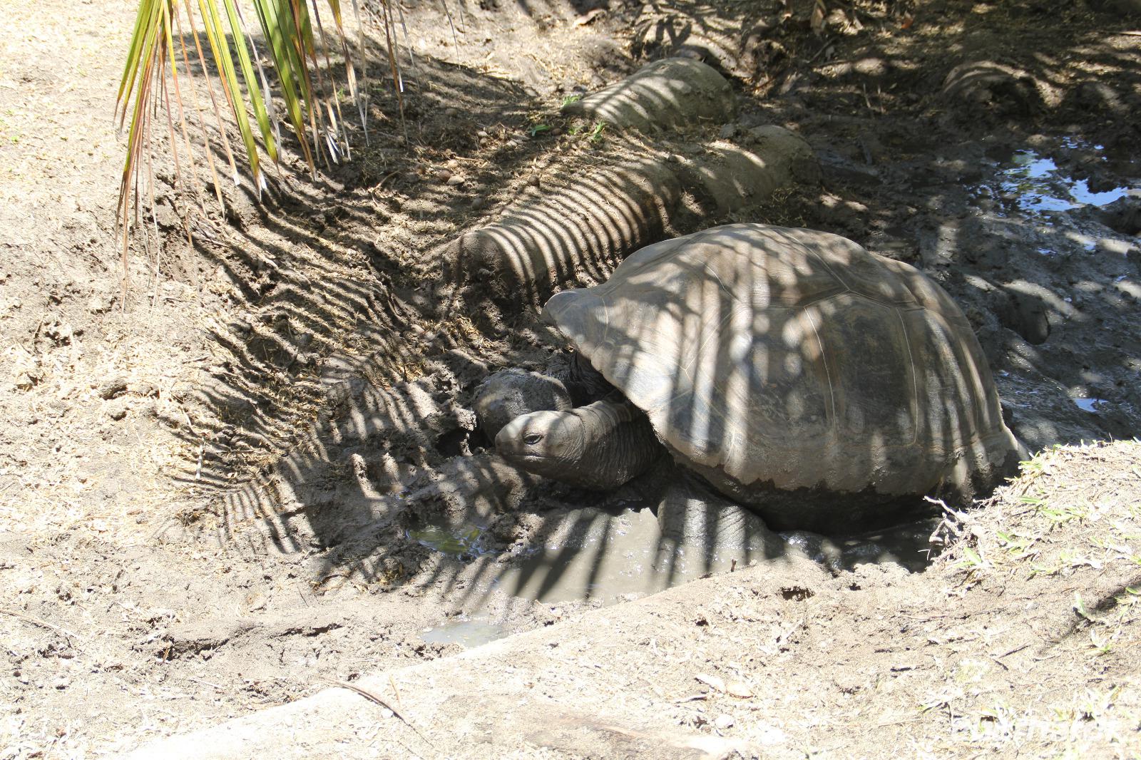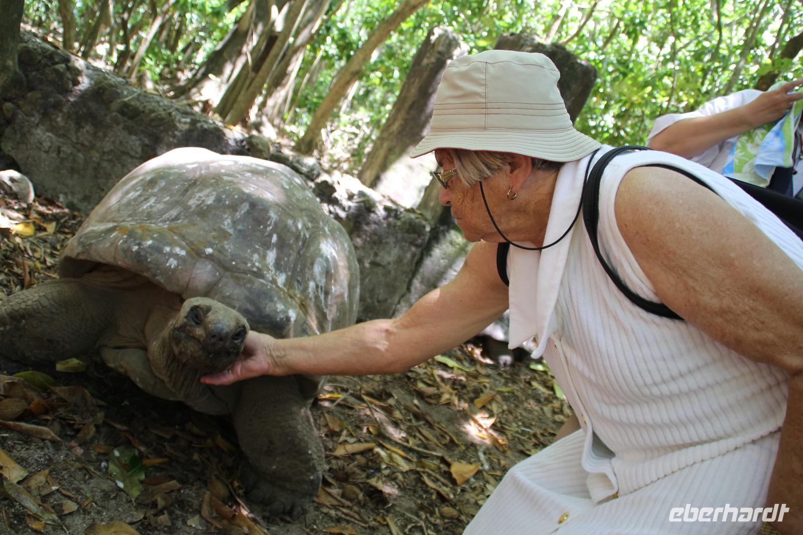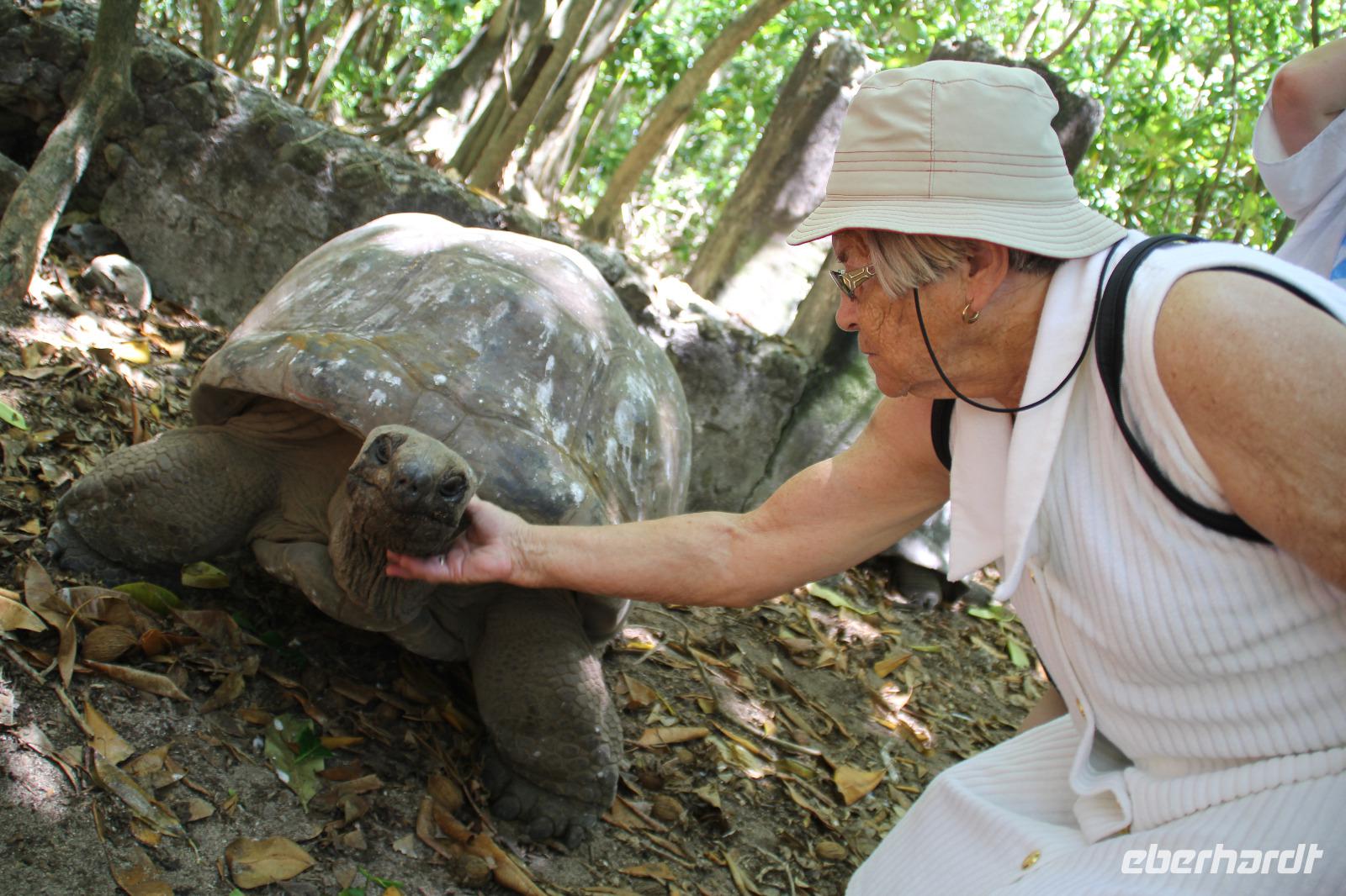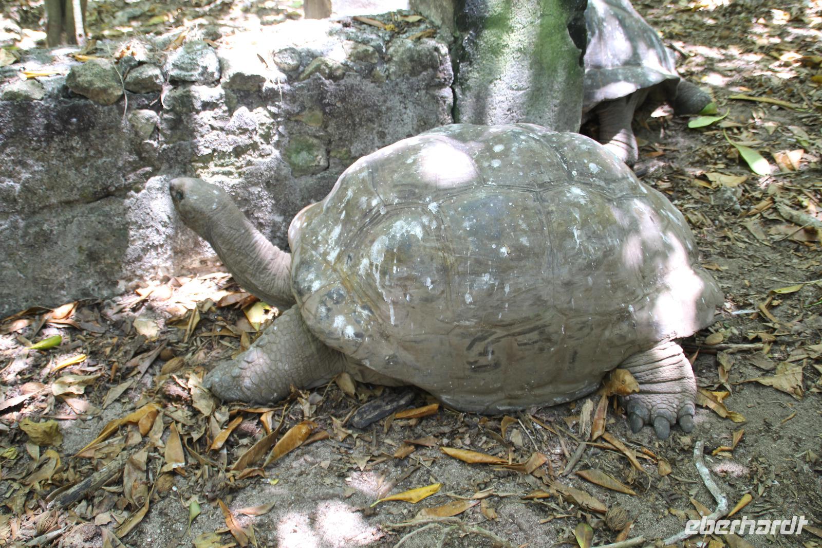 Dorthin hatten sich einst Sklaven geflüchtet und eine kleine Siedlung gegründet, um den menschen-unwürdigen Bedingungen der Sklaverei auf den Plantagen zu entgehen. Die Ruinen der kleinen Hütten, die sie damals bauten, künden heute noch von dieser Zeit. Von einer Anhöhe aus hatten wir einen beeindruckenden Ausblick hinunter auf eine der vielen Buchten von Mahé. Das Mittagessen ließen wir uns im traditionellen kreolischen Restaurant „Marie Antoinette" schmecken. Viele Gäste kommen hier her, nicht nur wegen des leckeren Essens, sondern auch wegen der zahlreichen großen Landschildkröten, die es hinter uns in einem Gehege zu sehen gab. Doch die Tierhaltung war natürlich kein Vergleich zu den Schildkröten in unserer künftigen Hotelanlage. Denn dort hatten die Tiere deutlich mehr Auslauf.