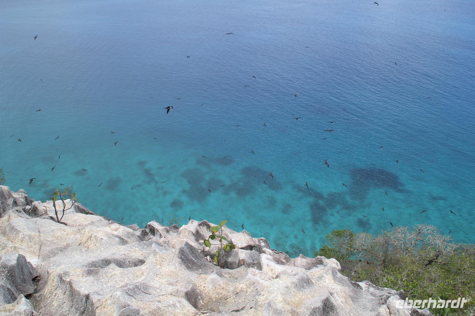 Am Morgen ging es mit dem Hotelboot und unseren beiden Skippern direkt vom Hotelsteg los. Knapp eine Stunde fuhren wir mit dem Boot bis Aride, denn sie ist die Insel, die auf unserer Route die am weitesten entfernte war. Das heißt aber nicht, dass es auf den Seychellen nicht noch weiter geht. Die äußeren Seychellen-Inseln sind teilweise Hunderte von Kilometern voneinander entfernt. Wir erreichten unser Tagesziel und warteten wieder, bis wir, wie andere Bootpassagiere auch, vom Team der Insel mit einem motorisierten Schlauchboot an Land gebracht wurden. Dort angekommen, wurden die Besucher aufgeteilt in englisch- und französisch-sprachige Gruppen. Wir hatten eine eigene Führerin nur für unsere Gruppe allein. Sie selbst lebt auf der Insel als Wissenschaftlerin für 2-3 Monate. Zu ihren Aufgaben gehört neben der wissenschaftlichen und erhaltenden Arbeit auch das Führen von Touristen über die Insel. Wir sahen wieder verschiedene Vögel brüten, Einsiedlerkrabben, Geckos und Tausendfüßler auf den Wegen. Ein mühsamer Aufstieg zum Aussichtspunkt der Insel ließ den Schweiß in Strömen fließen, aber der Ausblick aufs Meer über einem Felsplateau, über dem Fregattvögel kreisten, belohnte uns für die Mühe.