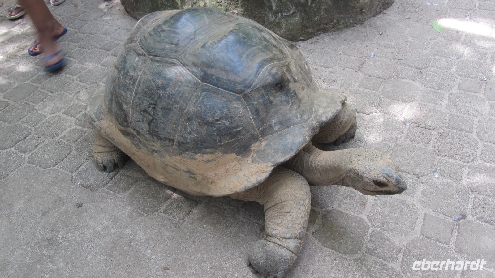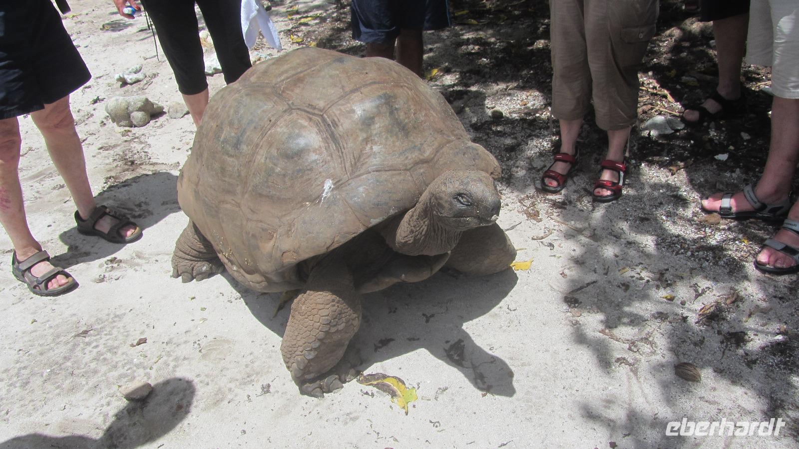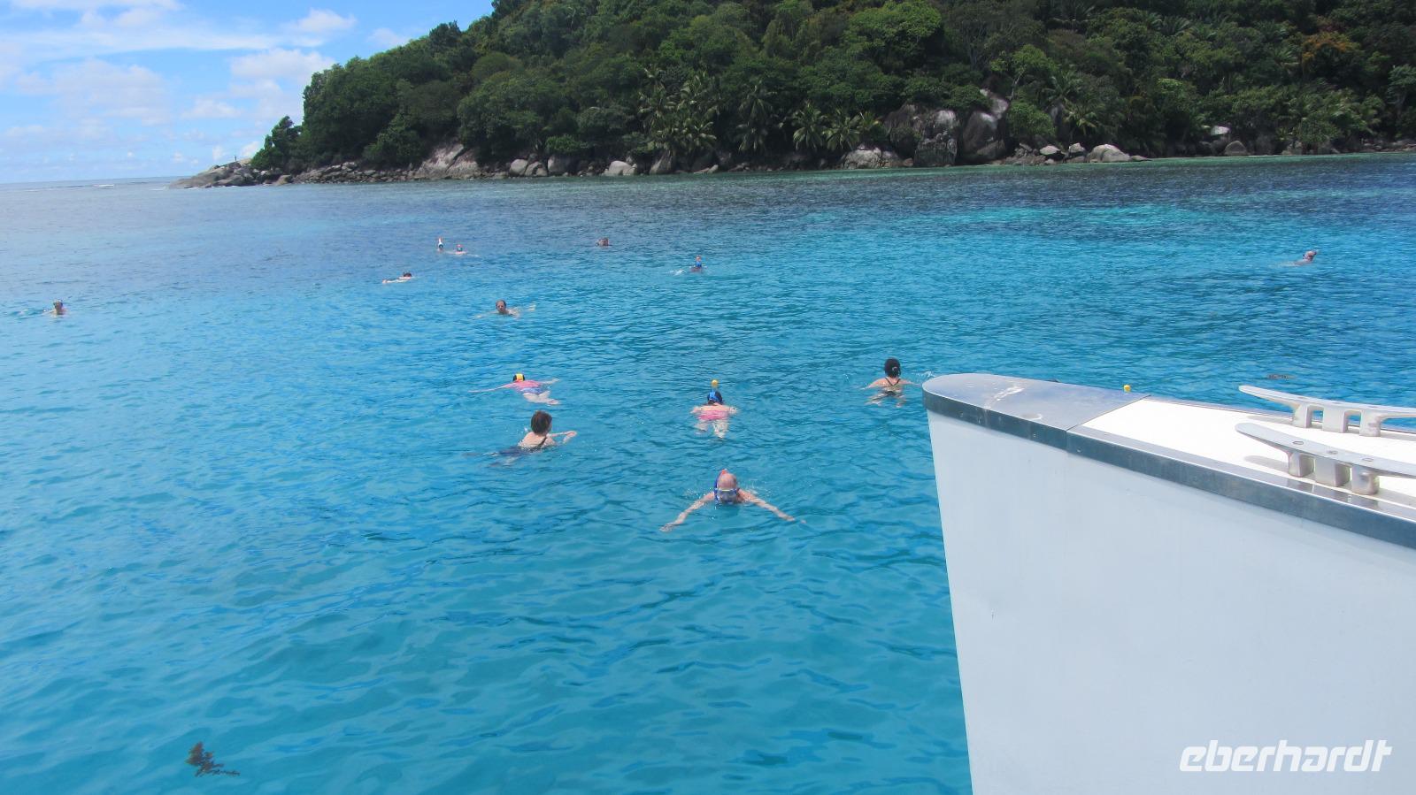 Nach dem Frühstück treffen wir uns zu einem Ausflug per Boot in den St. Anne Marine-Nationalpark und auf die Insel Moyenne. Per Bus geht es zu unserem Katamaran. Wir fahren hinaus in Richtung des Naturschutzparkes. Wir steigen um in ein Glasboden-Boot, um die Unterwasserwelt zu beobachten. Leider sind aufgrund des Tsunami und auch den Sturm Kyrill viele Korallen zerstört und abgestorben. Die Pracht der Farben ist leider nicht so ganz wie wir es uns vorgestellt haben. Trotzdem bewundern wir einige bunte Fische und bestaunen die Unterwasserwelt. Anschließend füttern wir die Fische im Meer, um sie anzulocken. Viele sieht man auch direkt vom Boot aus.Anschließend können wir unsere extra mitgebrachte Schnorchel Ausrüstung ausprobieren und die bunte Unterwasserwelt auskundschaften. Hier können wir das erst Mal schnorcheln und viele bunte Fische am Riff beobachten. Für viele war das Schnorcheln eine neue Erfahrung, aber es hat doch schon sehr gut geklappt. Einige haben sogar einen Oktopus gesehen, andere eine Moräne oder den Papageifisch.Anschließend genießen wir ein schmackhaftes Mittagessen vom Grill zusammen mit verschiedenen Salaten. Gestärt setzen wir mit einem kleinen Boot auf die Pirateninsel Moyenne über. Bei einer kleinen Wanderung erfahren wir mehr über die Geschichte der Insel, die angeblichen Geister, die hier leben und den Piratenschatz bewachen. Wir treffen einige Riesen-Schildkröten, die uns freundlich begrüßen und hier wohl sogar auf ihren Namen hören. Auf der Wanderung eröffnen uns schöne Ausblicke auf das Meer und immer wieder begegnen wir unseren neuen Freunden, den Riesen-Schildkröten Anschließend erfrischen wir uns im sehr flachen Meer, dessen türkise Farbe uns immer wieder aufs Neue begeistert. Zurück geht es per Boot zum Hafen und anschließend mit dem Bus zum Hotel. Ein schöner Tag geht bei einem tollen Sonnenuntergang und einem schmackhaften Abendessen zu Ende.