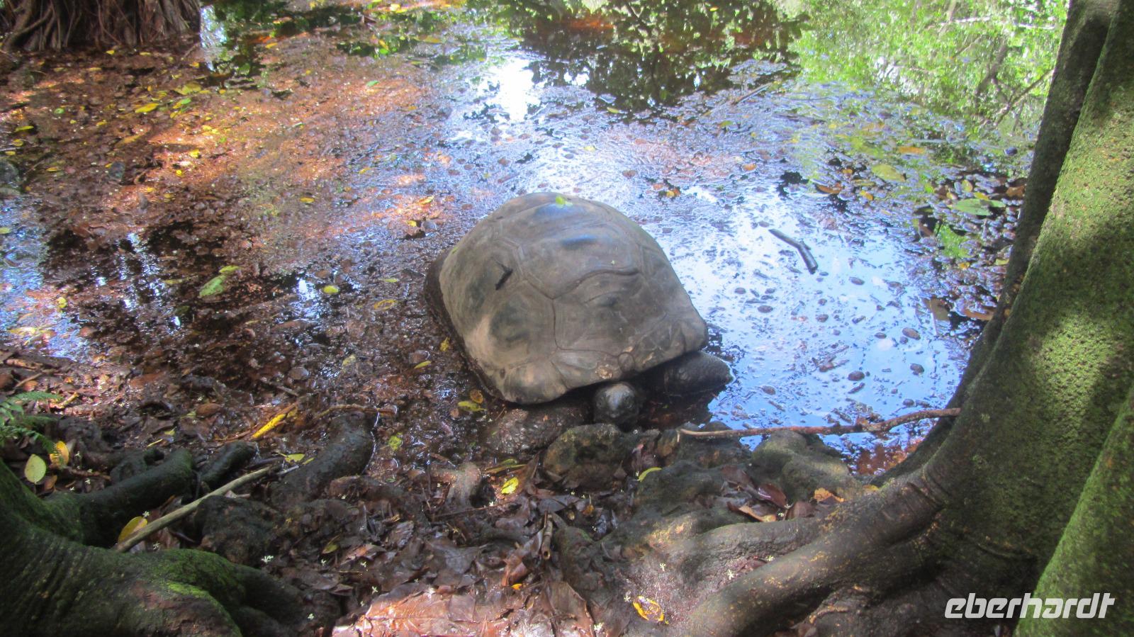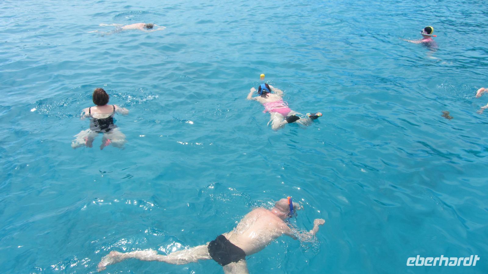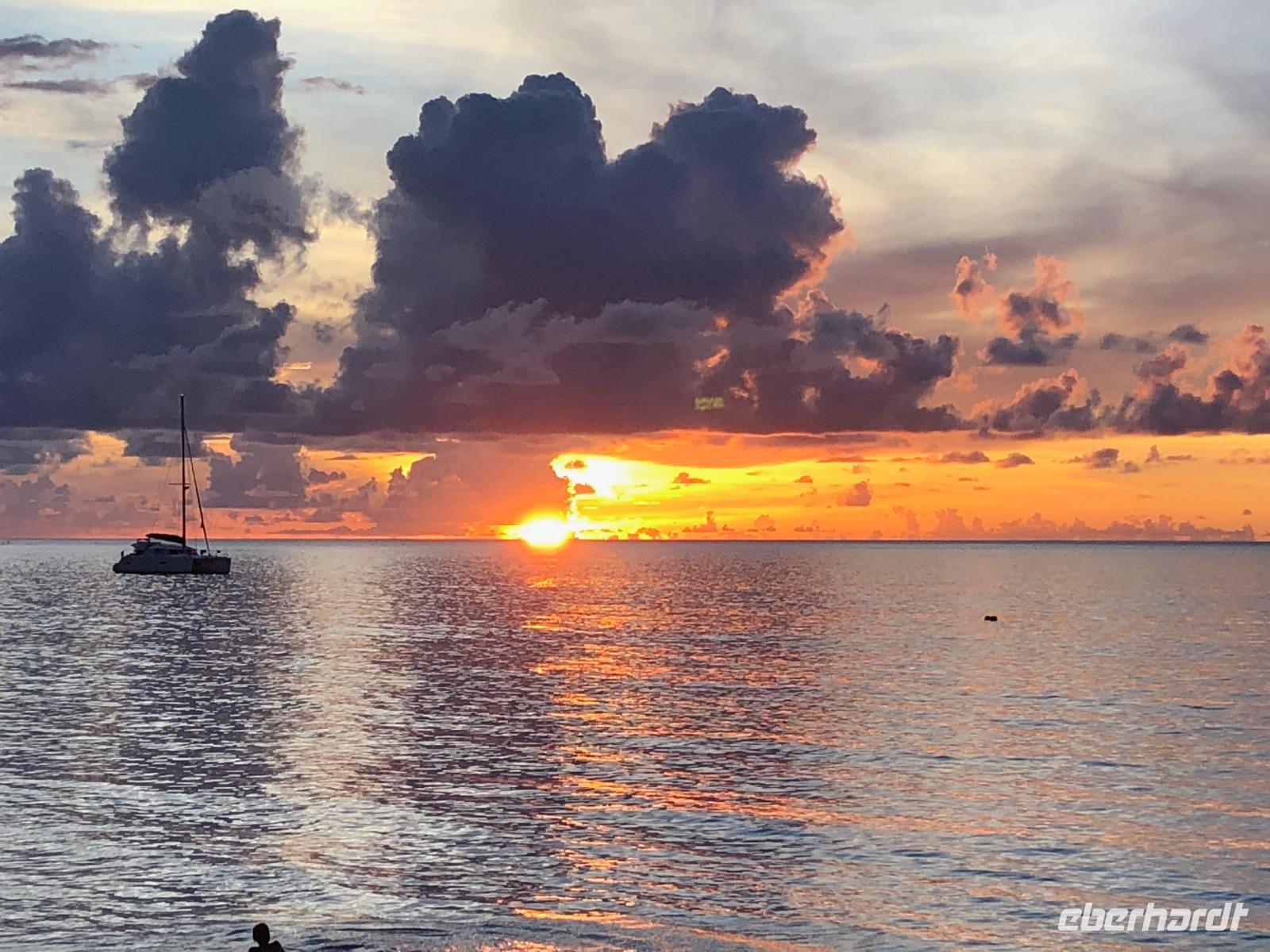 Nach dem Frühstück treffen wir uns zu einem Ausflug per Boot in den St. Anne Marine-Nationalpark und auf die Insel Moyenne. Per Bus geht es zu unserem Katamaran. Wir fahren hinaus in Richtung des Naturschutzparkes. Wir steigen um in ein Glasboden-Boot, um die Unterwasserwelt zu beobachten. Leider sind aufgrund des Tsunami und auch den Sturm Kyrill viele Korallen zerstört und abgestorben. Die Pracht der Farben ist leider nicht so ganz wie wir es uns vorgestellt haben. Trotzdem bewundern wir einige bunte Fische und bestaunen die Unterwasserwelt. Anschließend füttern wir die Fische im Meer, um sie anzulocken. Viele sieht man auch direkt vom Boot aus.Anschließend können wir unsere extra mitgebrachte Schnorchel Ausrüstung ausprobieren und die bunte Unterwasserwelt auskundschaften. Hier können wir das erst Mal schnorcheln und viele bunte Fische am Riff beobachten. Für viele war das Schnorcheln eine neue Erfahrung, aber es hat doch schon sehr gut geklappt. Einige haben sogar einen Oktopus gesehen, andere eine Moräne oder den Papageifisch.Anschließend genießen wir ein schmackhaftes Mittagessen vom Grill zusammen mit verschiedenen Salaten. Gestärt setzen wir mit einem kleinen Boot auf die Pirateninsel Moyenne über. Bei einer kleinen Wanderung erfahren wir mehr über die Geschichte der Insel, die angeblichen Geister, die hier leben und den Piratenschatz bewachen. Wir treffen einige Riesen-Schildkröten, die uns freundlich begrüßen und hier wohl sogar auf ihren Namen hören. Auf der Wanderung eröffnen uns schöne Ausblicke auf das Meer und immer wieder begegnen wir unseren neuen Freunden, den Riesen-Schildkröten Anschließend erfrischen wir uns im sehr flachen Meer, dessen türkise Farbe uns immer wieder aufs Neue begeistert. Zurück geht es per Boot zum Hafen und anschließend mit dem Bus zum Hotel. Ein schöner Tag geht bei einem tollen Sonnenuntergang und einem schmackhaften Abendessen zu Ende.