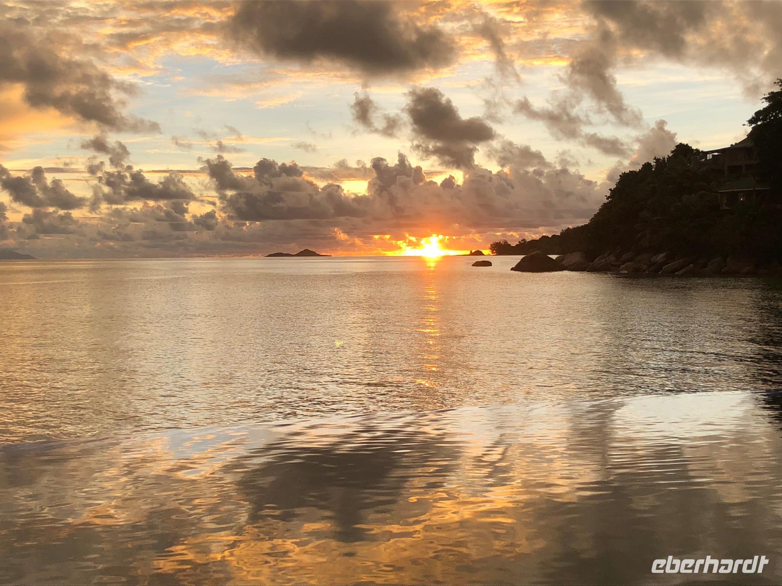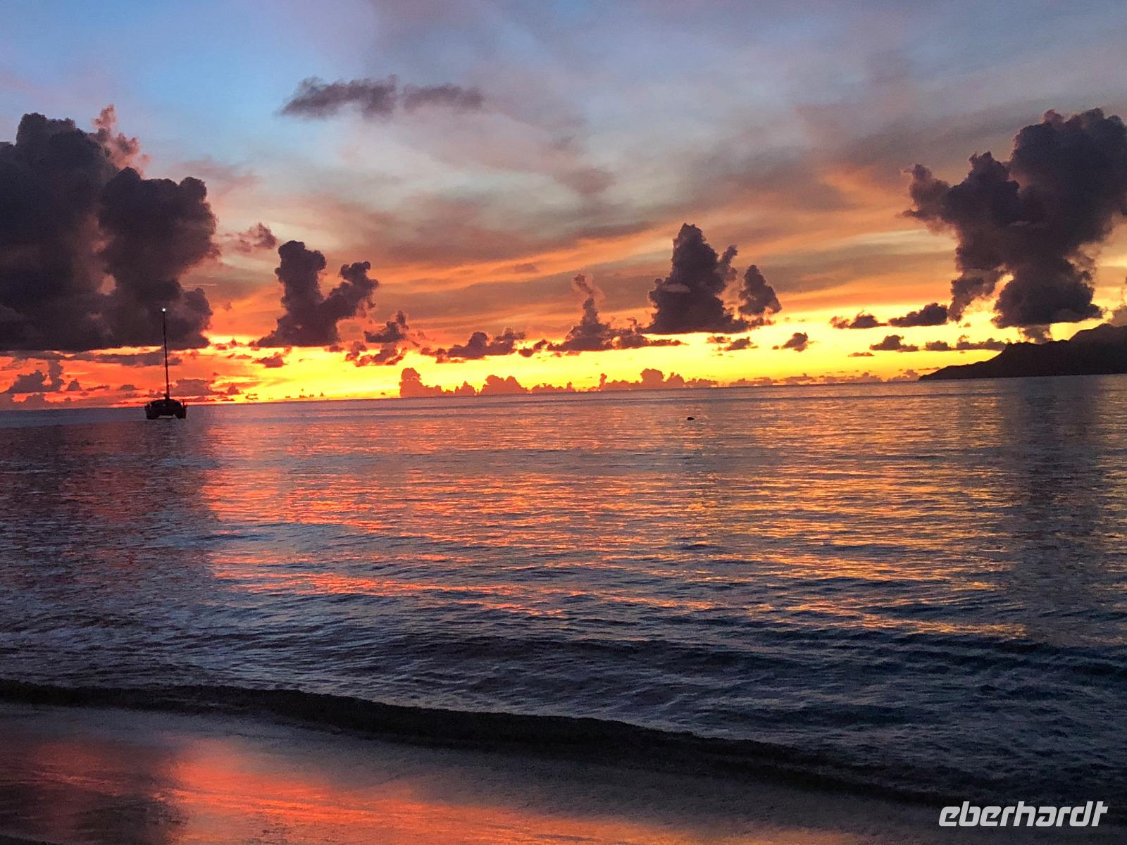 Endlich startet unsere gemeinsame Reise zu den Traum-Inseln der Seychellen. Wir treffen und in Dresden und fliegen nach Frankfurt, wo wir weitere Gäste treffen. Gemeinsam geht es per Direktflug nach Mahé, die größte der 115 Seychellen-Inseln.Wir kommen am frühen Morgen an, unser Reiseleiter Cyryll erwartet uns. Nachdem wir unser Gepäck entgegen genommen haben, die ersten Seychellen Rupie getauscht haben und die Koffer auf das Dach des Busses geschnallt haben geht es in Richtung Victoria zur kleinsten Hauptstadt der Welt. Es ist noch früh am Morgen und die Straßen sind noch leer. Wir spazieren zum bekannten Uhrenturm, dem Wahrzeichen der Stadt. Er wurde dem britischen Big Ben nachempfunden, ist aber doch erheblich kleiner. Weiter geht es in Richtung Markt. Wir bewundern die zahlreichen kleinen und großen Fische, die zum Verkauf angeboten werden. Das ist schon ein spektakuläres Treiben. Außerdem finden wir auf dem Markt zahlreiches frisches Obst und Gemüse, einige Souvenirs und Postkarten und viele Gewürze. Die ersten Andenken werden gekauft. Nach einer Kaffee-Pause geht es weiter durch die Stadt. Nicht weit entfernt befindet sich der bunte Hindu-Tempel und die anglo-amerikanische Kirche, die wir uns näher anschauen. Anschließend geht es wieder zum Bus, die Müdigkeit überkommt uns, denn die Nacht war doch sehr kurz.Cyrill erklärt sehr viel, berichtet über das Leben auf den Seychellen und das, was wir am Straßenrand sehen. Wir fahren entlang der Nord-Küste und stoppen auch an den ersten spektakulären Foto-Motiven. Gegen Mittag erreichen wir unser Hotel direkt am Strand. Nach einer kurzen Pause mit einigen Erläuterungen zum Hotel erhalten wir unsere Schlüssel und beziehen unsere Zimmer. Die ersten springen auch gleich nach der Ankunft ins warme Meer, andere ruhen sich erst einmal von den Strapazen der Anreise aus. Auf jeden Fall empfiehlt sich ein schöner Strandspaziergang.Am Abend treffen wir uns ausgeruht und mit ersten Eindrücken zum Abendessen. Der Sonnenuntergang an diesem Abend ist besonders sehenswert und das Essen vom Buffet sehr schmackhaft und so geht unser erster Tag auf den Seychellen zu Ende.
