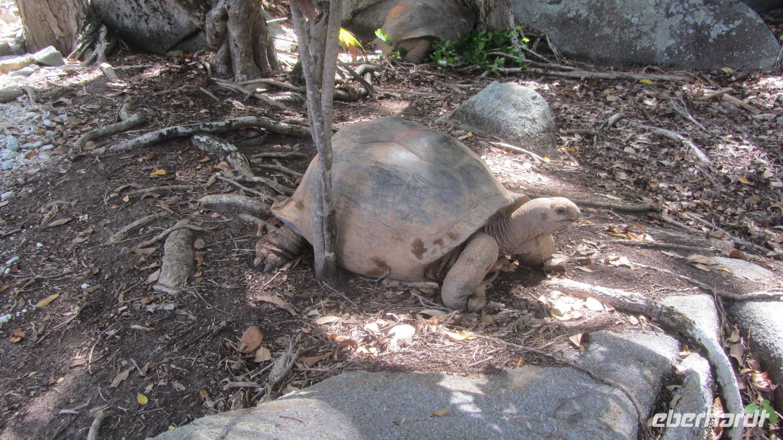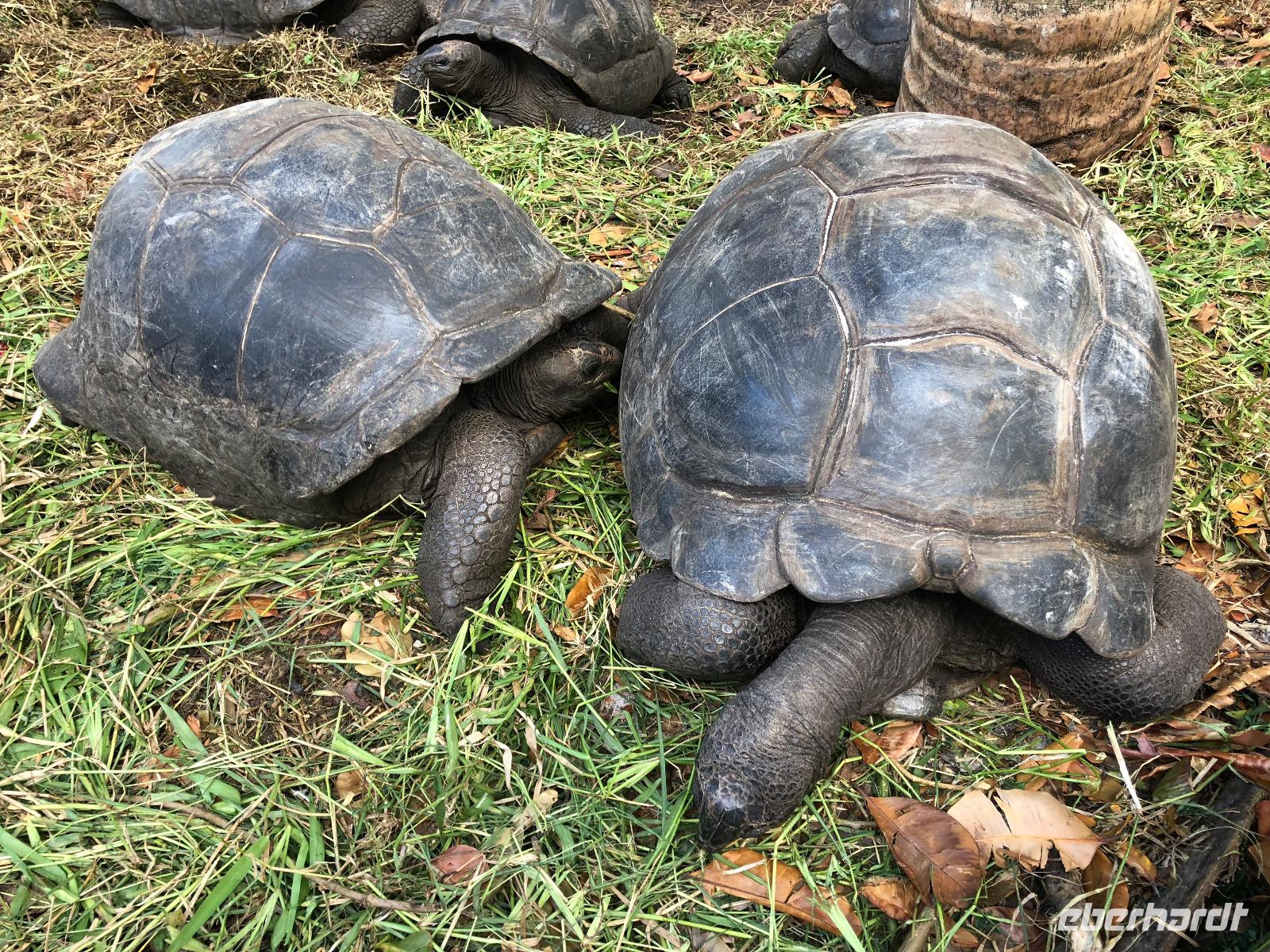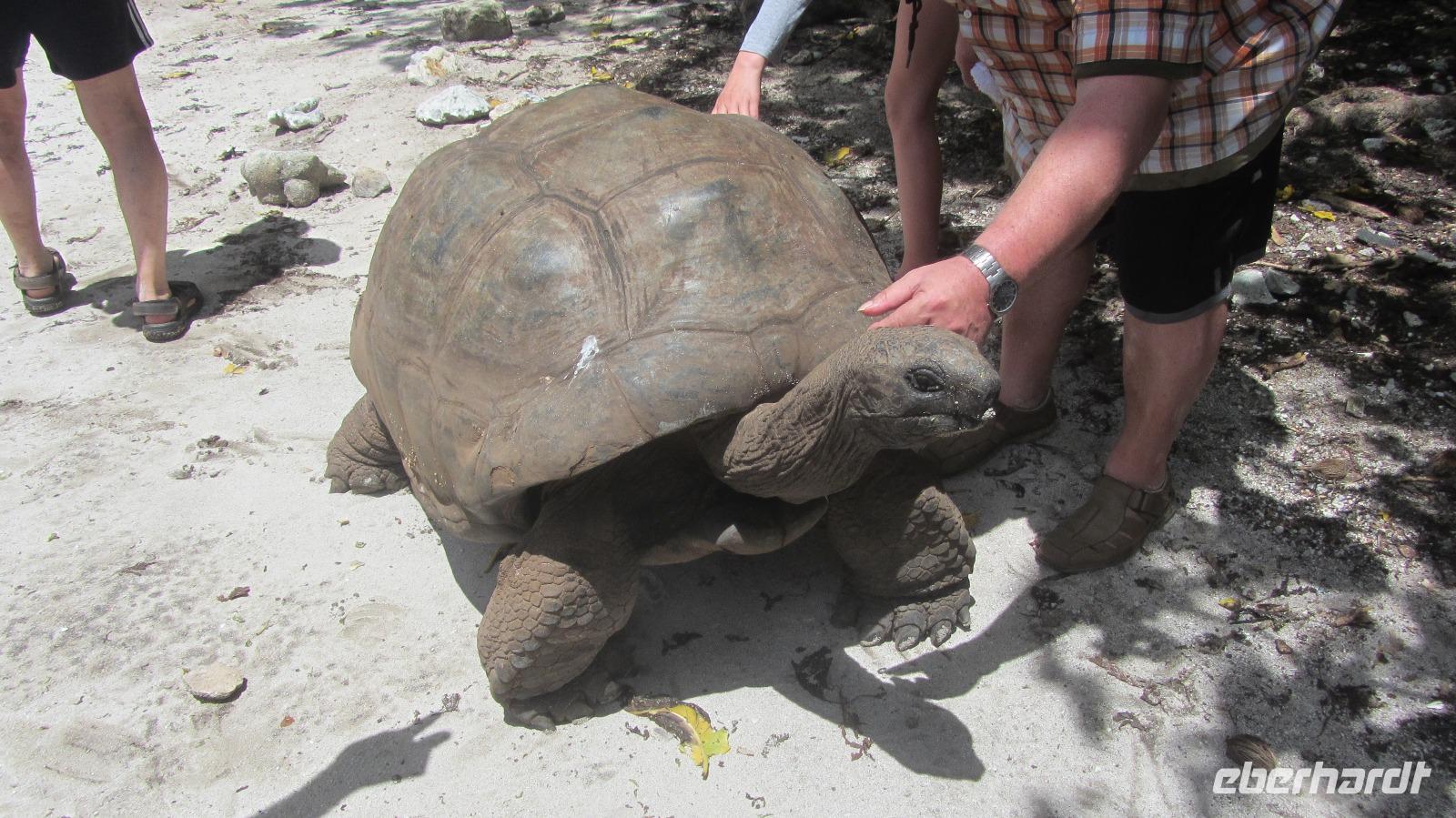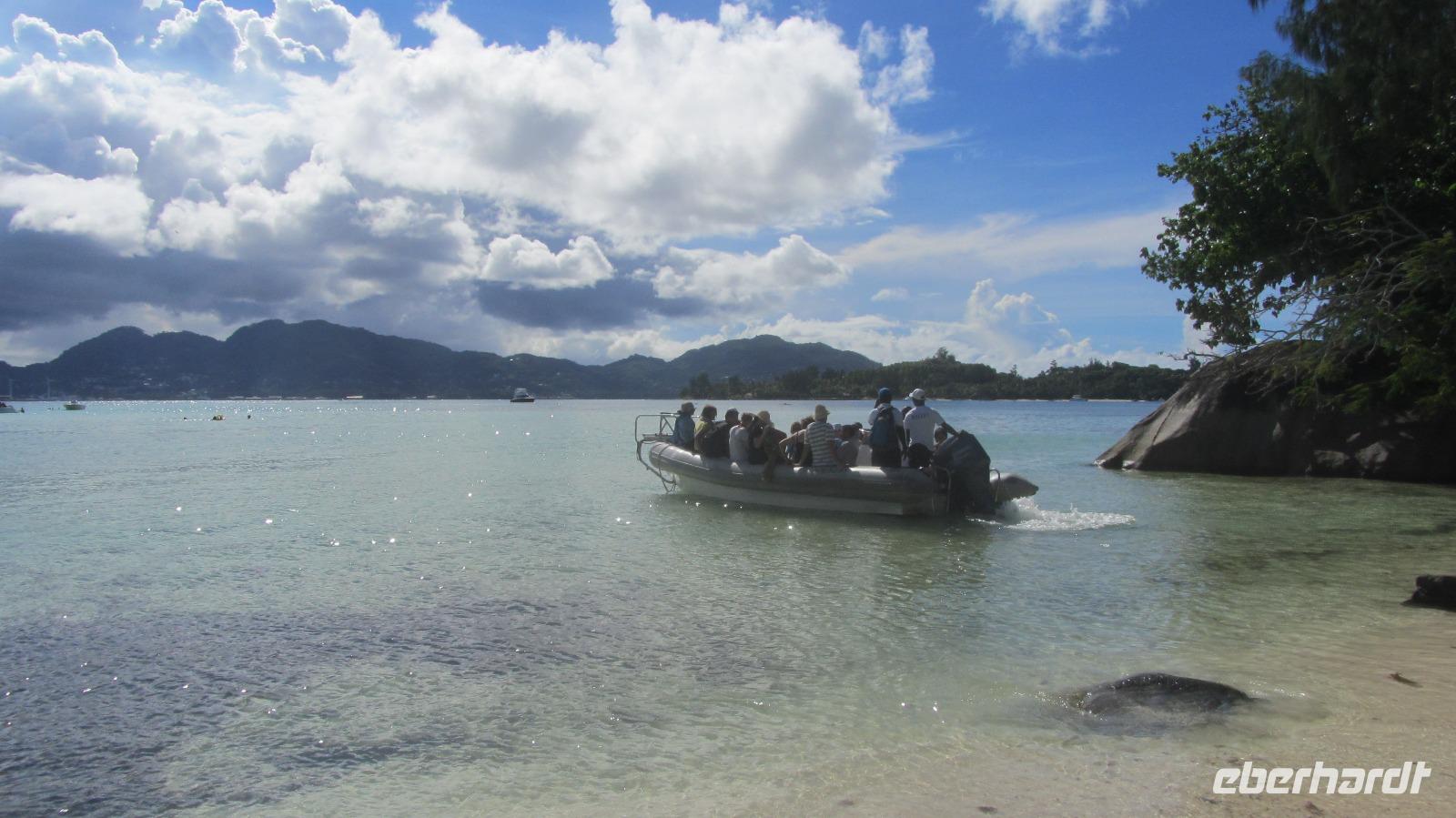Wir treffen wir uns am Morgen, um weitere Inseln der Seychellen zu erkunden. Per Van und Pick-up geht es heute auf die andere Seite der Insel zum Strand. Dort wartet unser zugegebenermaßen doch recht kleines Boot auf uns. Wir müssen ein Stück durchs Wasser laufen, um zum Boot zu gelangen - das ist schon abenteuerlich. Alle an Bord geht es nun zur berühmten Vogel-Insel Cousin. Wir müssen warten bis ein Boot uns abholt. Fremde Boote dürfen nicht an der Insel anlanden, um kein Ungeziefer oder anderes mit auf die Insel zu schleppen. Es dauert etwas, aber dann sind wir dran und kommen auf die Insel. Dort haben wir einen Reiseleiter, der uns die zutraulichen Vögel, die überall sitzen, zeigt und uns viel zur Insel erklärt. Da die Vögel hier keine natürlichen Feinde haben, brüten Sie überall auch auf dem Boden und so können wir einige beobachten. Auf der anderen Seite der Insel begegnen uns auch wieder unsere Freude, die Riesen-Schildkröten.Nach der Besichtigung geht es wieder zurück auf unser Boot und wir fahren zur Insel Curieuse. Dort wartet ein schmackhaftes Barbecue-Mittagessen auf uns. Danach erkunden wir bei einer kleinen Wanderung die Insel und sehen drei verschiedene Mangroven-Arten. Bevor wir wieder auf unser Boot gehen, bewundern wir mal wieder unsere Riese-Schildkörte und auch eine Aufzuchts-Station. Die kleinen süßen Schildkröten müssen nämlich vor den Besuchern geschützt werden, die diese manchmal in ihrem Gepäck verschwinden lassen.Weiter geht es nun per Boot zu einem herrlich unberührten Strand. Hier steht auch Doctor´s House, was ehemals als Krankenhaus für Lebra-Kranke genutzt wurde. Nach der wohltuenden Erfrischung fahren wir mit dem Boot noch zur kleinen Insel St.Pierre und erkunden die Unterwasserwelt rund um die Insel. Wieder bewundern wir viele bunte Fische und sogar ein Oktopus wird gesichtet. Nach einer Rundfahrt um die Mini-Insel geht der schöne Tag zu Ende. Im Hotel wartet unser Abendessen auf uns...