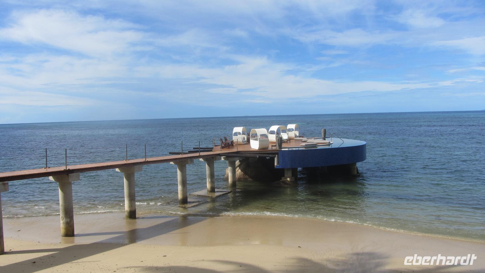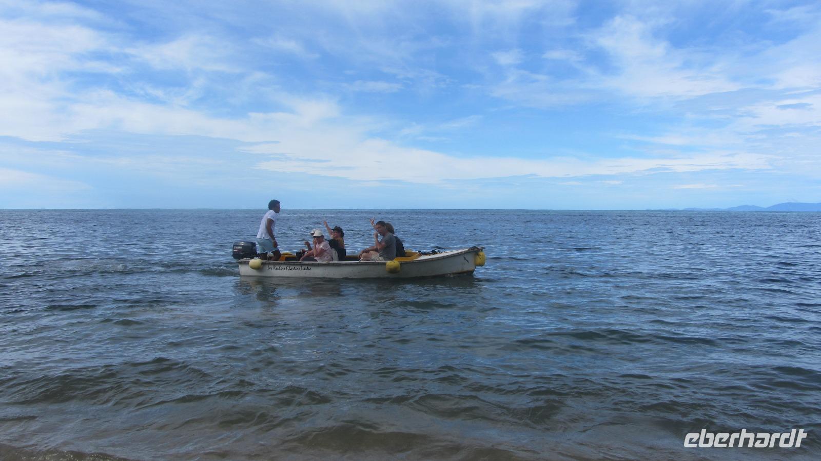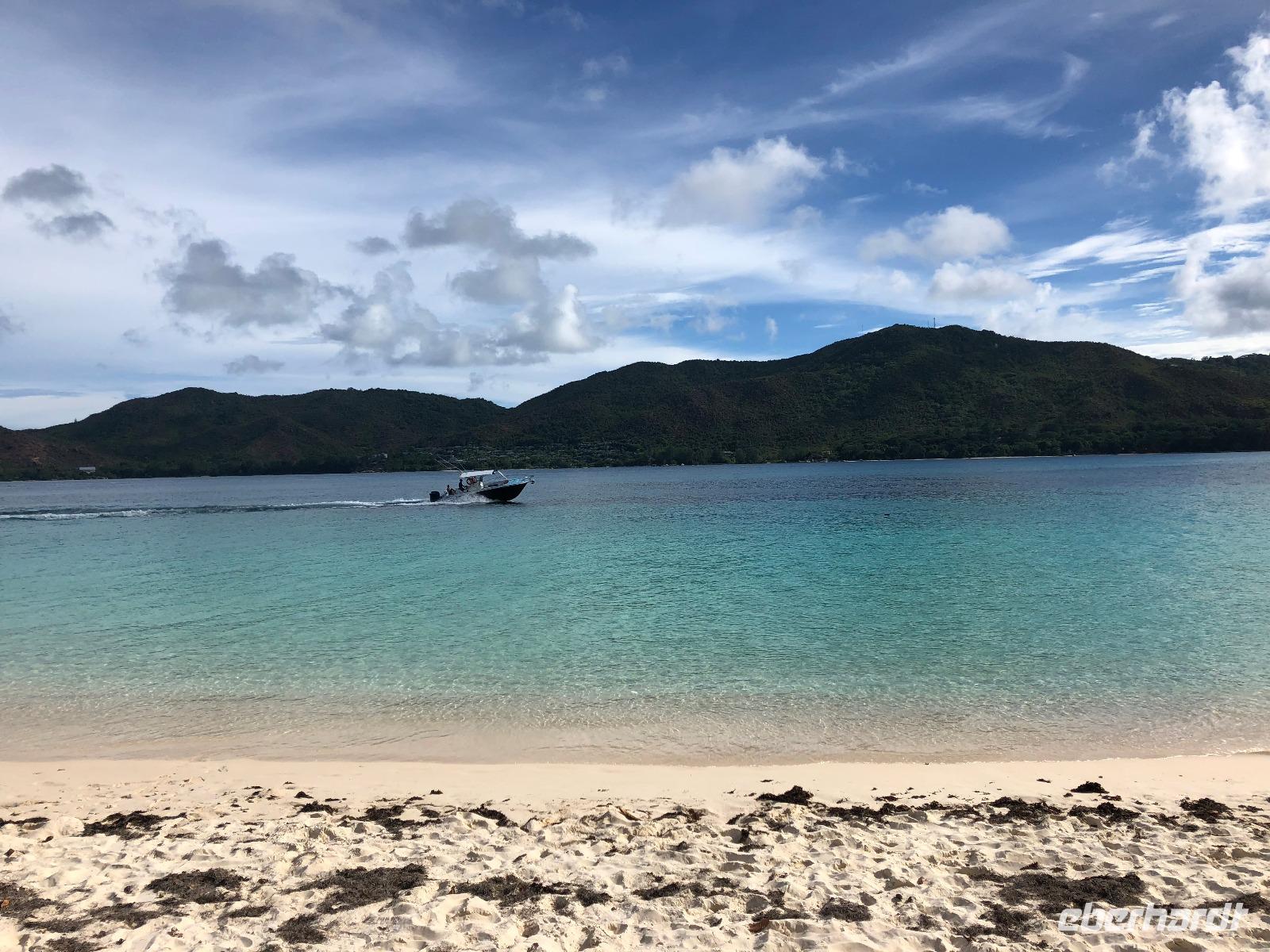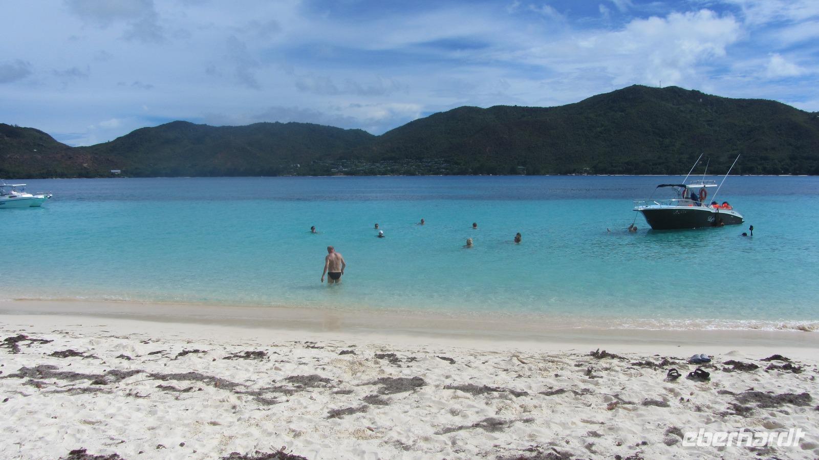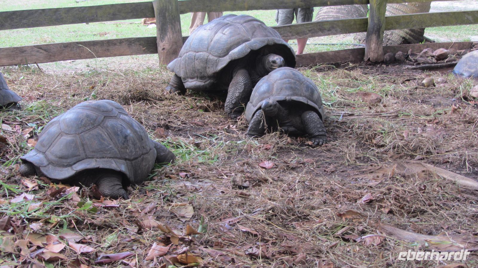 Wir treffen wir uns am Morgen, um weitere Inseln der Seychellen zu erkunden. Per Van und Pick-up geht es heute auf die andere Seite der Insel zum Strand. Dort wartet unser zugegebenermaßen doch recht kleines Boot auf uns. Wir müssen ein Stück durchs Wasser laufen, um zum Boot zu gelangen - das ist schon abenteuerlich. Alle an Bord geht es nun zur berühmten Vogel-Insel Cousin. Wir müssen warten bis ein Boot uns abholt. Fremde Boote dürfen nicht an der Insel anlanden, um kein Ungeziefer oder anderes mit auf die Insel zu schleppen. Es dauert etwas, aber dann sind wir dran und kommen auf die Insel. Dort haben wir einen Reiseleiter, der uns die zutraulichen Vögel, die überall sitzen, zeigt und uns viel zur Insel erklärt. Da die Vögel hier keine natürlichen Feinde haben, brüten Sie überall auch auf dem Boden und so können wir einige beobachten. Auf der anderen Seite der Insel begegnen uns auch wieder unsere Freude, die Riesen-Schildkröten.Nach der Besichtigung geht es wieder zurück auf unser Boot und wir fahren zur Insel Curieuse. Dort wartet ein schmackhaftes Barbecue-Mittagessen auf uns. Danach erkunden wir bei einer kleinen Wanderung die Insel und sehen drei verschiedene Mangroven-Arten. Bevor wir wieder auf unser Boot gehen, bewundern wir mal wieder unsere Riese-Schildkörte und auch eine Aufzuchts-Station. Die kleinen süßen Schildkröten müssen nämlich vor den Besuchern geschützt werden, die diese manchmal in ihrem Gepäck verschwinden lassen.Weiter geht es nun per Boot zu einem herrlich unberührten Strand. Hier steht auch Doctor´s House, was ehemals als Krankenhaus für Lebra-Kranke genutzt wurde. Nach der wohltuenden Erfrischung fahren wir mit dem Boot noch zur kleinen Insel St.Pierre und erkunden die Unterwasserwelt rund um die Insel. Wieder bewundern wir viele bunte Fische und sogar ein Oktopus wird gesichtet. Nach einer Rundfahrt um die Mini-Insel geht der schöne Tag zu Ende. Im Hotel wartet unser Abendessen auf uns...