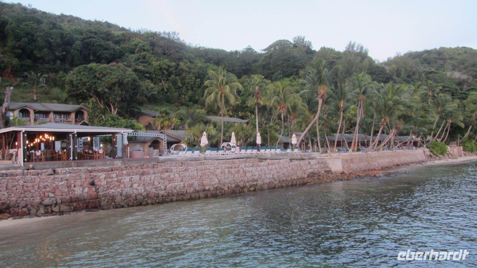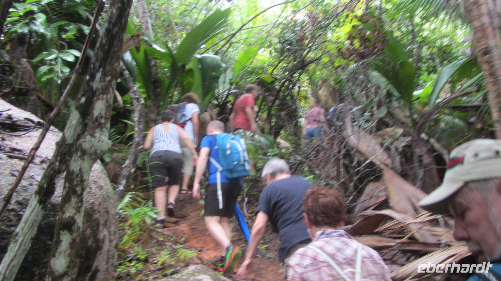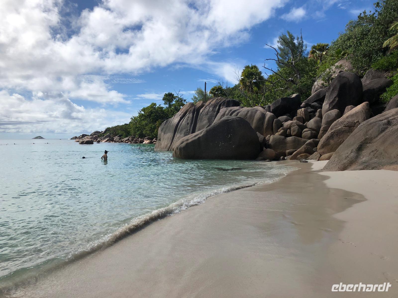 Heute wollen wir die Insel Praslin erkunden. Wir fahren gemeinsam mit unserem örtlichen Reiseleiter Cyrill zuerst in den bekannten Park Vallé de Mai. Wir unternehmen einen Rundgang und sind beeindruckt von der üppigen Vegetation. Cyrill erklärt uns alles über die berühmte Coco de Mer, die größte Kokosnuss der Welt, die wir hier mehrfach sehen. Aber auch einige Geckos und Vögel bewundern wir und genießen den Rundgang in dem satten Grün. Alles wird hier so belassen, wie es die Natur zurück lässt und so entsteht hier eine herrliche Vegetation. Nach einem ausführlichen Rundgang, der uns aufgrund der hohen Luftfeuchtigkeit mal wieder zum Schwitzen gebracht hat, aber vielen Eindrücken verlassen wir das Gelände. Anschließend fahren wir zur Fabrik der schwarzen Seychellen-Perle, wo wir erfahren, wie diese entsteht und danach auch Schmückstücke einkaufen können. Nach diesen Erkundungen haben wir uns ein reichhaltiges und schmackhaftes Mittagessen verdient. Im Hotel Britannia erwartet man uns mit einem schmackhaften Buffet mit creolischen Spezialitäten - extra nur für uns. Nun haben wir schon viel von der Insel gesehen und wollen endlich den berühmten und einen der schönsten Strände bewundern. Wir fahren ganz in den Norden der Insel zum Anse Lazio. Der Strand ist breit und von Felsen umrahmt. Wir stürzen uns in die Fluten - eine richtige Erfrischung ist das nicht, da das Wasser sehr warm ist, aber es ist faszinierend. Wir verweilen sehr lange hier im glasklaren Meer. Es ist wirklich ein schöner Strand und wir genießen den schönen Nachmittag. Danach halten wir noch im Supermarkt, um uns für die nächsten Tage mit Wasser und natürlich auch etwas einheimischen Rum namens Takamaka zu versorgen. Cyrill verabschieden wir an der Fähre, da er zurück nach Mahé fährt und wir entspannen im Hotel und genießen das schmackhafte Buffet.