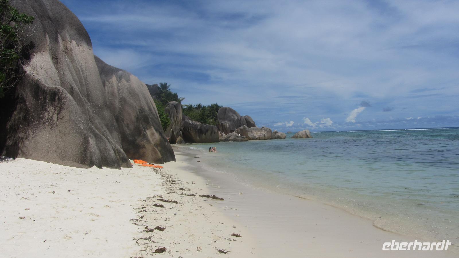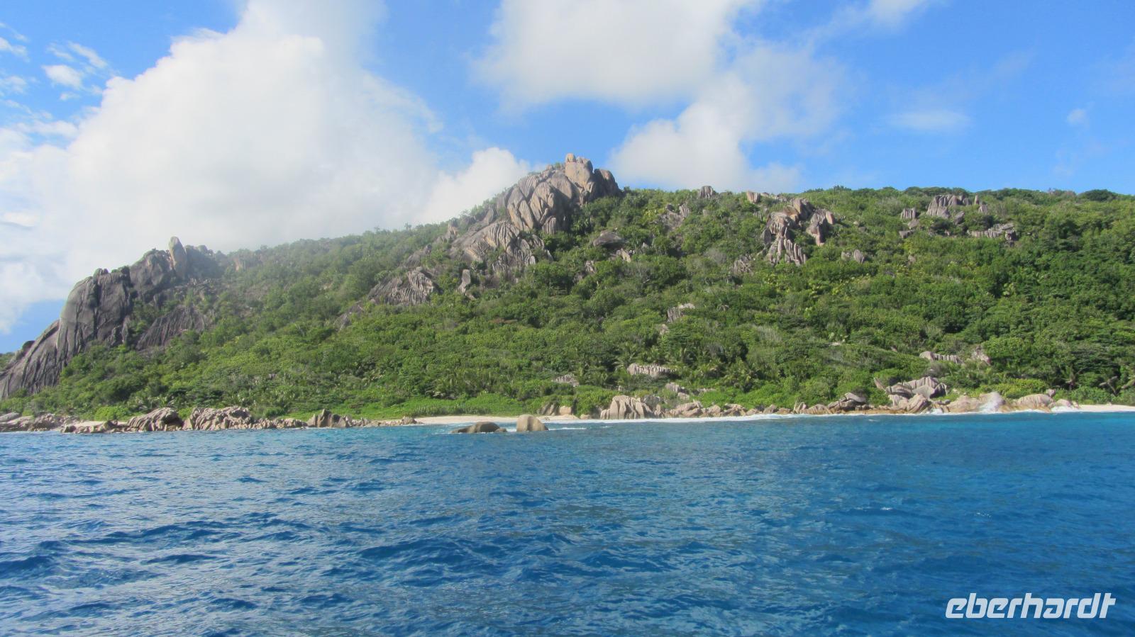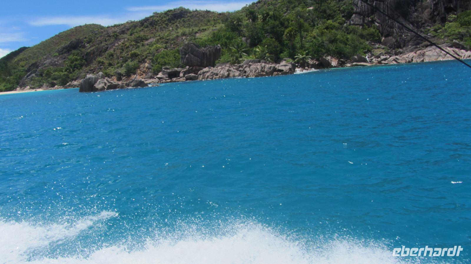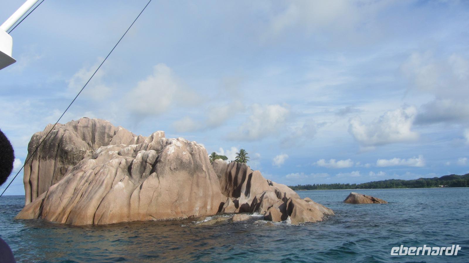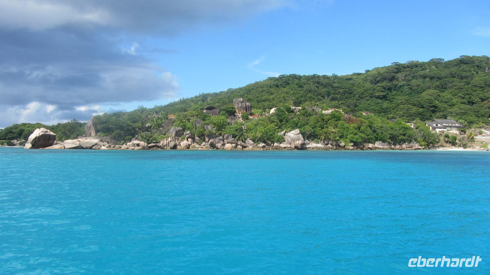 Heute wollen wir die viertgrößte Insel der Seychellen erkunden. Es soll die schönste Insel sein und wir haben schon viel über sie gehört und sind gespannt. Zu unserer Überraschung werden wir heute mit einem kleinen Boot direkt vom Hotel abgeholt. Mit nassen Füßen steigen wir ein und das kleine Boot bringt uns zu einem Katamaran, der nur uns heute zur Verfügung steht. Das Meer ist ruhig und die Fahrt mit dem Katamaran ist sehr angenehm. Nun geht es entspannt circa eine Stunde bis zum kleinen Hafen von La Digue. Wir erreichen La Passe, die einzige Ortschaft auf La Digue. Unser umgebauter Ochsenkarren, der nun per Motor angetrieben wird, wartet schon auf uns und so beginnen wir unsere Rundfahrt. Zuerst fahren wir zum Aussichtspunkt Belle Vue und genießen den Überblick. Die Wettervorhersagen für den heutigen Tag waren alles andere als gut, aber scheinbar reisen hier doch nur Engel und so haben wir auch heute nur traumhaften Sonnenschein. Auf der Insel gibt es einen Kindergarten, eine Schule, die am Wochenende zur Disko umgebaut wird und auch ein Insel-Krankenhaus. Weiter führt uns die Fahrt über die nur circa 10 km2 große Insel auf die ander Seite. Dort liegt der berühmte Strand Grand Anse. Das Meer überzeugt mit seiner herrlich türkisen Farbe und der Sand ist weich und gelb. Die Sonne prallt auf uns herab. Beim schwimmen müssen wir aber sehr aufpassen, da die Strömung und der Wellengang sehr stark sind. Am Ende des Strandes Grand Anse führt auch ein Wanderwege über Stock und Stein zum Strand Petit Anse. Nach der Badepause gönnen wir uns noch eine frisch von der Palme auf geschlagene Kokosnuss. Das anschließende Mittagessen vom Grill ist schmackhaft. Anschließend fahren wir wieder mit unserem umgebauten LKW weiter auf die andere Seite der Insel. Wir fahren zum L''Union Estate Park und stoppen zuerst an der Kopra-Mühle. Hier wird uns gezeigt, wie Kokosnuss-Öl hergestellt wird. Die Nuss wird halbiert, getrocknet, das weiße Fleisch wird zermahlen und kommt dann in die Mühle. Ein Ochse läuft um die Mühle und durch diese Reibung entsteht das Öl, was man sowohl zum Kochen, als auch für Kosmetik einsetzt. Weiter fahren wir zum 400 Meter hohen Giant Rock, den wir bereits vom Meer aus gesehen haben. Desweiteren sehen wir das ehemalige Plantagen-Haus, wo ab 1800 eine Familie aus der La Réunion gelebt hat und mit Hilfe zahlreicher Sklaven die Kokosnuss- und die Vanille-Plantage kultiviert hat. Unsere Freunde die Riesen-Schildkröten sind auch wieder da. Nun geht es aber zum wohl berühmtesten Strand, dem Source d''Argent. Dieser Strand schmückt viele Werbe -Plakate, Fotos und Videos, obwohl er oftmals auch der Karibik zugeschrieben wird. Der schmale Abschnitt ist von Felsen umringt. Wir stürzen uns in die Fluten, die leider keine Erfrischung sind, da das Meer sehr warm ist. Viele Fotos von dem Strand Abschnitt umrahmt von Felden werden fest gehalten. Anschließend fahren wir zurück nach La Passe und besteigen wieder unseren Katamaran. Der Himmel sieht bedrohlich aus, doch wir haben großes Glück, es zieht immer in die andere Richtung. So fahren wir gemächlich um die Insel und bewundern die schroffe Küste und die kleinen Strandabschnitte. Die Insel ist üppig grün und Ausblicke einfach herrlich. Während der Fahrt fängt die Crew auch noch einen recht großen Jack-Fisch und wir können hautnah dabei sein. Wir sehen nun auch vom Boot aus die Strände, die wir am Vormittag besucht haben. Nach der Umrundung lassen wir La Digue hinter uns und es geht die circa acht Kilometer zurück nach Praslin. Wir stoßen gemeinsam mit dem einheimischen Rum Takkamakka auf dieses schönen Tag an. Die kleinen Boote bringen uns wieder zum Hotel. Am Abend versammeln wir uns noch einmal zusammen bei einem leckeren Cocktail und nehmen Abschied.