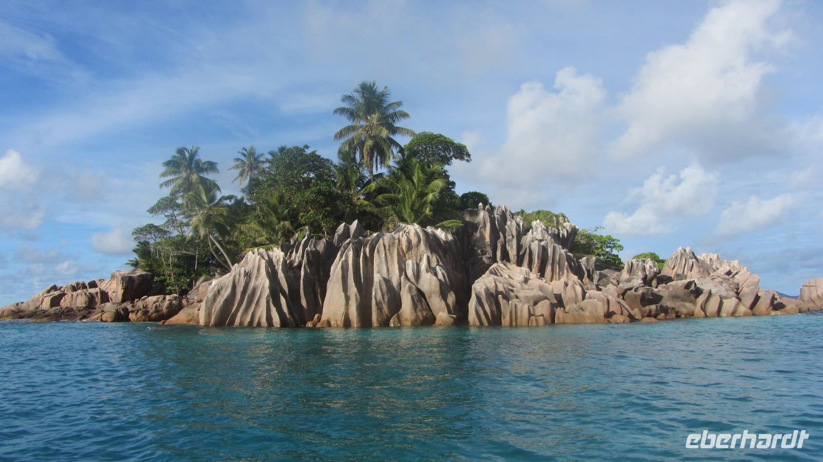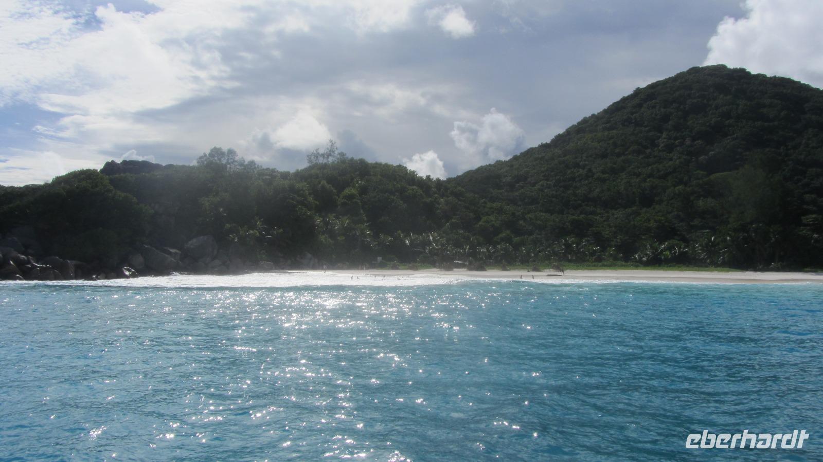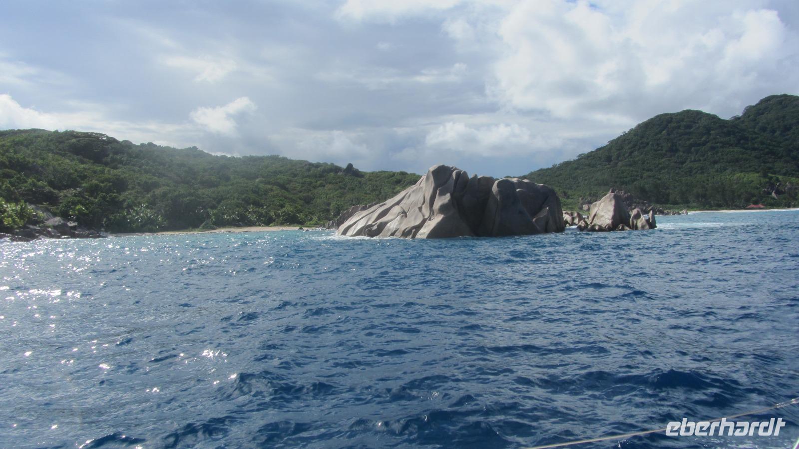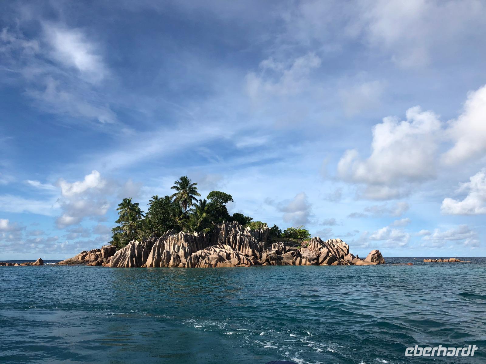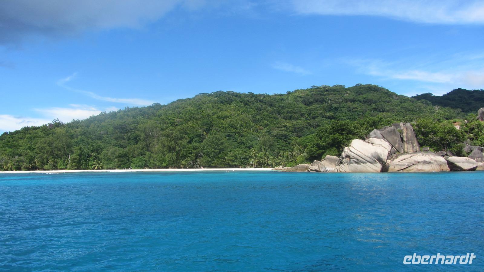 Heute wollen wir die viertgrößte Insel der Seychellen erkunden. Es soll die schönste Insel sein und wir haben schon viel über sie gehört und sind gespannt. Zu unserer Überraschung werden wir heute mit einem kleinen Boot direkt vom Hotel abgeholt. Mit nassen Füßen steigen wir ein und das kleine Boot bringt uns zu einem Katamaran, der nur uns heute zur Verfügung steht. Das Meer ist ruhig und die Fahrt mit dem Katamaran ist sehr angenehm. Nun geht es entspannt circa eine Stunde bis zum kleinen Hafen von La Digue. Wir erreichen La Passe, die einzige Ortschaft auf La Digue. Unser umgebauter Ochsenkarren, der nun per Motor angetrieben wird, wartet schon auf uns und so beginnen wir unsere Rundfahrt. Zuerst fahren wir zum Aussichtspunkt Belle Vue und genießen den Überblick. Die Wettervorhersagen für den heutigen Tag waren alles andere als gut, aber scheinbar reisen hier doch nur Engel und so haben wir auch heute nur traumhaften Sonnenschein. Auf der Insel gibt es einen Kindergarten, eine Schule, die am Wochenende zur Disko umgebaut wird und auch ein Insel-Krankenhaus. Weiter führt uns die Fahrt über die nur circa 10 km2 große Insel auf die ander Seite. Dort liegt der berühmte Strand Grand Anse. Das Meer überzeugt mit seiner herrlich türkisen Farbe und der Sand ist weich und gelb. Die Sonne prallt auf uns herab. Beim schwimmen müssen wir aber sehr aufpassen, da die Strömung und der Wellengang sehr stark sind. Am Ende des Strandes Grand Anse führt auch ein Wanderwege über Stock und Stein zum Strand Petit Anse. Nach der Badepause gönnen wir uns noch eine frisch von der Palme auf geschlagene Kokosnuss. Das anschließende Mittagessen vom Grill ist schmackhaft. Anschließend fahren wir wieder mit unserem umgebauten LKW weiter auf die andere Seite der Insel. Wir fahren zum L''Union Estate Park und stoppen zuerst an der Kopra-Mühle. Hier wird uns gezeigt, wie Kokosnuss-Öl hergestellt wird. Die Nuss wird halbiert, getrocknet, das weiße Fleisch wird zermahlen und kommt dann in die Mühle. Ein Ochse läuft um die Mühle und durch diese Reibung entsteht das Öl, was man sowohl zum Kochen, als auch für Kosmetik einsetzt. Weiter fahren wir zum 400 Meter hohen Giant Rock, den wir bereits vom Meer aus gesehen haben. Desweiteren sehen wir das ehemalige Plantagen-Haus, wo ab 1800 eine Familie aus der La Réunion gelebt hat und mit Hilfe zahlreicher Sklaven die Kokosnuss- und die Vanille-Plantage kultiviert hat. Unsere Freunde die Riesen-Schildkröten sind auch wieder da. Nun geht es aber zum wohl berühmtesten Strand, dem Source d''Argent. Dieser Strand schmückt viele Werbe -Plakate, Fotos und Videos, obwohl er oftmals auch der Karibik zugeschrieben wird. Der schmale Abschnitt ist von Felsen umringt. Wir stürzen uns in die Fluten, die leider keine Erfrischung sind, da das Meer sehr warm ist. Viele Fotos von dem Strand Abschnitt umrahmt von Felden werden fest gehalten. Anschließend fahren wir zurück nach La Passe und besteigen wieder unseren Katamaran. Der Himmel sieht bedrohlich aus, doch wir haben großes Glück, es zieht immer in die andere Richtung. So fahren wir gemächlich um die Insel und bewundern die schroffe Küste und die kleinen Strandabschnitte. Die Insel ist üppig grün und Ausblicke einfach herrlich. Während der Fahrt fängt die Crew auch noch einen recht großen Jack-Fisch und wir können hautnah dabei sein. Wir sehen nun auch vom Boot aus die Strände, die wir am Vormittag besucht haben. Nach der Umrundung lassen wir La Digue hinter uns und es geht die circa acht Kilometer zurück nach Praslin. Wir stoßen gemeinsam mit dem einheimischen Rum Takkamakka auf dieses schönen Tag an. Die kleinen Boote bringen uns wieder zum Hotel. Am Abend versammeln wir uns noch einmal zusammen bei einem leckeren Cocktail und nehmen Abschied.