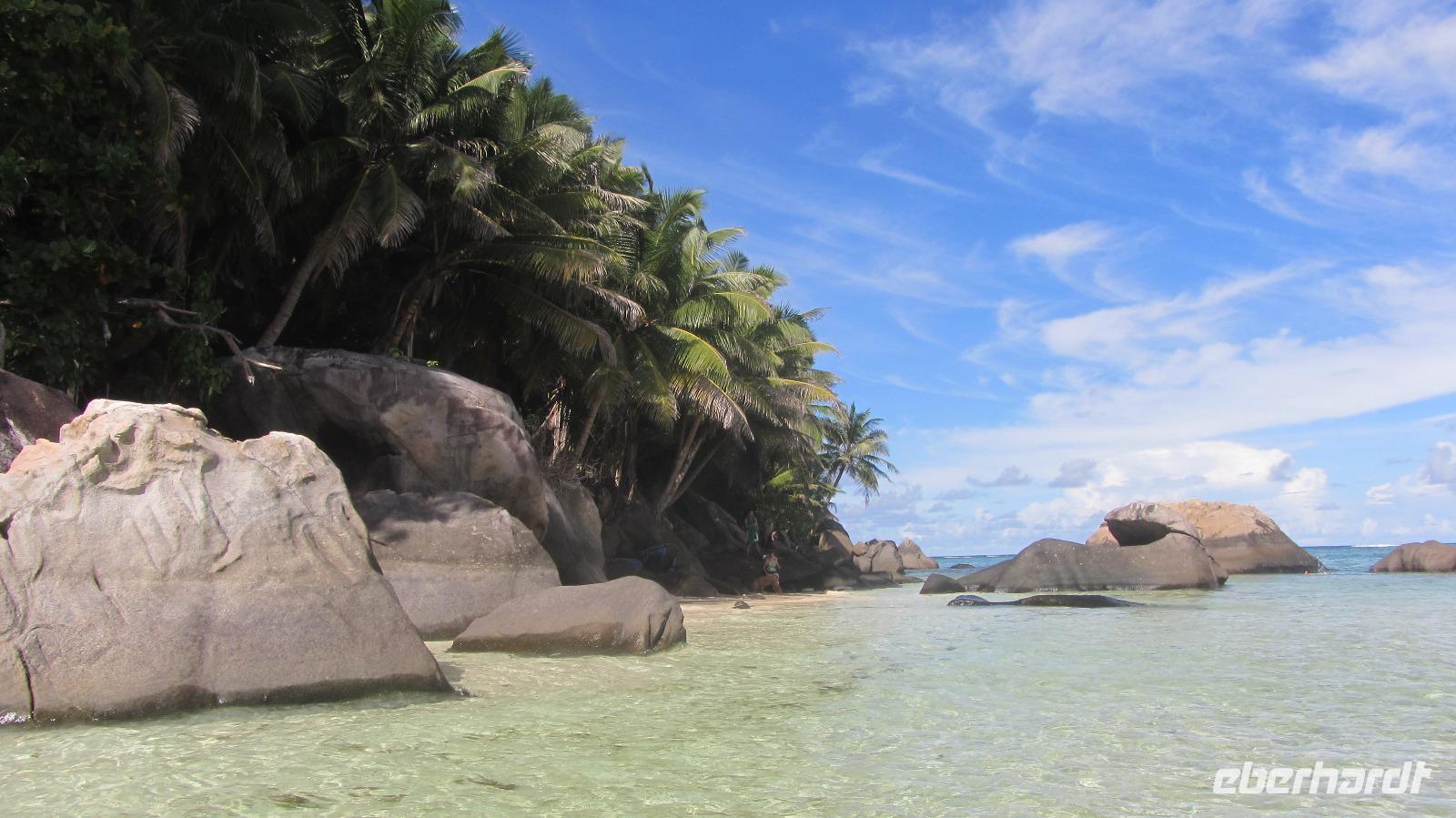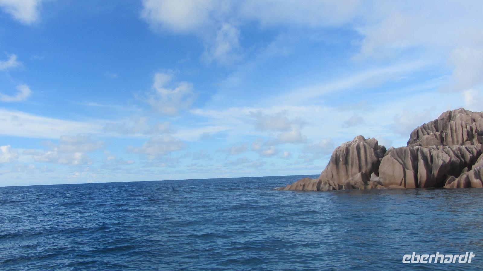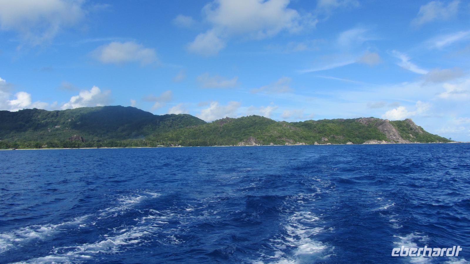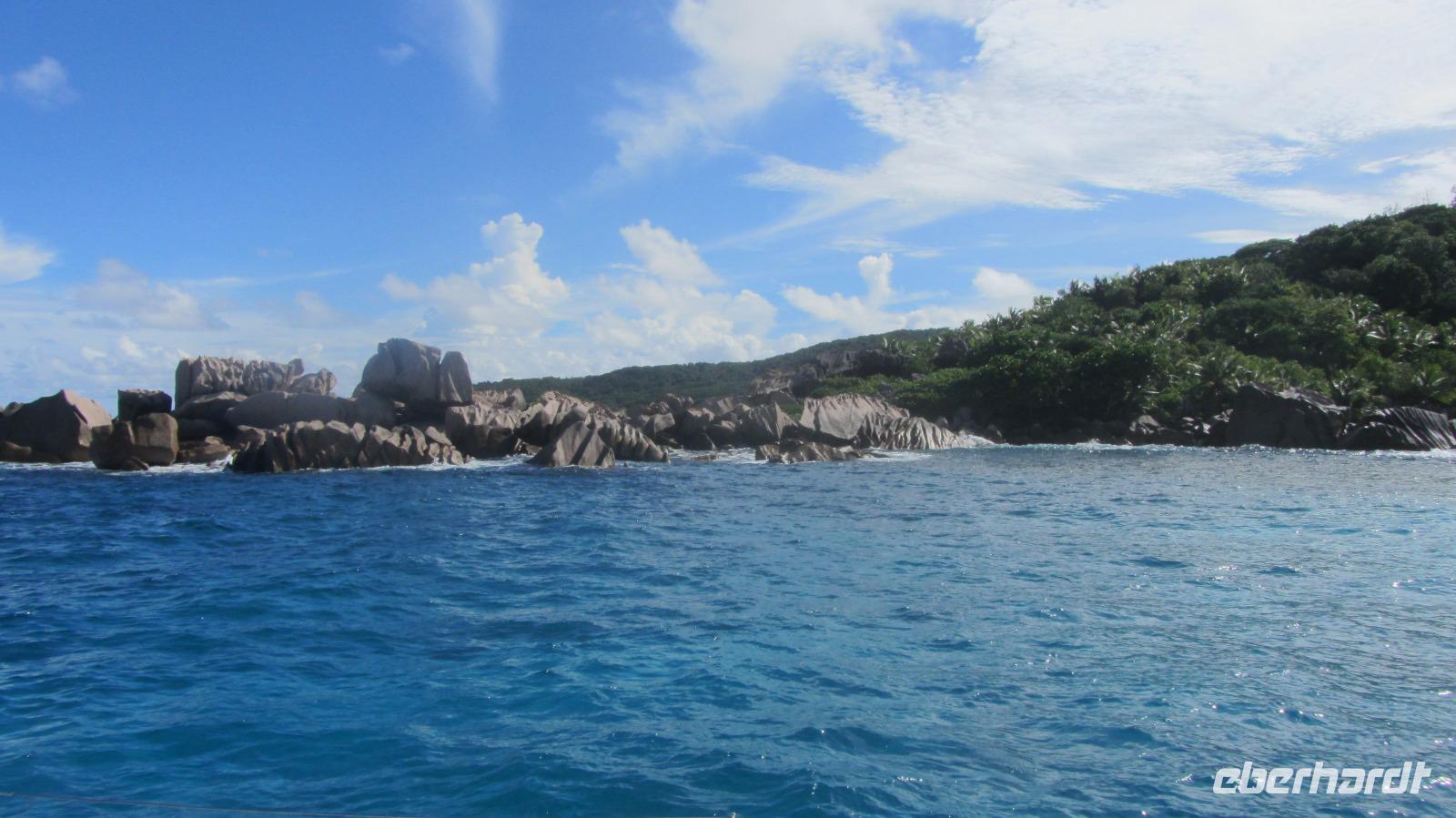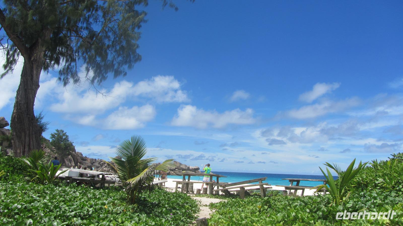 Heute wollen wir die viertgrößte Insel der Seychellen erkunden. Es soll die schönste Insel sein und wir haben schon viel über sie gehört und sind gespannt. Zu unserer Überraschung werden wir heute mit einem kleinen Boot direkt vom Hotel abgeholt. Mit nassen Füßen steigen wir ein und das kleine Boot bringt uns zu einem Katamaran, der nur uns heute zur Verfügung steht. Das Meer ist ruhig und die Fahrt mit dem Katamaran ist sehr angenehm. Nun geht es entspannt circa eine Stunde bis zum kleinen Hafen von La Digue. Wir erreichen La Passe, die einzige Ortschaft auf La Digue. Unser umgebauter Ochsenkarren, der nun per Motor angetrieben wird, wartet schon auf uns und so beginnen wir unsere Rundfahrt. Zuerst fahren wir zum Aussichtspunkt Belle Vue und genießen den Überblick. Die Wettervorhersagen für den heutigen Tag waren alles andere als gut, aber scheinbar reisen hier doch nur Engel und so haben wir auch heute nur traumhaften Sonnenschein. Auf der Insel gibt es einen Kindergarten, eine Schule, die am Wochenende zur Disko umgebaut wird und auch ein Insel-Krankenhaus. Weiter führt uns die Fahrt über die nur circa 10 km2 große Insel auf die ander Seite. Dort liegt der berühmte Strand Grand Anse. Das Meer überzeugt mit seiner herrlich türkisen Farbe und der Sand ist weich und gelb. Die Sonne prallt auf uns herab. Beim schwimmen müssen wir aber sehr aufpassen, da die Strömung und der Wellengang sehr stark sind. Am Ende des Strandes Grand Anse führt auch ein Wanderwege über Stock und Stein zum Strand Petit Anse. Nach der Badepause gönnen wir uns noch eine frisch von der Palme auf geschlagene Kokosnuss. Das anschließende Mittagessen vom Grill ist schmackhaft. Anschließend fahren wir wieder mit unserem umgebauten LKW weiter auf die andere Seite der Insel. Wir fahren zum L''Union Estate Park und stoppen zuerst an der Kopra-Mühle. Hier wird uns gezeigt, wie Kokosnuss-Öl hergestellt wird. Die Nuss wird halbiert, getrocknet, das weiße Fleisch wird zermahlen und kommt dann in die Mühle. Ein Ochse läuft um die Mühle und durch diese Reibung entsteht das Öl, was man sowohl zum Kochen, als auch für Kosmetik einsetzt. Weiter fahren wir zum 400 Meter hohen Giant Rock, den wir bereits vom Meer aus gesehen haben. Desweiteren sehen wir das ehemalige Plantagen-Haus, wo ab 1800 eine Familie aus der La Réunion gelebt hat und mit Hilfe zahlreicher Sklaven die Kokosnuss- und die Vanille-Plantage kultiviert hat. Unsere Freunde die Riesen-Schildkröten sind auch wieder da. Nun geht es aber zum wohl berühmtesten Strand, dem Source d''Argent. Dieser Strand schmückt viele Werbe -Plakate, Fotos und Videos, obwohl er oftmals auch der Karibik zugeschrieben wird. Der schmale Abschnitt ist von Felsen umringt. Wir stürzen uns in die Fluten, die leider keine Erfrischung sind, da das Meer sehr warm ist. Viele Fotos von dem Strand Abschnitt umrahmt von Felden werden fest gehalten. Anschließend fahren wir zurück nach La Passe und besteigen wieder unseren Katamaran. Der Himmel sieht bedrohlich aus, doch wir haben großes Glück, es zieht immer in die andere Richtung. So fahren wir gemächlich um die Insel und bewundern die schroffe Küste und die kleinen Strandabschnitte. Die Insel ist üppig grün und Ausblicke einfach herrlich. Während der Fahrt fängt die Crew auch noch einen recht großen Jack-Fisch und wir können hautnah dabei sein. Wir sehen nun auch vom Boot aus die Strände, die wir am Vormittag besucht haben. Nach der Umrundung lassen wir La Digue hinter uns und es geht die circa acht Kilometer zurück nach Praslin. Wir stoßen gemeinsam mit dem einheimischen Rum Takkamakka auf dieses schönen Tag an. Die kleinen Boote bringen uns wieder zum Hotel. Am Abend versammeln wir uns noch einmal zusammen bei einem leckeren Cocktail und nehmen Abschied.