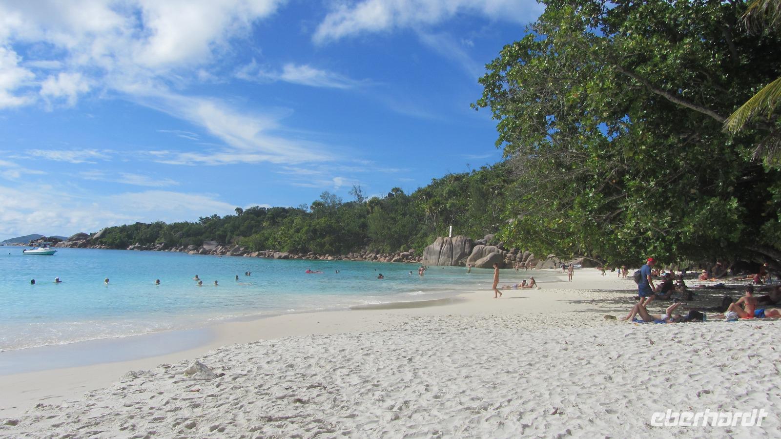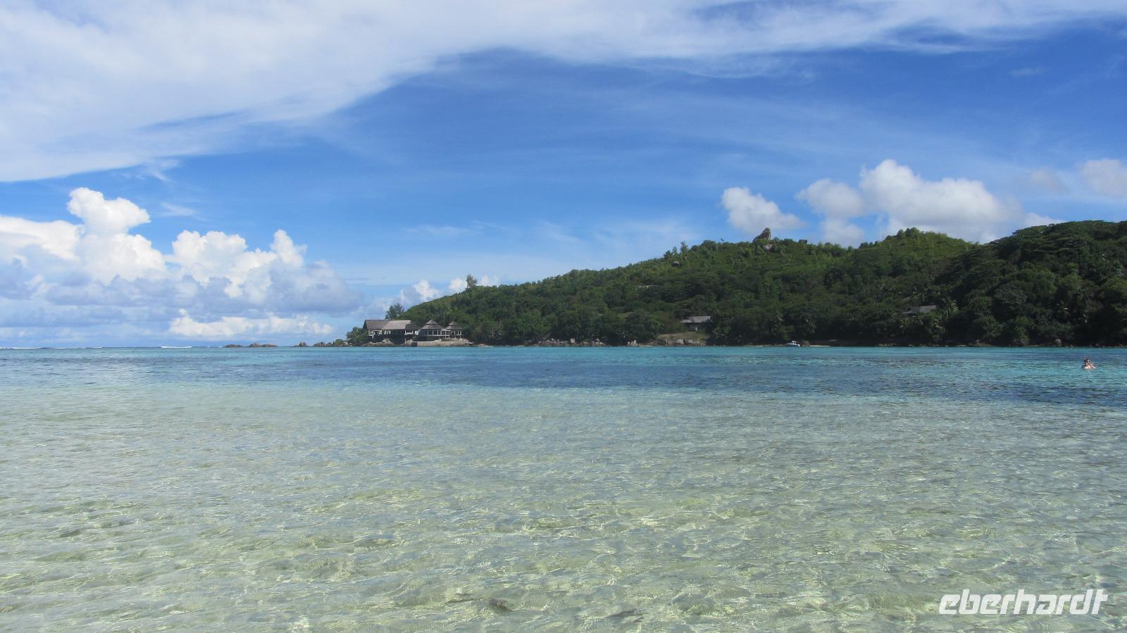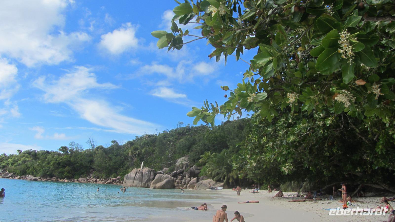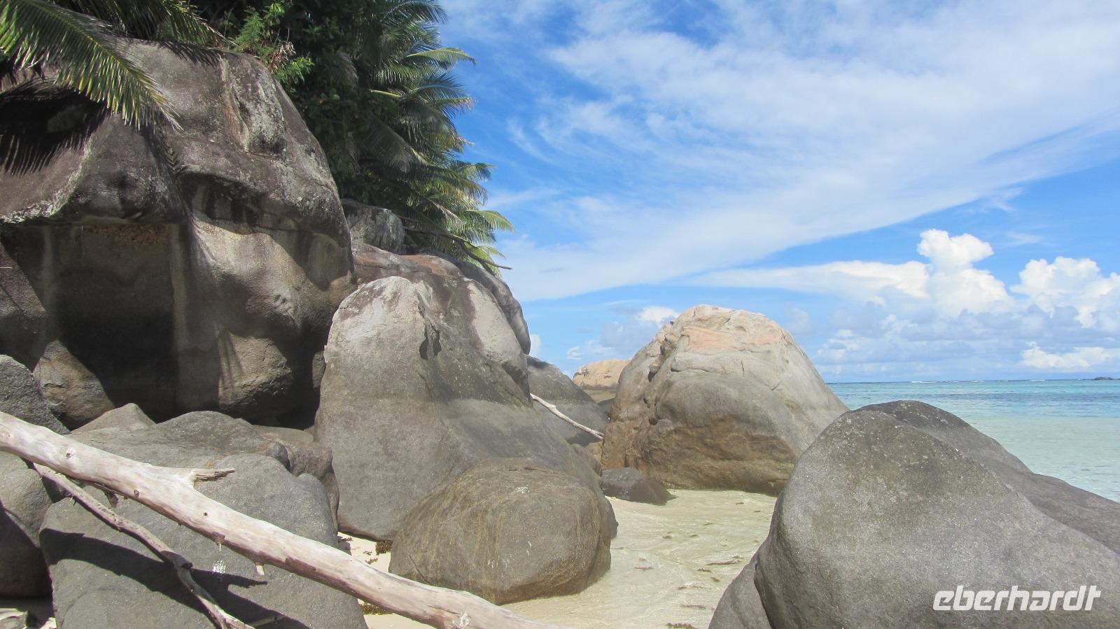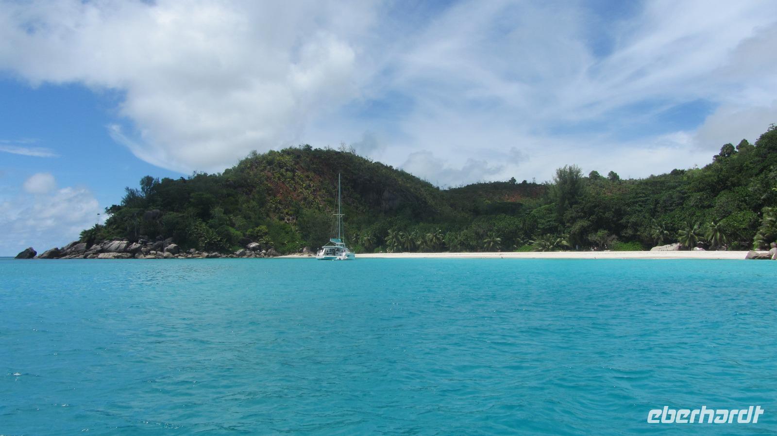 Heute wollen wir die viertgrößte Insel der Seychellen erkunden. Es soll die schönste Insel sein und wir haben schon viel über sie gehört und sind gespannt. Zu unserer Überraschung werden wir heute mit einem kleinen Boot direkt vom Hotel abgeholt. Mit nassen Füßen steigen wir ein und das kleine Boot bringt uns zu einem Katamaran, der nur uns heute zur Verfügung steht. Das Meer ist ruhig und die Fahrt mit dem Katamaran ist sehr angenehm. Nun geht es entspannt circa eine Stunde bis zum kleinen Hafen von La Digue. Wir erreichen La Passe, die einzige Ortschaft auf La Digue. Unser umgebauter Ochsenkarren, der nun per Motor angetrieben wird, wartet schon auf uns und so beginnen wir unsere Rundfahrt. Zuerst fahren wir zum Aussichtspunkt Belle Vue und genießen den Überblick. Die Wettervorhersagen für den heutigen Tag waren alles andere als gut, aber scheinbar reisen hier doch nur Engel und so haben wir auch heute nur traumhaften Sonnenschein. Auf der Insel gibt es einen Kindergarten, eine Schule, die am Wochenende zur Disko umgebaut wird und auch ein Insel-Krankenhaus. Weiter führt uns die Fahrt über die nur circa 10 km2 große Insel auf die ander Seite. Dort liegt der berühmte Strand Grand Anse. Das Meer überzeugt mit seiner herrlich türkisen Farbe und der Sand ist weich und gelb. Die Sonne prallt auf uns herab. Beim schwimmen müssen wir aber sehr aufpassen, da die Strömung und der Wellengang sehr stark sind. Am Ende des Strandes Grand Anse führt auch ein Wanderwege über Stock und Stein zum Strand Petit Anse. Nach der Badepause gönnen wir uns noch eine frisch von der Palme auf geschlagene Kokosnuss. Das anschließende Mittagessen vom Grill ist schmackhaft. Anschließend fahren wir wieder mit unserem umgebauten LKW weiter auf die andere Seite der Insel. Wir fahren zum L''Union Estate Park und stoppen zuerst an der Kopra-Mühle. Hier wird uns gezeigt, wie Kokosnuss-Öl hergestellt wird. Die Nuss wird halbiert, getrocknet, das weiße Fleisch wird zermahlen und kommt dann in die Mühle. Ein Ochse läuft um die Mühle und durch diese Reibung entsteht das Öl, was man sowohl zum Kochen, als auch für Kosmetik einsetzt. Weiter fahren wir zum 400 Meter hohen Giant Rock, den wir bereits vom Meer aus gesehen haben. Desweiteren sehen wir das ehemalige Plantagen-Haus, wo ab 1800 eine Familie aus der La Réunion gelebt hat und mit Hilfe zahlreicher Sklaven die Kokosnuss- und die Vanille-Plantage kultiviert hat. Unsere Freunde die Riesen-Schildkröten sind auch wieder da. Nun geht es aber zum wohl berühmtesten Strand, dem Source d''Argent. Dieser Strand schmückt viele Werbe -Plakate, Fotos und Videos, obwohl er oftmals auch der Karibik zugeschrieben wird. Der schmale Abschnitt ist von Felsen umringt. Wir stürzen uns in die Fluten, die leider keine Erfrischung sind, da das Meer sehr warm ist. Viele Fotos von dem Strand Abschnitt umrahmt von Felden werden fest gehalten. Anschließend fahren wir zurück nach La Passe und besteigen wieder unseren Katamaran. Der Himmel sieht bedrohlich aus, doch wir haben großes Glück, es zieht immer in die andere Richtung. So fahren wir gemächlich um die Insel und bewundern die schroffe Küste und die kleinen Strandabschnitte. Die Insel ist üppig grün und Ausblicke einfach herrlich. Während der Fahrt fängt die Crew auch noch einen recht großen Jack-Fisch und wir können hautnah dabei sein. Wir sehen nun auch vom Boot aus die Strände, die wir am Vormittag besucht haben. Nach der Umrundung lassen wir La Digue hinter uns und es geht die circa acht Kilometer zurück nach Praslin. Wir stoßen gemeinsam mit dem einheimischen Rum Takkamakka auf dieses schönen Tag an. Die kleinen Boote bringen uns wieder zum Hotel. Am Abend versammeln wir uns noch einmal zusammen bei einem leckeren Cocktail und nehmen Abschied.