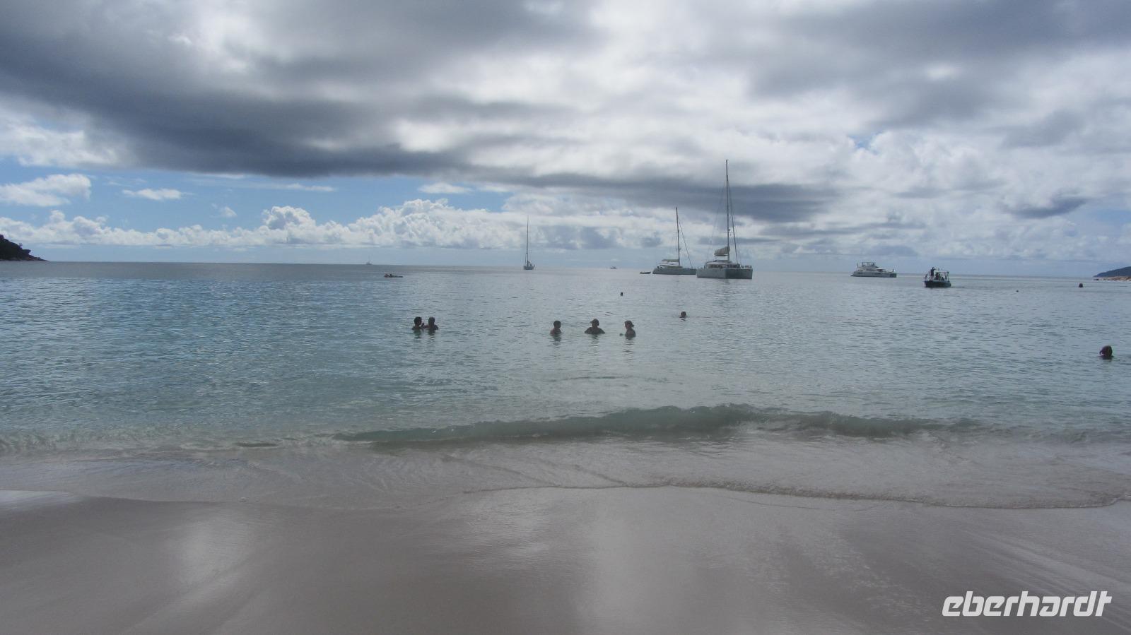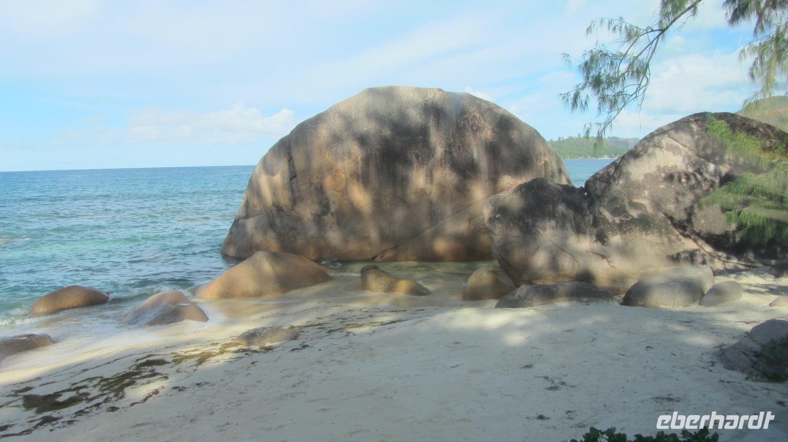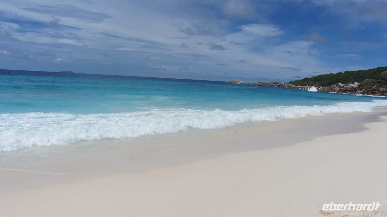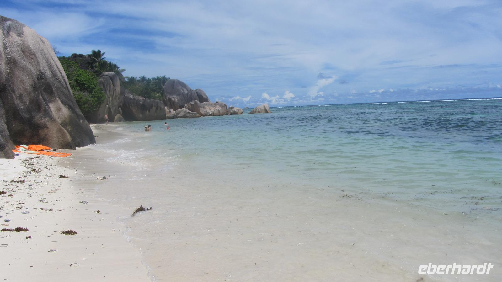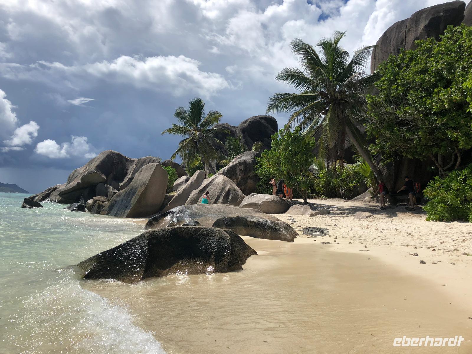 Heute wollen wir die viertgrößte Insel der Seychellen erkunden. Es soll die schönste Insel sein und wir haben schon viel über sie gehört und sind gespannt. Zu unserer Überraschung werden wir heute mit einem kleinen Boot direkt vom Hotel abgeholt. Mit nassen Füßen steigen wir ein und das kleine Boot bringt uns zu einem Katamaran, der nur uns heute zur Verfügung steht. Das Meer ist ruhig und die Fahrt mit dem Katamaran ist sehr angenehm. Nun geht es entspannt circa eine Stunde bis zum kleinen Hafen von La Digue. Wir erreichen La Passe, die einzige Ortschaft auf La Digue. Unser umgebauter Ochsenkarren, der nun per Motor angetrieben wird, wartet schon auf uns und so beginnen wir unsere Rundfahrt. Zuerst fahren wir zum Aussichtspunkt Belle Vue und genießen den Überblick. Die Wettervorhersagen für den heutigen Tag waren alles andere als gut, aber scheinbar reisen hier doch nur Engel und so haben wir auch heute nur traumhaften Sonnenschein. Auf der Insel gibt es einen Kindergarten, eine Schule, die am Wochenende zur Disko umgebaut wird und auch ein Insel-Krankenhaus. Weiter führt uns die Fahrt über die nur circa 10 km2 große Insel auf die ander Seite. Dort liegt der berühmte Strand Grand Anse. Das Meer überzeugt mit seiner herrlich türkisen Farbe und der Sand ist weich und gelb. Die Sonne prallt auf uns herab. Beim schwimmen müssen wir aber sehr aufpassen, da die Strömung und der Wellengang sehr stark sind. Am Ende des Strandes Grand Anse führt auch ein Wanderwege über Stock und Stein zum Strand Petit Anse. Nach der Badepause gönnen wir uns noch eine frisch von der Palme auf geschlagene Kokosnuss. Das anschließende Mittagessen vom Grill ist schmackhaft. Anschließend fahren wir wieder mit unserem umgebauten LKW weiter auf die andere Seite der Insel. Wir fahren zum L''Union Estate Park und stoppen zuerst an der Kopra-Mühle. Hier wird uns gezeigt, wie Kokosnuss-Öl hergestellt wird. Die Nuss wird halbiert, getrocknet, das weiße Fleisch wird zermahlen und kommt dann in die Mühle. Ein Ochse läuft um die Mühle und durch diese Reibung entsteht das Öl, was man sowohl zum Kochen, als auch für Kosmetik einsetzt. Weiter fahren wir zum 400 Meter hohen Giant Rock, den wir bereits vom Meer aus gesehen haben. Desweiteren sehen wir das ehemalige Plantagen-Haus, wo ab 1800 eine Familie aus der La Réunion gelebt hat und mit Hilfe zahlreicher Sklaven die Kokosnuss- und die Vanille-Plantage kultiviert hat. Unsere Freunde die Riesen-Schildkröten sind auch wieder da. Nun geht es aber zum wohl berühmtesten Strand, dem Source d''Argent. Dieser Strand schmückt viele Werbe -Plakate, Fotos und Videos, obwohl er oftmals auch der Karibik zugeschrieben wird. Der schmale Abschnitt ist von Felsen umringt. Wir stürzen uns in die Fluten, die leider keine Erfrischung sind, da das Meer sehr warm ist. Viele Fotos von dem Strand Abschnitt umrahmt von Felden werden fest gehalten. Anschließend fahren wir zurück nach La Passe und besteigen wieder unseren Katamaran. Der Himmel sieht bedrohlich aus, doch wir haben großes Glück, es zieht immer in die andere Richtung. So fahren wir gemächlich um die Insel und bewundern die schroffe Küste und die kleinen Strandabschnitte. Die Insel ist üppig grün und Ausblicke einfach herrlich. Während der Fahrt fängt die Crew auch noch einen recht großen Jack-Fisch und wir können hautnah dabei sein. Wir sehen nun auch vom Boot aus die Strände, die wir am Vormittag besucht haben. Nach der Umrundung lassen wir La Digue hinter uns und es geht die circa acht Kilometer zurück nach Praslin. Wir stoßen gemeinsam mit dem einheimischen Rum Takkamakka auf dieses schönen Tag an. Die kleinen Boote bringen uns wieder zum Hotel. Am Abend versammeln wir uns noch einmal zusammen bei einem leckeren Cocktail und nehmen Abschied.