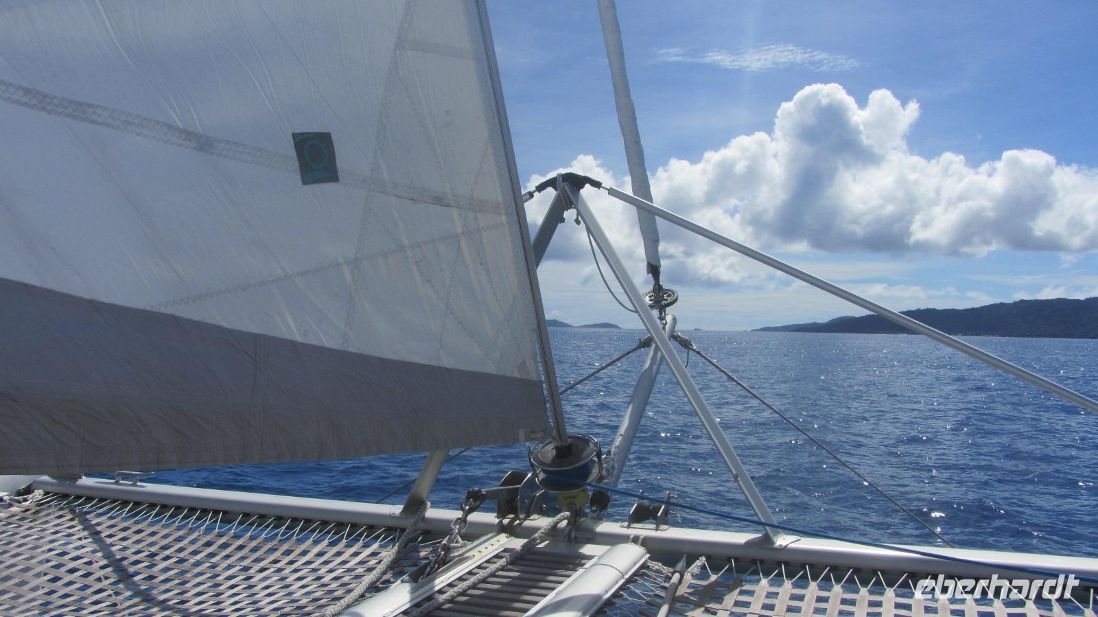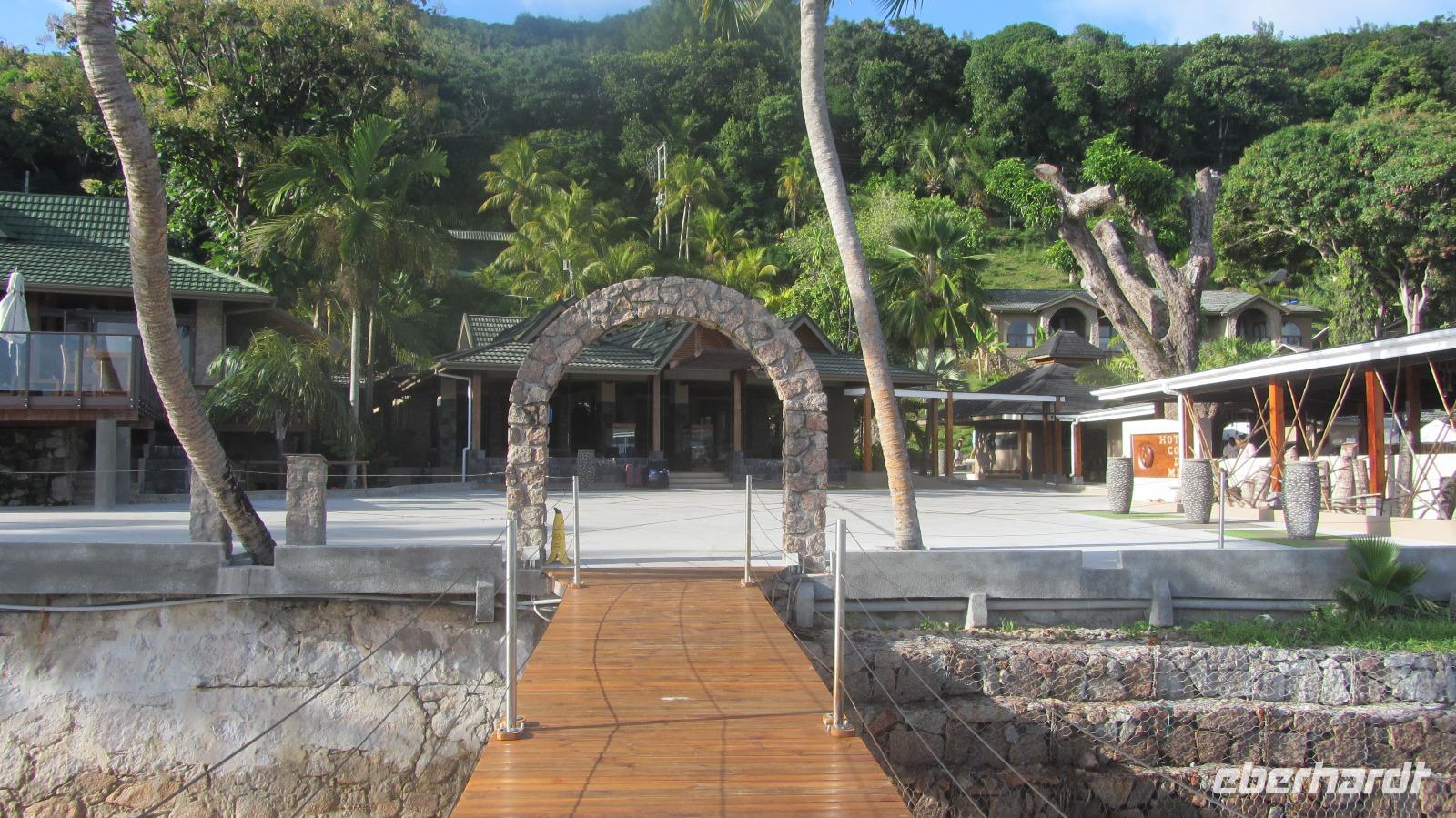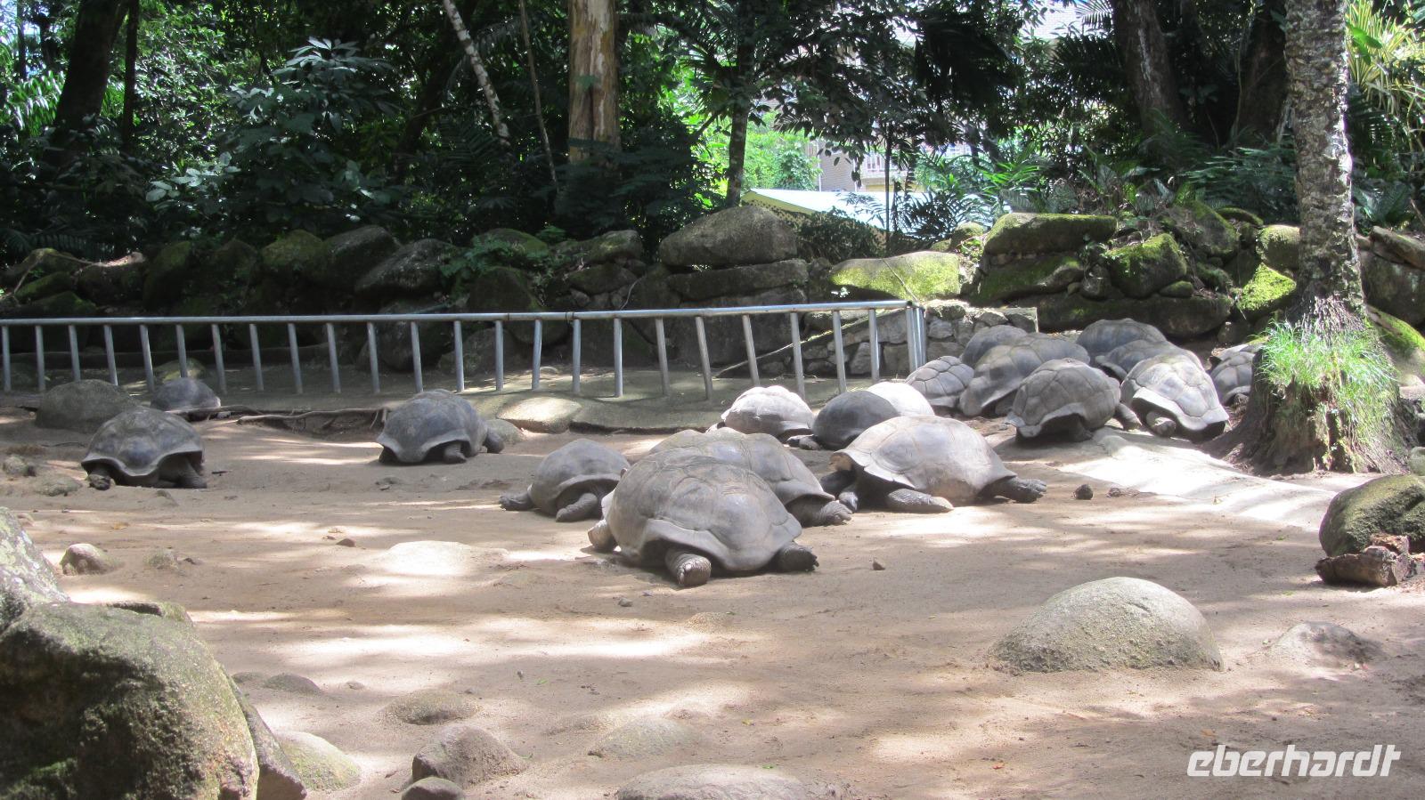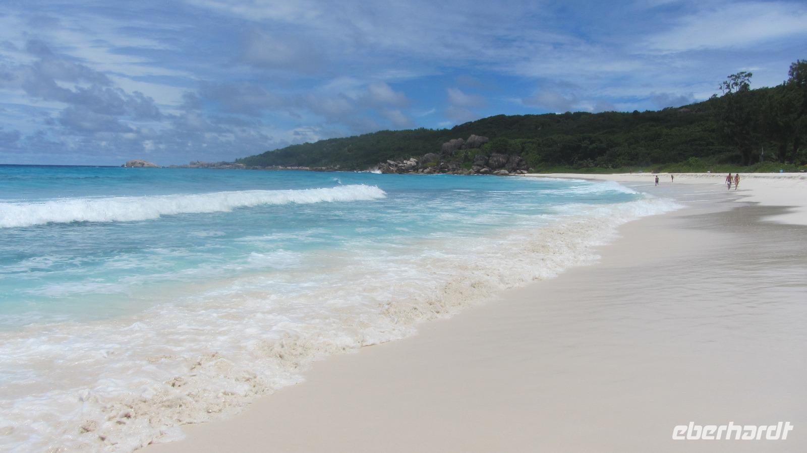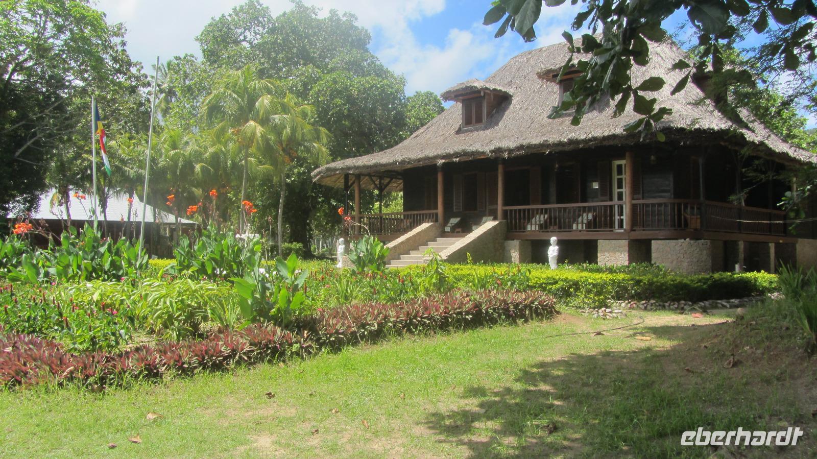 Heute wollen wir die viertgrößte Insel der Seychellen erkunden. Es soll die schönste Insel sein und wir haben schon viel über sie gehört und sind gespannt. Zu unserer Überraschung werden wir heute mit einem kleinen Boot direkt vom Hotel abgeholt. Mit nassen Füßen steigen wir ein und das kleine Boot bringt uns zu einem Katamaran, der nur uns heute zur Verfügung steht. Das Meer ist ruhig und die Fahrt mit dem Katamaran ist sehr angenehm. Nun geht es entspannt circa eine Stunde bis zum kleinen Hafen von La Digue. Wir erreichen La Passe, die einzige Ortschaft auf La Digue. Unser umgebauter Ochsenkarren, der nun per Motor angetrieben wird, wartet schon auf uns und so beginnen wir unsere Rundfahrt. Zuerst fahren wir zum Aussichtspunkt Belle Vue und genießen den Überblick. Die Wettervorhersagen für den heutigen Tag waren alles andere als gut, aber scheinbar reisen hier doch nur Engel und so haben wir auch heute nur traumhaften Sonnenschein. Auf der Insel gibt es einen Kindergarten, eine Schule, die am Wochenende zur Disko umgebaut wird und auch ein Insel-Krankenhaus. Weiter führt uns die Fahrt über die nur circa 10 km2 große Insel auf die ander Seite. Dort liegt der berühmte Strand Grand Anse. Das Meer überzeugt mit seiner herrlich türkisen Farbe und der Sand ist weich und gelb. Die Sonne prallt auf uns herab. Beim schwimmen müssen wir aber sehr aufpassen, da die Strömung und der Wellengang sehr stark sind. Am Ende des Strandes Grand Anse führt auch ein Wanderwege über Stock und Stein zum Strand Petit Anse. Nach der Badepause gönnen wir uns noch eine frisch von der Palme auf geschlagene Kokosnuss. Das anschließende Mittagessen vom Grill ist schmackhaft. Anschließend fahren wir wieder mit unserem umgebauten LKW weiter auf die andere Seite der Insel. Wir fahren zum L''Union Estate Park und stoppen zuerst an der Kopra-Mühle. Hier wird uns gezeigt, wie Kokosnuss-Öl hergestellt wird. Die Nuss wird halbiert, getrocknet, das weiße Fleisch wird zermahlen und kommt dann in die Mühle. Ein Ochse läuft um die Mühle und durch diese Reibung entsteht das Öl, was man sowohl zum Kochen, als auch für Kosmetik einsetzt. Weiter fahren wir zum 400 Meter hohen Giant Rock, den wir bereits vom Meer aus gesehen haben. Desweiteren sehen wir das ehemalige Plantagen-Haus, wo ab 1800 eine Familie aus der La Réunion gelebt hat und mit Hilfe zahlreicher Sklaven die Kokosnuss- und die Vanille-Plantage kultiviert hat. Unsere Freunde die Riesen-Schildkröten sind auch wieder da. Nun geht es aber zum wohl berühmtesten Strand, dem Source d''Argent. Dieser Strand schmückt viele Werbe -Plakate, Fotos und Videos, obwohl er oftmals auch der Karibik zugeschrieben wird. Der schmale Abschnitt ist von Felsen umringt. Wir stürzen uns in die Fluten, die leider keine Erfrischung sind, da das Meer sehr warm ist. Viele Fotos von dem Strand Abschnitt umrahmt von Felden werden fest gehalten. Anschließend fahren wir zurück nach La Passe und besteigen wieder unseren Katamaran. Der Himmel sieht bedrohlich aus, doch wir haben großes Glück, es zieht immer in die andere Richtung. So fahren wir gemächlich um die Insel und bewundern die schroffe Küste und die kleinen Strandabschnitte. Die Insel ist üppig grün und Ausblicke einfach herrlich. Während der Fahrt fängt die Crew auch noch einen recht großen Jack-Fisch und wir können hautnah dabei sein. Wir sehen nun auch vom Boot aus die Strände, die wir am Vormittag besucht haben. Nach der Umrundung lassen wir La Digue hinter uns und es geht die circa acht Kilometer zurück nach Praslin. Wir stoßen gemeinsam mit dem einheimischen Rum Takkamakka auf dieses schönen Tag an. Die kleinen Boote bringen uns wieder zum Hotel. Am Abend versammeln wir uns noch einmal zusammen bei einem leckeren Cocktail und nehmen Abschied.