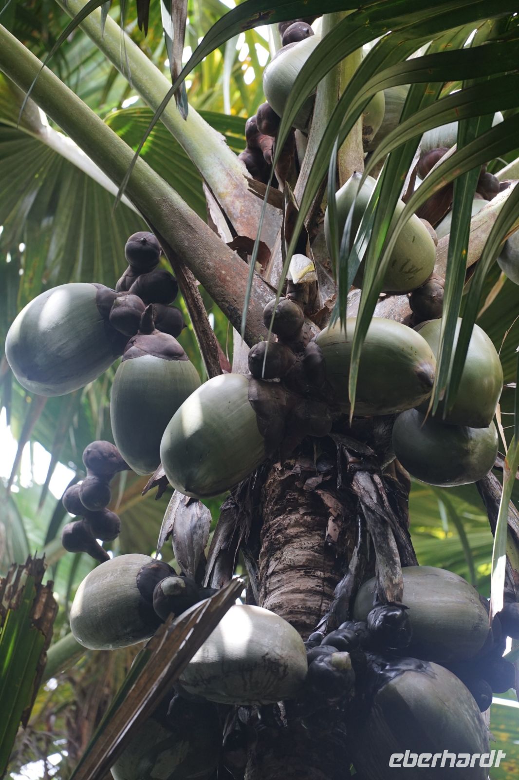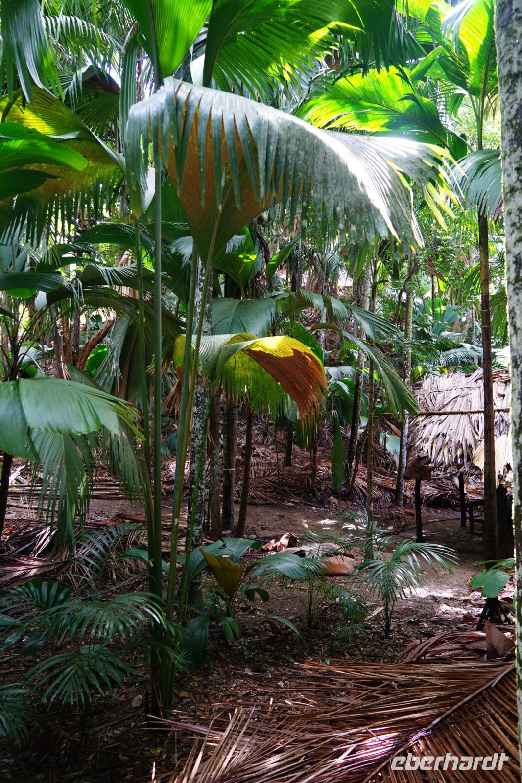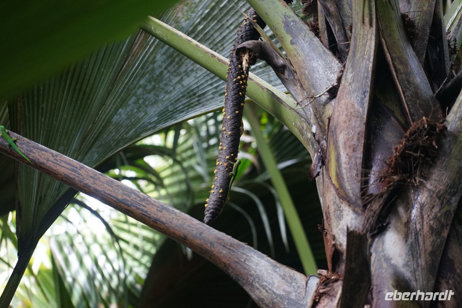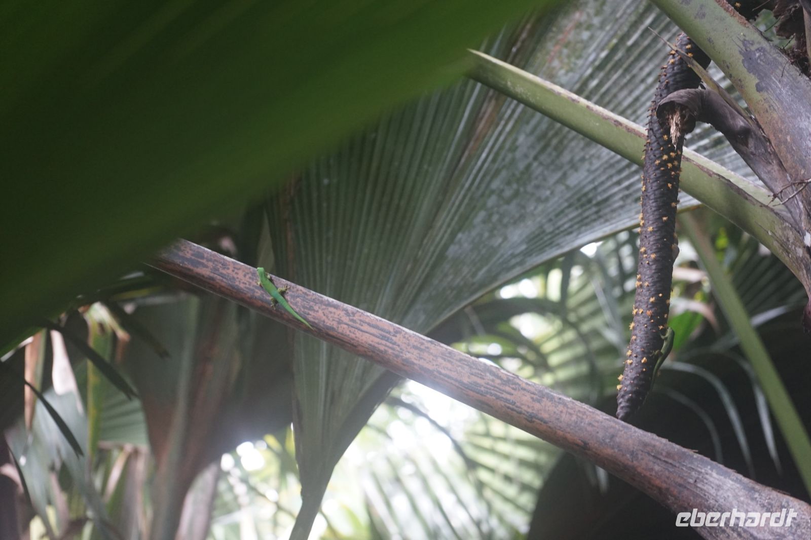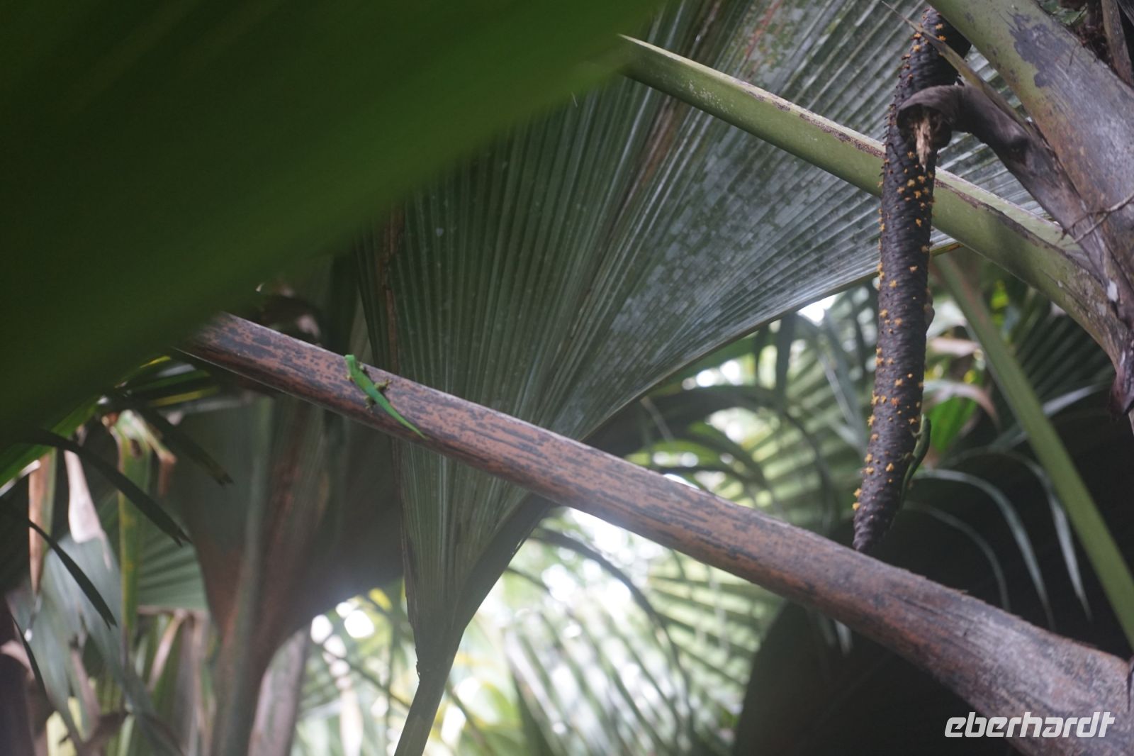 Gut gestärkt vom Frühstück, machten wir uns heute auf, die Insel Praslin besser kennenzulernen. Zunächst fuhren wir ins Zentrum der Insel. Hier ist das weltbekannte Vallee de Mai, welches zum UNESCO Weltnaturerbe gehört. Hier ist nicht nur die markante Coco de Mer endemisch, sondern auch viele weitere Palmenarten, sowie einige Tierarten wie der Schwarze Papagei. Cyril führte uns auf einer kleinen Wanderung durch den Wald und erklärte uns alles zu den Pflanzen und Tieren. Besonders der Unterschied zwischen männlicher und weiblicher Pflanze wurde anschaulich verdeutlicht.