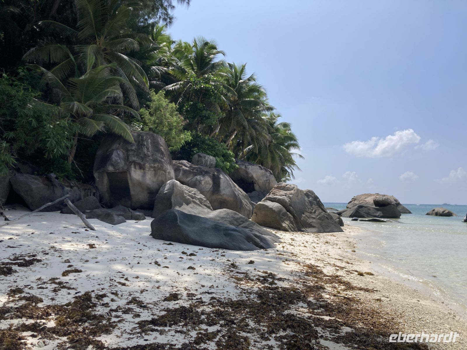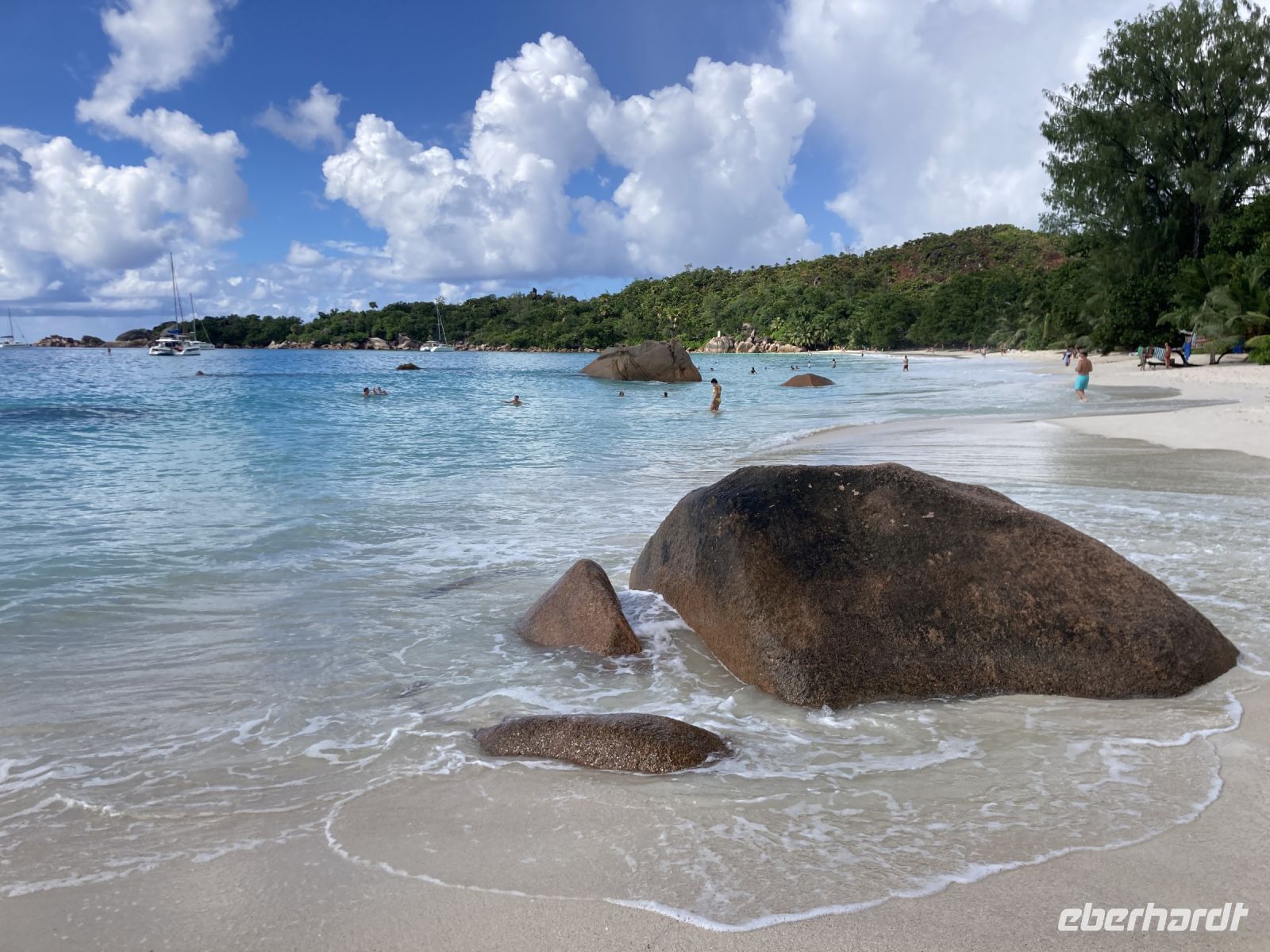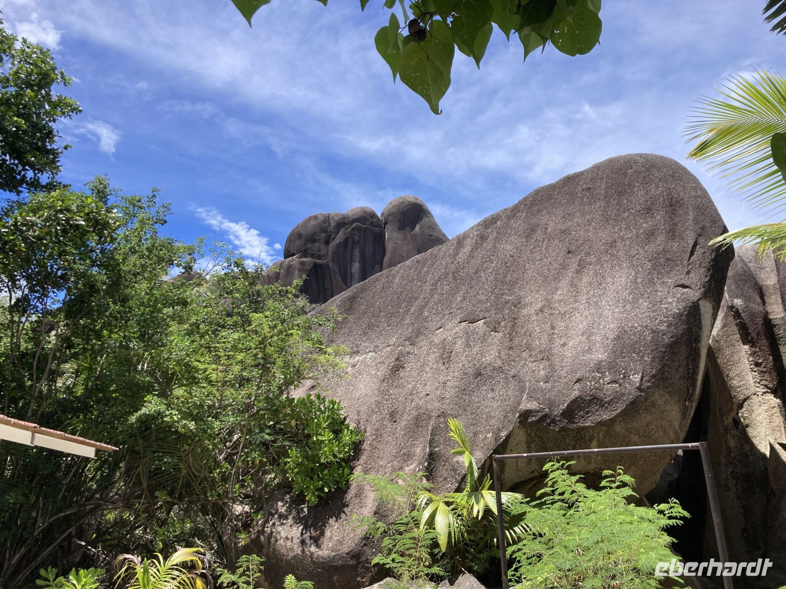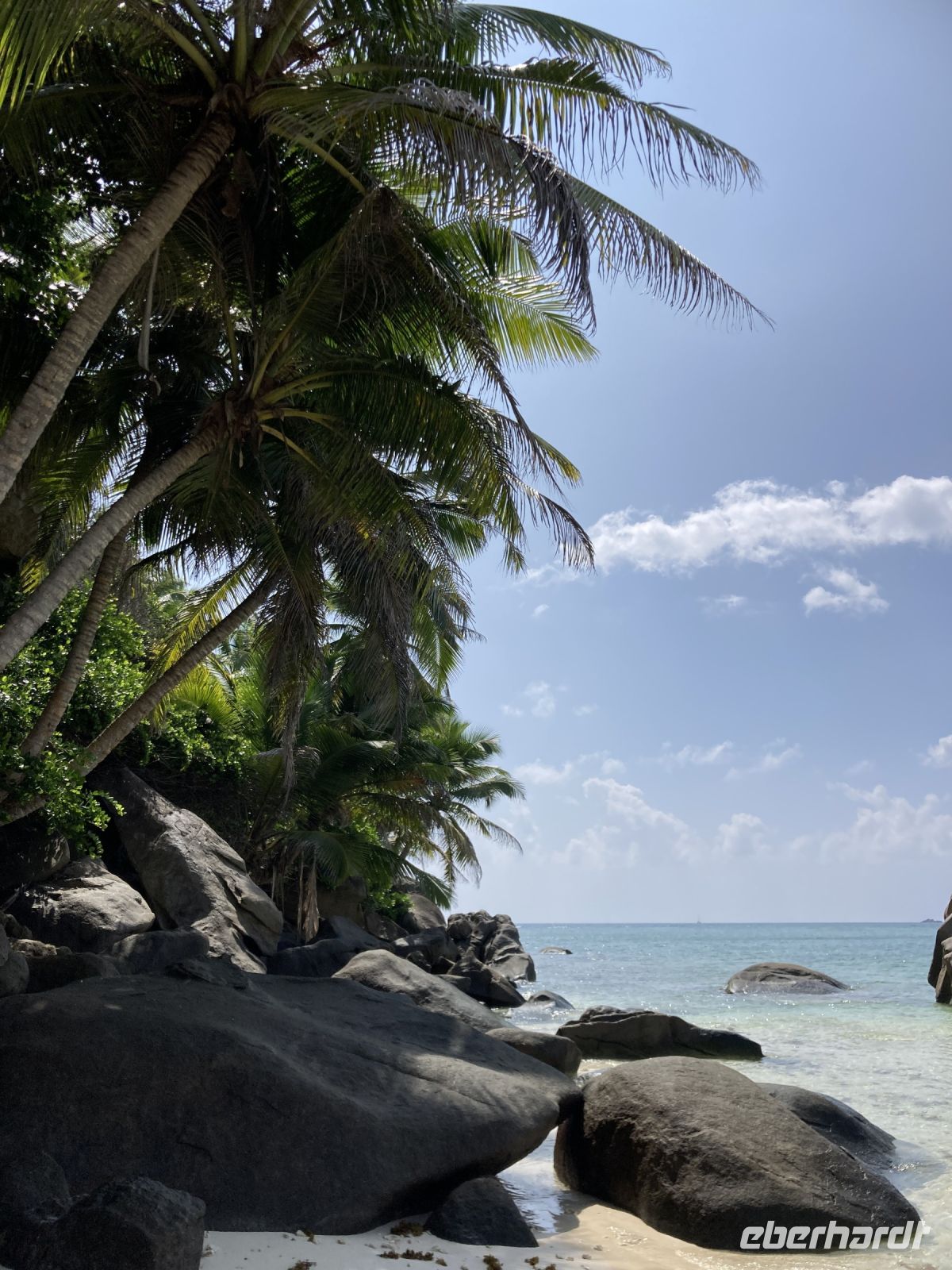 Nach dem üppigen Frühstücksbuffet geht es mit Cyril auf Erkundungstour. Im Vallée de Mai, ein Naturschutzgebiet, welches zum UNSECO-Weltnaturerbe zählt, wandern wir gemütlich durch den Palmenwald. Seinen Namen hat das Tal seiner ehemaligen Besitzerin zu verdanken, die den schönen Vornamen Mai trug. In dem Areal können wir nochmals intensiv die Coco de Mer begutachten. Und sogar einmal die Früchte anheben. Bis zu drei Samen kann eine Frucht produzieren. Und die Samen gehören mit bis zu 25 Kilo auch zu den schwersten der Welt. Aber die Coco de Mer ist ohnehin eine Pflanze der Superlative, schließlich kann sie auch bis zu 300 Jahre als werden. Gerne hätten wir noch ein weiteres Wahrzeichen der Seychellen gesehen - den schwarzen Papagei. Hören konnten wir ihn, leider war er nicht in Fotolaune. Nach unser Wanderung in mitten der Insel geht es nun in Richtung Nordosten. Schließlich ist Praslin auch für seine schönen Strände bekannt und beliebt. Damit wir für das Schwimmen gut gestärkt sind, legen wir noch einen Stopp für das Mittagessen ein. Und dann endlich die Anse Lazio. Diese Bucht zählt zu den schönsten der Seychellen und für einige ist sie die schönste der Welt. Es lohnt nicht nur der Sprung in das nicht wirklich kühle Nass, sondern auch ein Spaziergang zu den besonderen Felsformationen. Hier finden wir dann auch die Fotomotive, für die Strände der Seychellen bekannt sind.