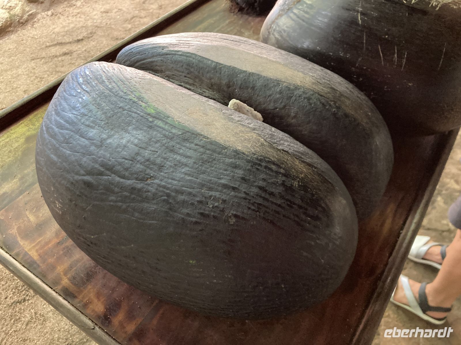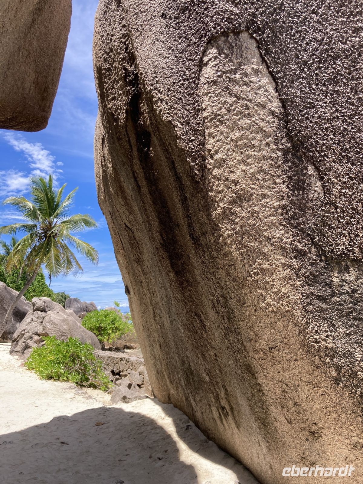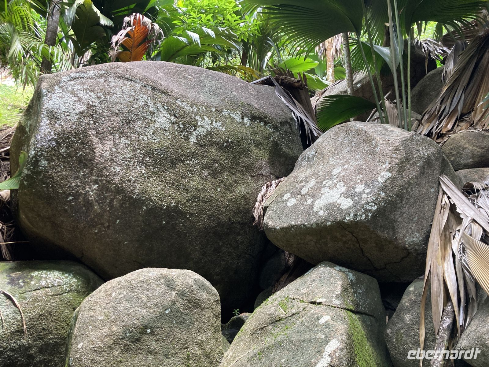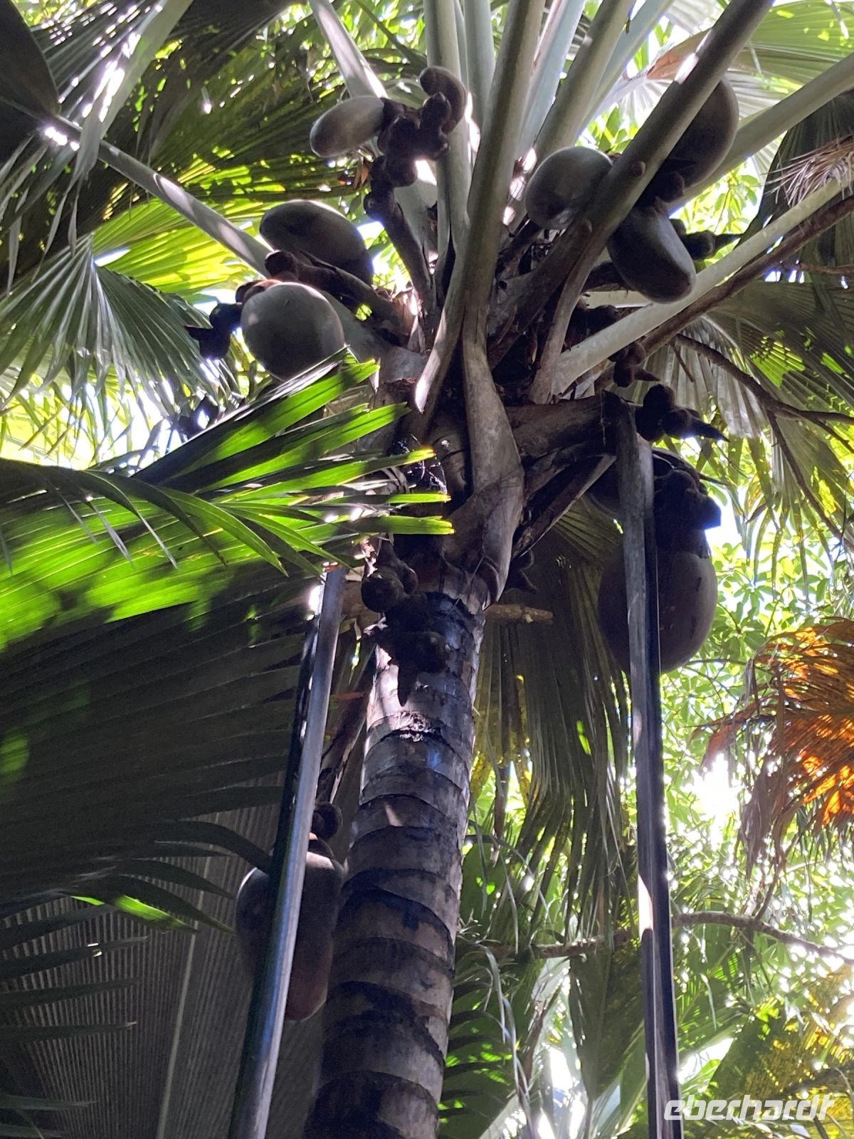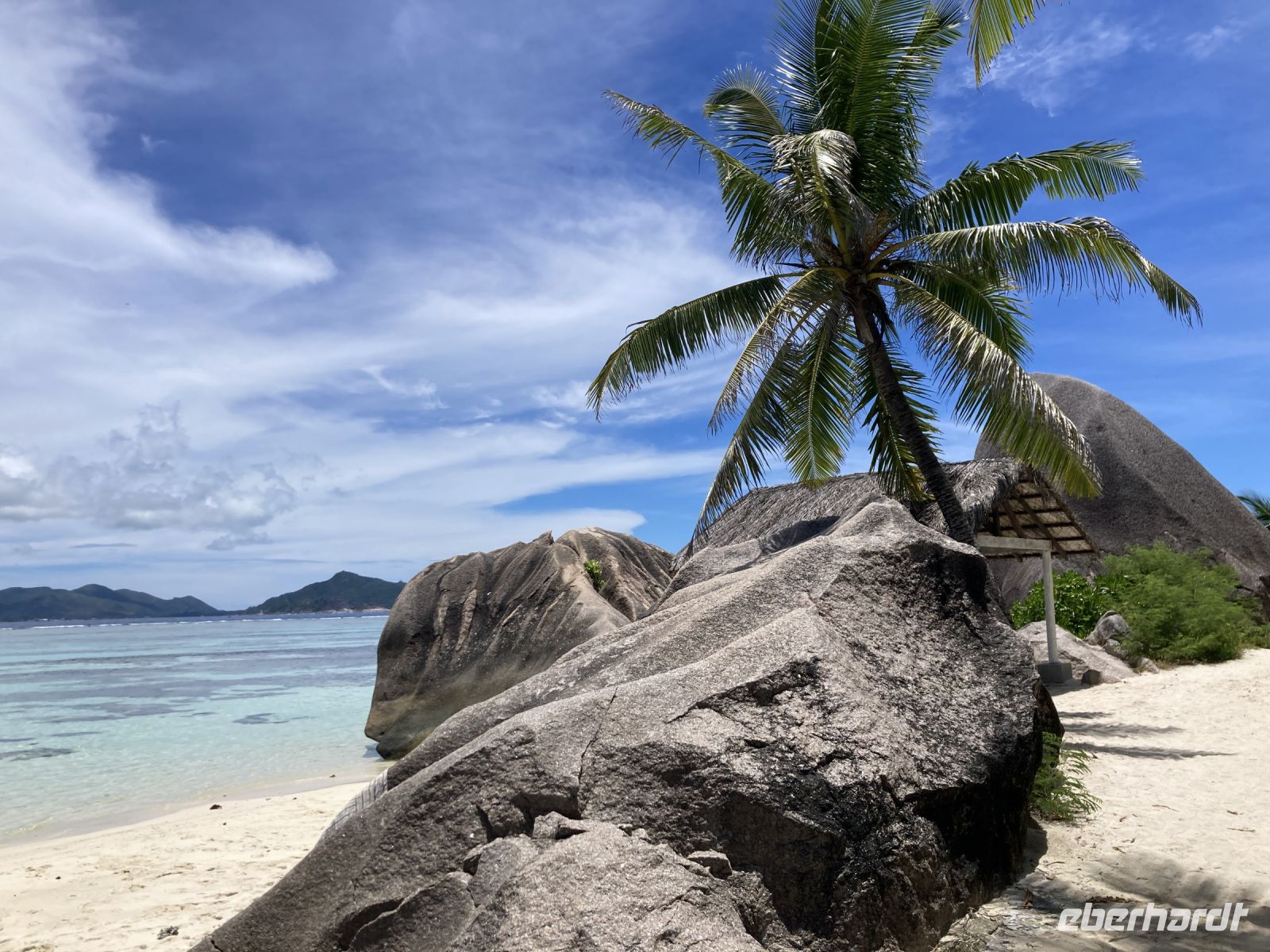 Nach dem üppigen Frühstücksbuffet geht es mit Cyril auf Erkundungstour. Im Vallée de Mai, ein Naturschutzgebiet, welches zum UNSECO-Weltnaturerbe zählt, wandern wir gemütlich durch den Palmenwald. Seinen Namen hat das Tal seiner ehemaligen Besitzerin zu verdanken, die den schönen Vornamen Mai trug. In dem Areal können wir nochmals intensiv die Coco de Mer begutachten. Und sogar einmal die Früchte anheben. Bis zu drei Samen kann eine Frucht produzieren. Und die Samen gehören mit bis zu 25 Kilo auch zu den schwersten der Welt. Aber die Coco de Mer ist ohnehin eine Pflanze der Superlative, schließlich kann sie auch bis zu 300 Jahre als werden. Gerne hätten wir noch ein weiteres Wahrzeichen der Seychellen gesehen - den schwarzen Papagei. Hören konnten wir ihn, leider war er nicht in Fotolaune. Nach unser Wanderung in mitten der Insel geht es nun in Richtung Nordosten. Schließlich ist Praslin auch für seine schönen Strände bekannt und beliebt. Damit wir für das Schwimmen gut gestärkt sind, legen wir noch einen Stopp für das Mittagessen ein. Und dann endlich die Anse Lazio. Diese Bucht zählt zu den schönsten der Seychellen und für einige ist sie die schönste der Welt. Es lohnt nicht nur der Sprung in das nicht wirklich kühle Nass, sondern auch ein Spaziergang zu den besonderen Felsformationen. Hier finden wir dann auch die Fotomotive, für die Strände der Seychellen bekannt sind.
