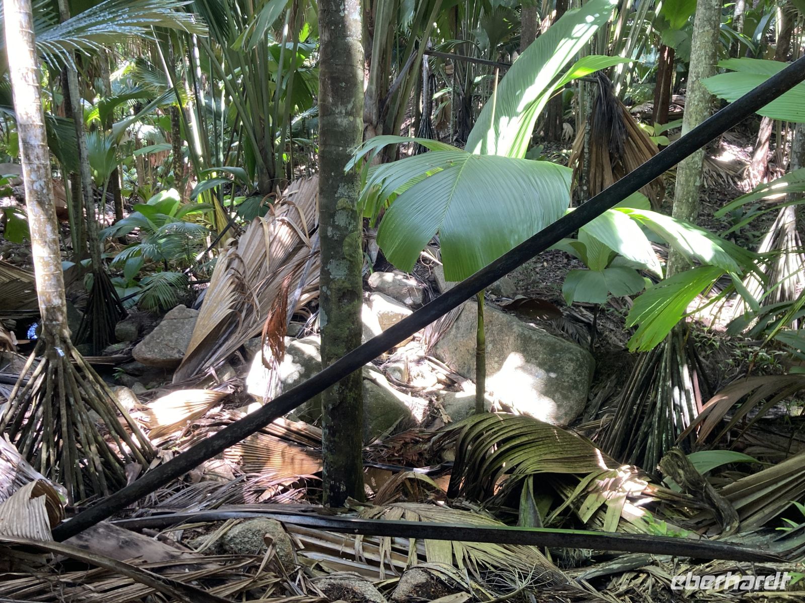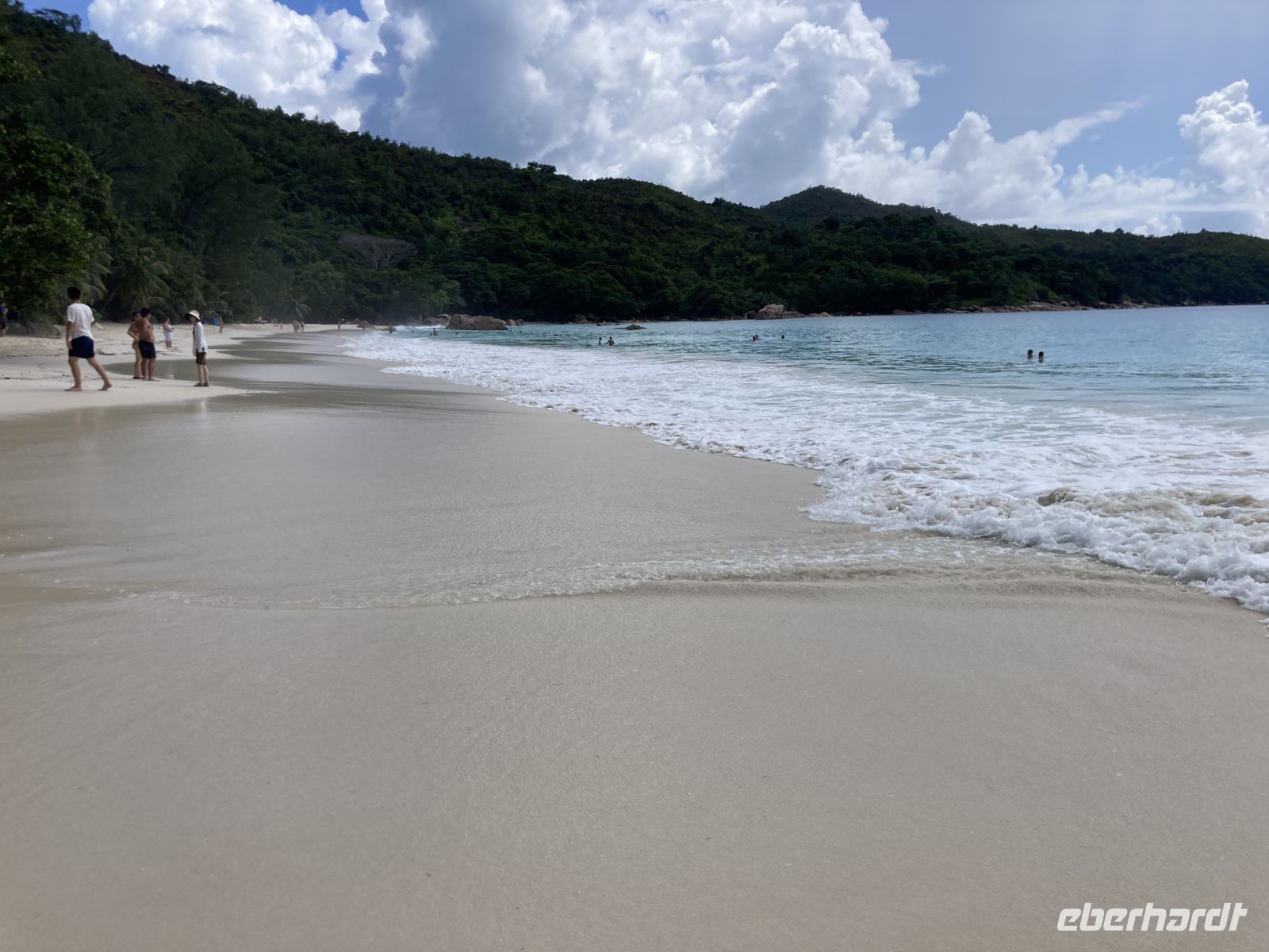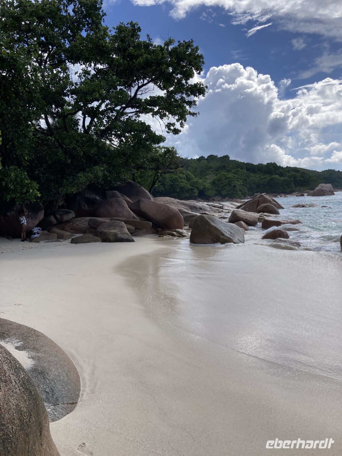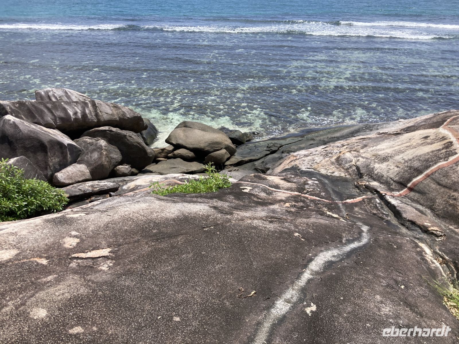 Nach dem üppigen Frühstücksbuffet geht es mit Cyril auf Erkundungstour. Im Vallée de Mai, ein Naturschutzgebiet, welches zum UNSECO-Weltnaturerbe zählt, wandern wir gemütlich durch den Palmenwald. Seinen Namen hat das Tal seiner ehemaligen Besitzerin zu verdanken, die den schönen Vornamen Mai trug. In dem Areal können wir nochmals intensiv die Coco de Mer begutachten. Und sogar einmal die Früchte anheben. Bis zu drei Samen kann eine Frucht produzieren. Und die Samen gehören mit bis zu 25 Kilo auch zu den schwersten der Welt. Aber die Coco de Mer ist ohnehin eine Pflanze der Superlative, schließlich kann sie auch bis zu 300 Jahre als werden. Gerne hätten wir noch ein weiteres Wahrzeichen der Seychellen gesehen - den schwarzen Papagei. Hören konnten wir ihn, leider war er nicht in Fotolaune. Nach unser Wanderung in mitten der Insel geht es nun in Richtung Nordosten. Schließlich ist Praslin auch für seine schönen Strände bekannt und beliebt. Damit wir für das Schwimmen gut gestärkt sind, legen wir noch einen Stopp für das Mittagessen ein. Und dann endlich die Anse Lazio. Diese Bucht zählt zu den schönsten der Seychellen und für einige ist sie die schönste der Welt. Es lohnt nicht nur der Sprung in das nicht wirklich kühle Nass, sondern auch ein Spaziergang zu den besonderen Felsformationen. Hier finden wir dann auch die Fotomotive, für die Strände der Seychellen bekannt sind.