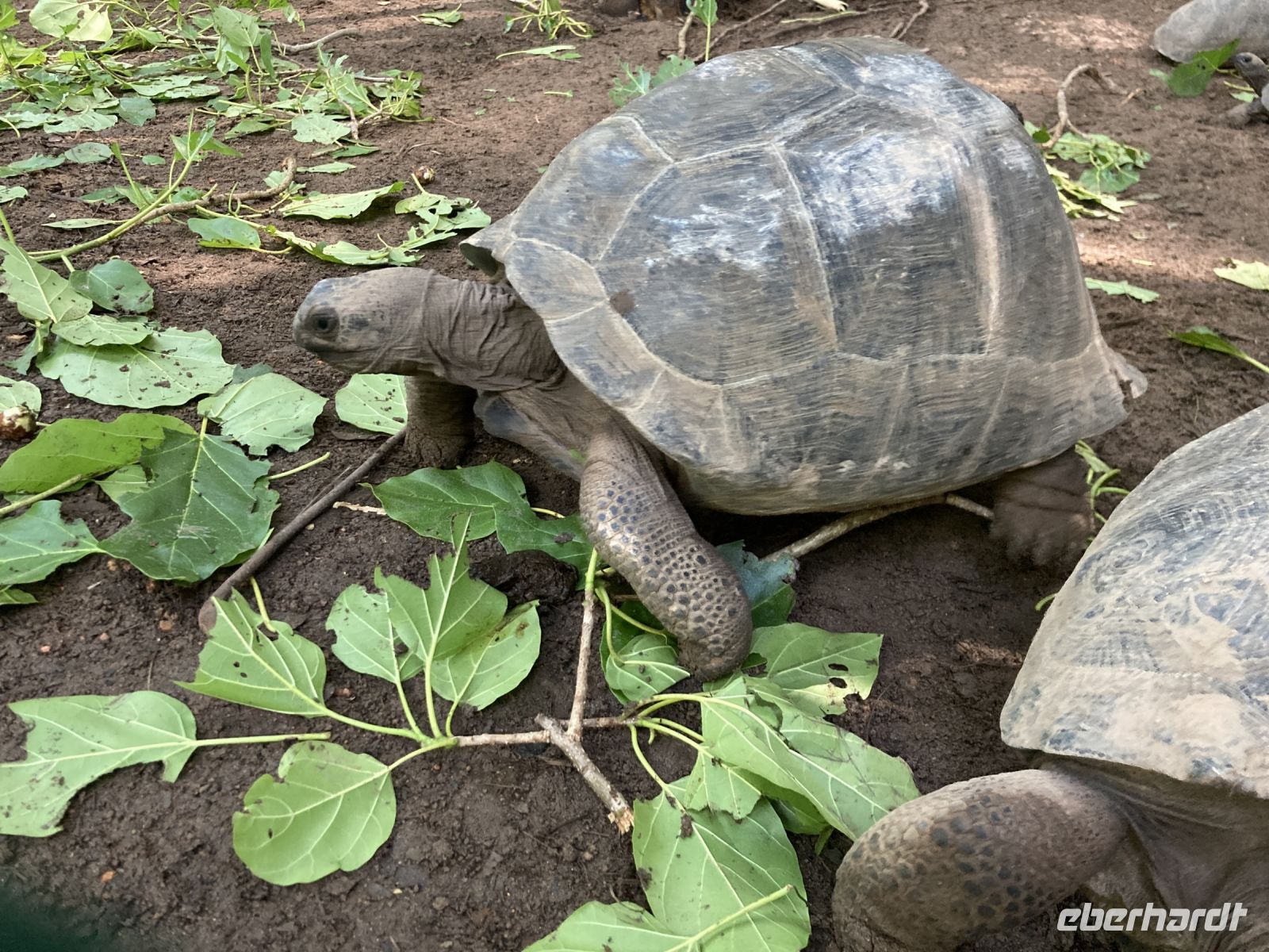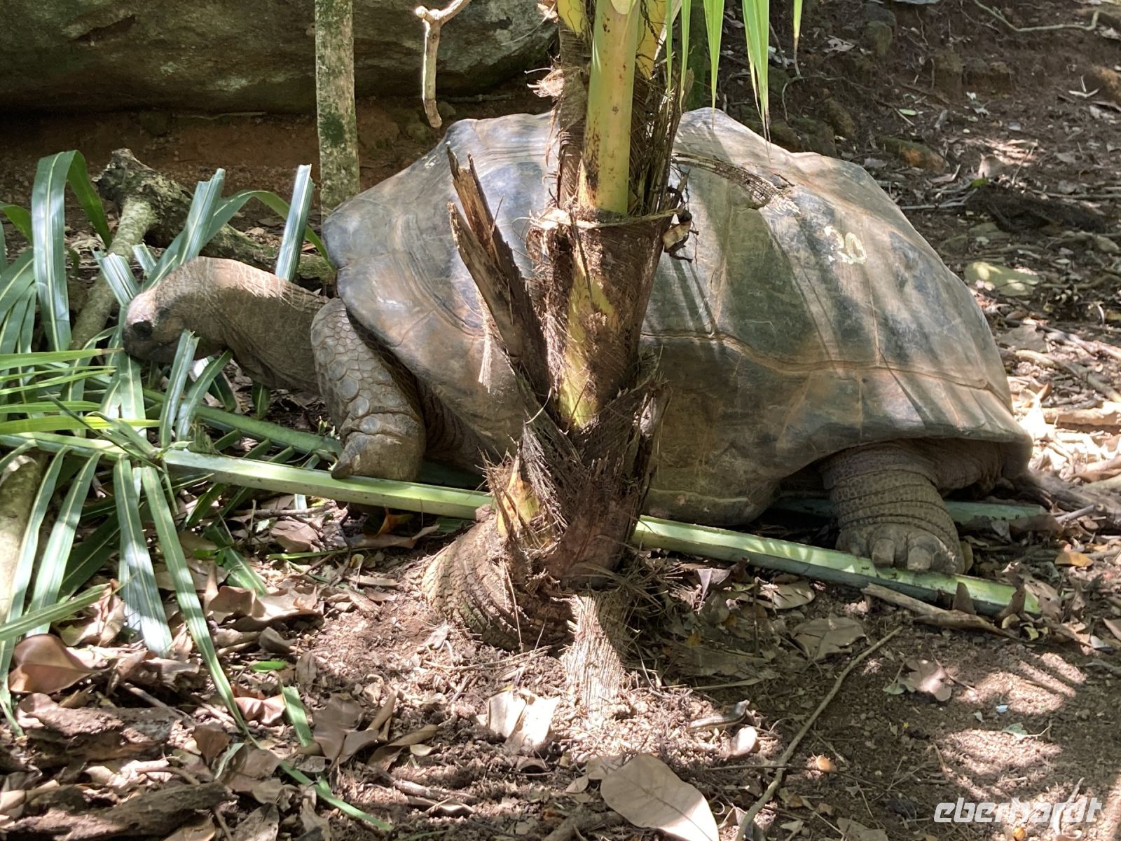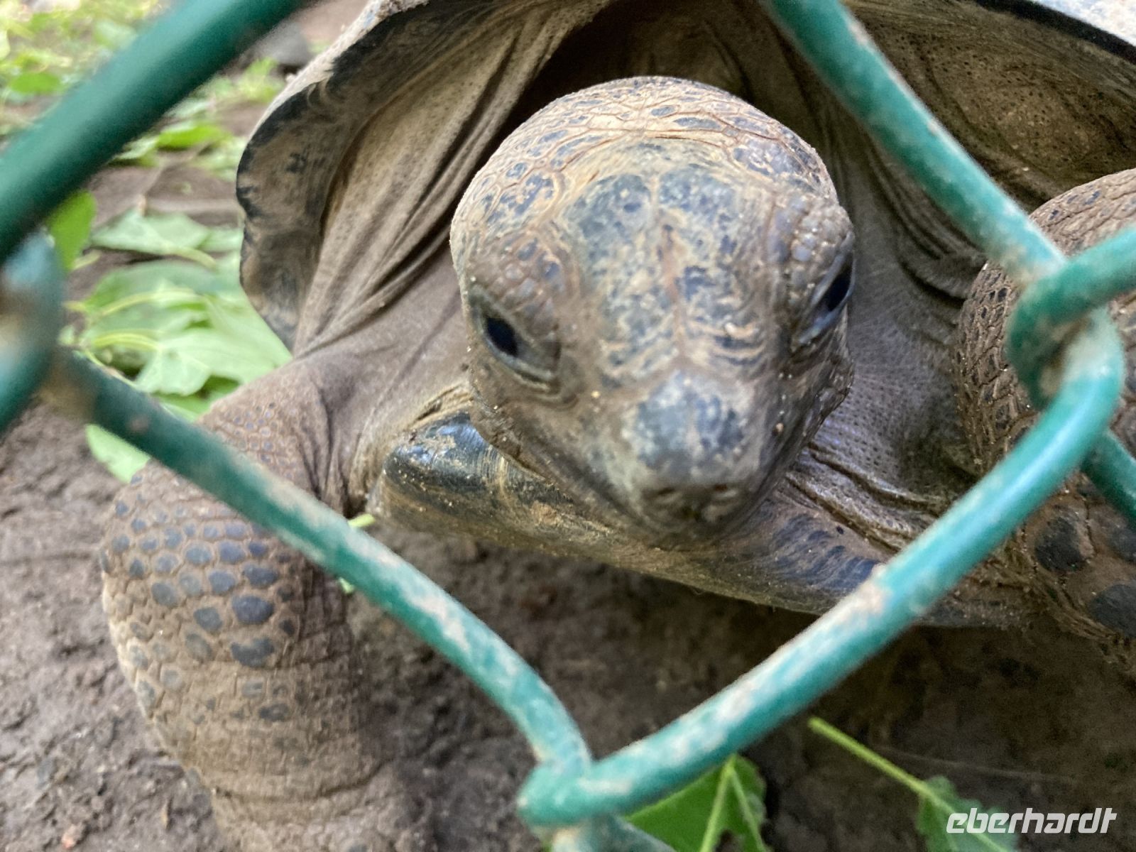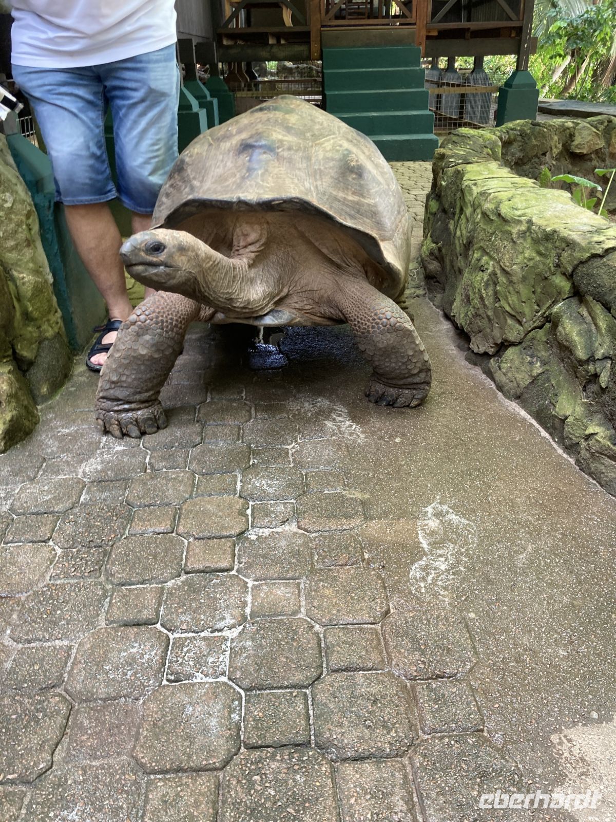 Ausgeruht und gestärkt wollen wir heute gleich zwei weitere Inseln erkunden. Aber nicht nur das: Unser Glasbodenboot ermöglicht uns schon auf der Fahrt einen Blick in die Fischwelt im National Park. Das macht auf jeden Fall Lust, auch die Schnorchel auszupacken. Aber zunächst geht es auf die Insel Moyenne. Hier bietet sich unserem Auge schon gleich nachdem wir wieder festen Boden unter den Füßen haben das, was wir von den Seychellen erwarten: weißer Sand, Palme am Strand und Granitfelsen. Ohne Photoshop - einfach so! Als wir dann auch noch den ersten Landschildkröten begegnen, hätte wir eigentlich die Reise beenden können. Schließlich können wir an zwei wesentlichen Höhepunkte einen Haken machen. Doch damit geben wir uns noch nicht zufrieden. Schließlich haben die Seychellen noch viel mehr zu bieten. Die Insel Moyenne liegt eigentlich nur fünf Kilometer von Victoria entfernt und doch sind wir der quirligen Hauptstadt komplett entrückt. Da wir sehr zeitig auf der Insel ankommen, sind wir tatsächlich das erste Boot und damit die ersten Besucher. Brendon Grimshaw, englischer Journalist, erwarb die Insel 1962 und schuf mit dem Einheimischen René Antoine Lafortune eine grüne Idylle und eine Heimstätte zahlreicher Landschildkröten. Während der Kolonialzeit war die Insel komplett abholzt worden. Grimshaw und Lafortune pflanzten rund 40 endemische Arten, darunter die Coco de Mer, wieder auf der Insel an. Heute ist es schwer vorstellbar, dass es hier nicht grün gewesen sein soll. Gemeinsam mit Cyril erkunden wir die Pflanzenwelt und nehmen natürlich Nahkontakt zu den Schildkröten auf. Langsam zieht es uns dann aber doch auf unser Boot, schließlich wurde uns ja noch ein Sprung ins Wasser vor dem Mittagessen in Aussicht gestellt. Vor Sainte Anne gehen wir nicht nur vor Anker, sondern auch von Bord. Und dies ganz freiwillig. Das Wasser ist unglaublich warm und unterschiedliche Fische können wir auch sehen. Langsam setzt der kleine Hunger ein, aber Abhilfe ist schon in Sicht. Wir gehen vor der Île au Cerf an Land, wo wir Teil eines sonntäglichen Rituals werden: Barbecue am Strand. Einheimische und Touristen essen gemeinsam in einem der typischen Restaurants. Wobei in einem Restaurant nicht zutrifft. Schließlich handelt es sich um eine echte Freiluftveranstaltung einschließlich Füße im Sand. Herrlich! Bevor wir unseren Weg zur Hauptinsel antreten, bleibt uns noch Zeit zum Schwimmen. Ein Missgeschick lässt noch einen Abstecher in das Krankenhaus von Victoria notwendig werden. Erfreulicherweise hat die Hauptinsel eine gute Gesundheitsversorgung und unsere Reisegruppe bleibt vollzählig. Das Abendessen nehmen wir wieder froh gelaunt im Hotel ein. Was für ein toller Reiseauftakt.