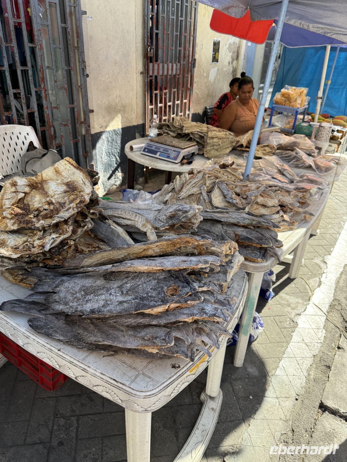 Zu Fuß führt uns unsere Reiseleiterin weiter zum Standort des bekannten Sir Selwyn Selwyn-Clarke Marktes. Dieser Markt ist wegen Renovierungen aktuell nicht mehr an seinem gewohnten Platz, aber auch auf den umliegenden Straßen entdecken wir zahlreiche Marktstände, welche neben Gemüse und Fisch auch zahlreiche tropische Früchte verkaufen. Darunter auch die von den Seychellos sehr beliebte Brotfrucht. Wir lassen es uns nicht nehmen, diese zu probieren – sie wird hier in getrockneter, leicht frittiert Variante als Snack angeboten. Überraschenderweise erinnert ihr Geschmack ein wenig an unsere Pommes. Es gibt sogar ein seychellisches Sprichwort: „Wer von der Brotfrucht isst, kommt immer wieder.“ Mal sehen, ob das auch auf uns zutrifft.