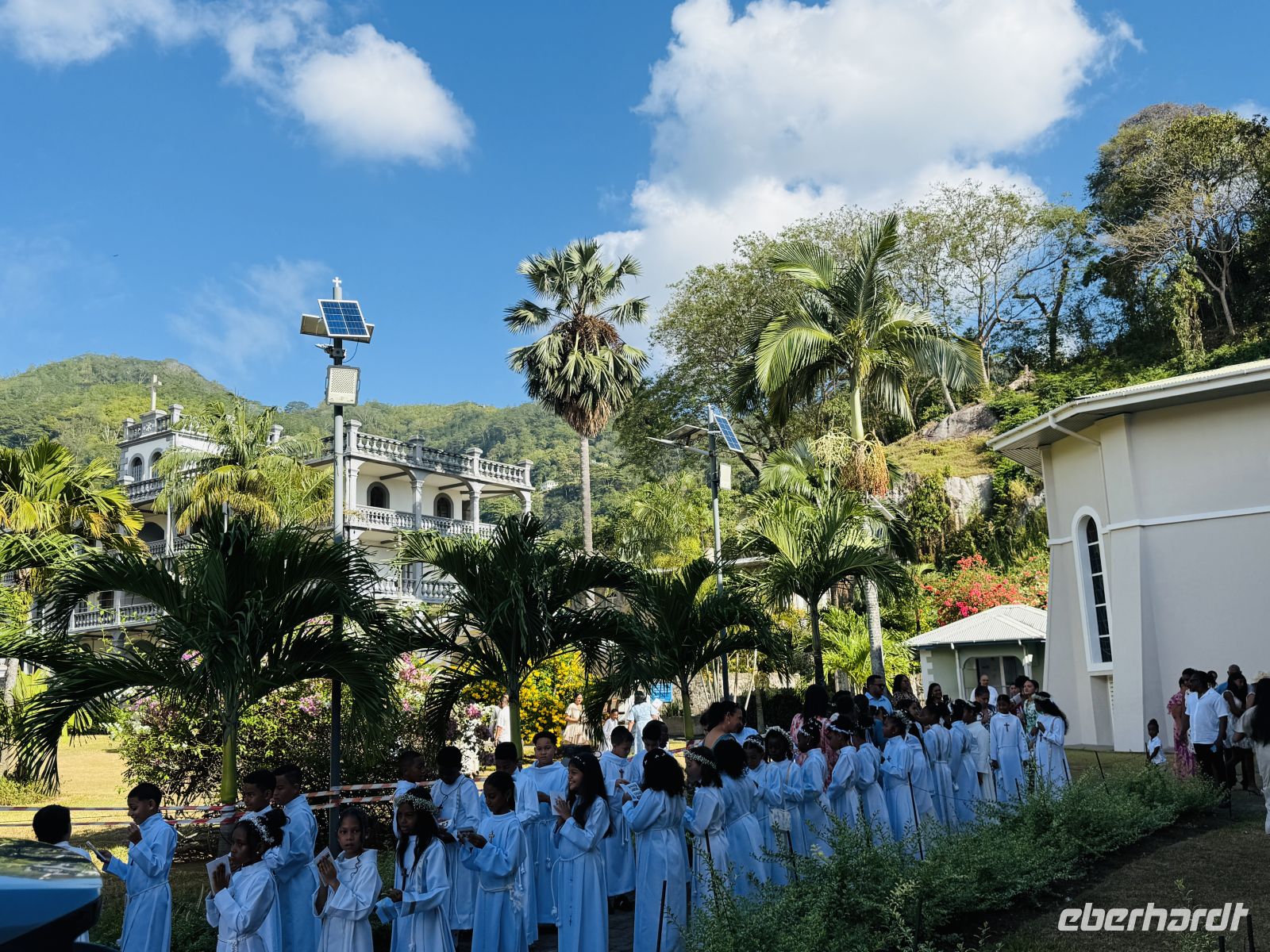 Unser Weg führt uns weiter zur Kathedrale der Unbefleckten Empfängnis mitten in Victoria. Einen kurzen Blick ins Innere erhaschen wir, doch wir können nicht lange bleiben: Gerade an diesem Tag haben viele Kinder der Seychellen ihre Kommunion, und in ihren festlichen Gewändern stehen sie neben der Kirche und warten darauf, einzuziehen.