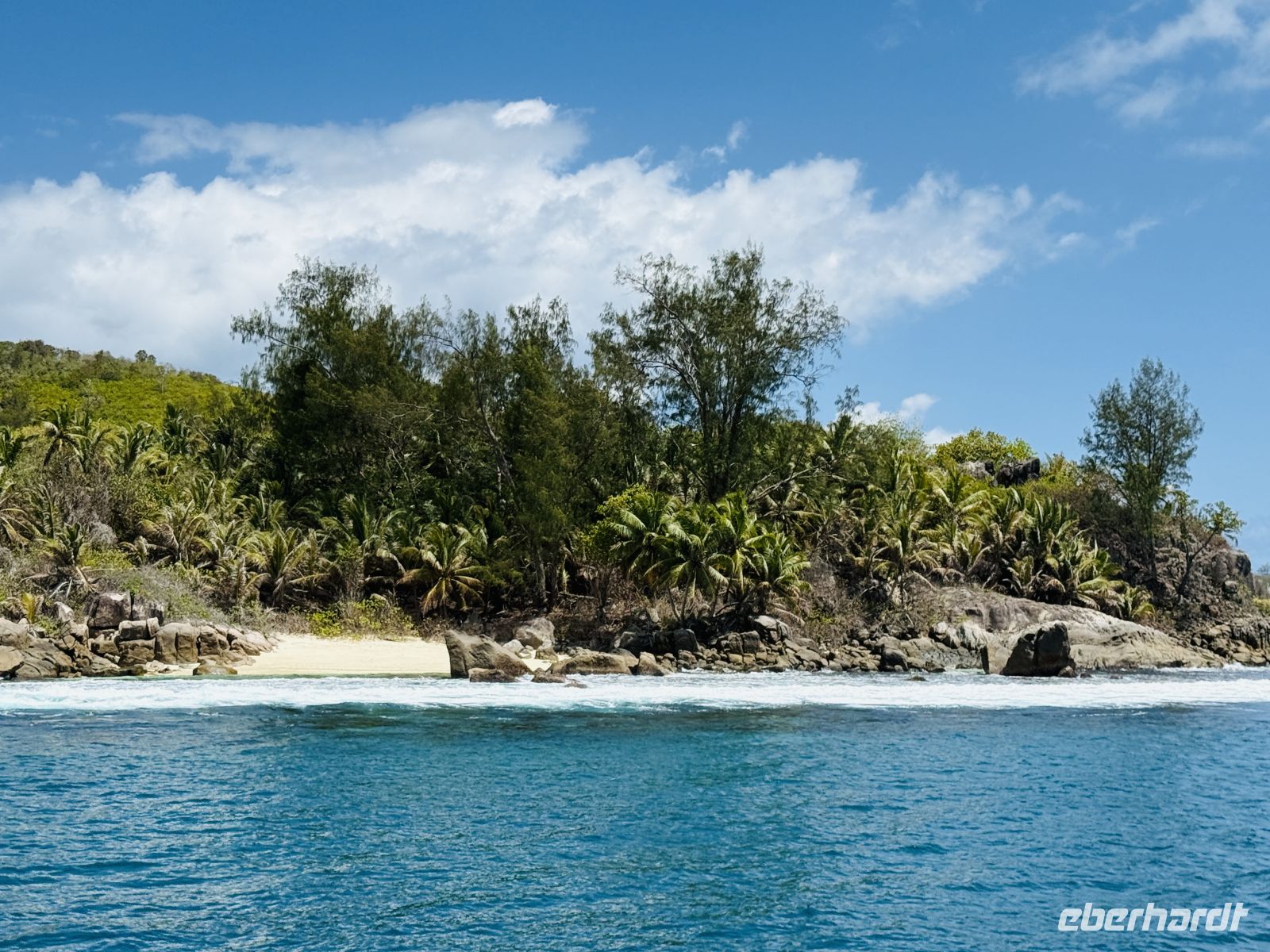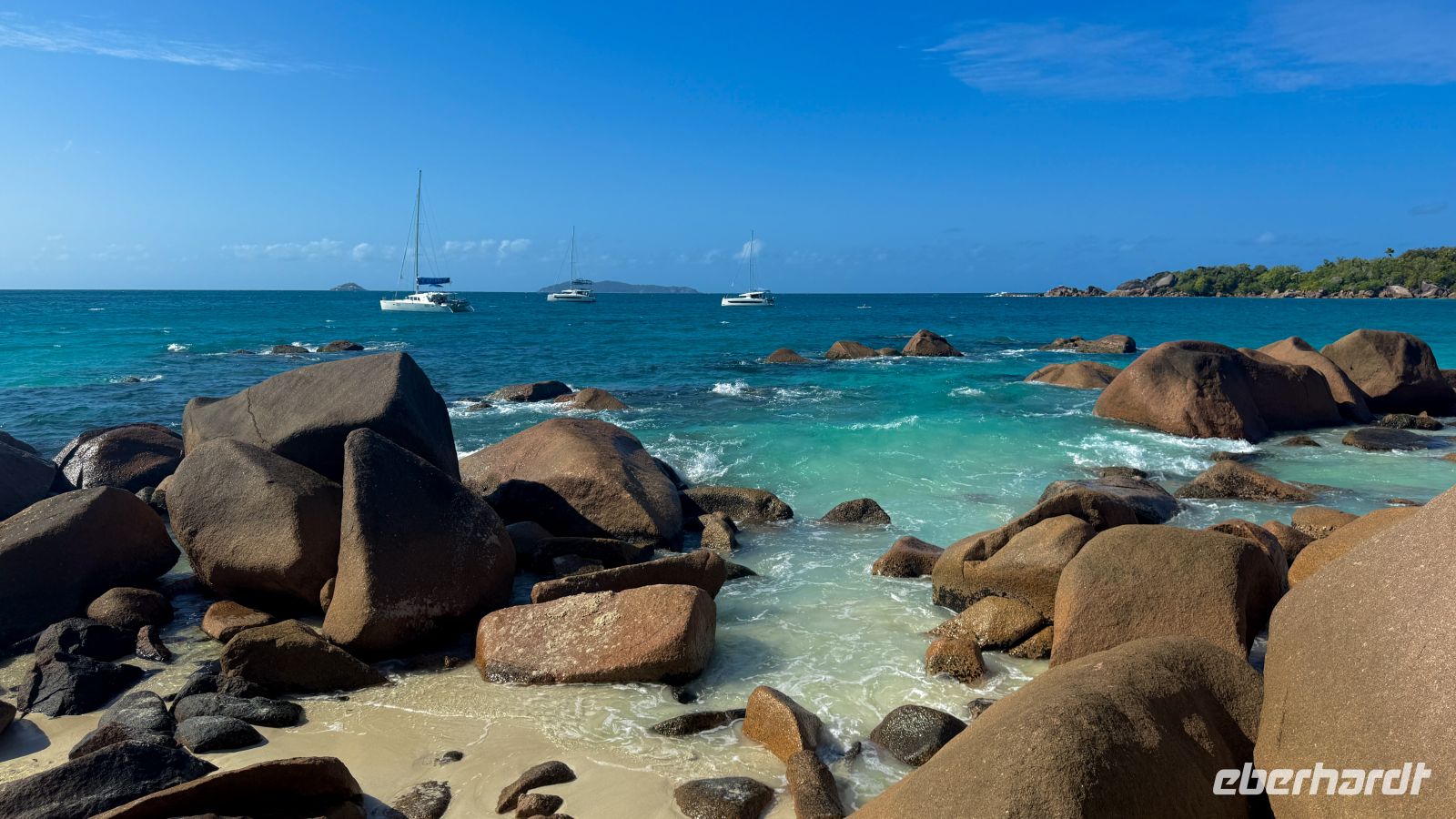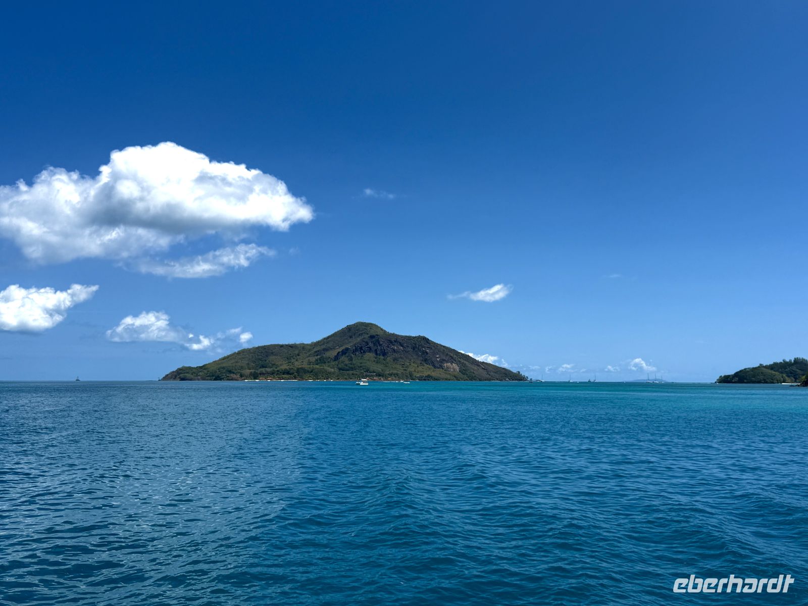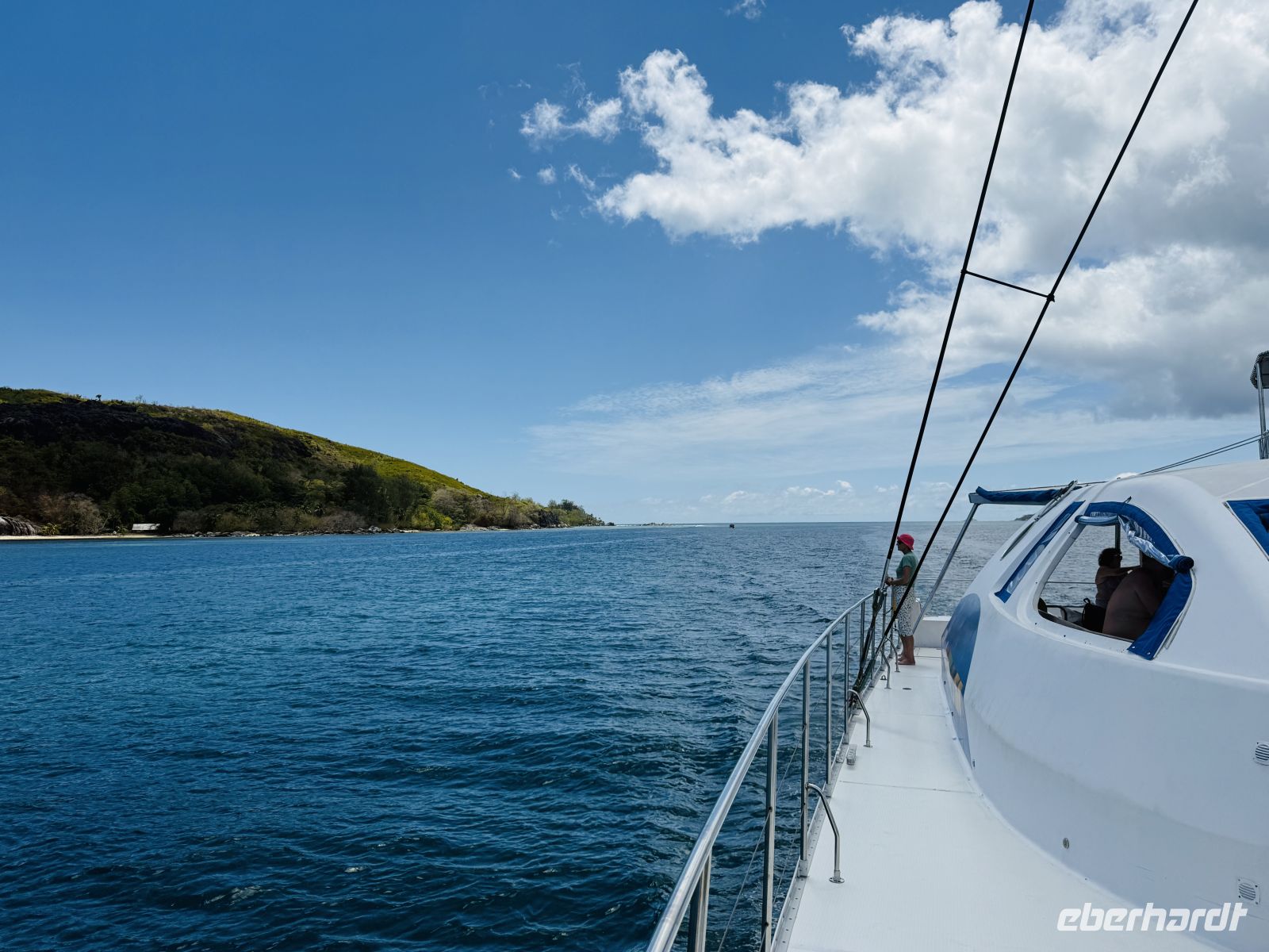Heute wartet das letzte Highlight unserer Reise auf uns: ein Ausflug auf Pralins Nachbarinsel La Digue. Dabei nehmen wir nicht wie die meisten Gäste die große Fähre, sondern wir haben einem nur für unsere Eberhardt-Gruppe gecharterten Katamaran.