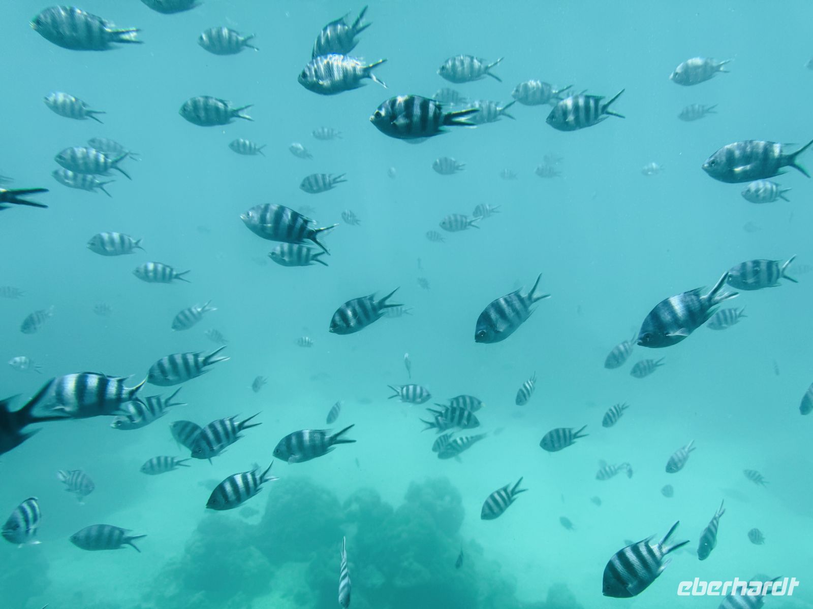 Am Anleger erwartet uns unser Reiseleiter Cyrill, der uns von nun an für die nächsten Tage begleiten wird. Schon während der Bootstour ergeben sich wieder einmal wunderschöne Fotomotive: türkisfarbenes Wasser, grüne Hügel im Hintergrund und immer wieder kleine Buchten entlang der Küste. Wir fahren zunächst an der Insel Île au Cerf vorbei, bevor wir auf ein Glasbodenboot umsteigen. Unter Wasser sehen wir Schwärme von Zebrafischen, Clownfischen und Doktorfischen unter uns vorbeiziehen. Auch verschiedene Korallenarten sind gut zu erkennen. Zurück an Bord machen wir uns bereit zum Schnorcheln. Während wir im Wasser unterwegs sind, bereitet die Crew das Mittagessen vor. Es gibt frischen Fisch, Salate und Obst. Mit Blick auf das Meer und begleitet von etwas Livemusik der Crew schmeckt es besonders gut.