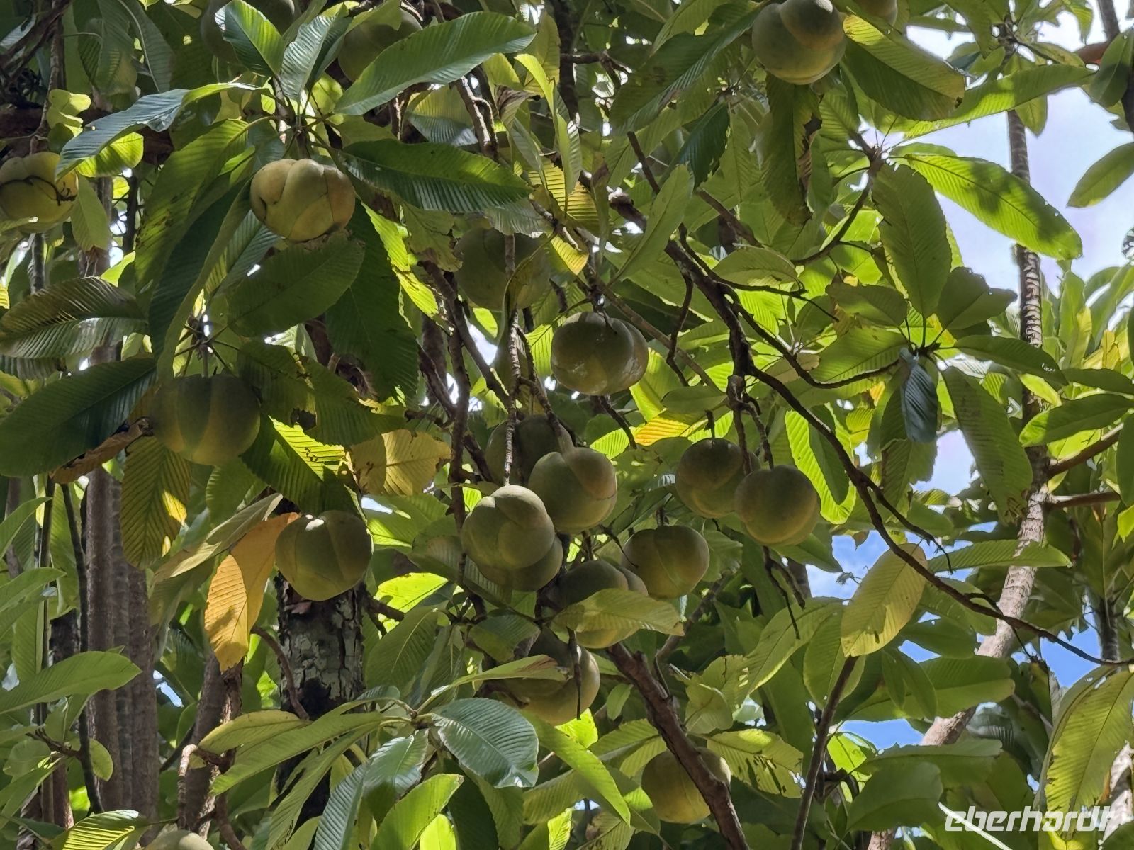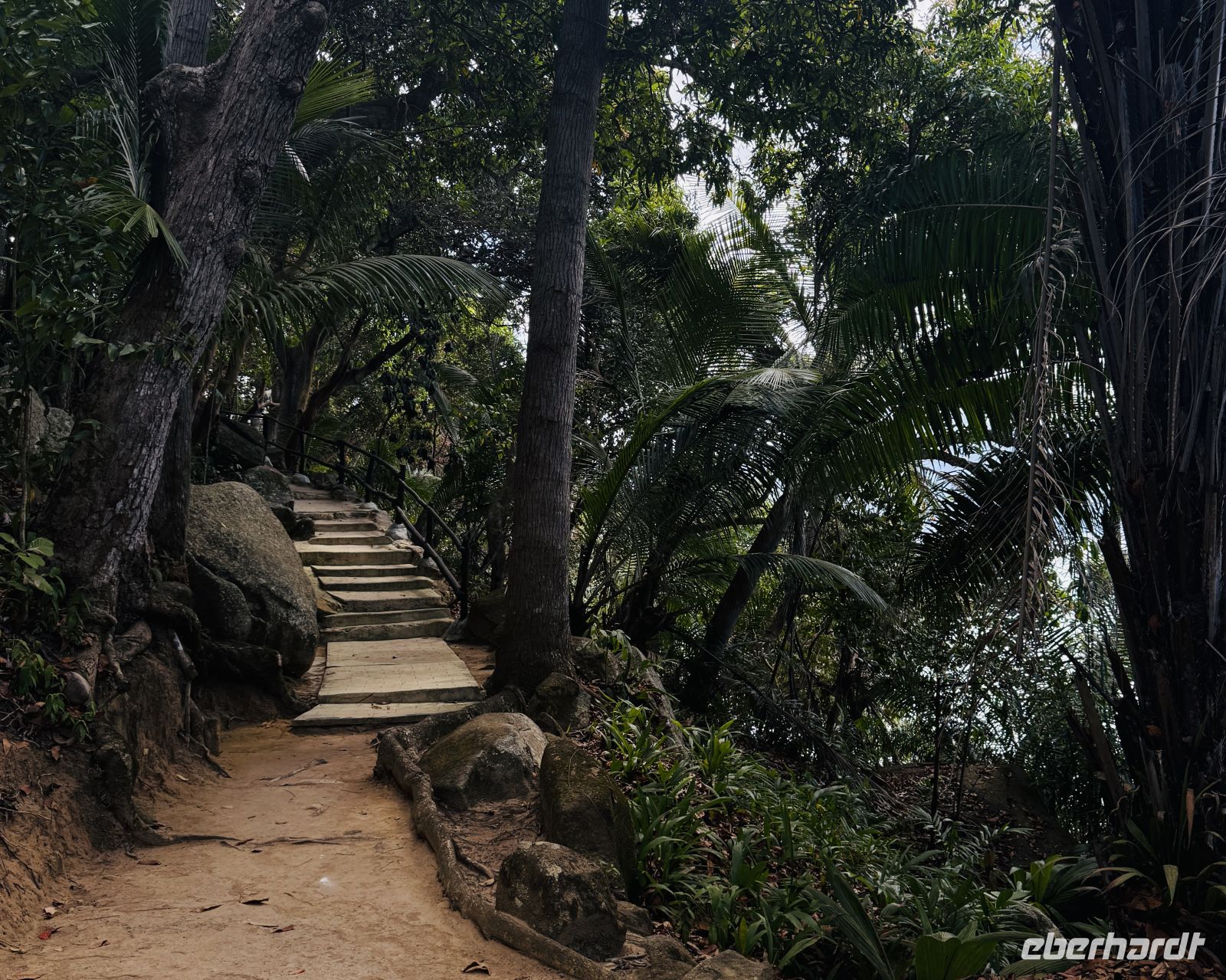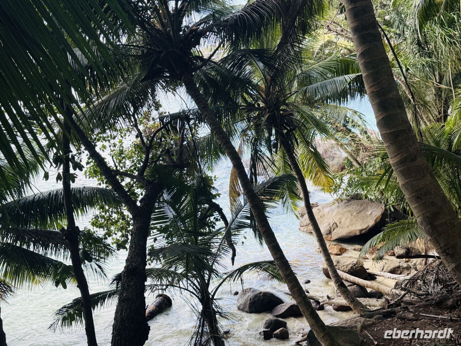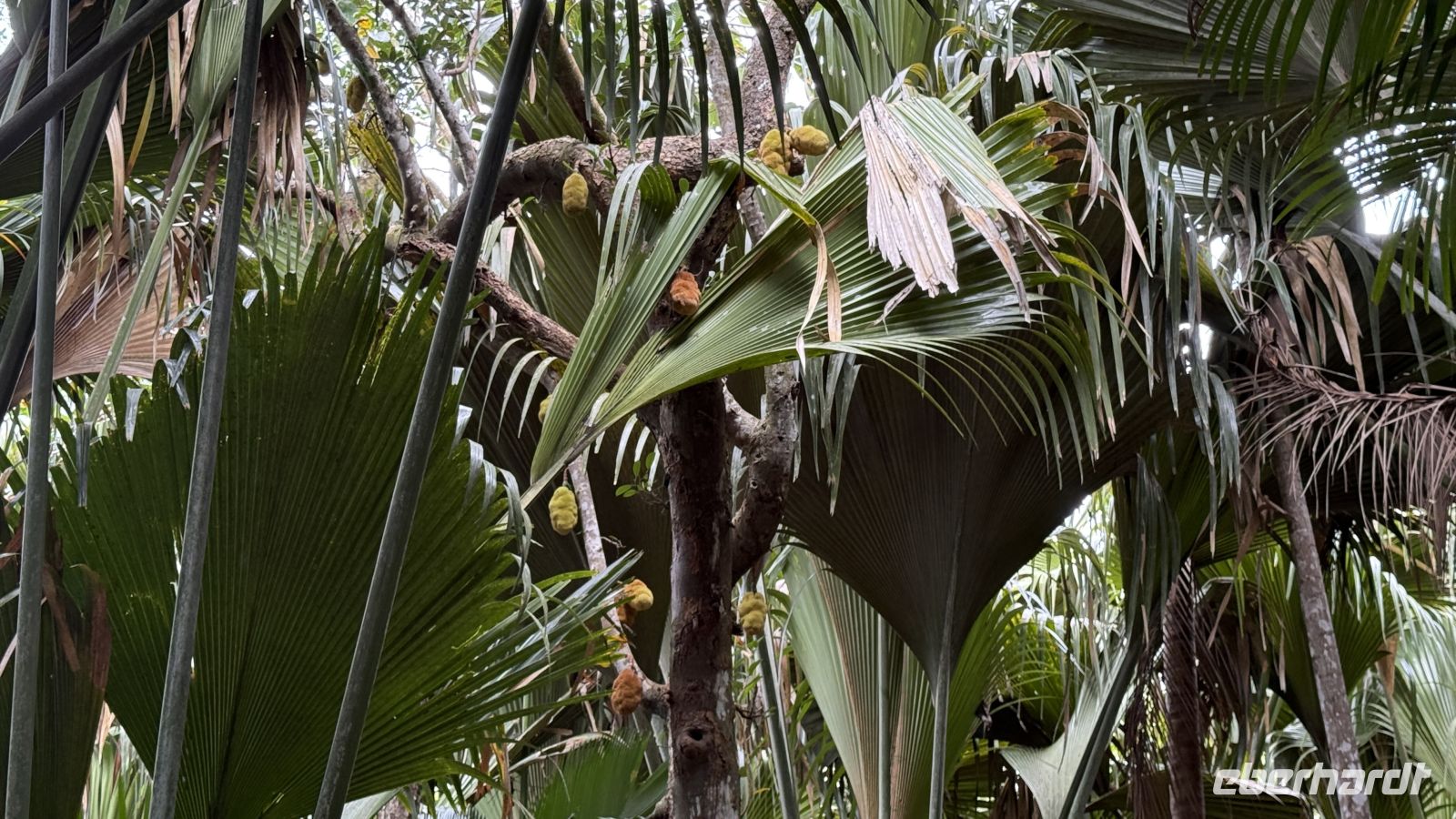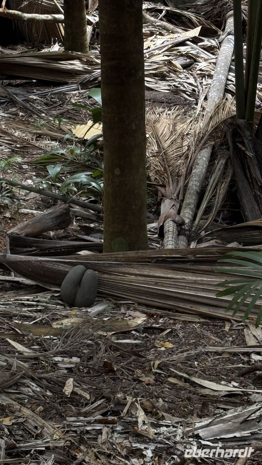 Wir bewegen uns auf verschiedenen Pfaden durch das dichte Grün und Cyrill erklärt uns einiges Wissenswertes über die Coco de Mer. Die mächtigen Palmenblätter rauschen im Wind und lassen ab und an einen Sonnenstrahl durchblitzen.