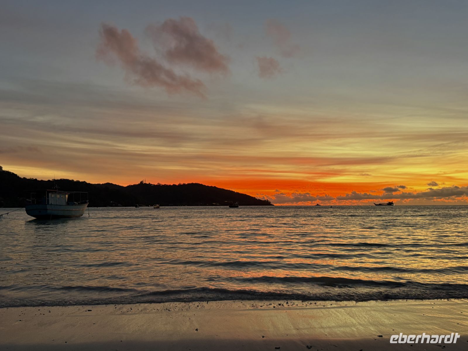 Pünktlich zum Sonnenuntergang treffen wir uns wieder am Strand. Mit einem von Leon spendierten Drink – natürlich mit Takamaka-Rum – genießen wir den Himmel, der sich langsam in kräftige Rot- und Orangetöne färbt.