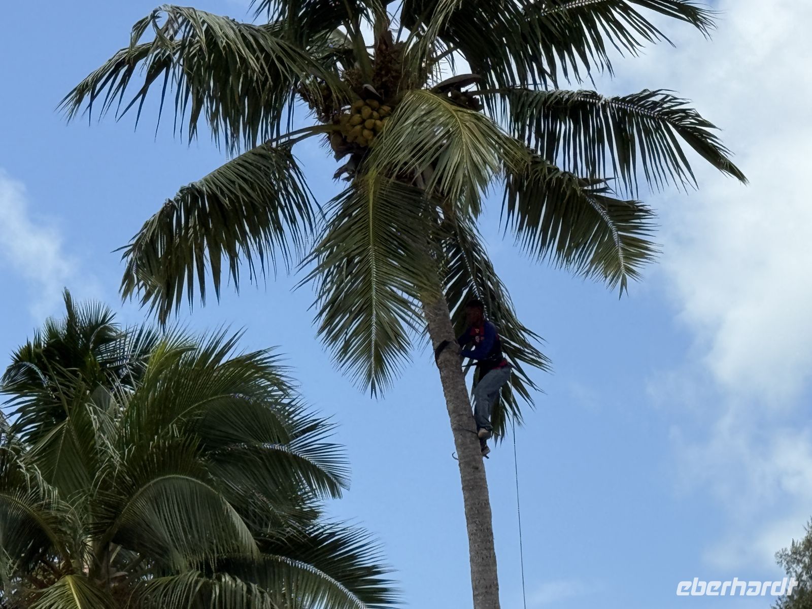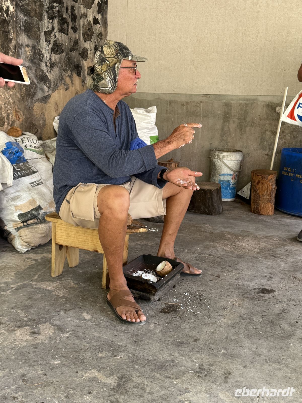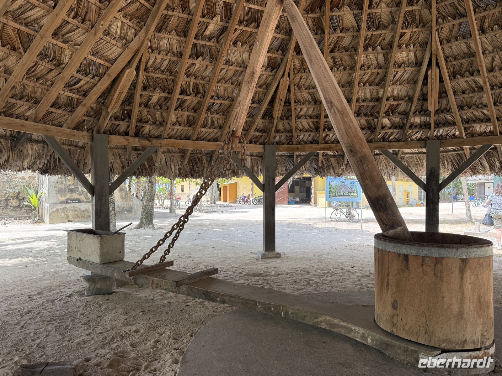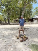 Cyrill zeigt uns, wie früher Kokosnüsse geerntet und zu Copra verarbeitet wurden. Mit geübten Handgriffen öffnet er eine Kokosnuss und erklärt die einzelnen Schritte der Weiterverarbeitung an den Verschiedenen Stationen wie der Ölpresse oder der Raspel. Was wäre denn eine solche Vorführung ohne einmal das frisch duftende Kokosnusswasser zu probieren?