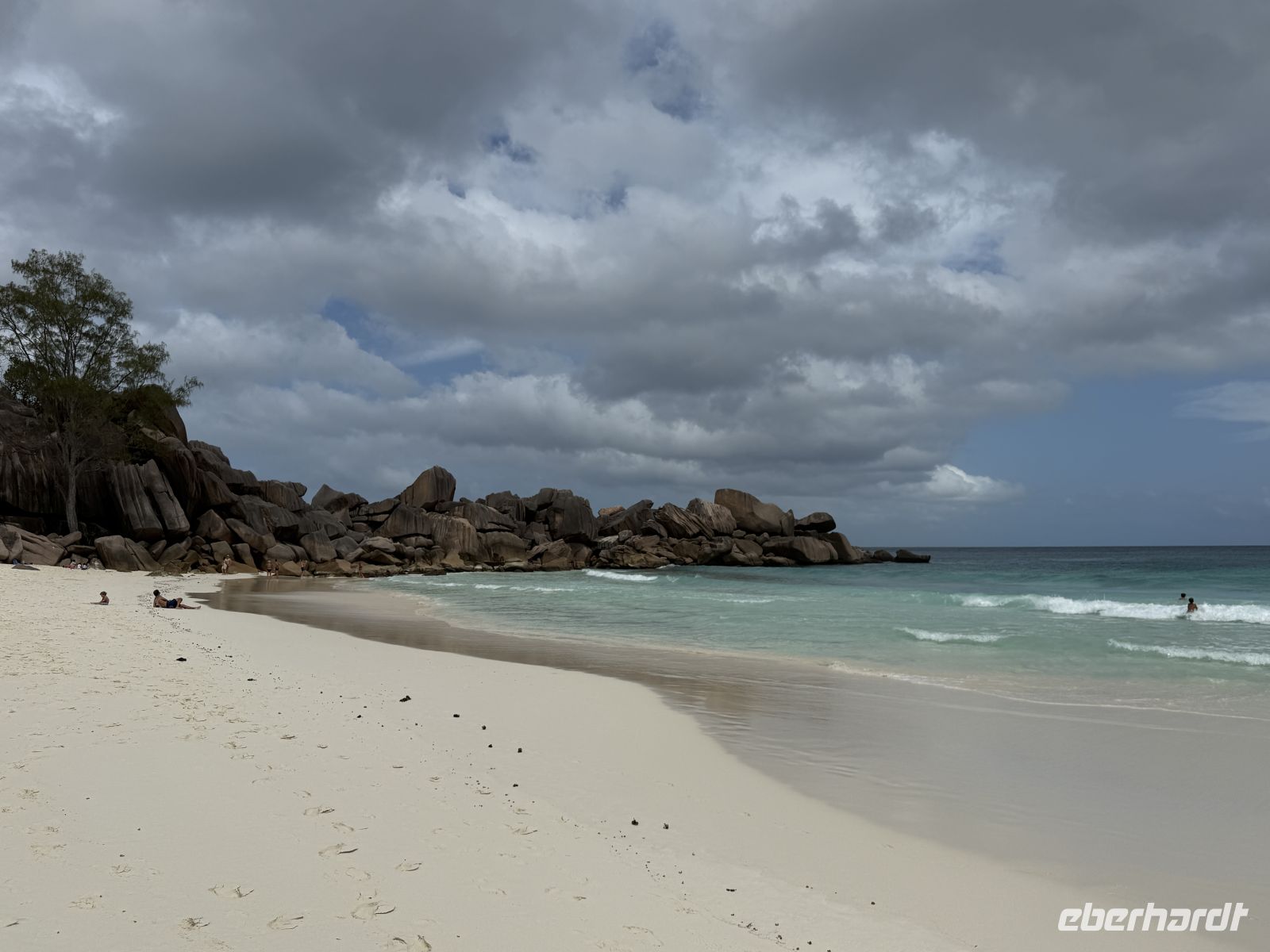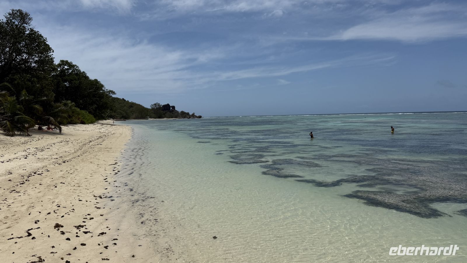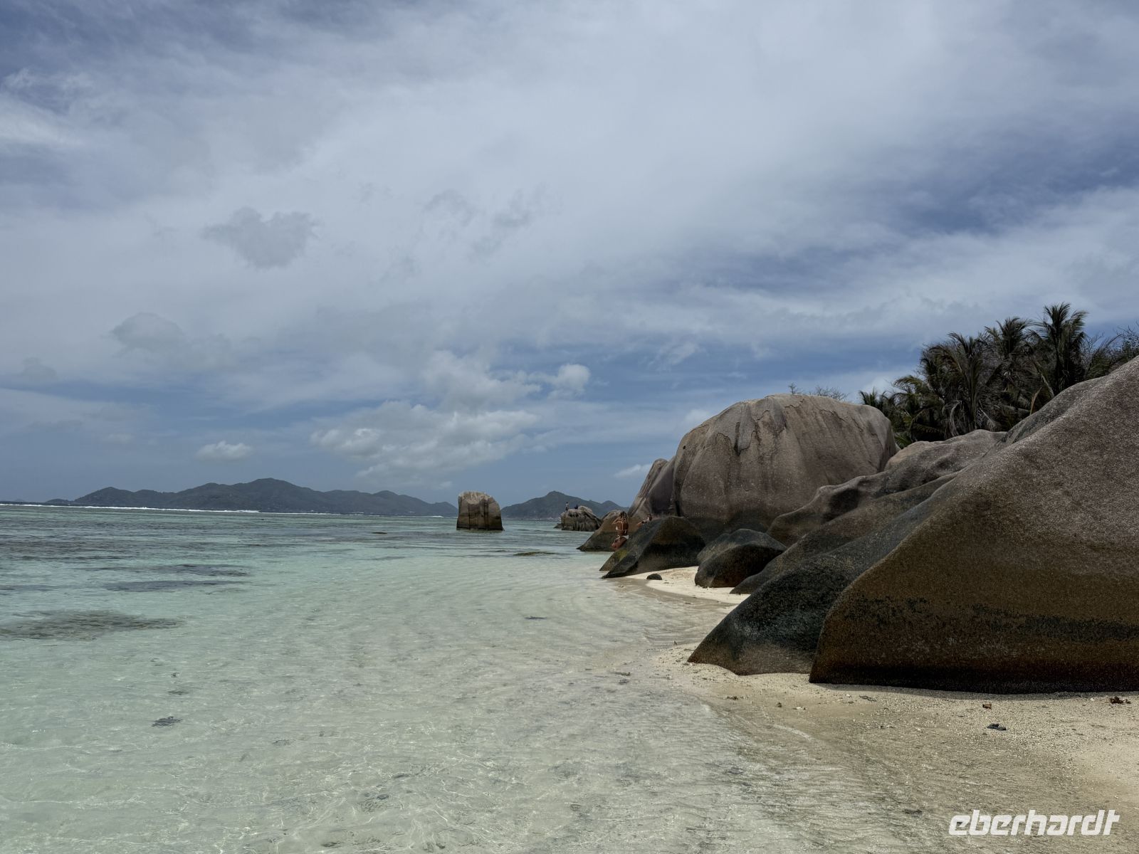 Auch wenn die Gezeiten heute nicht ideal sind und wir den Strand bei Ebbe erleben, beeindruckt die Kulisse dennoch. Die für die Seychellen typischen Granitformationen und das flache, klare Wasser machen den Strand zu einem besonderen Ort. Einige von uns nutzen die Zeit für eine Erfrischung im Wasser, während andere die verschiedenen Strandabschnitte erkunden und nach den schönsten Fotomotiven suchen.
