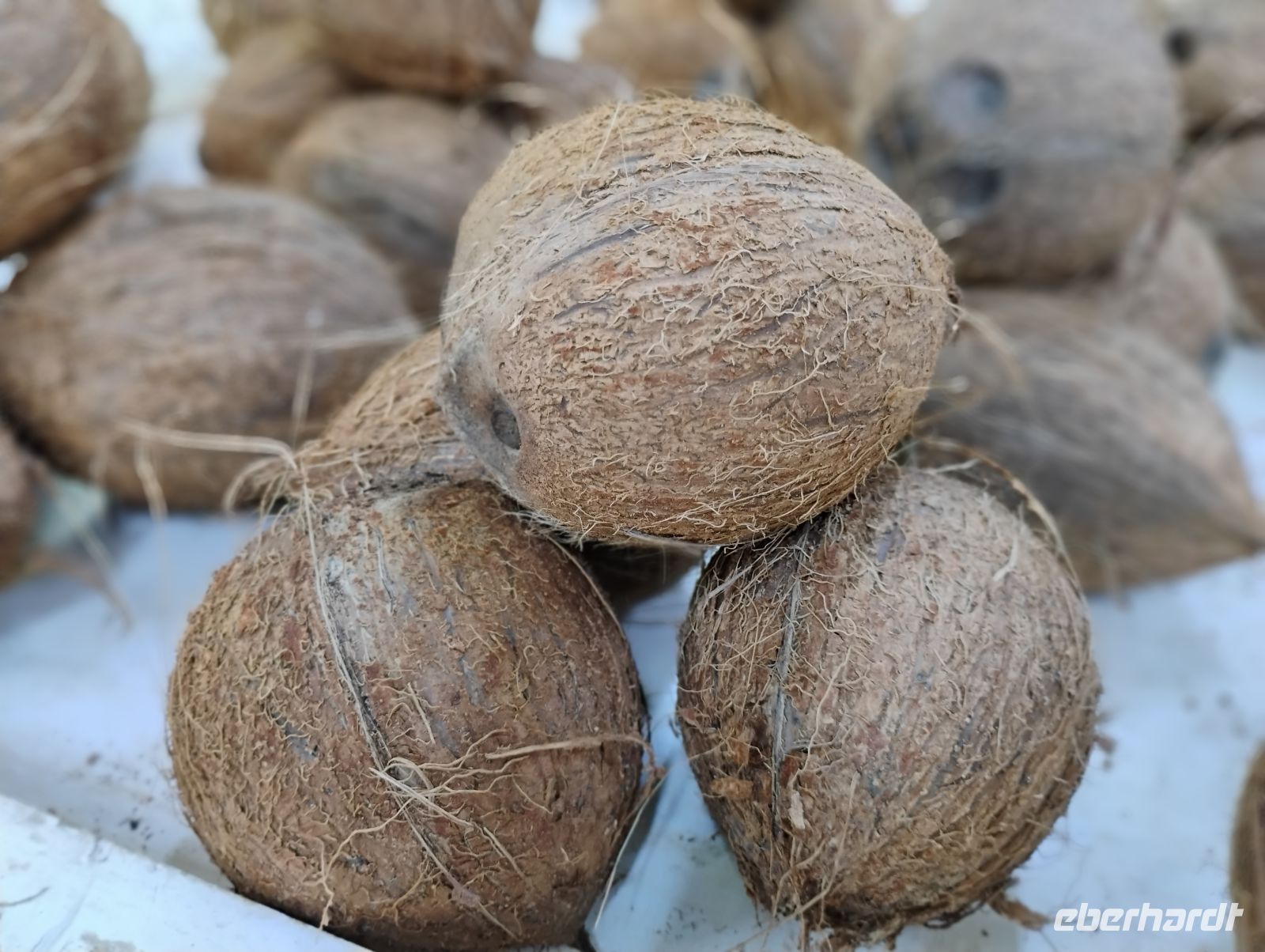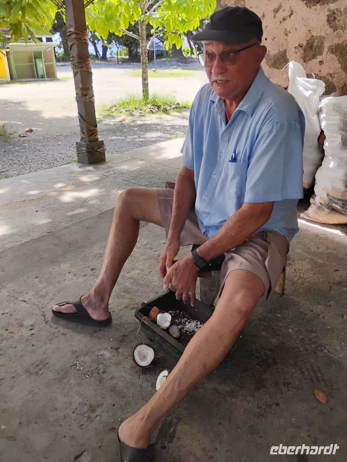 Nach dem Mittagessen erhalten wir bei einem kurzen Einblick noch interessante Informationen zur traditionellen Nutzung der Kokosnuss, die früher eine wichtige Rolle auf der Insel spielte.