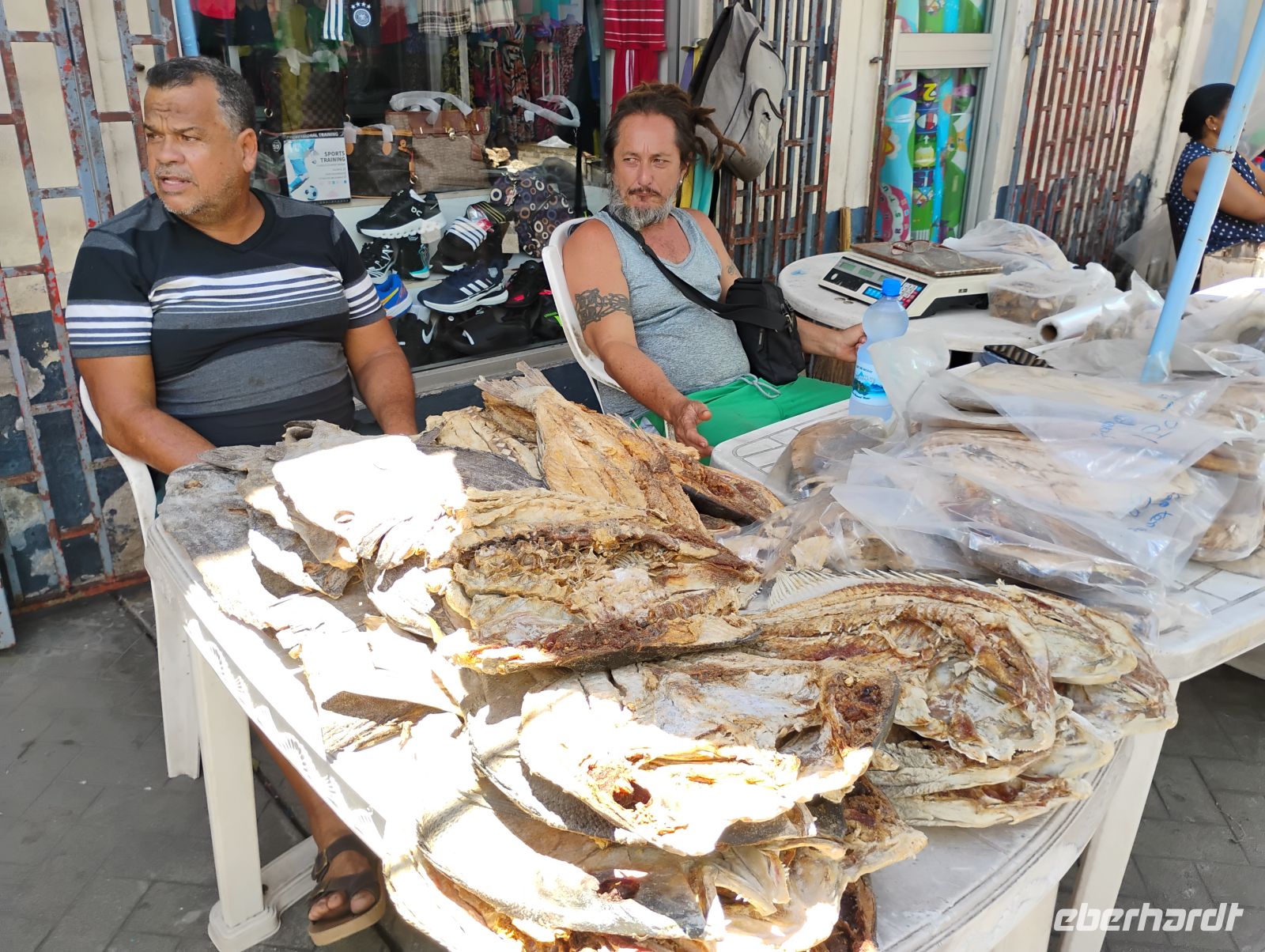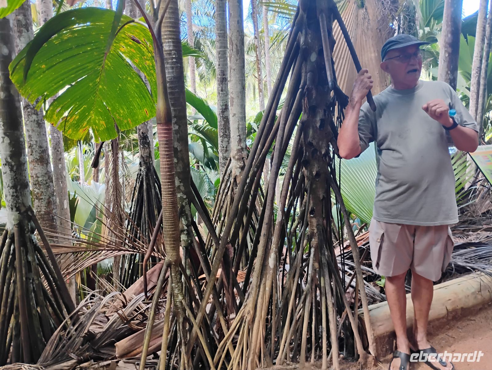 Auch die Pflanzenwelt ist hier besonders interessant: Wir sehen unter anderem Zimt- und Nelkenbäume und probieren direkt vom Baum. Auch die Blätter des Zimtbaums haben ein eigenes Aroma und finden in der Küche Verwendung. Besonders auffällig ist ein sogenannter Drachenblutbaum. Cyril erklärt, dass aus dessen Stamm ein rötlicher Saft austritt, der früher unter anderem als Farbstoff und für Lacke verwendet wurde. Rund um die Anlage ranken sich zudem einige Geschichten und Legenden - unser Reiseleiter erzählt, dass diesem Ort von Einheimischen bis heute eine besondere Atmosphäre nachgesagt wird.