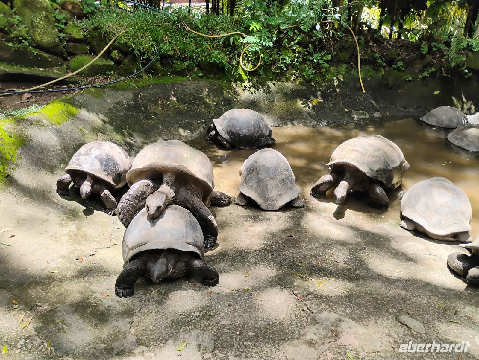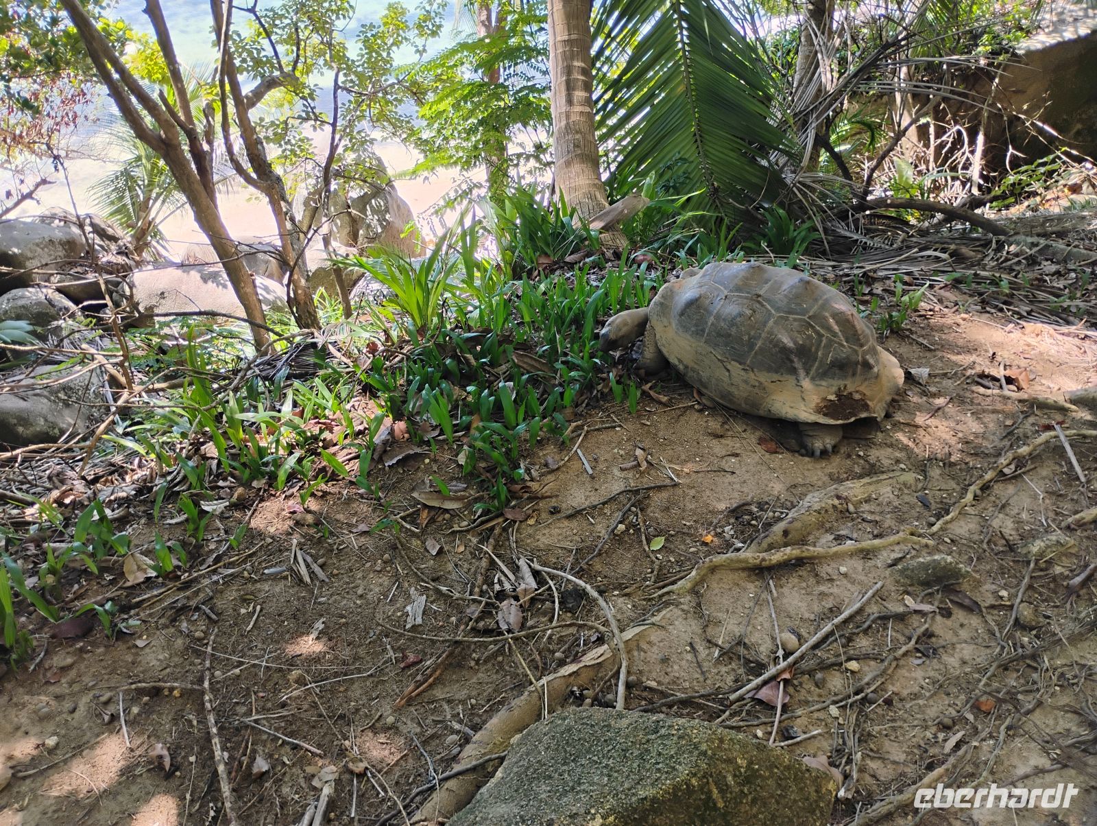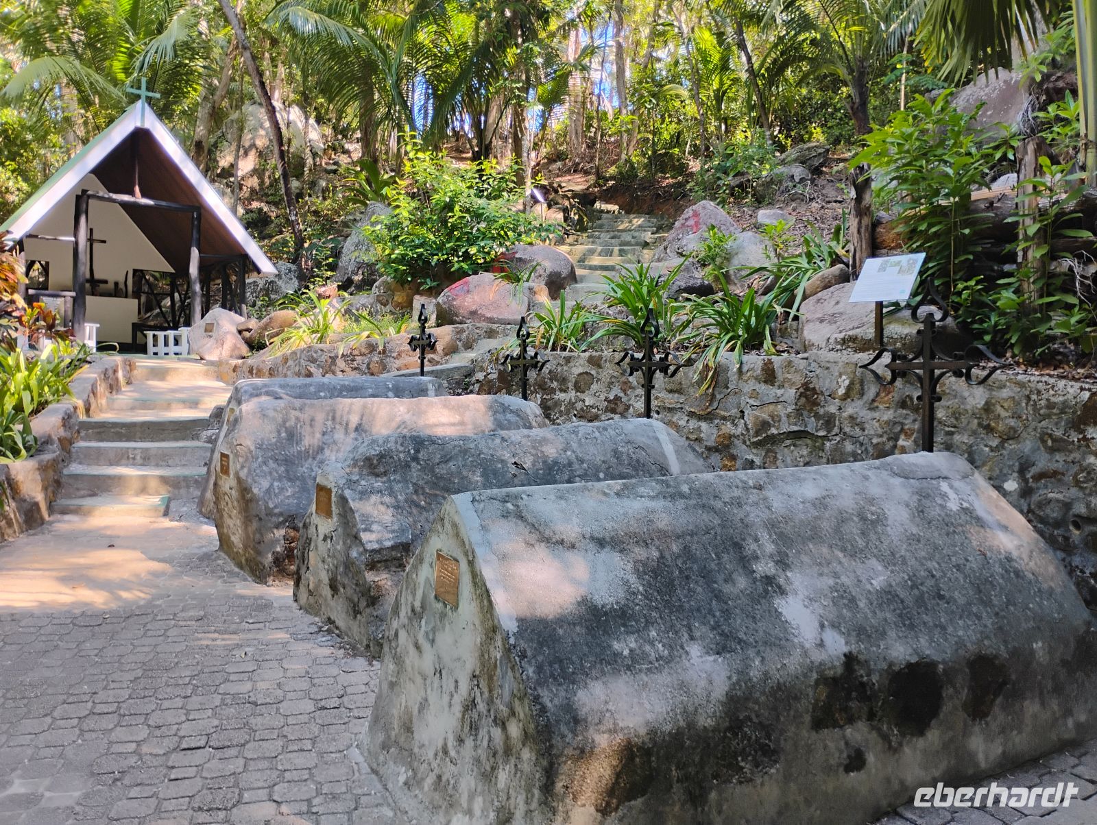 Der Weg führt durch tropische Vegetation hinauf zu einem Aussichtspunkt und weiter bis zur Grabstätte Grimshaws. Unterwegs begegnen uns immer wieder freilaufende Aldabra-Riesenschildkröten, die sich hier frei bewegen. Dabei erfahren wir auch Interessantes über die Pflanzenwelt. Besonders auffällig ist ein Baum mit leuchtend roten Samen (Adenanthera pavonina). Diese gelten als Glücksbringer. Unser Reiseleiter erklärt, dass man sie traditionell im Geldbeutel aufbewahrt, damit das Geld nicht ausgeht.