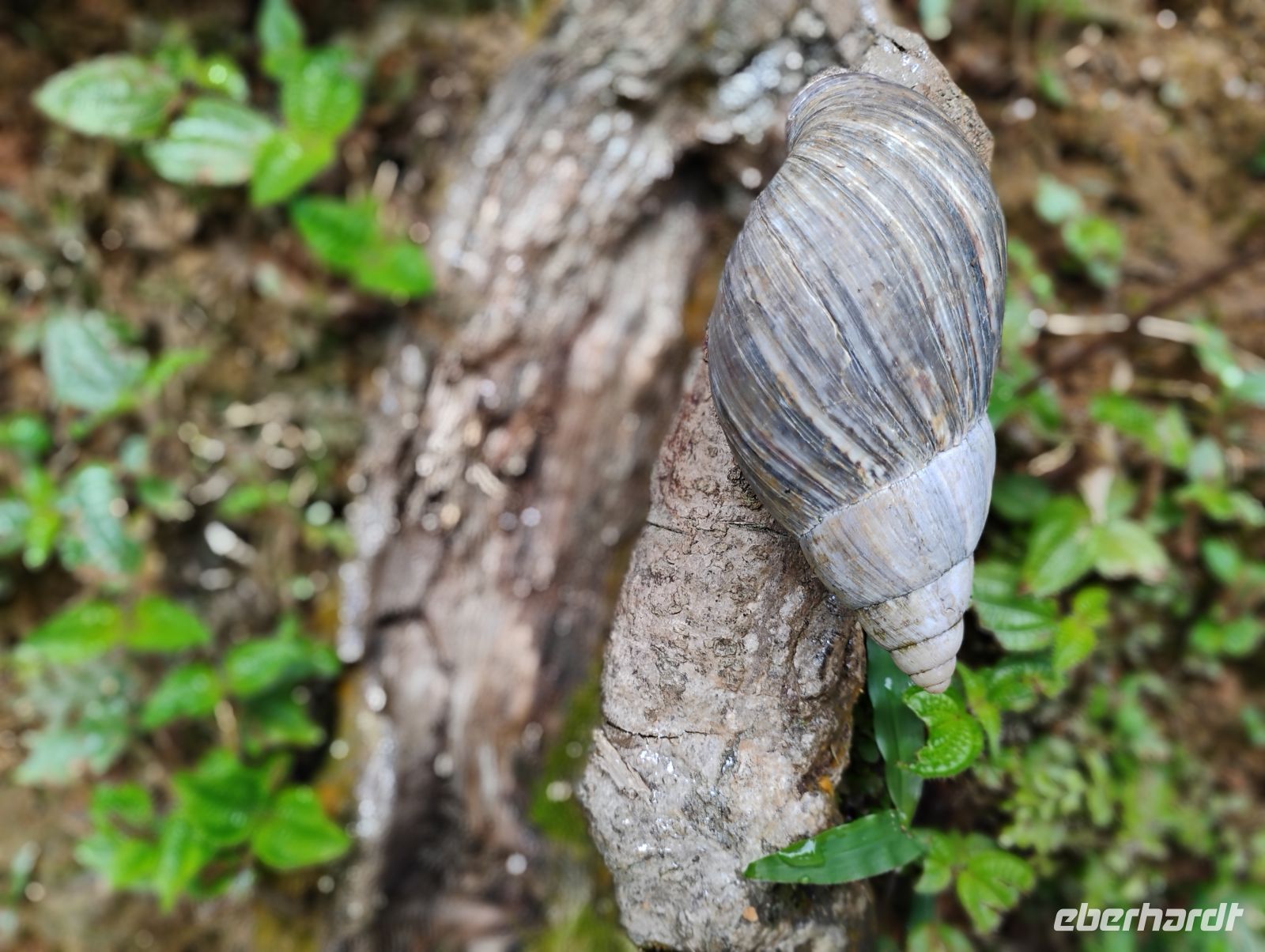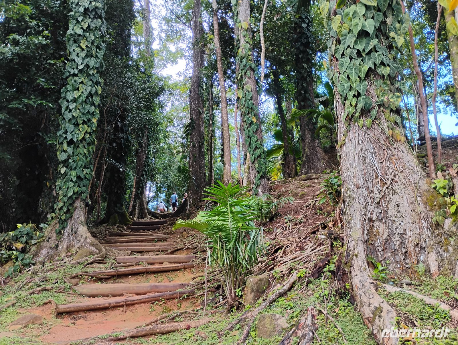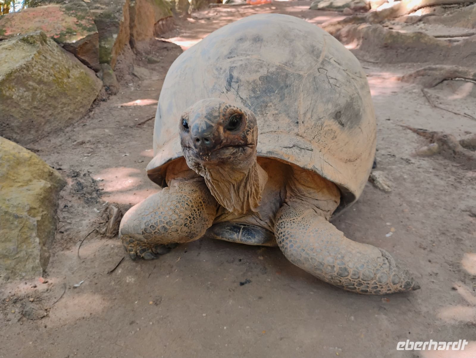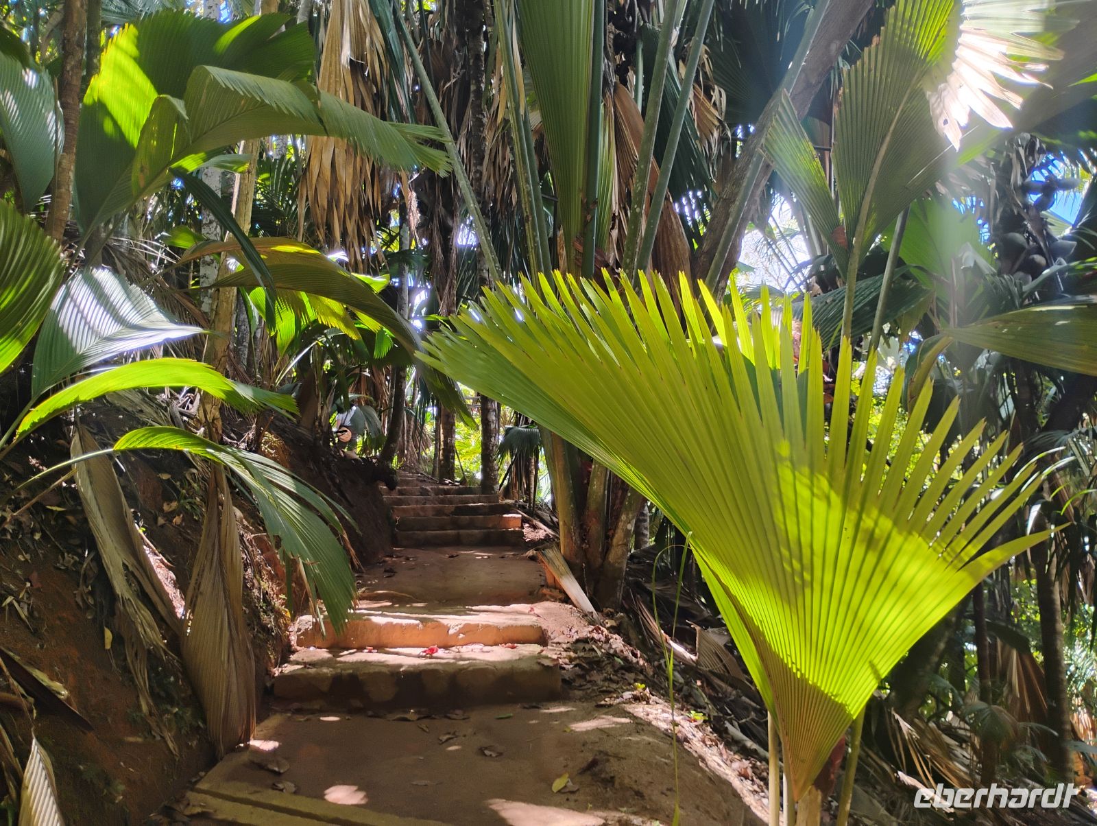 Der Weg führt durch tropische Vegetation hinauf zu einem Aussichtspunkt und weiter bis zur Grabstätte Grimshaws. Unterwegs begegnen uns immer wieder freilaufende Aldabra-Riesenschildkröten, die sich hier frei bewegen. Dabei erfahren wir auch Interessantes über die Pflanzenwelt. Besonders auffällig ist ein Baum mit leuchtend roten Samen (Adenanthera pavonina). Diese gelten als Glücksbringer. Unser Reiseleiter erklärt, dass man sie traditionell im Geldbeutel aufbewahrt, damit das Geld nicht ausgeht.