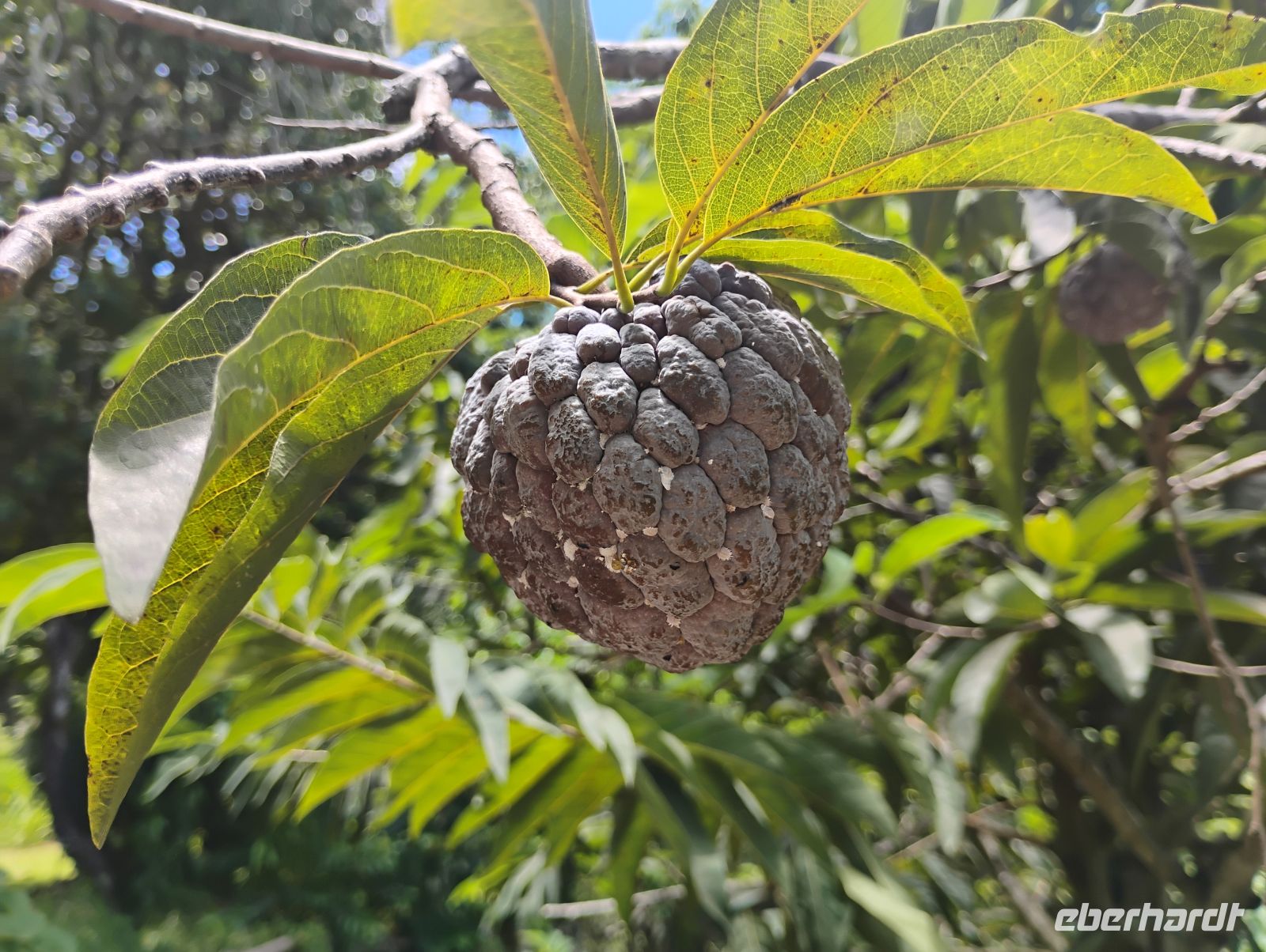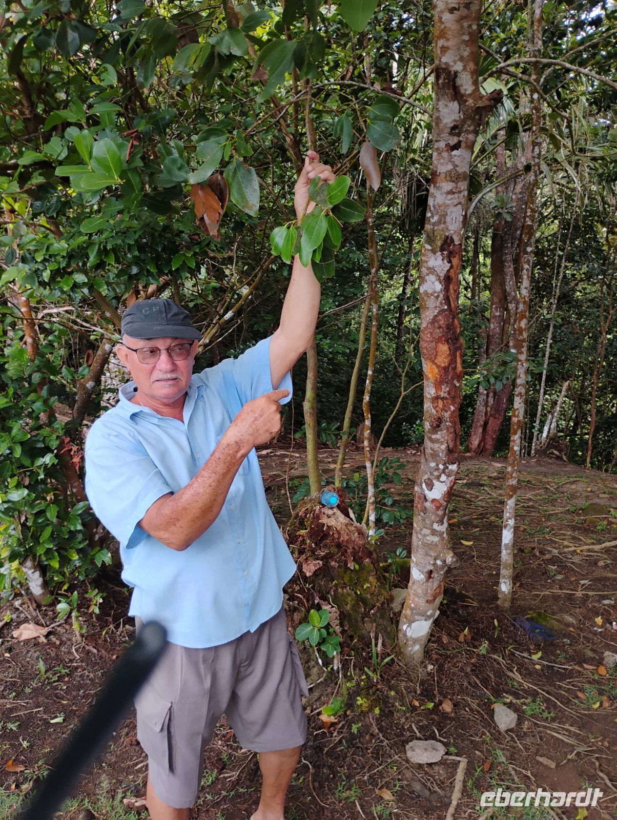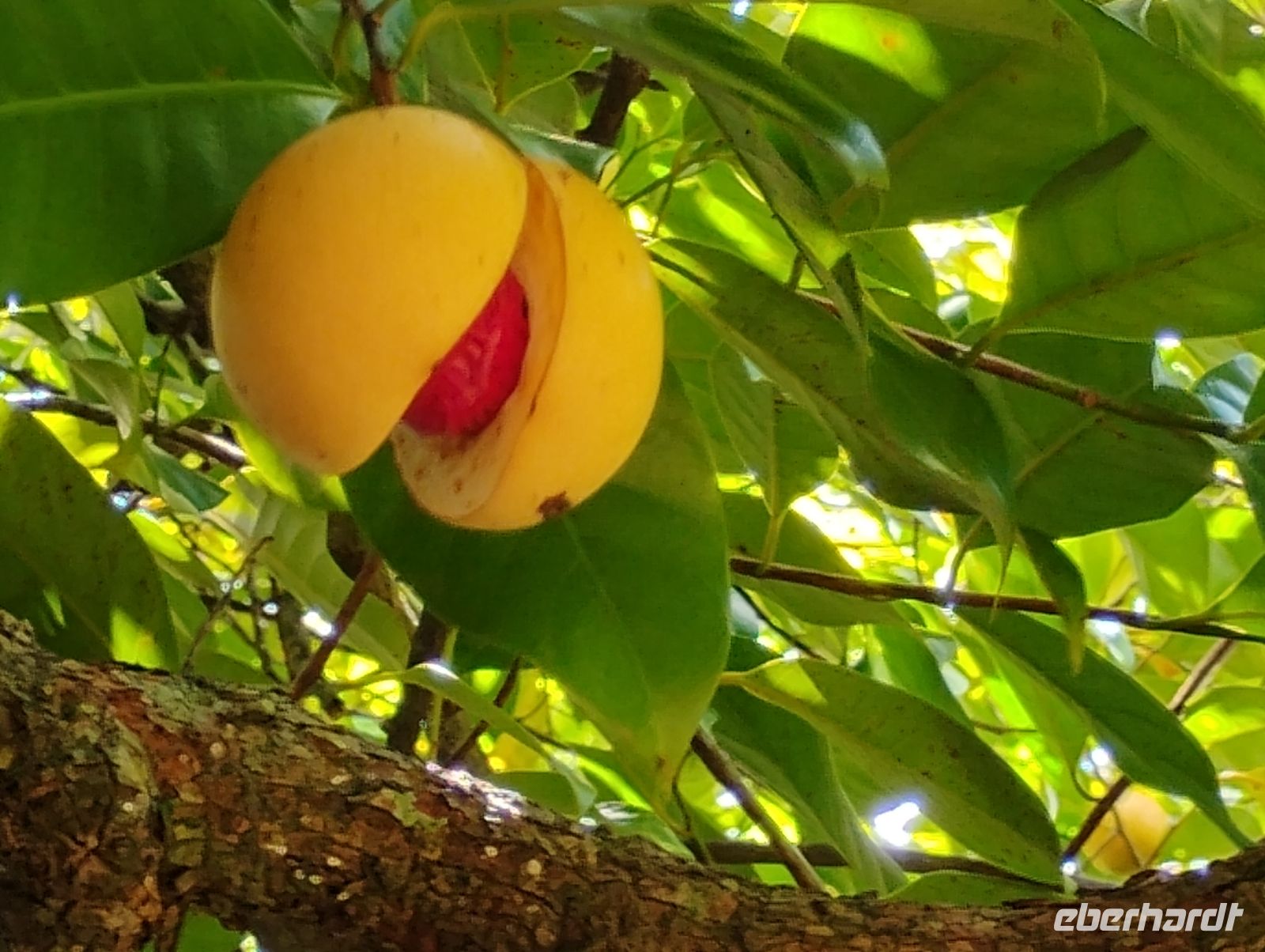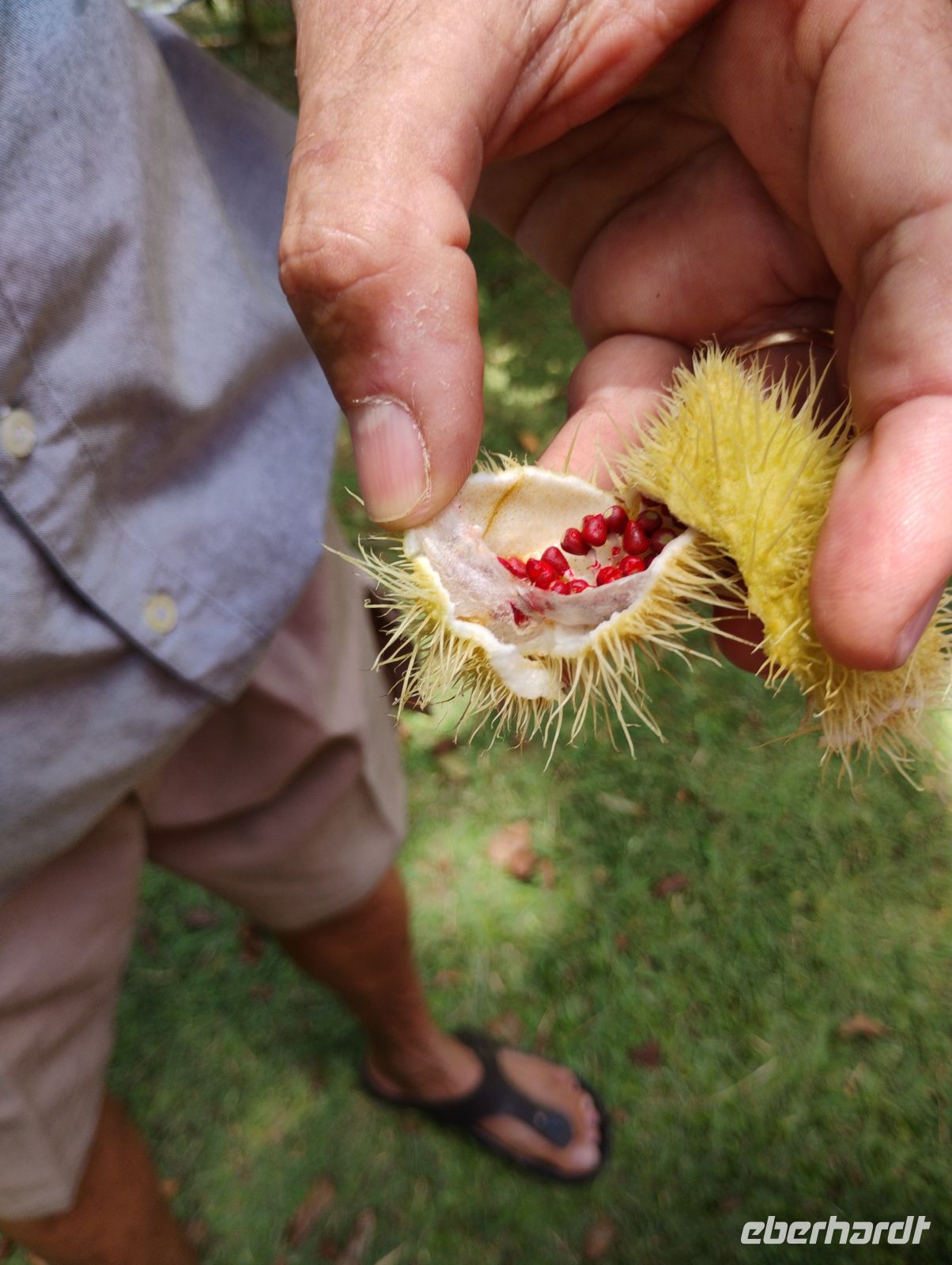 Anschließend besuchen wir einen Gewürzgarten, in dem wir bei einem geführten Rundgang mit Cyril viel über die tropische Pflanzenwelt erfahren. Wir sehen unter anderem Vanille, Kakao, Muskatnuss, verschiedene Zitrusfrüchte sowie den auffälligen Lippenstiftbaum. Auch exotische Früchte wie z. B. der Custard Apple (Zimtapfel) werden uns gezeigt und erklärt.