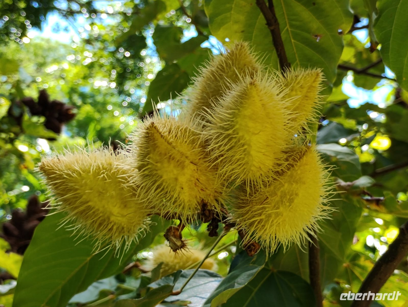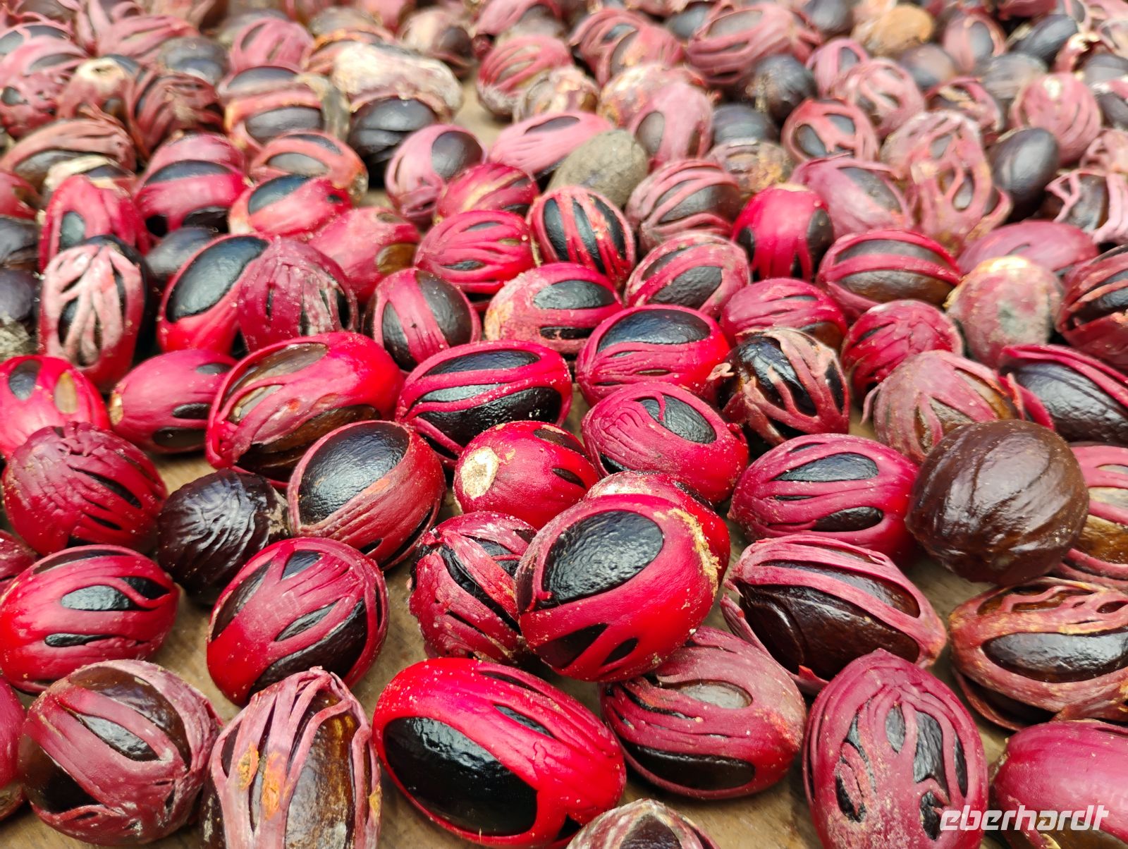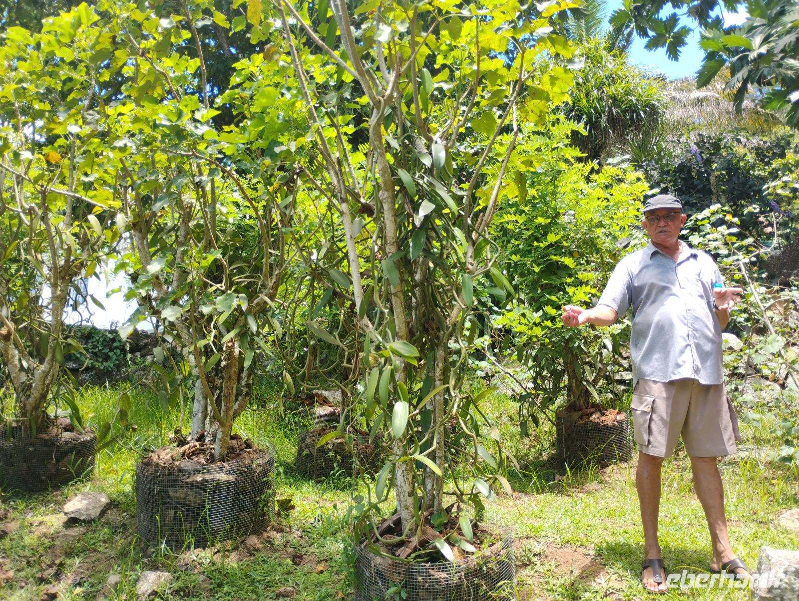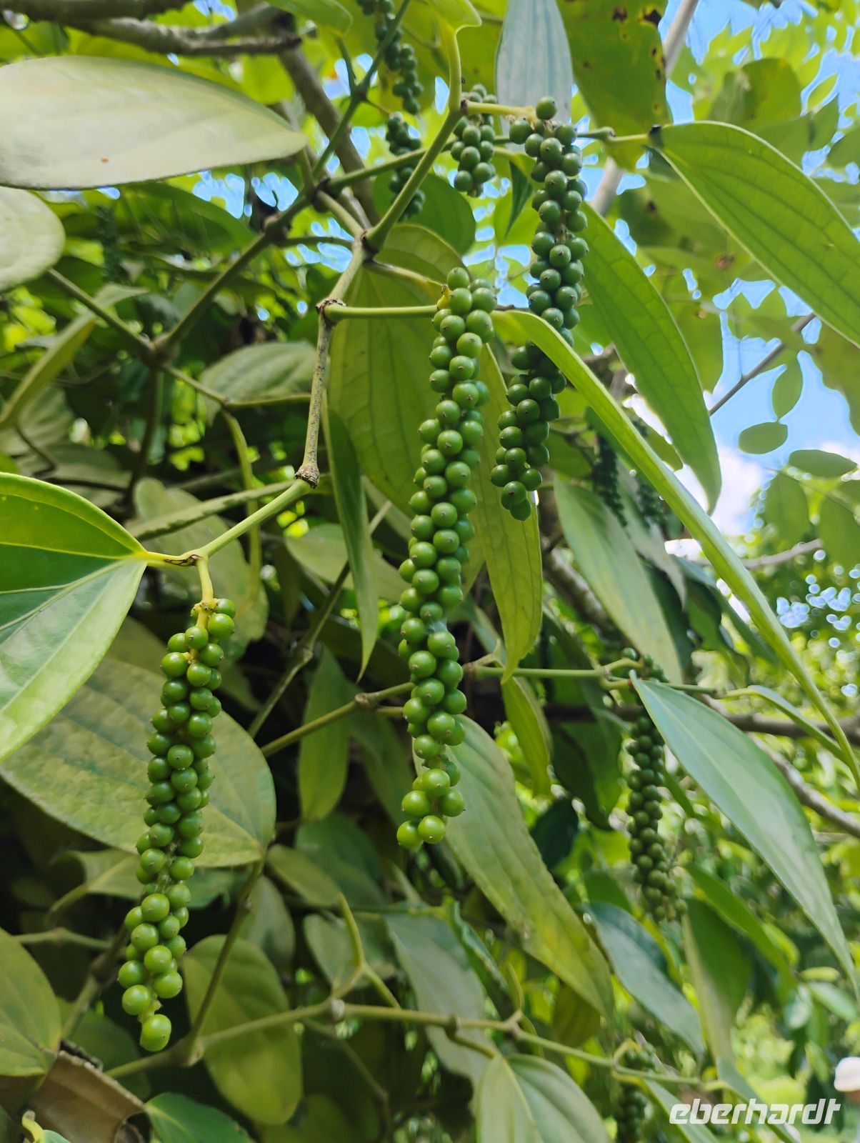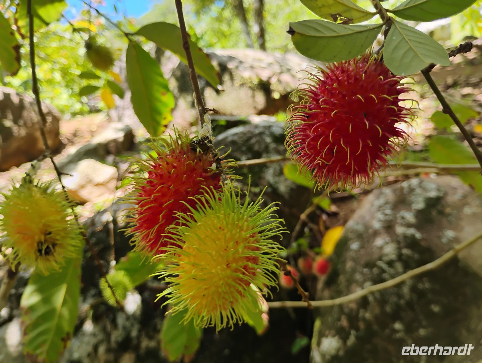 Anschließend besuchen wir einen Gewürzgarten, in dem wir bei einem geführten Rundgang mit Cyril viel über die tropische Pflanzenwelt erfahren. Wir sehen unter anderem Vanille, Kakao, Muskatnuss, verschiedene Zitrusfrüchte sowie den auffälligen Lippenstiftbaum. Auch exotische Früchte wie z. B. der Custard Apple (Zimtapfel) werden uns gezeigt und erklärt.