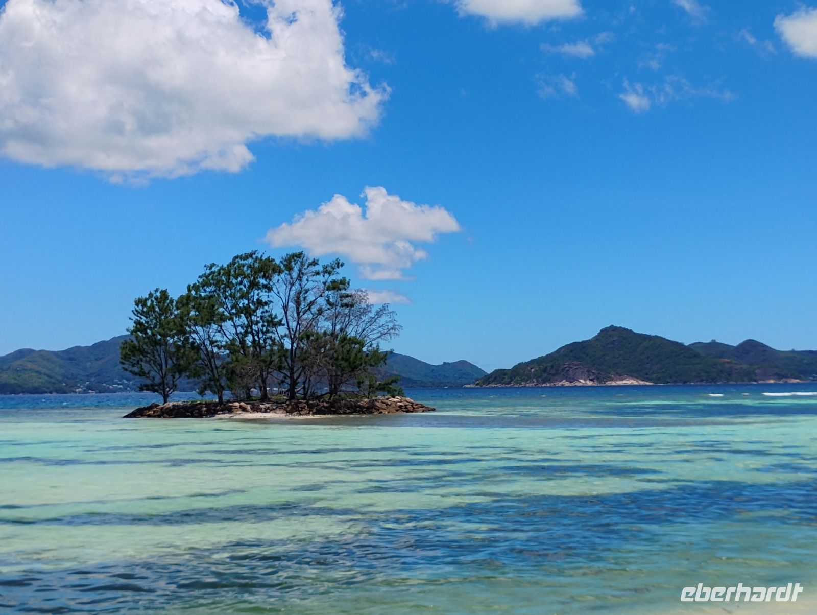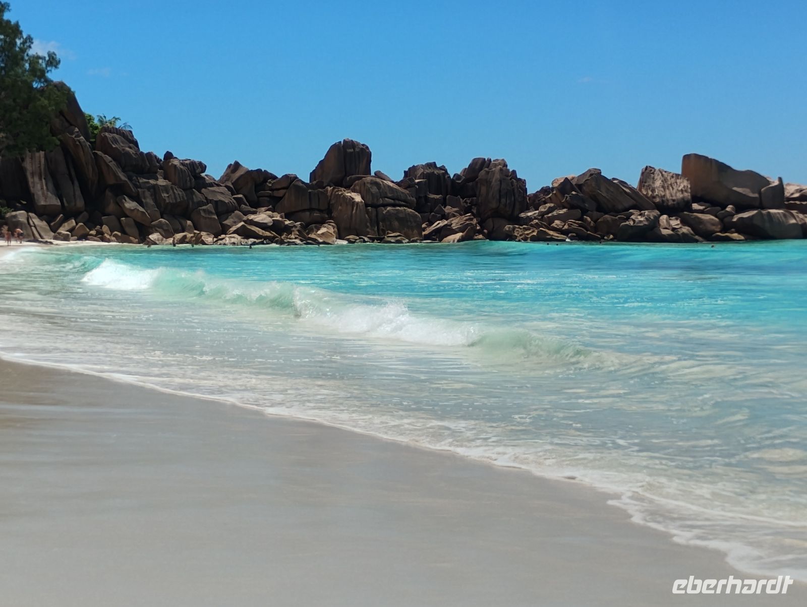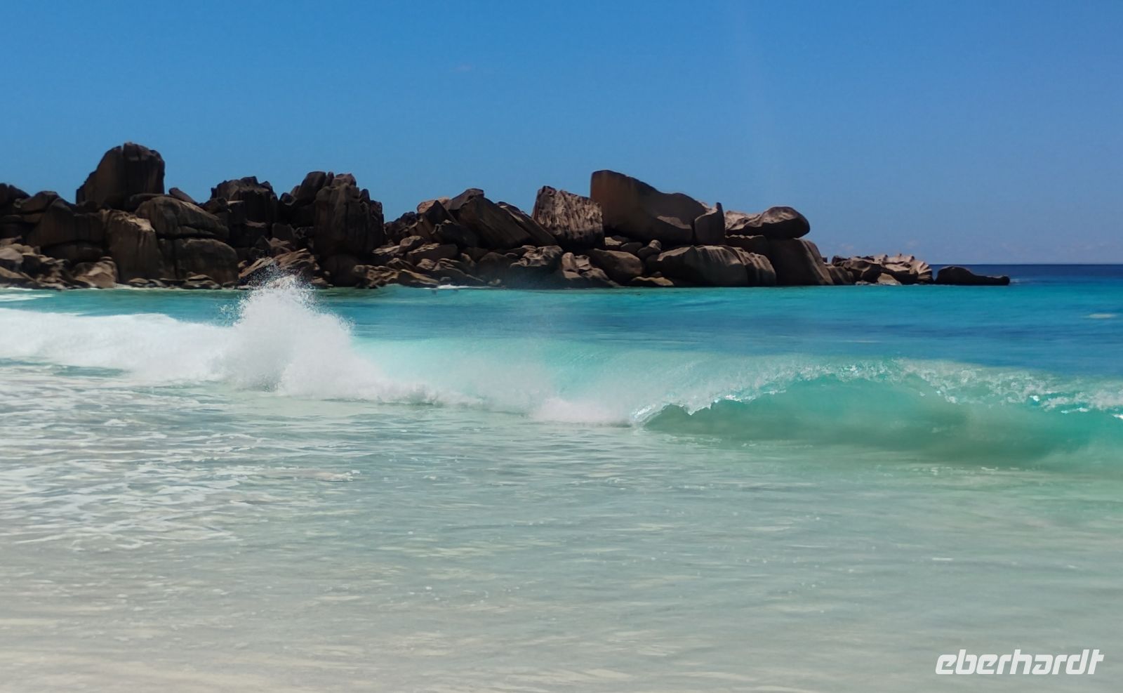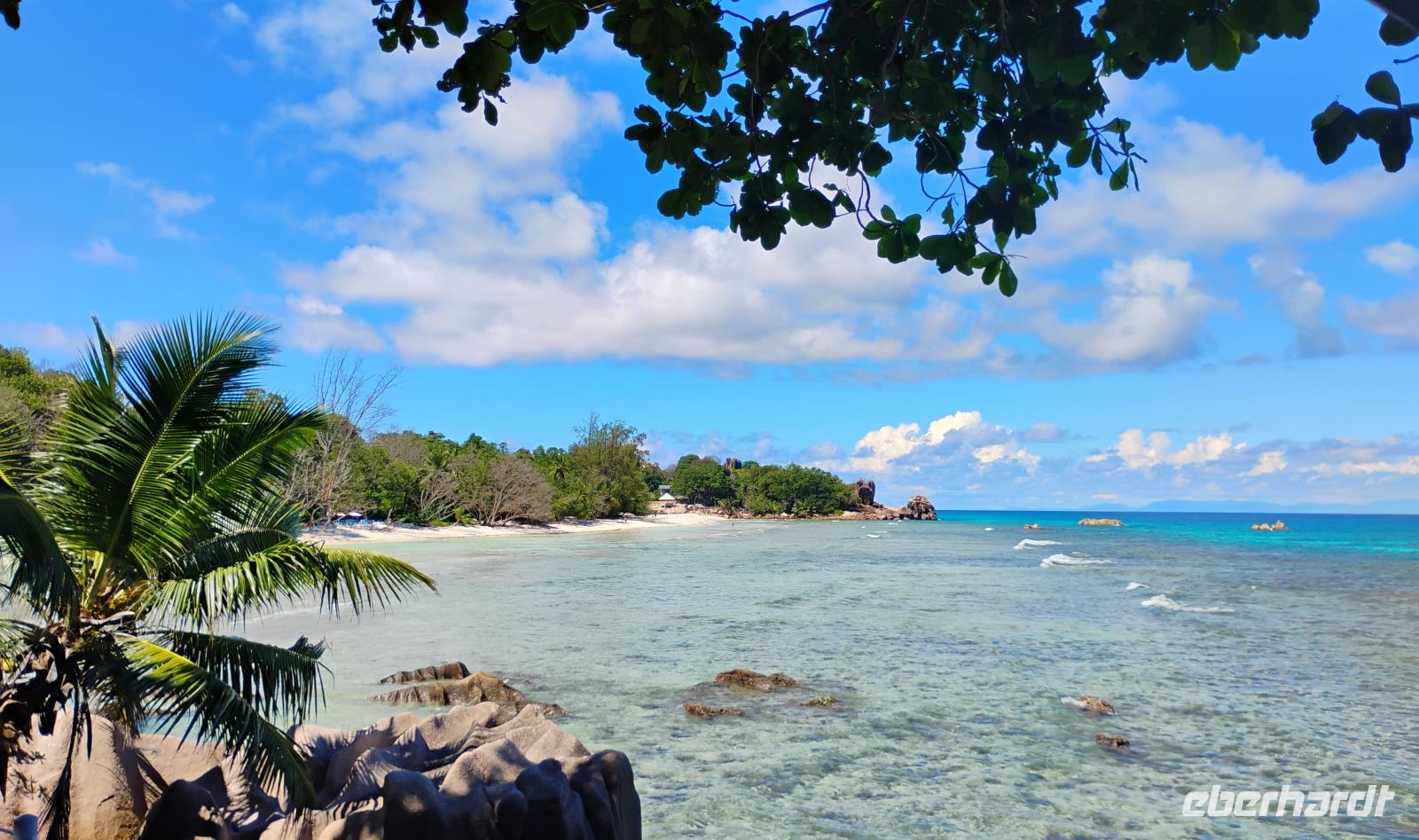 Ganz anders präsentiert sich anschließend der berühmte Anse Source d’Argent. Mit seinen bizarren Granitfelsen, dem hellen Sand und dem flachen Wasser gehört er zu den bekanntesten Stränden der Welt und ist eines der meistfotografierten Motive der Seychellen. Auch wenn das Wasser heute nicht ideal zum Baden oder Schnorcheln ist, begeistert die einzigartige Kulisse.