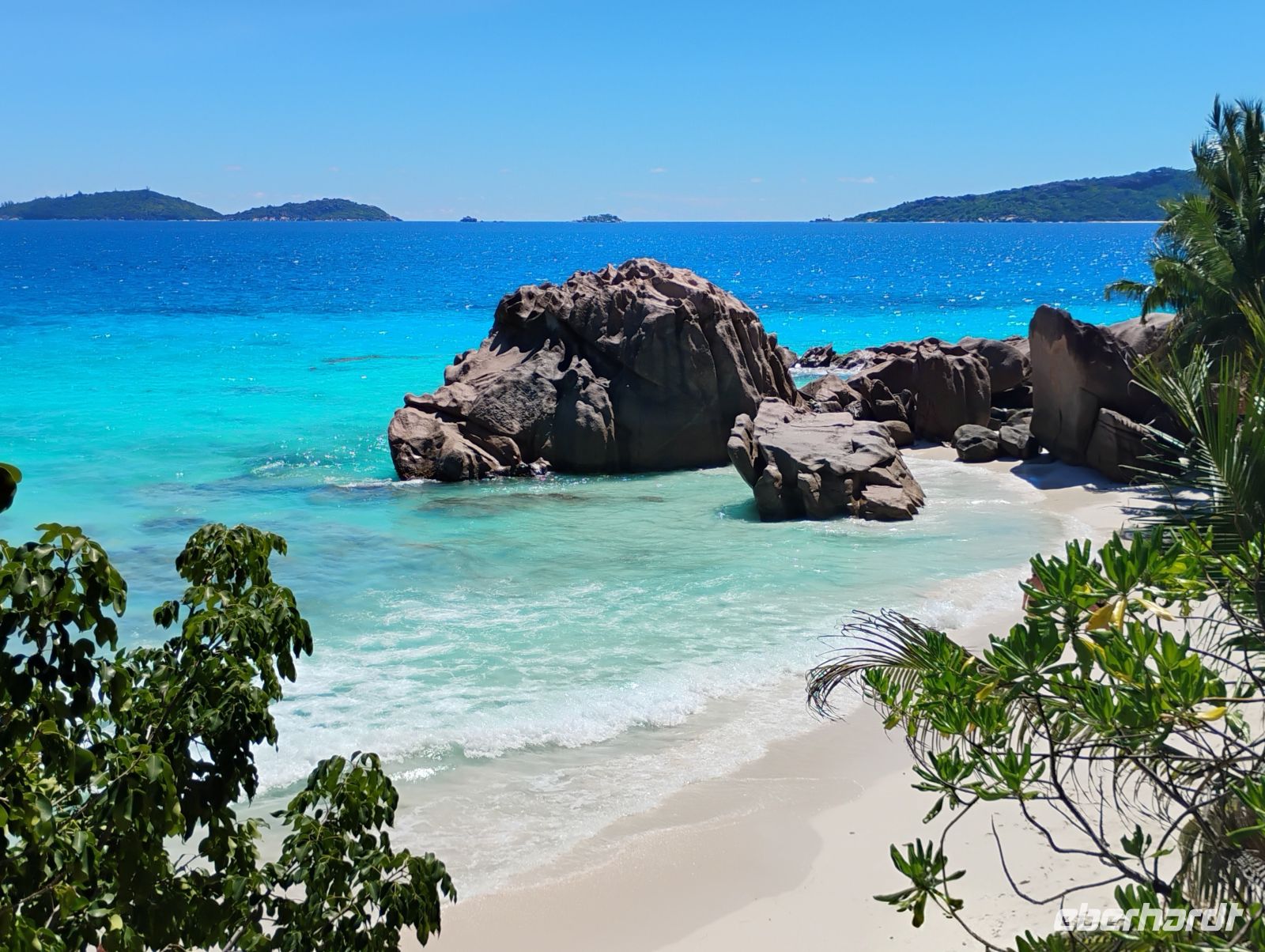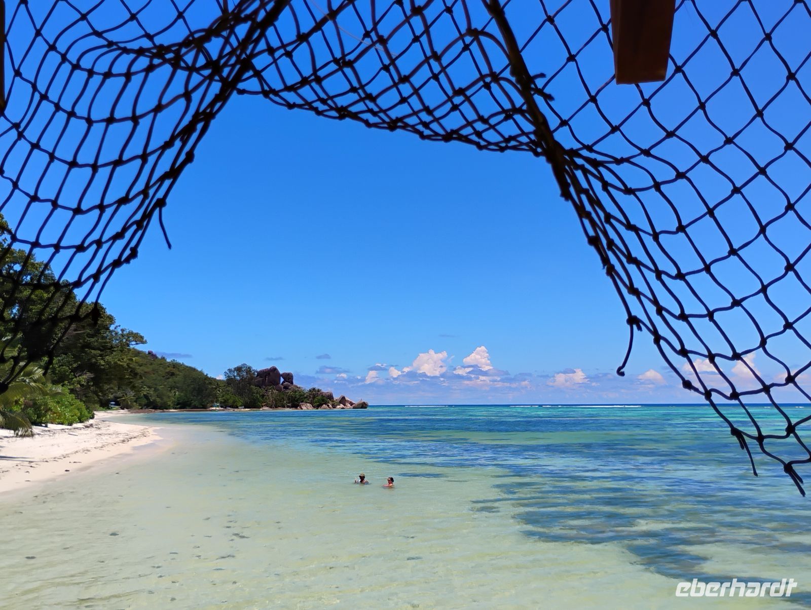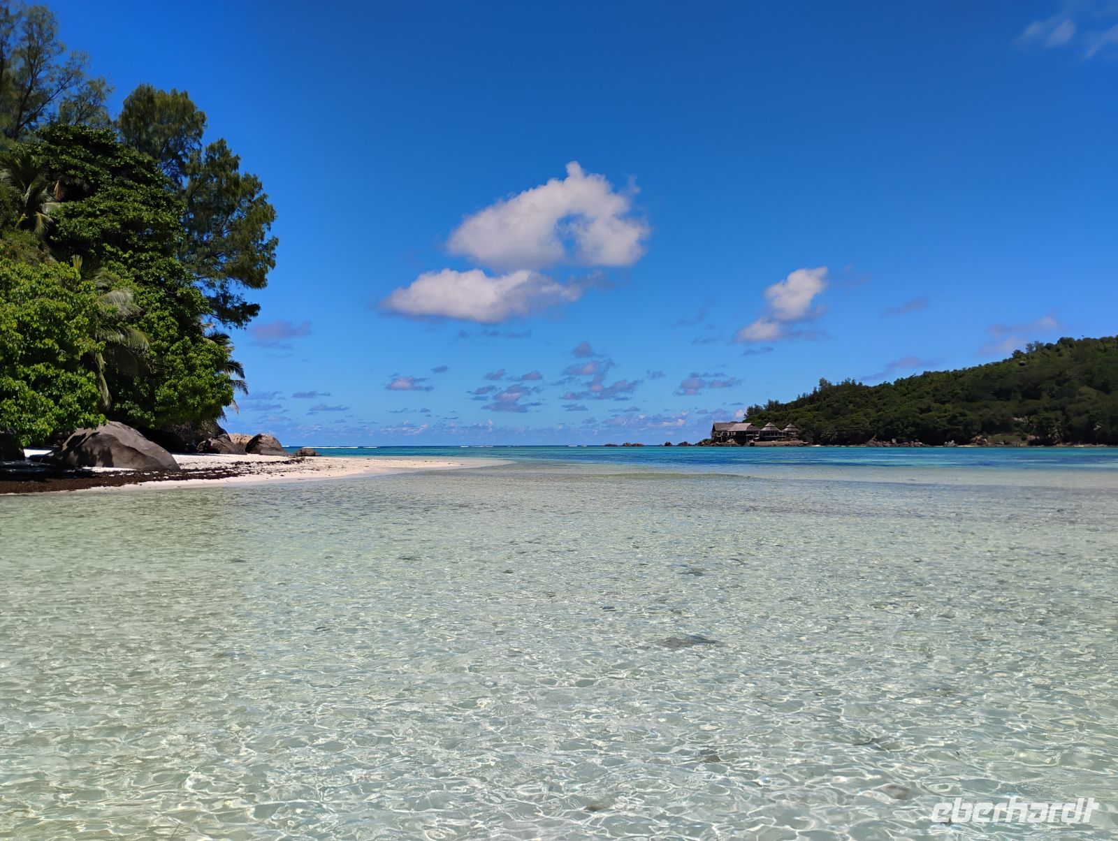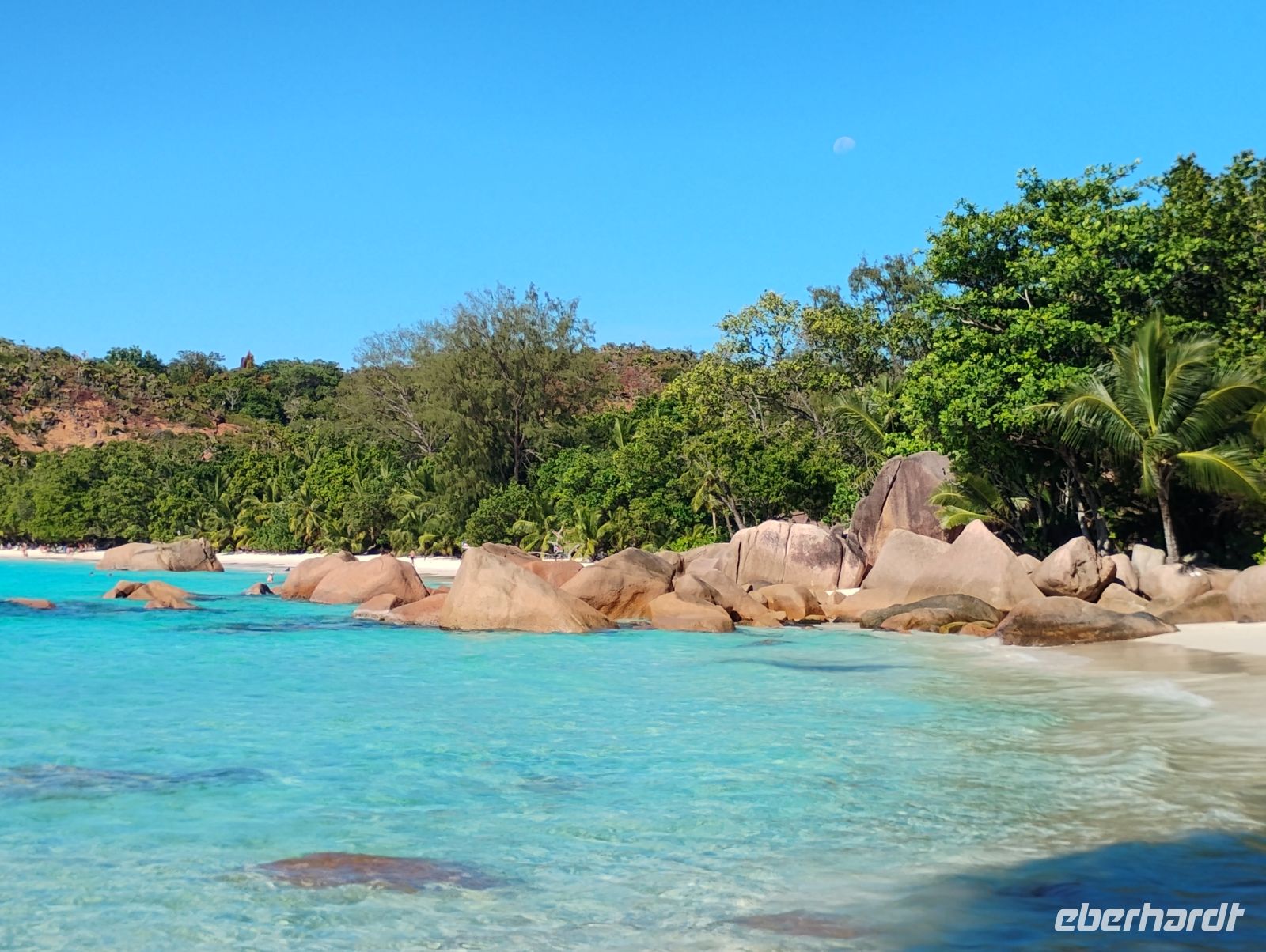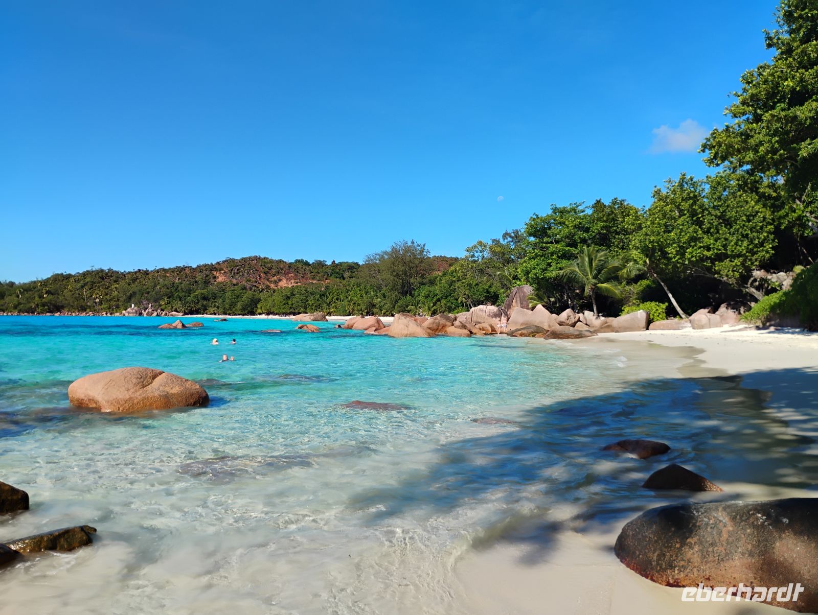 Ganz anders präsentiert sich anschließend der berühmte Anse Source d’Argent. Mit seinen bizarren Granitfelsen, dem hellen Sand und dem flachen Wasser gehört er zu den bekanntesten Stränden der Welt und ist eines der meistfotografierten Motive der Seychellen. Auch wenn das Wasser heute nicht ideal zum Baden oder Schnorcheln ist, begeistert die einzigartige Kulisse.